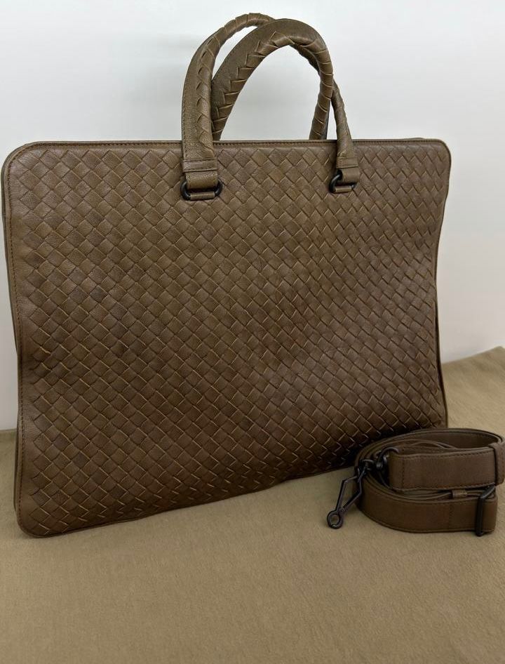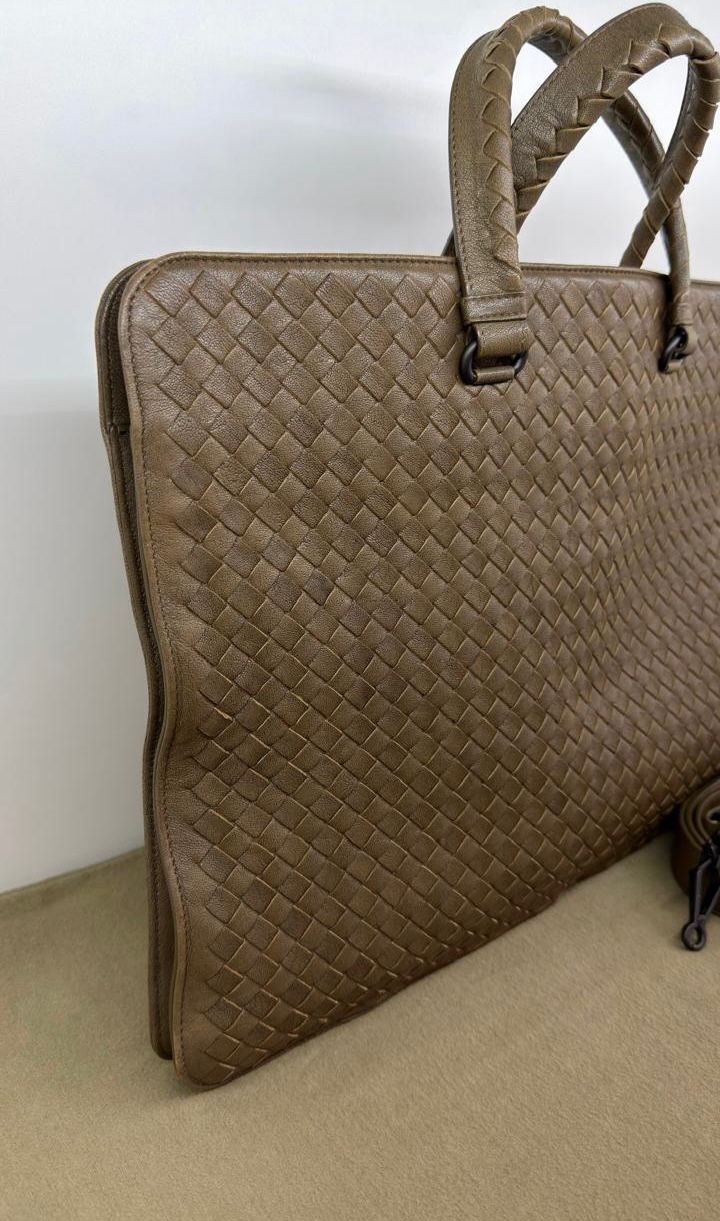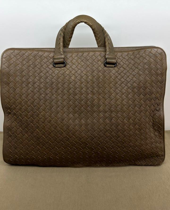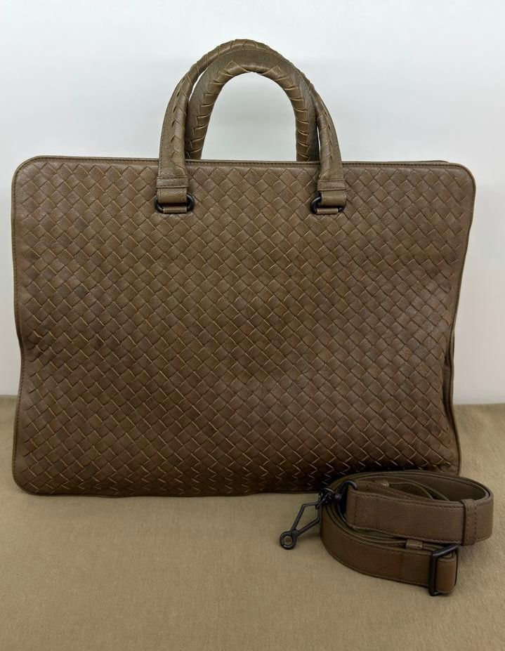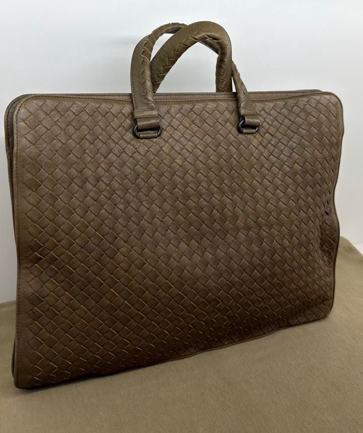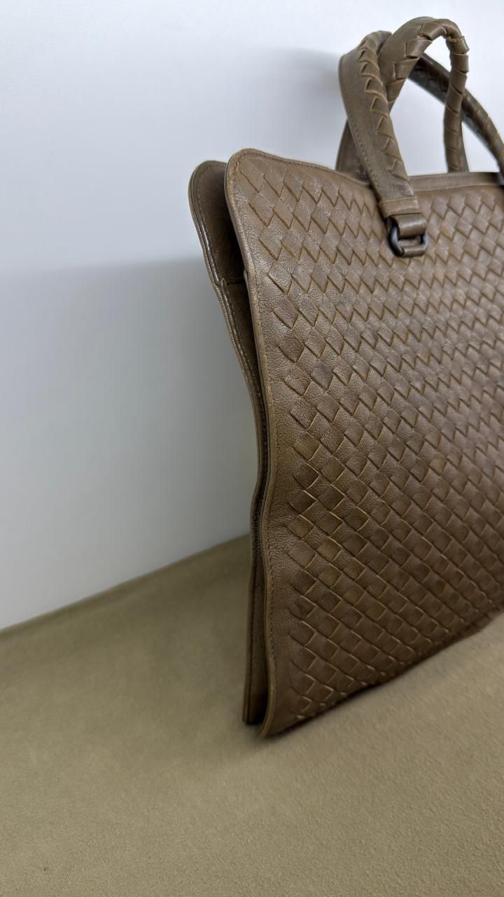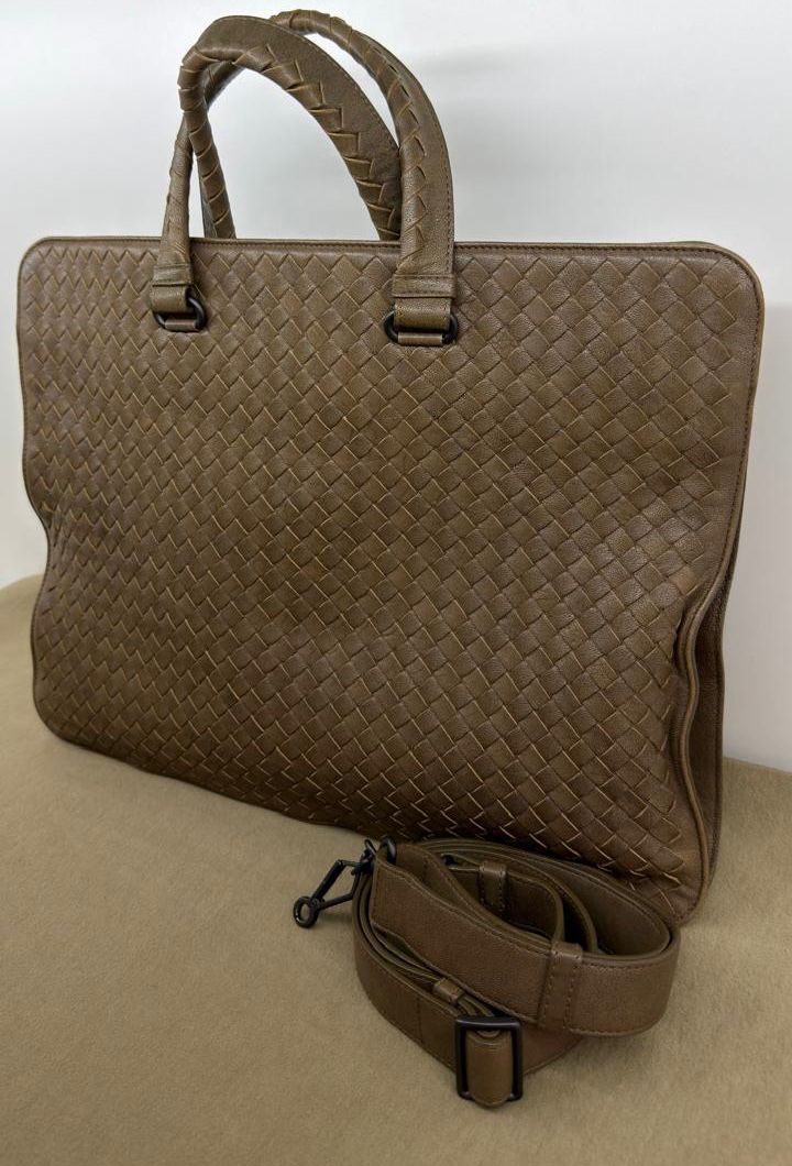 Bolsa Bottega Veneta Intrecciato, confeccionada em couro trançado na cor marrom, com ferragens no dourado, alças duplas de mãos, alça longa de ombro, parte superior aberta, compartimento espaçoso com bolsos planos e com fecho em zíper, cabe notebook. Uma ótima escolha para o dia a dia.