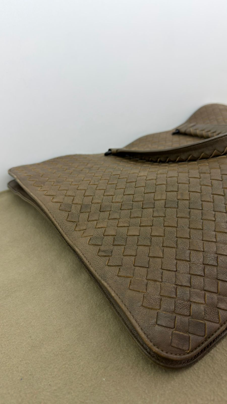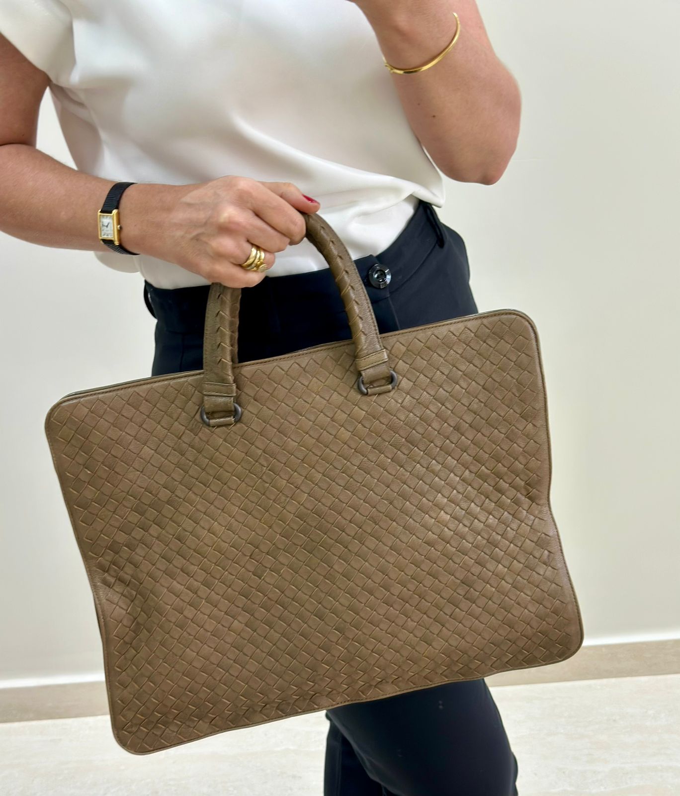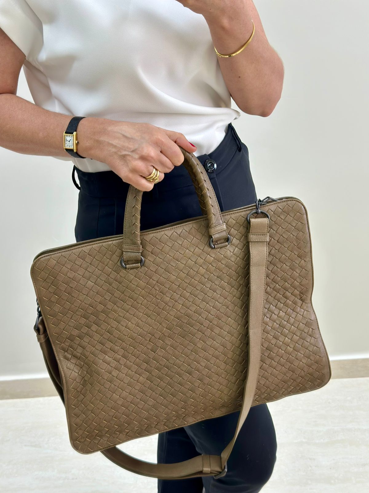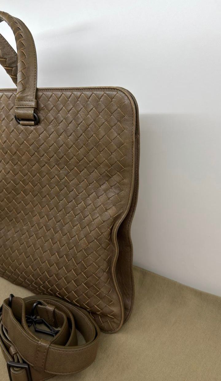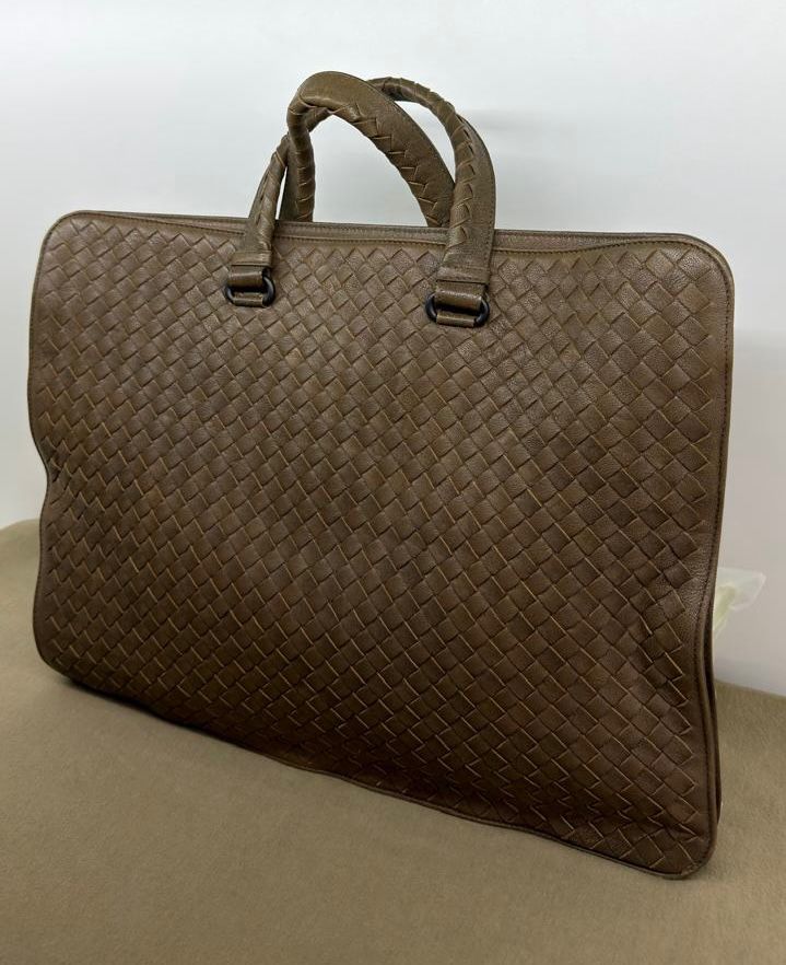 Bolsa Bottega Veneta Intrecciato, confeccionada em couro trançado na cor marrom, com ferragens no dourado, alças duplas de mãos, alça longa de ombro, parte superior aberta, compartimento espaçoso com bolsos planos e com fecho em zíper, cabe notebook. Uma ótima escolha para o dia a dia.