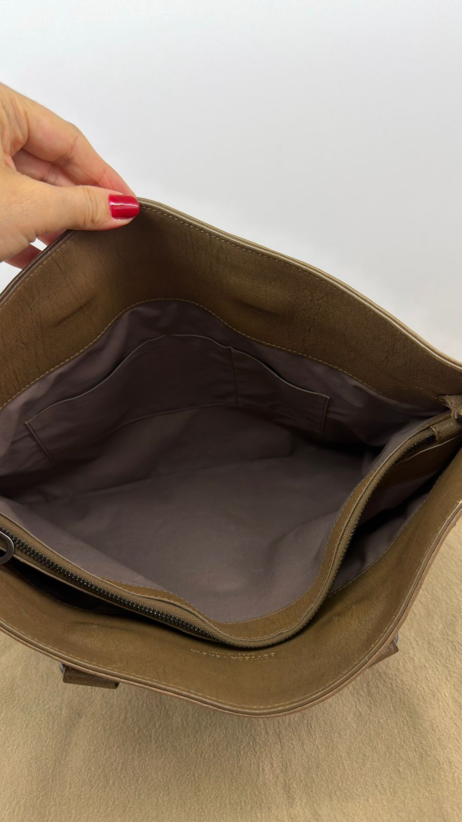 - Confeccionada em couro na cor marrom;