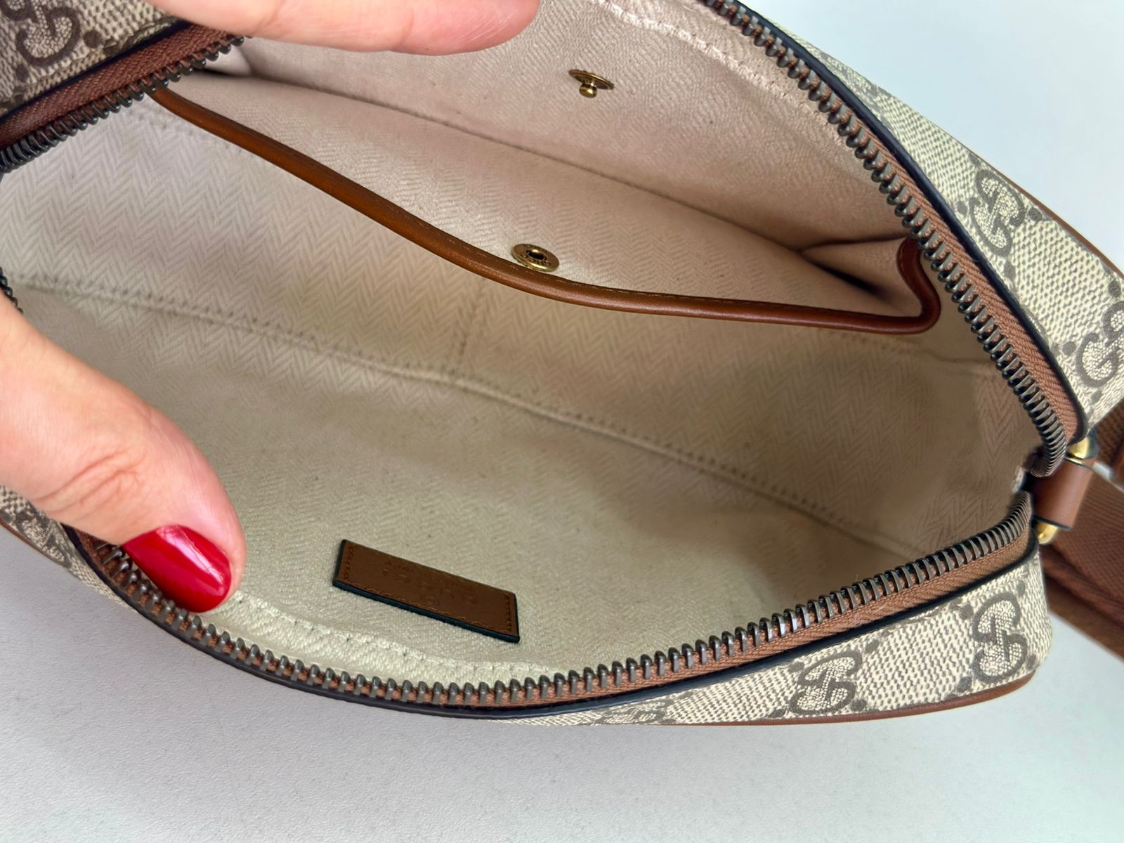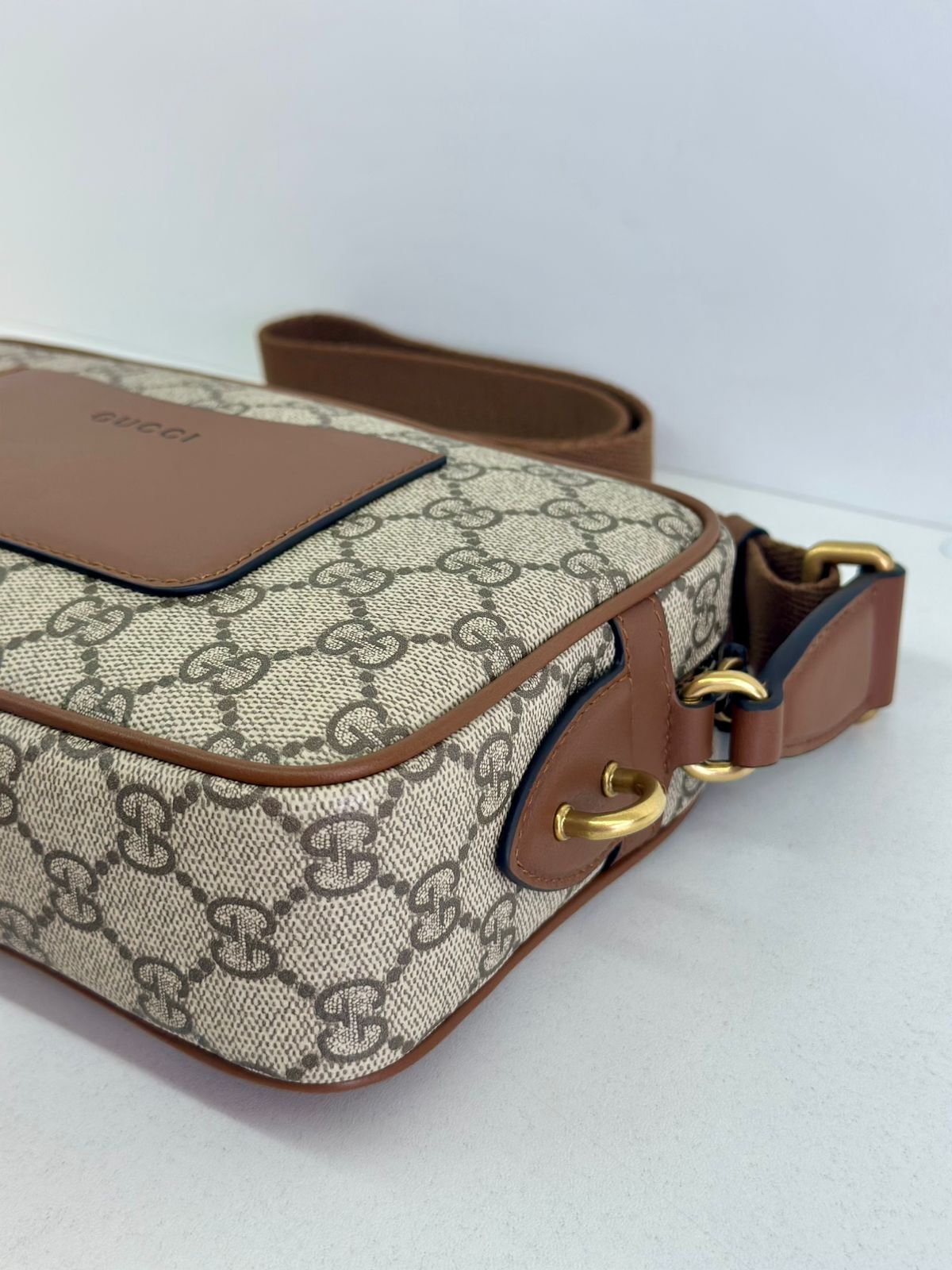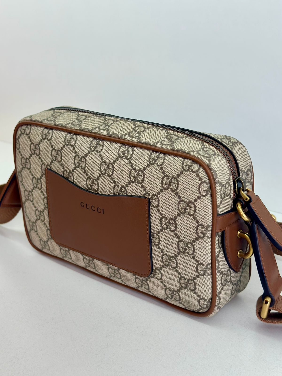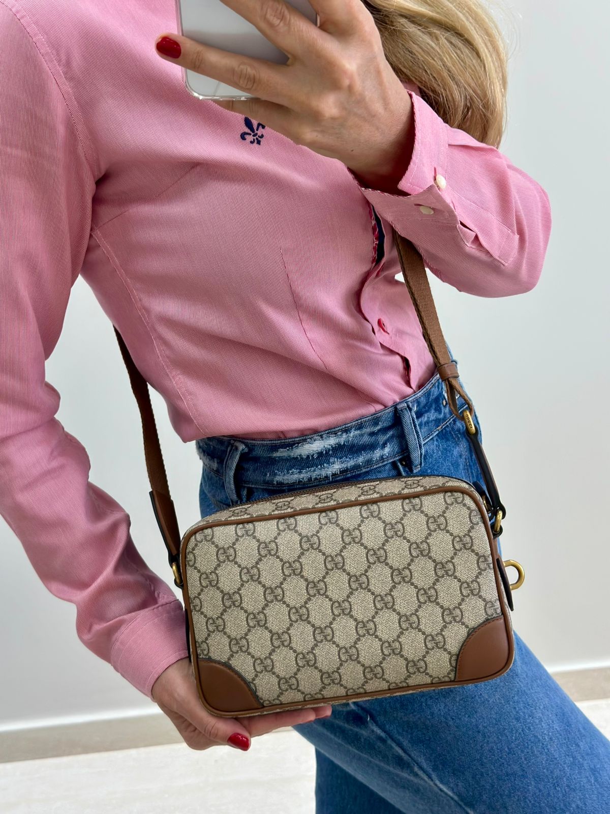Bolsa Gucci GG Emblem, confeccionada em estampa monograma GG da marca, acabamento em couro marrom, possui bolso plano em couro na parte posterior, na parte frontal possui detalhes em couro nos cantos inferiores, ferragens no dourado, possui alça de ombro regulável, forro em tecido, compartimento único com bolso interno com fecho em zíper, fechamento principal por zíper Uma bolsa para o dia a dia com muita elegância.