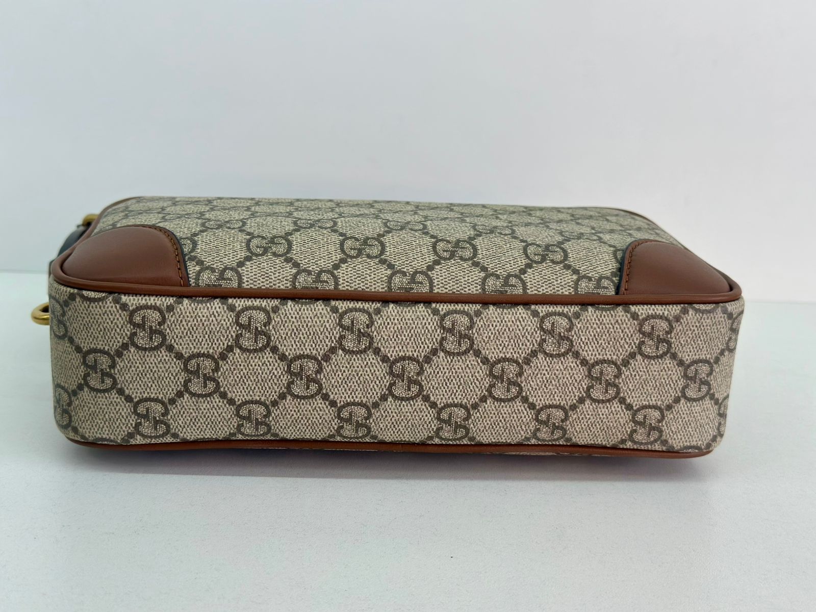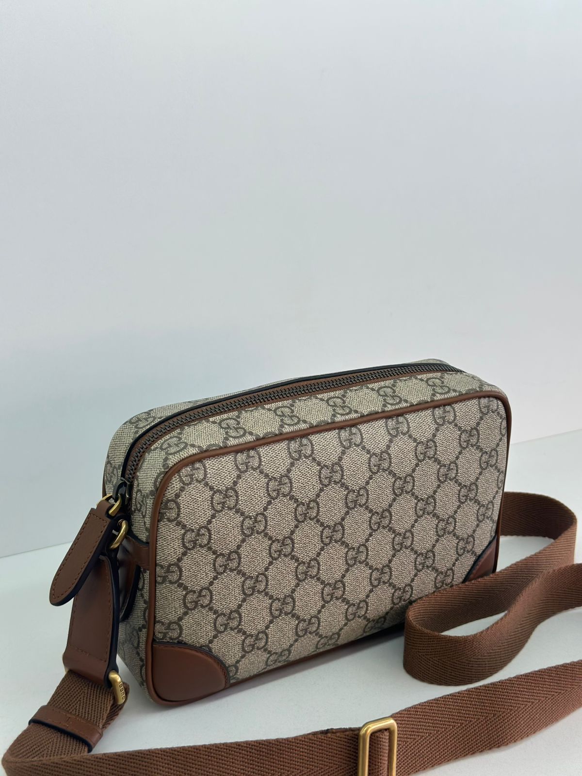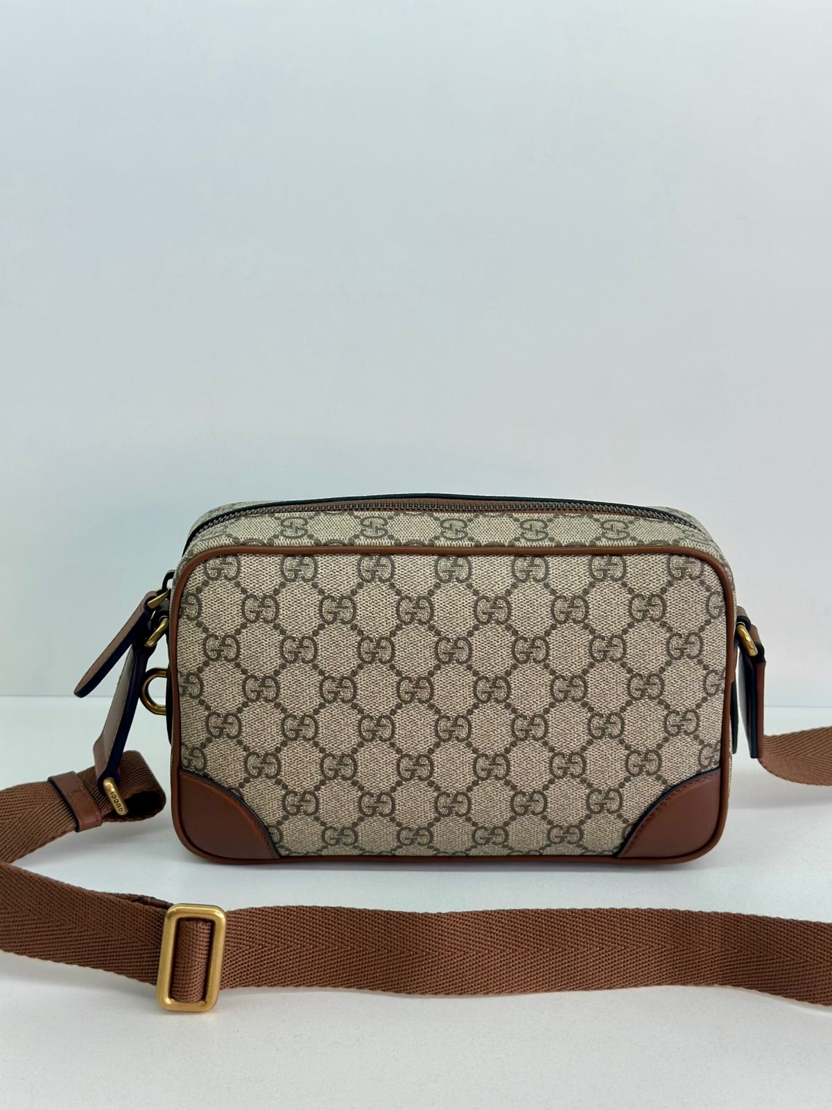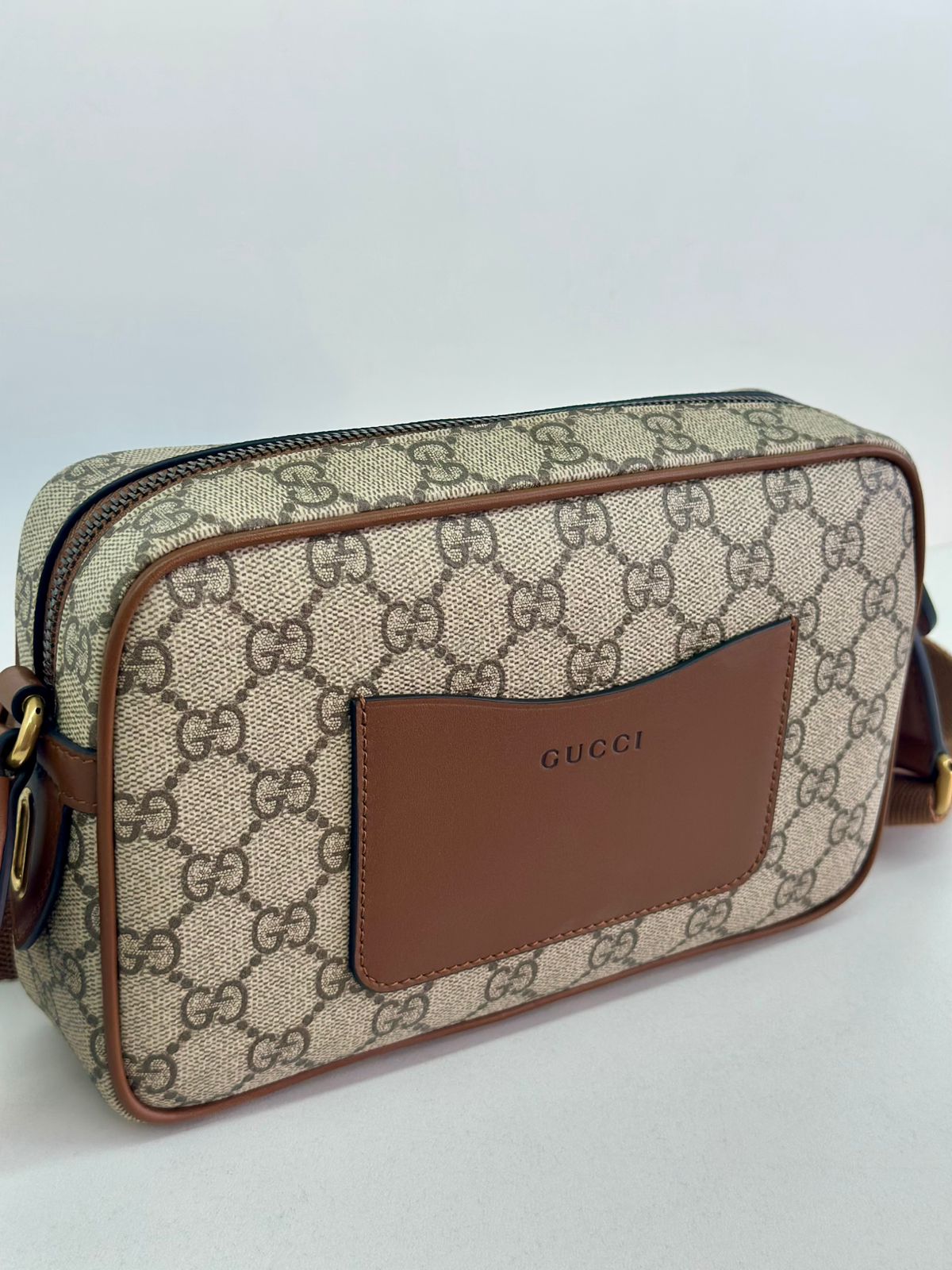 Bolsa Gucci GG Emblem, confeccionada em estampa monograma GG da marca, acabamento em couro marrom, possui bolso plano em couro na parte posterior, na parte frontal possui detalhes em couro nos cantos inferiores, ferragens no dourado, possui alça de ombro regulável, forro em tecido, compartimento único com bolso interno com fecho em zíper, fechamento principal por zíper Uma bolsa para o dia a dia com muita elegância.