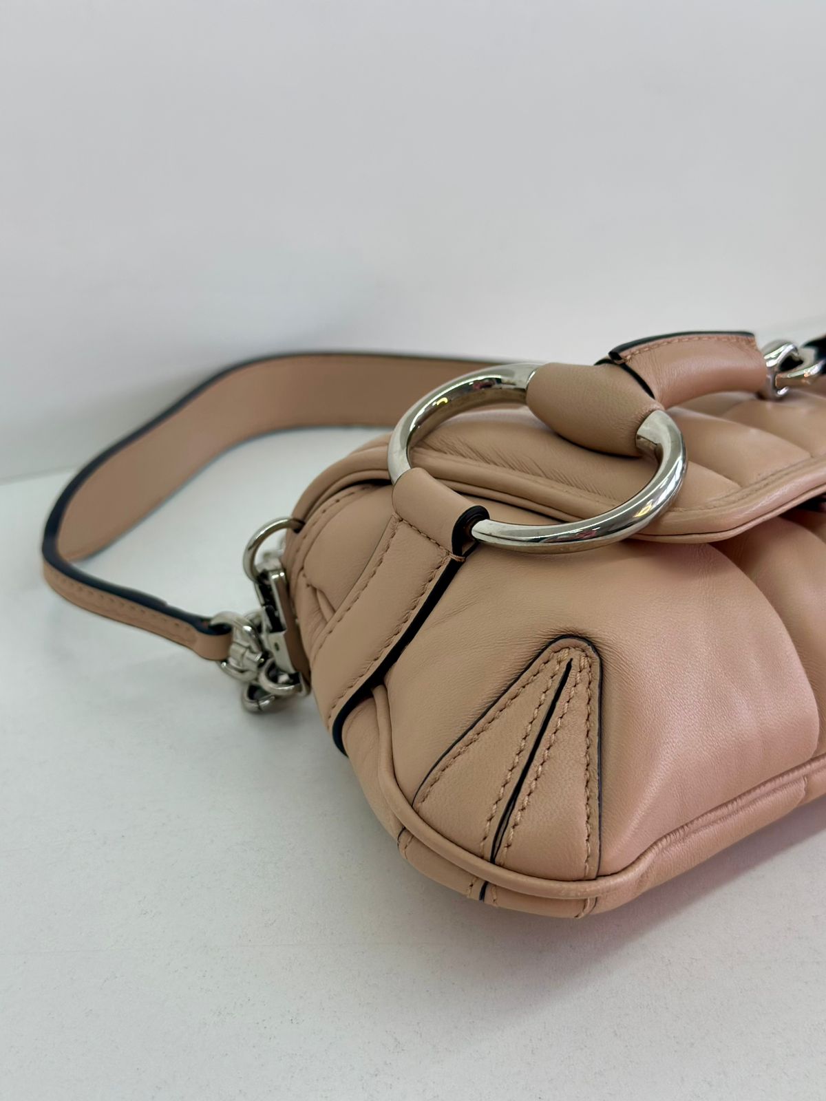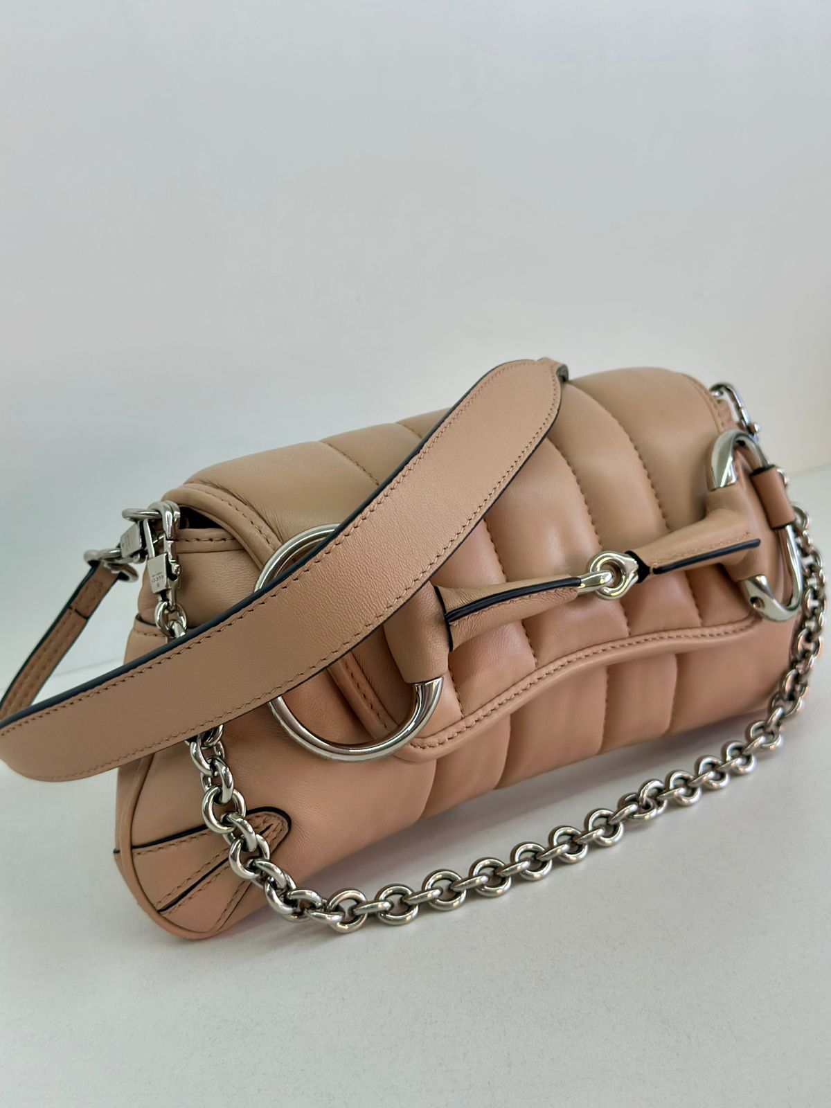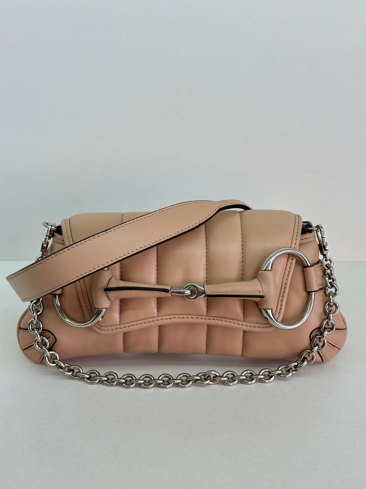 Bolsa Gucci Matelassê Horsebit Chain, confeccionada em matelassê no bege, ferragens no prateado,  fechamento por aba flap com botão de pressão, possui duas alças uma em couro e outra em corrente, compartimento interno único, com um bolso interno plano.