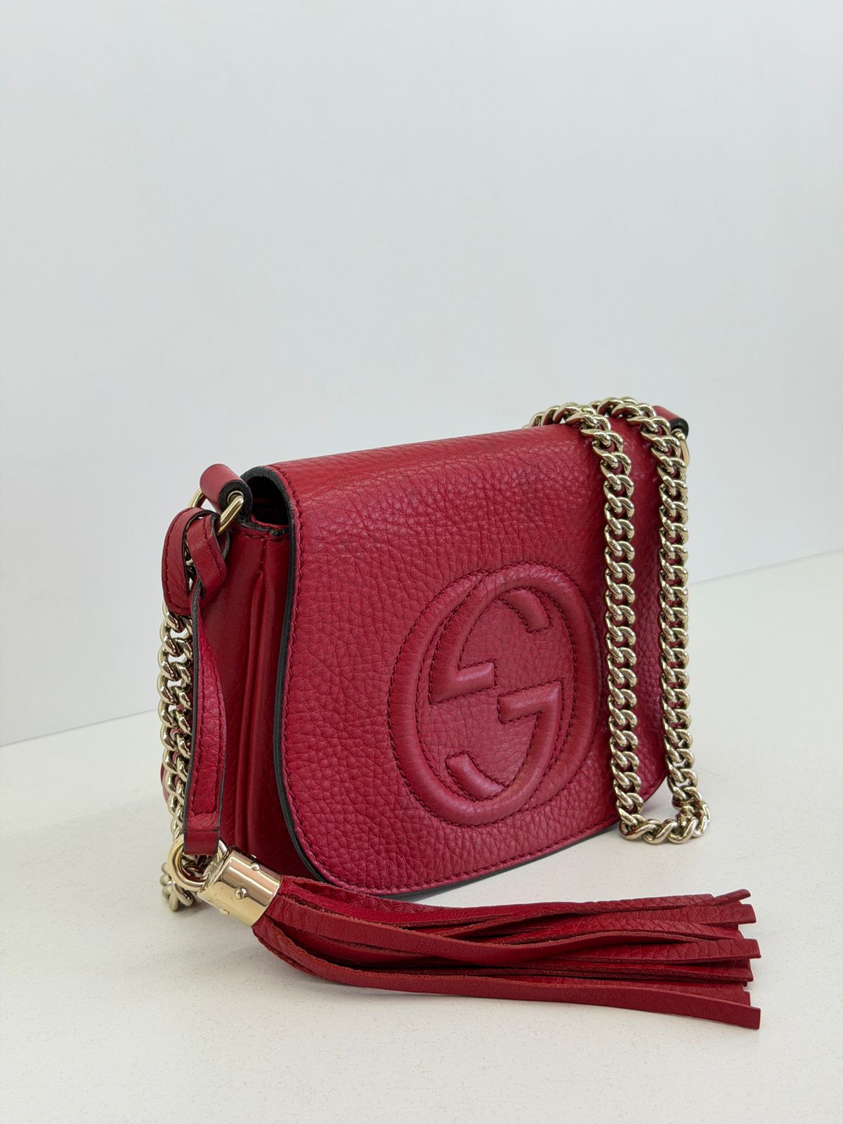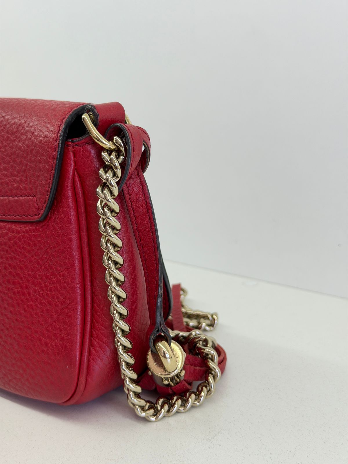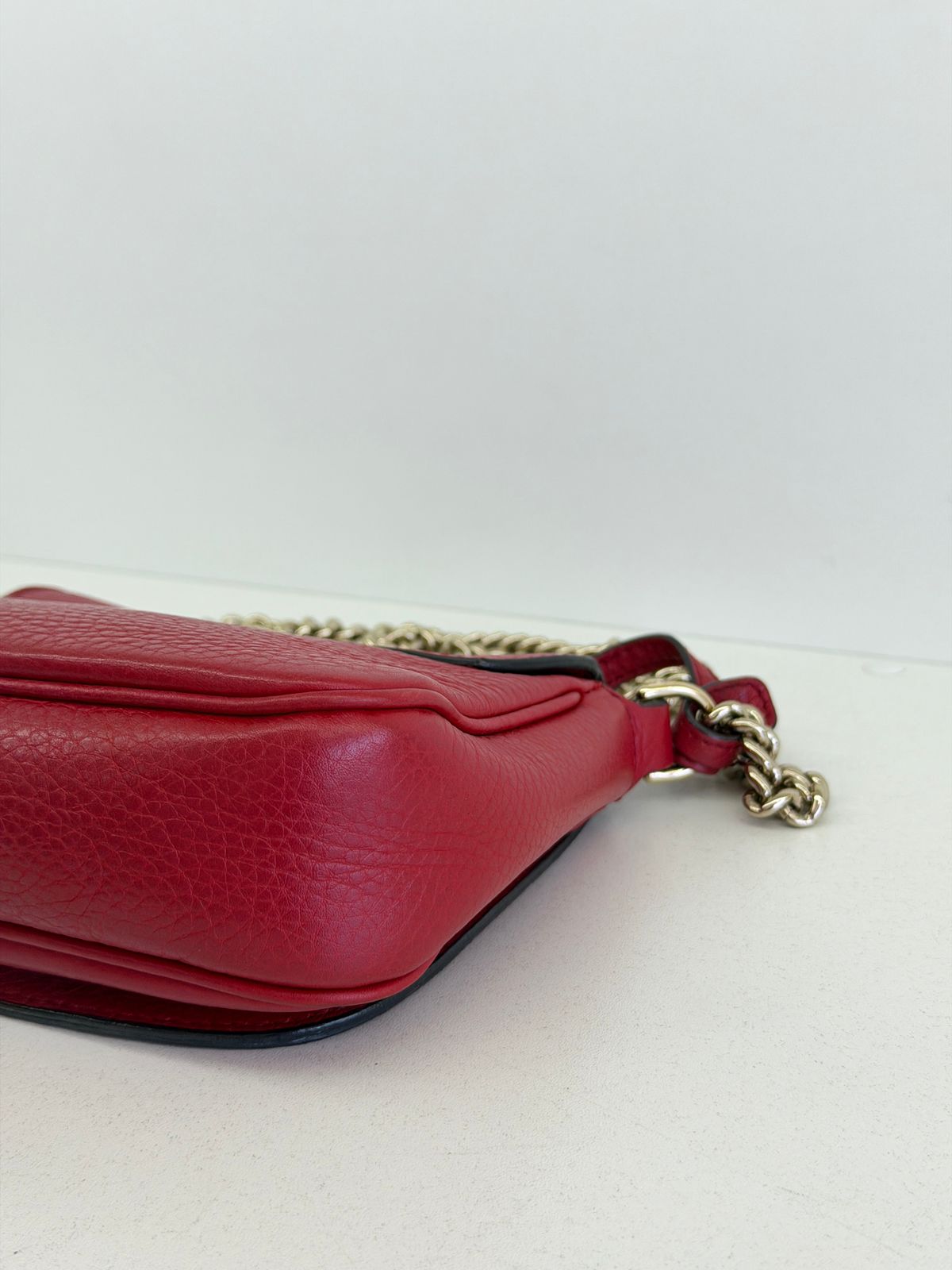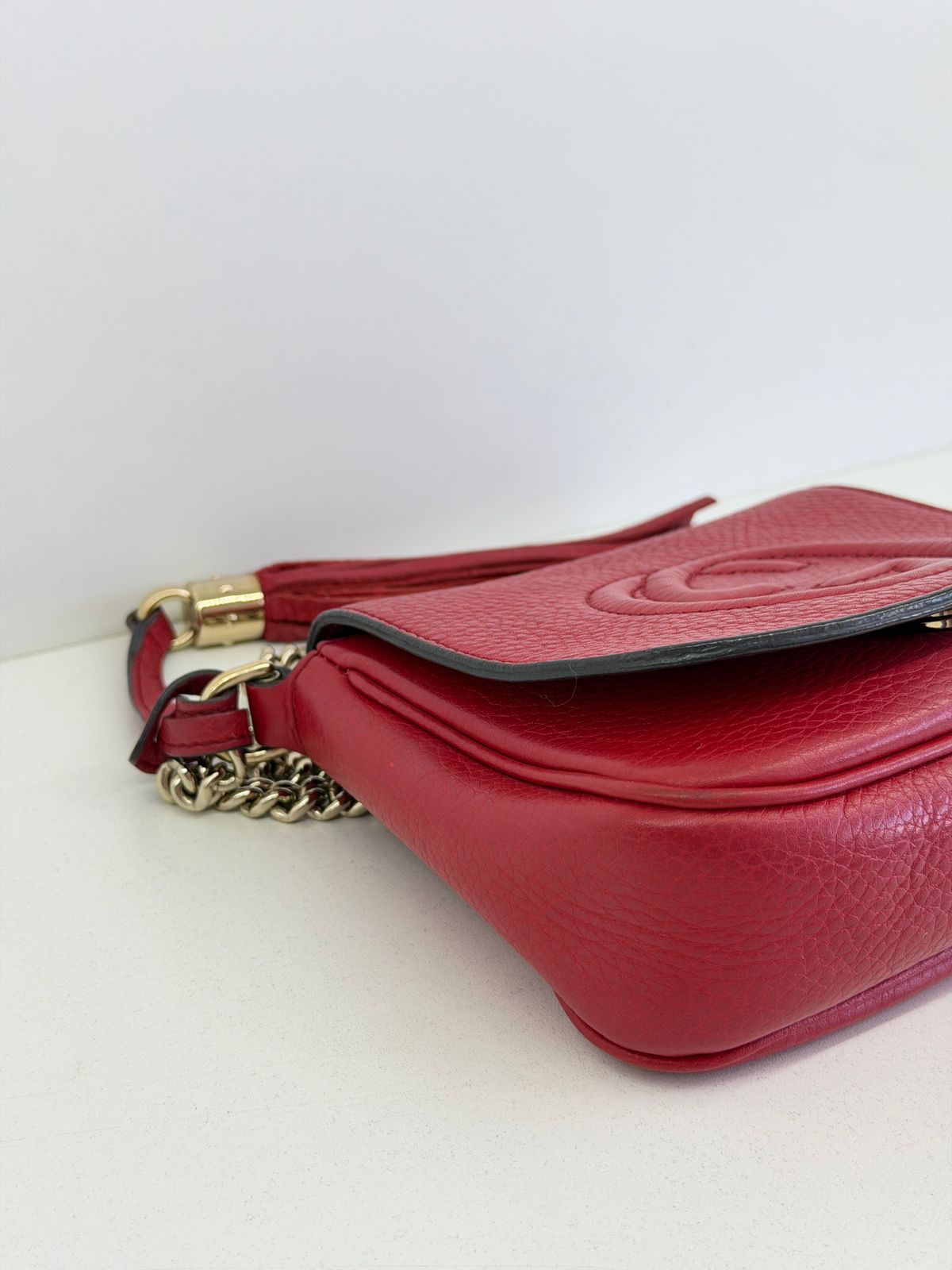 Bolsa Gucci Soho Chain, confeccionada em couro calfskin vermelho com duplo GG, bolsa retangular , fecho por aba flap e botão de pressão, forro em tecido, ferragens no dourado, alças de corrente de ombro, possui compartimento único, um bolso com plano. Uma bolsa com design estruturado, sendo perfeita para eventos, jantares, ocasiões especiais ou até para transformar um look básico em uma produção poderosa.