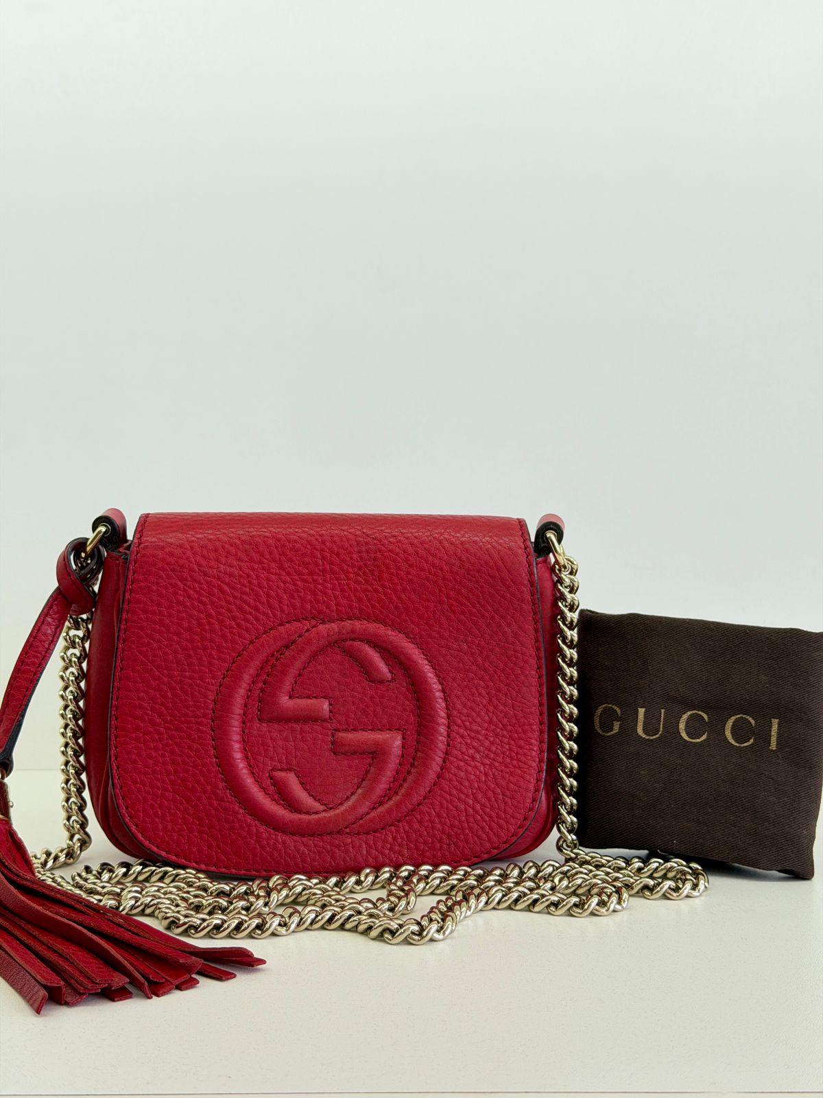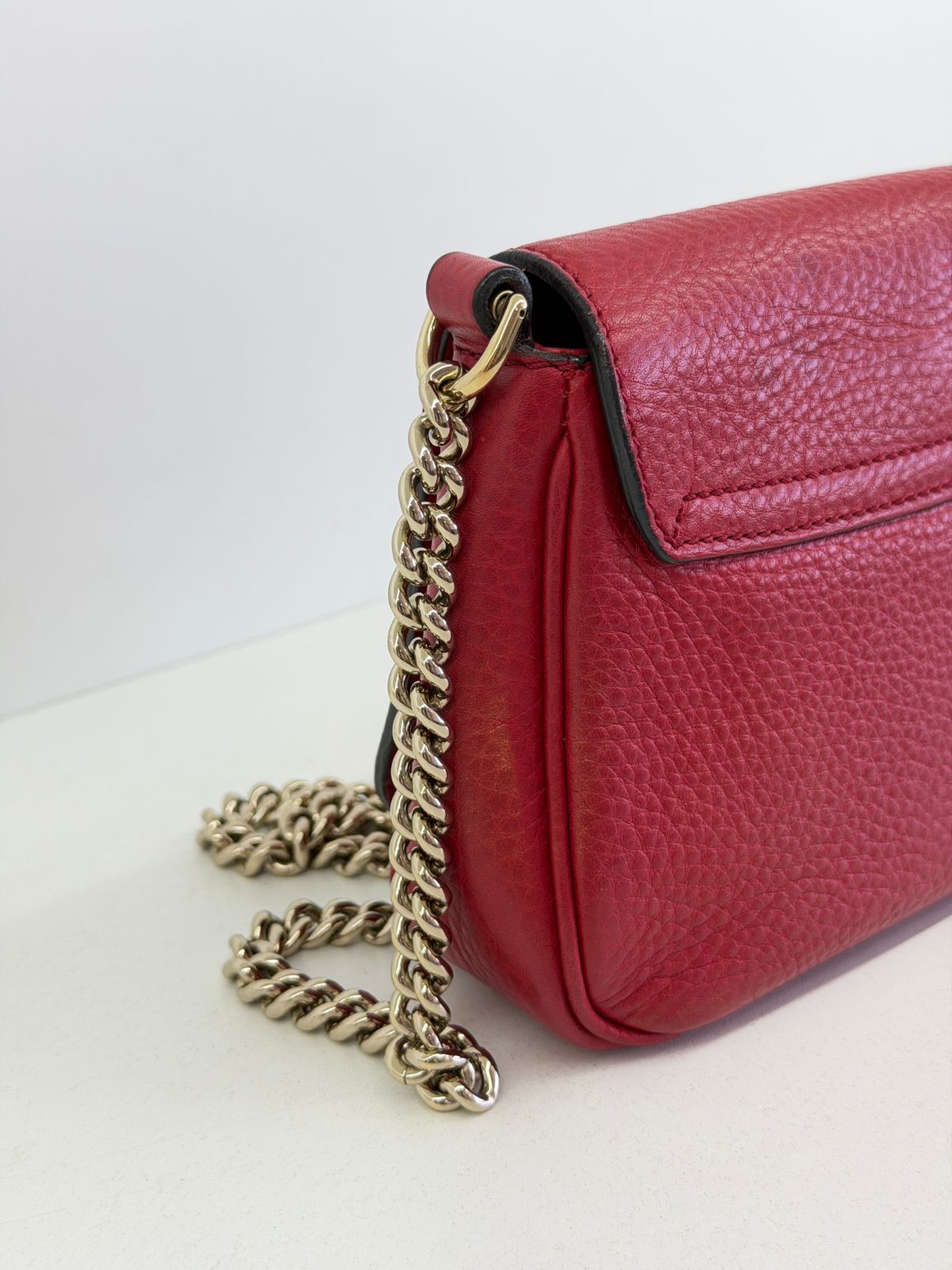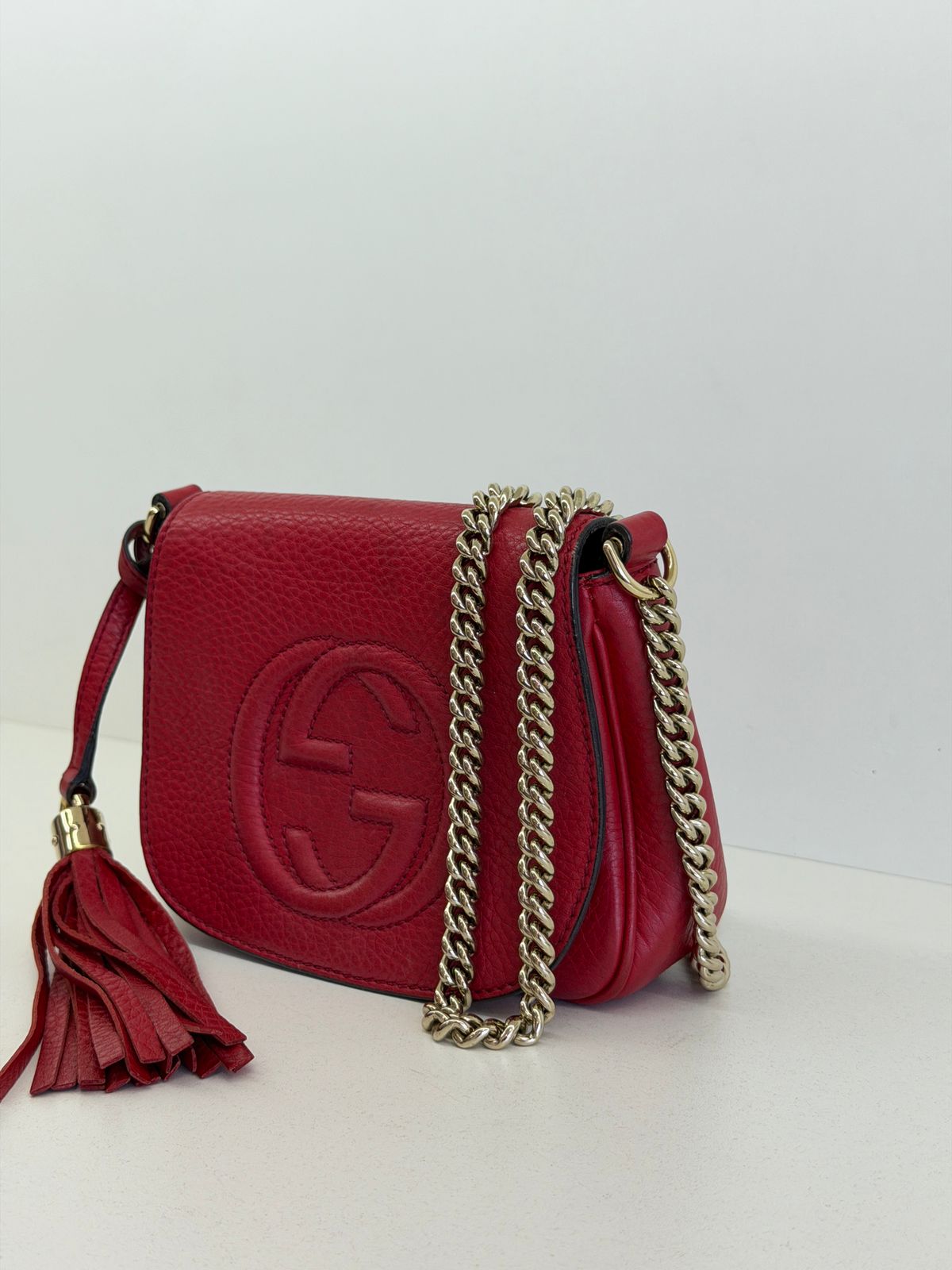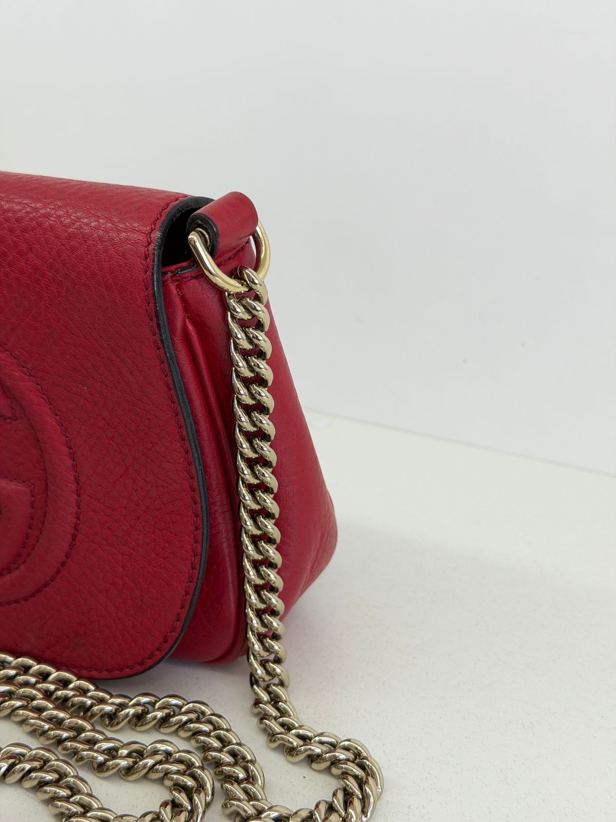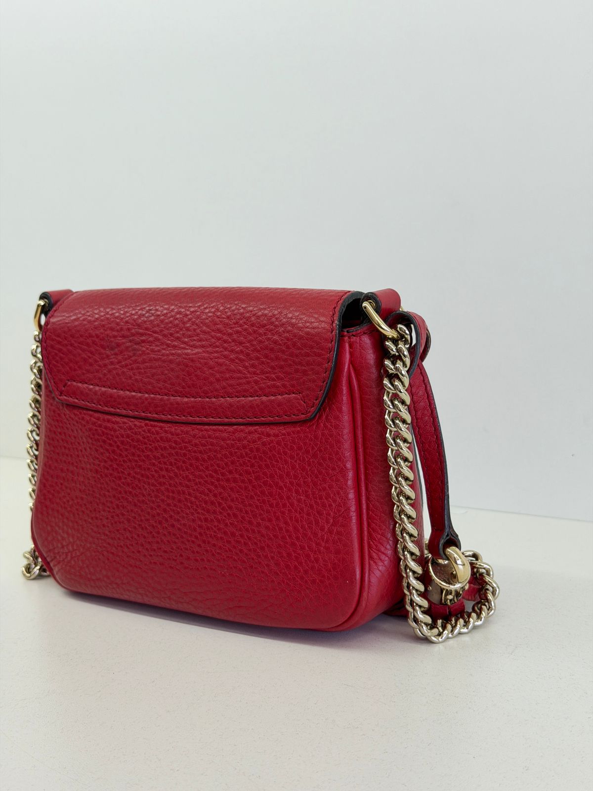 Bolsa Gucci Soho Chain, confeccionada em couro calfskin vermelho com duplo GG, bolsa retangular , fecho por aba flap e botão de pressão, forro em tecido, ferragens no dourado, alças de corrente de ombro, possui compartimento único, um bolso com plano. Uma bolsa com design estruturado, sendo perfeita para eventos, jantares, ocasiões especiais ou até para transformar um look básico em uma produção poderosa.