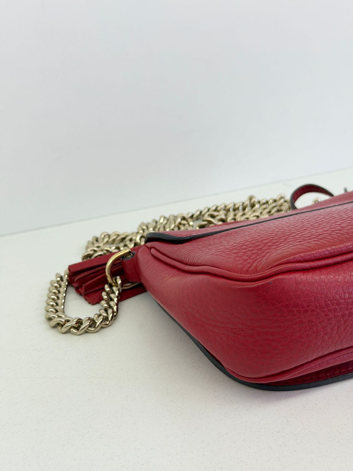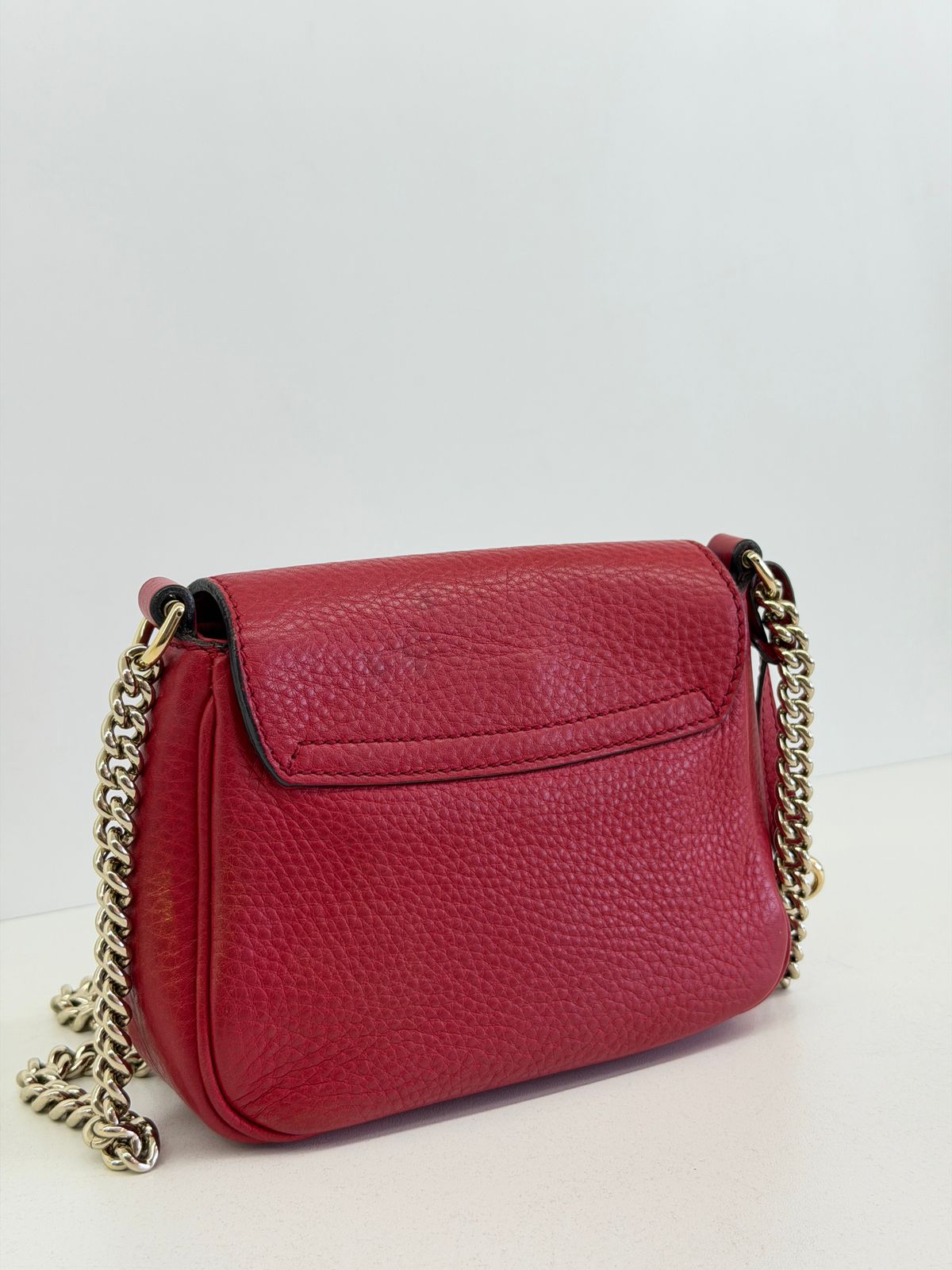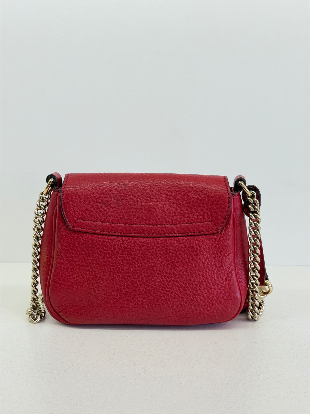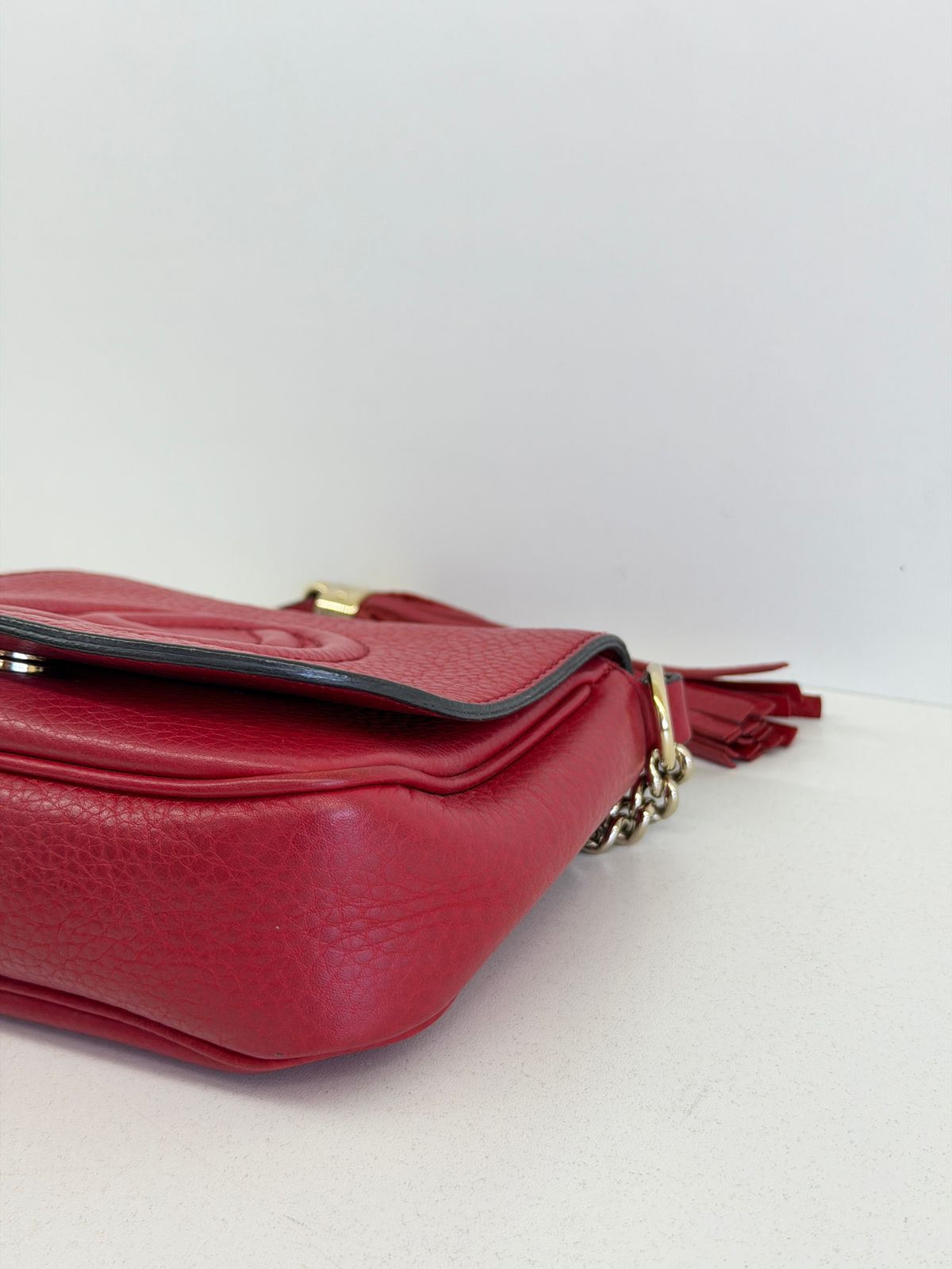 Bolsa Gucci Soho Chain, confeccionada em couro calfskin vermelho com duplo GG, bolsa retangular , fecho por aba flap e botão de pressão, forro em tecido, ferragens no dourado, alças de corrente de ombro, possui compartimento único, um bolso com plano. Uma bolsa com design estruturado, sendo perfeita para eventos, jantares, ocasiões especiais ou até para transformar um look básico em uma produção poderosa.