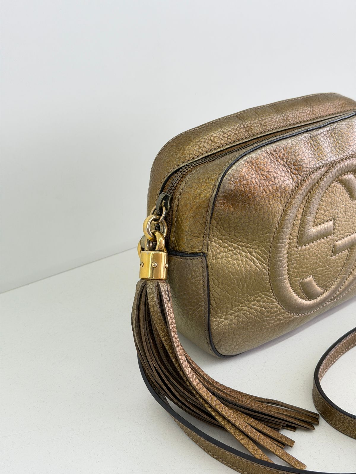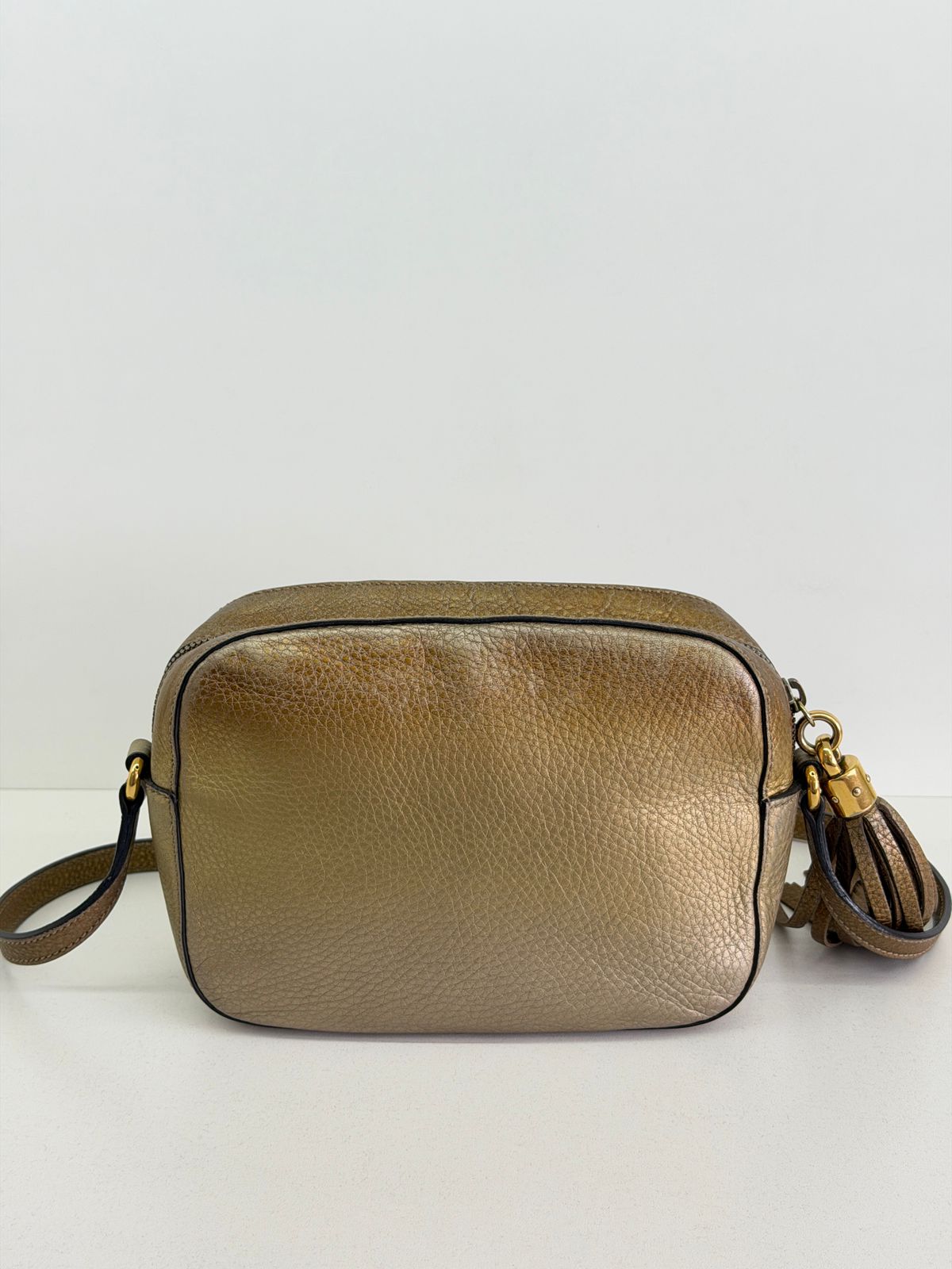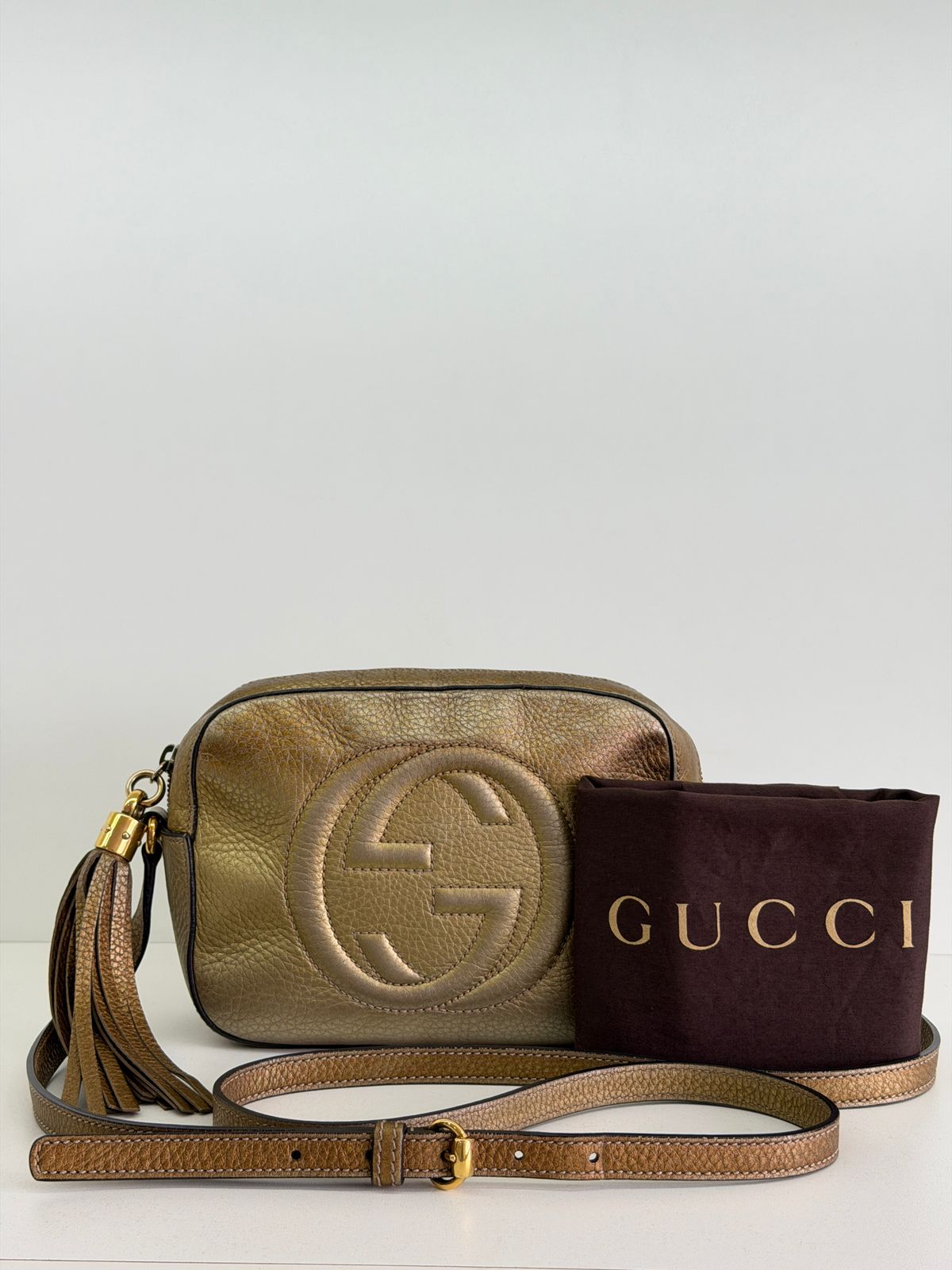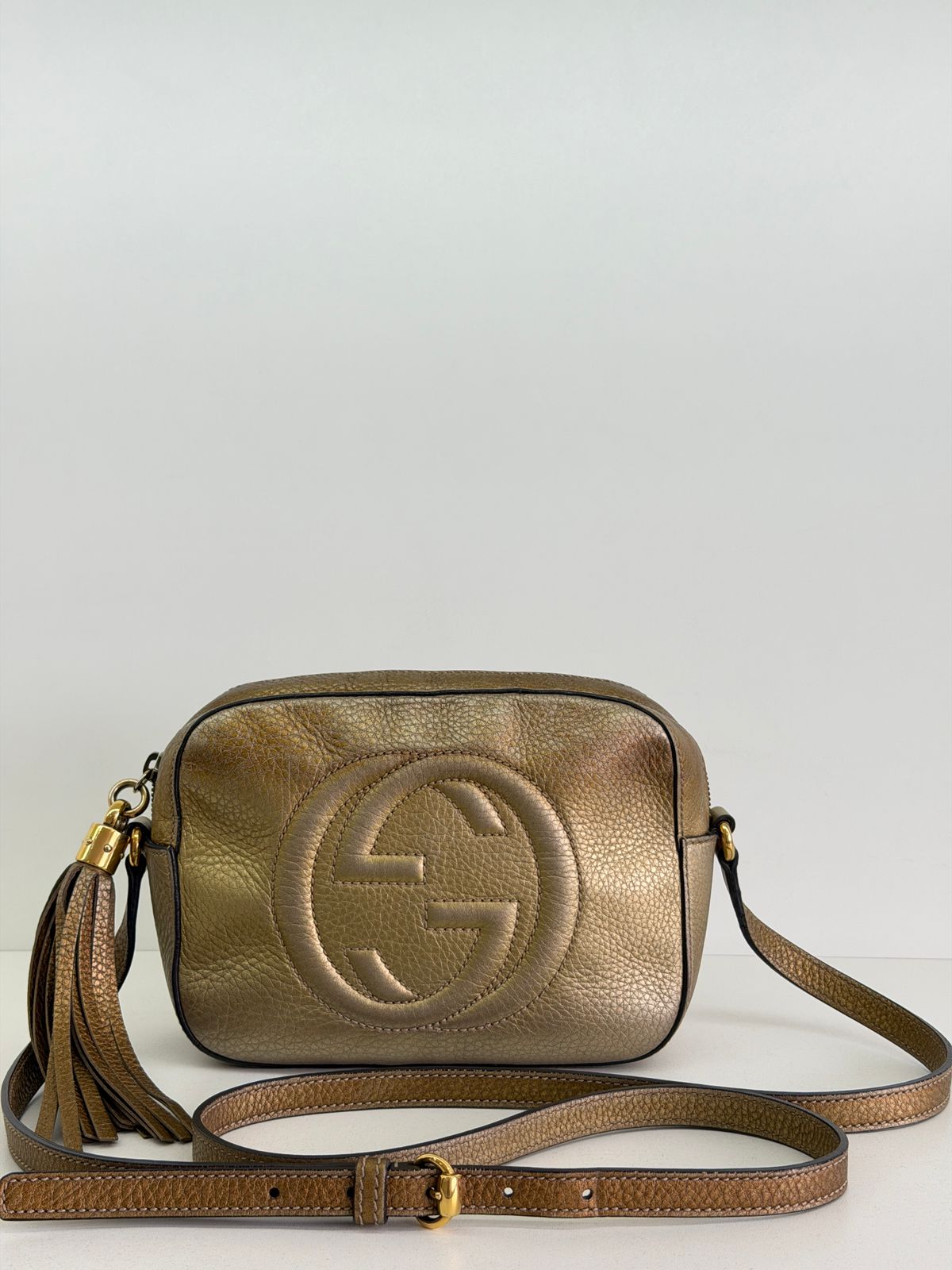 Bolsa Gucci Soho Disco Degradê. Bolsa em couro calfskin no dourado, acabamento em couro , compartimento único, tendo dois bolsos plano interno, forro em tecido, possui monograma da marca bordado em relevo na parte frontal, alças longa de ombro ajustável que permite seu uso de modo transversal ou no ombro, fechamento por zíper que possui um pingente tassel em couro. Possui um formato estruturado, sofisticada, pratica, design compacto, uma peça  extremamente elegante.