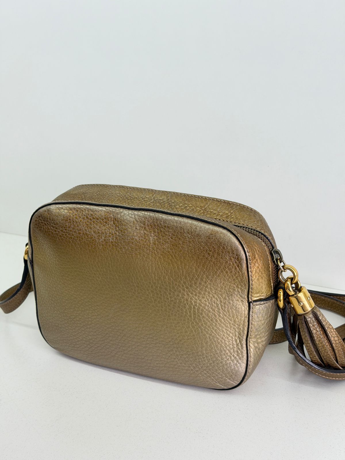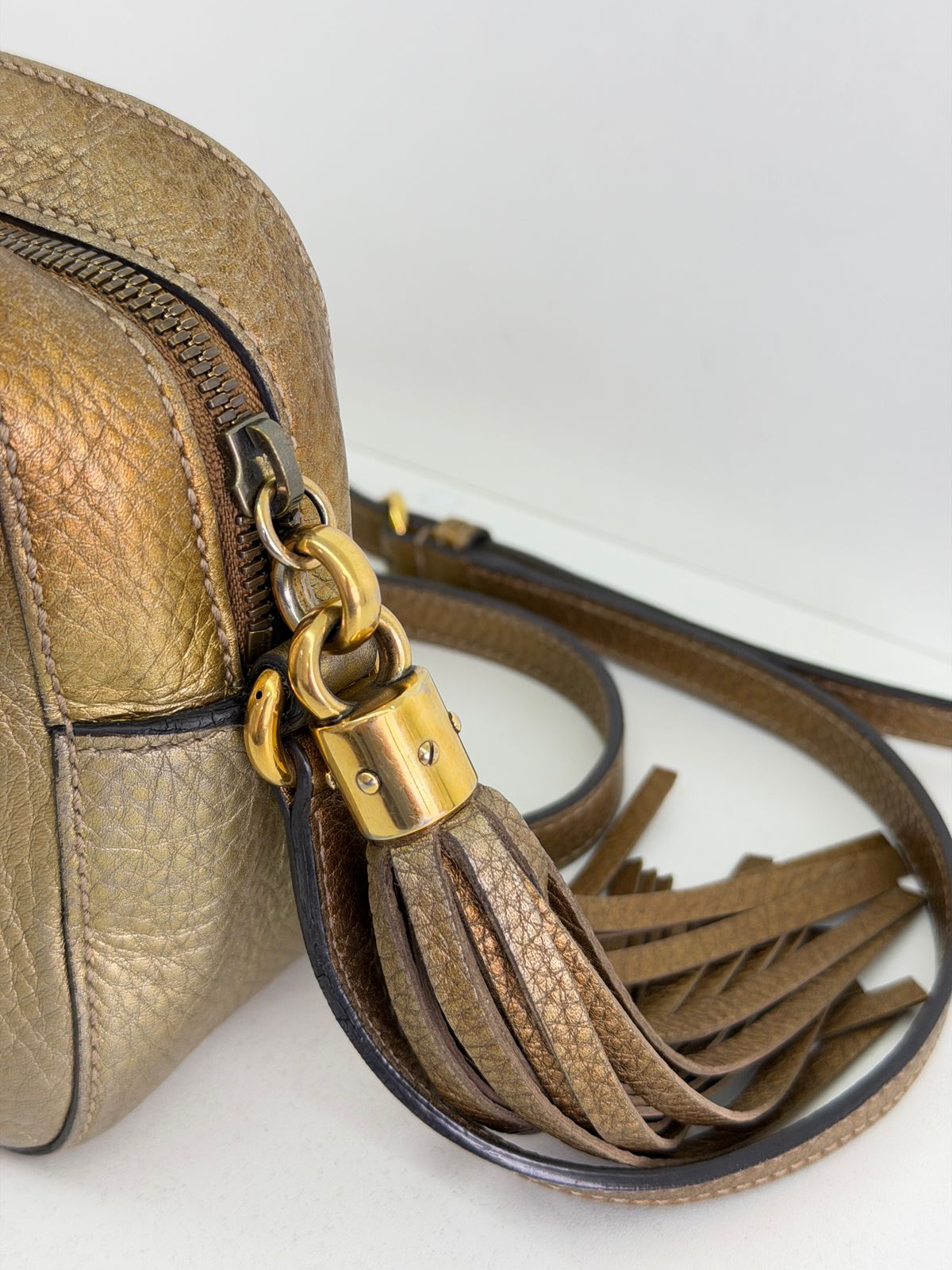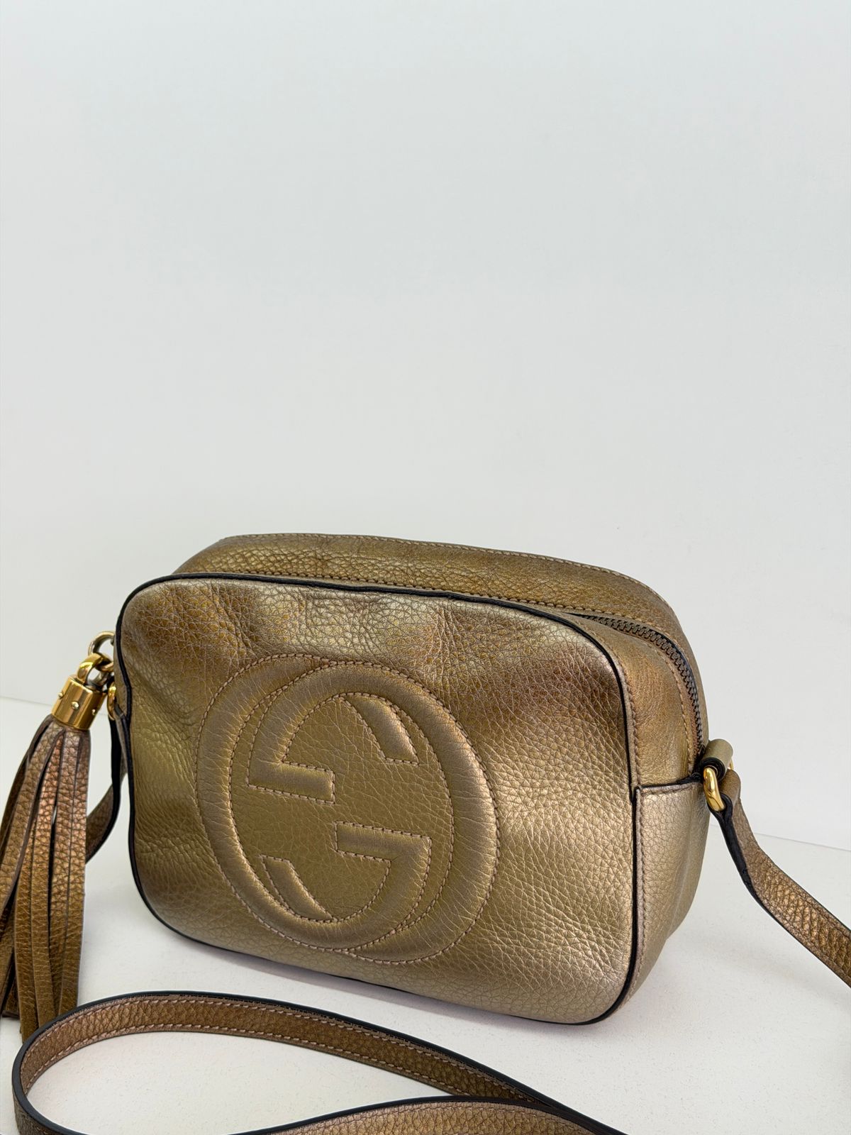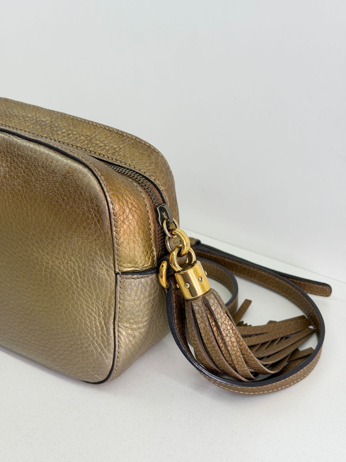 Bolsa Gucci Soho Disco Degradê. Bolsa em couro calfskin no dourado, acabamento em couro , compartimento único, tendo dois bolsos plano interno, forro em tecido, possui monograma da marca bordado em relevo na parte frontal, alças longa de ombro ajustável que permite seu uso de modo transversal ou no ombro, fechamento por zíper que possui um pingente tassel em couro. Possui um formato estruturado, sofisticada, pratica, design compacto, uma peça  extremamente elegante.