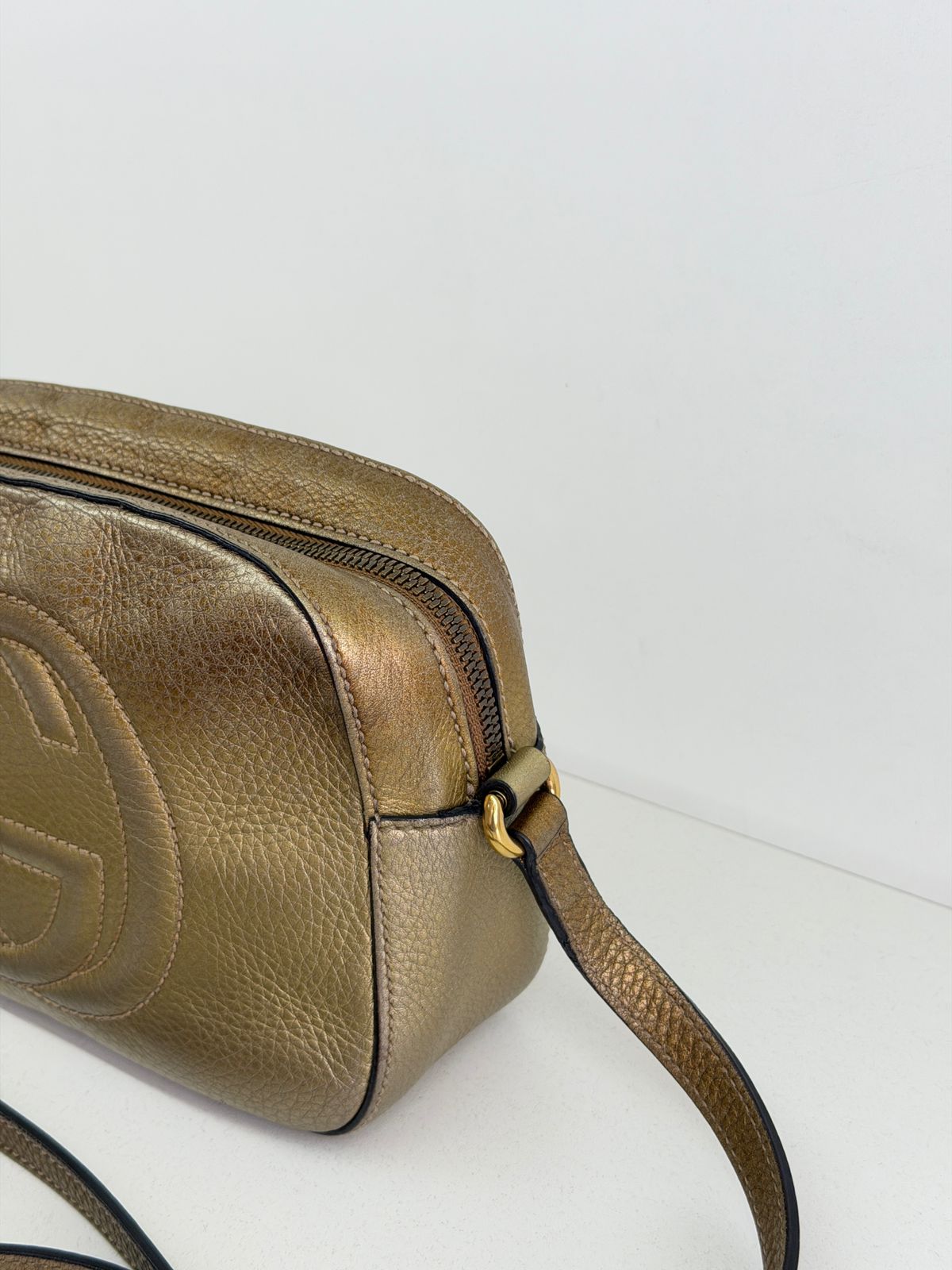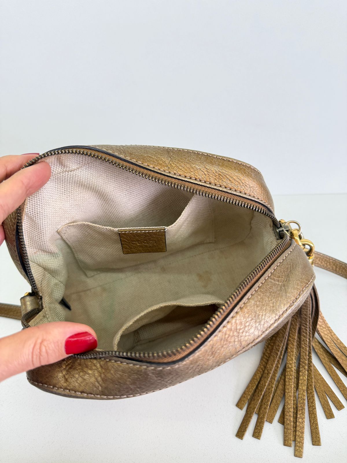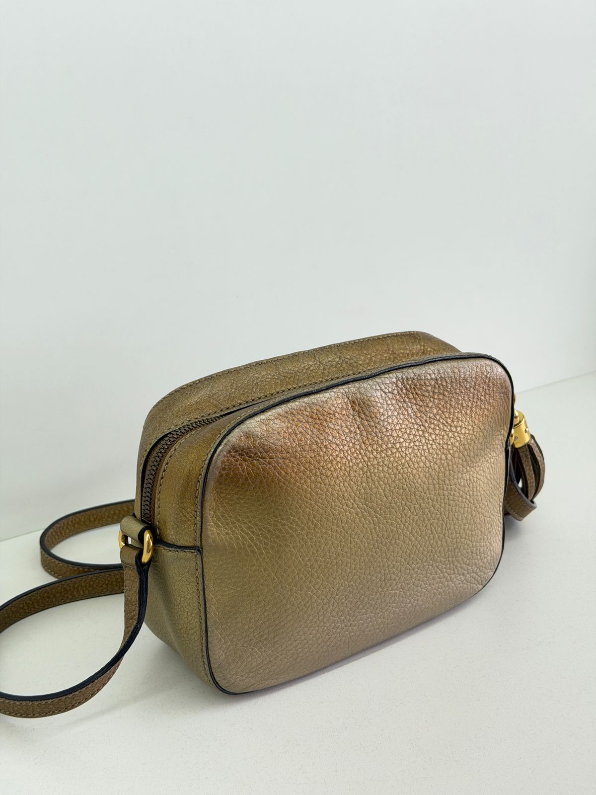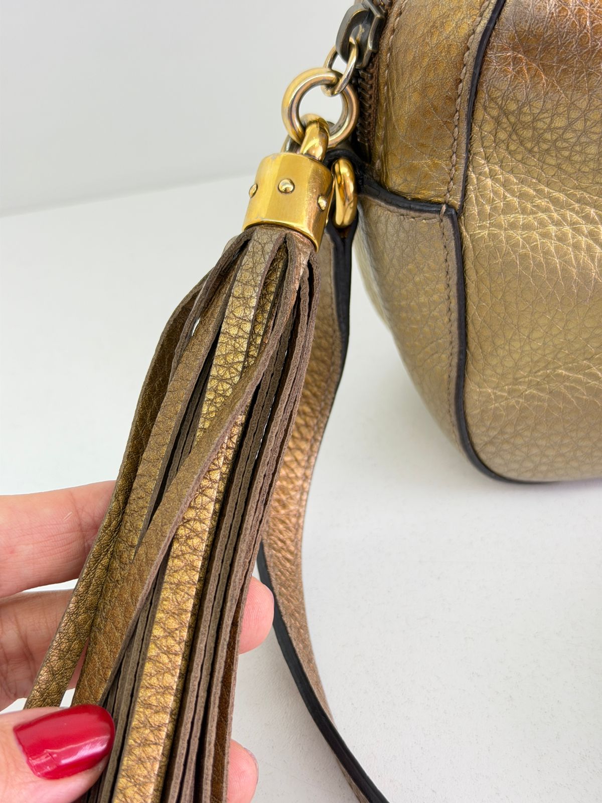 Bolsa Gucci Soho Disco Degradê. Bolsa em couro calfskin no dourado, acabamento em couro , compartimento único, tendo dois bolsos plano interno, forro em tecido, possui monograma da marca bordado em relevo na parte frontal, alças longa de ombro ajustável que permite seu uso de modo transversal ou no ombro, fechamento por zíper que possui um pingente tassel em couro. Possui um formato estruturado, sofisticada, pratica, design compacto, uma peça  extremamente elegante.