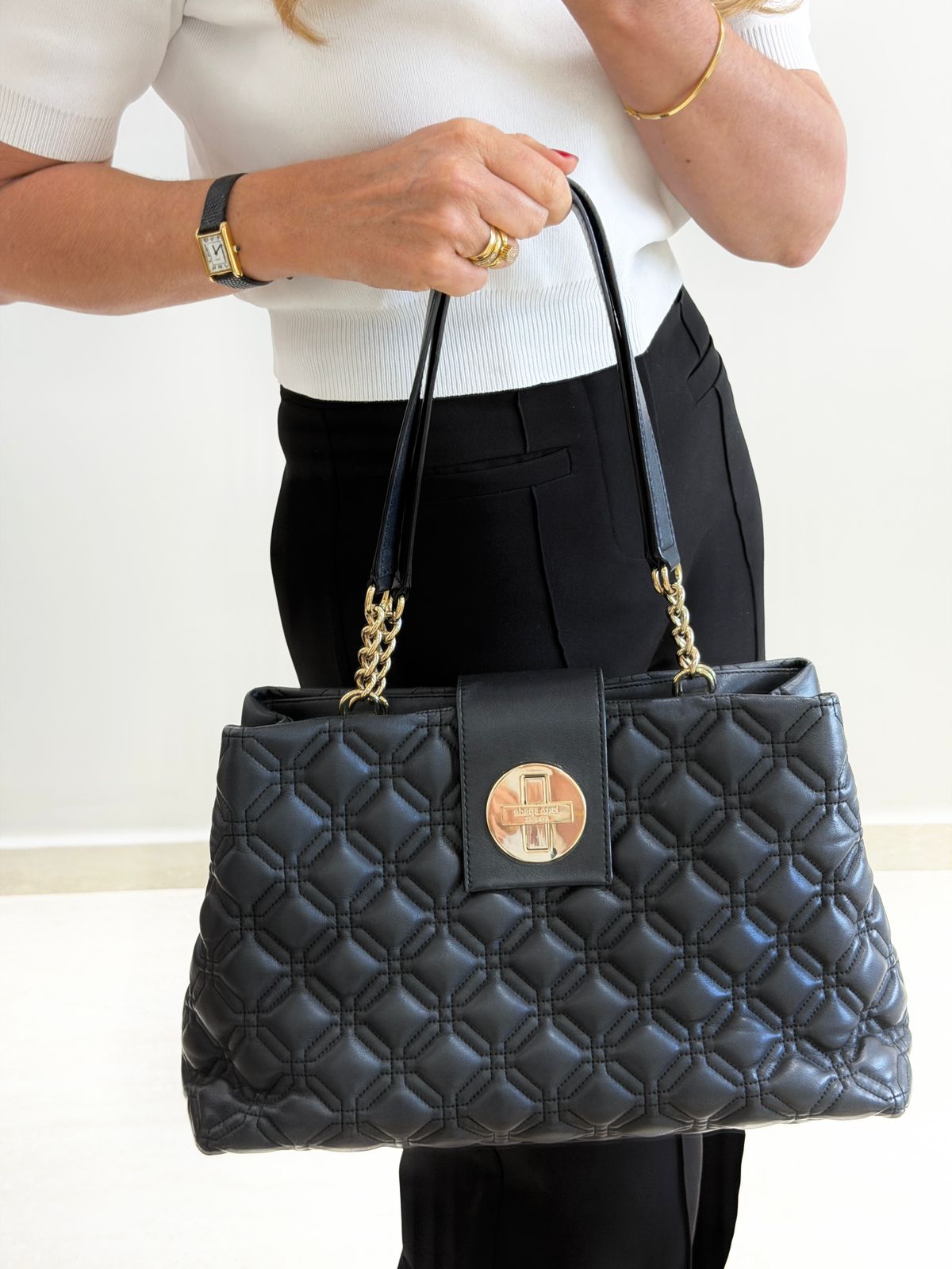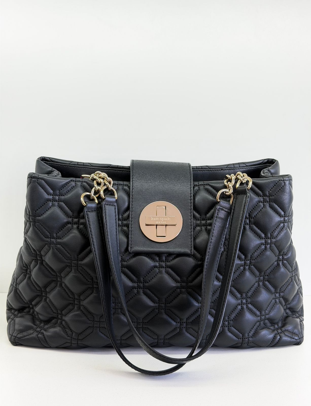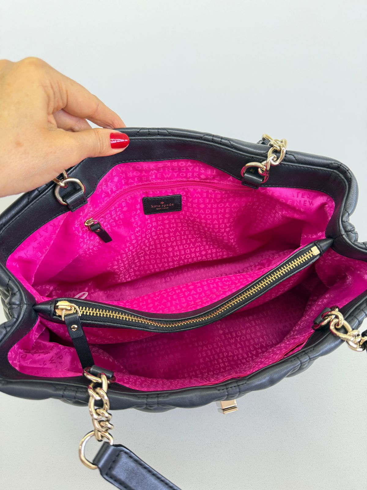Bolsa Kate Spade Astor Court Elena, modelo tote, confeccionada em couro com acabamento matelassê na cor preta. Possui alça dupla de ombro em couro e corrente, ferragens no dourado, fecho por turnlock, forro em tecido na cor pink, compartimento interno duplo separado por um bolso com fecho em zíper, possui mais bolsos em cada compartimento, um com fecho em zíper e dois planos. Uma peça clássica e elegante, indispensável para mulheres que valorizam funcionalidade e estilo em todos os momentos.