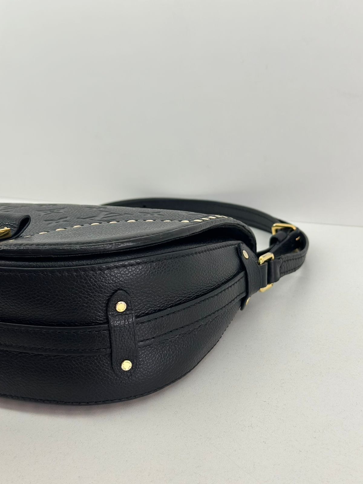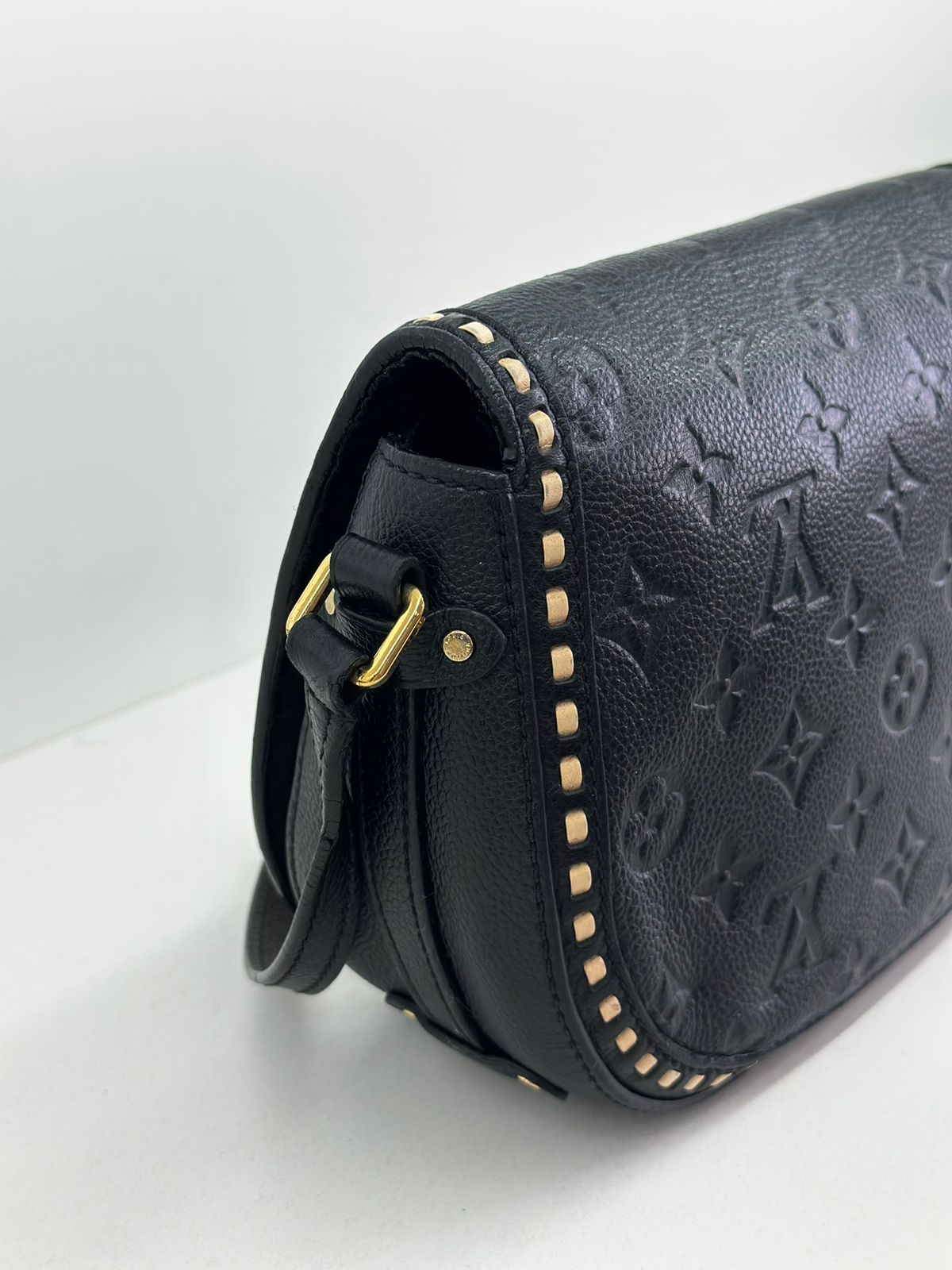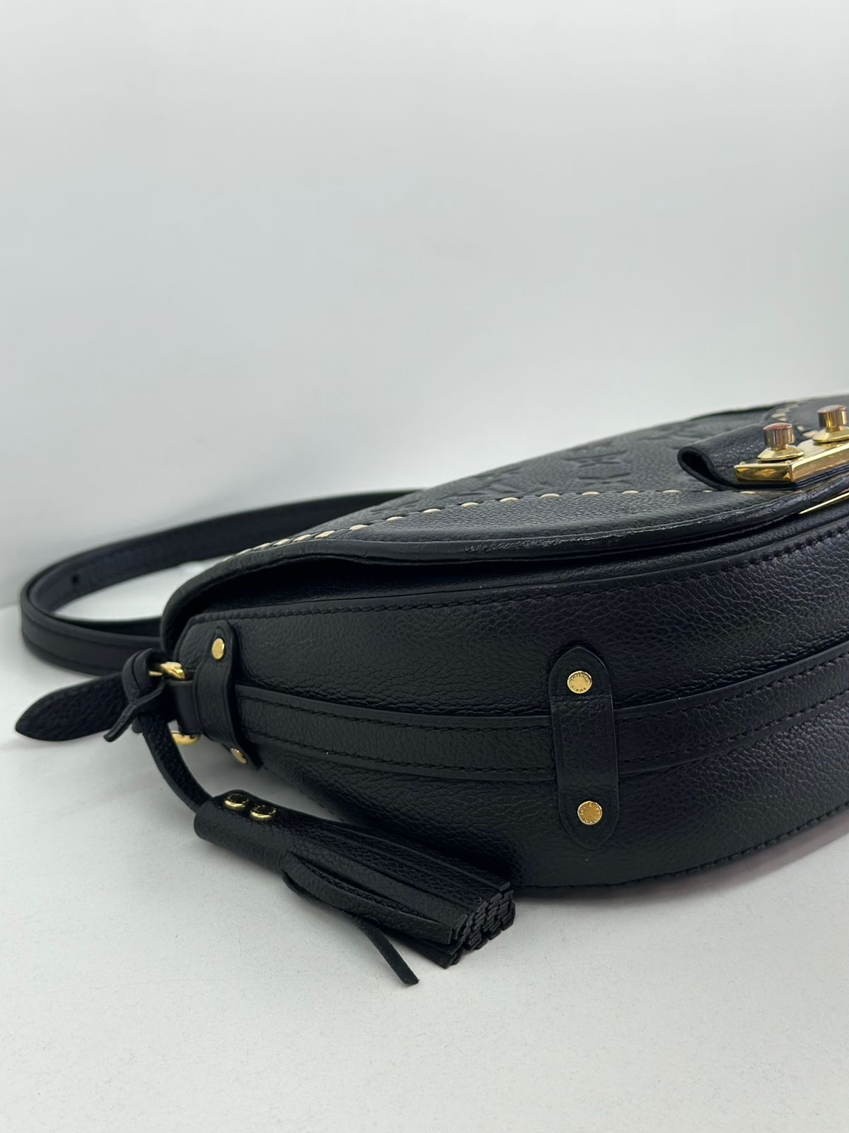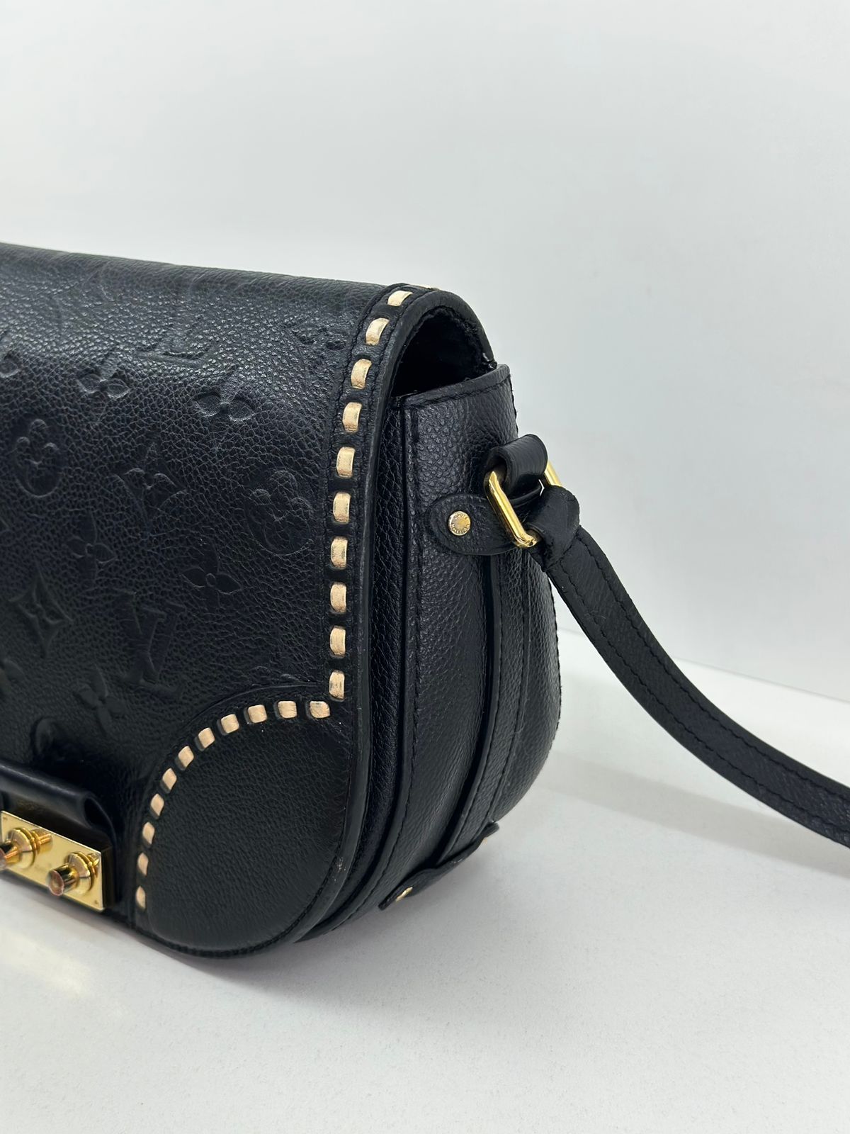 Bolsa Louis Vuitton Junot Empreinte Crossbody, confeccionada no clássico canvas monogram na cor preta em relevo, ferragens no dourado, fecho encaixe e aba flap, alça única em couro ajustável, podendo ser usada transversal ou de ombro, compartimento interno único, com um bolso plano. Uma bolsa que une elegância e modernidade em um design compacto e funcional. Ideal para o dia a dia ou ocasiões casuais.