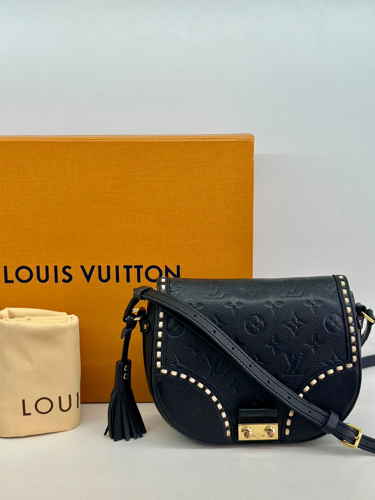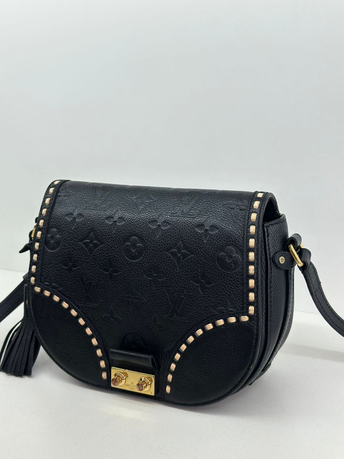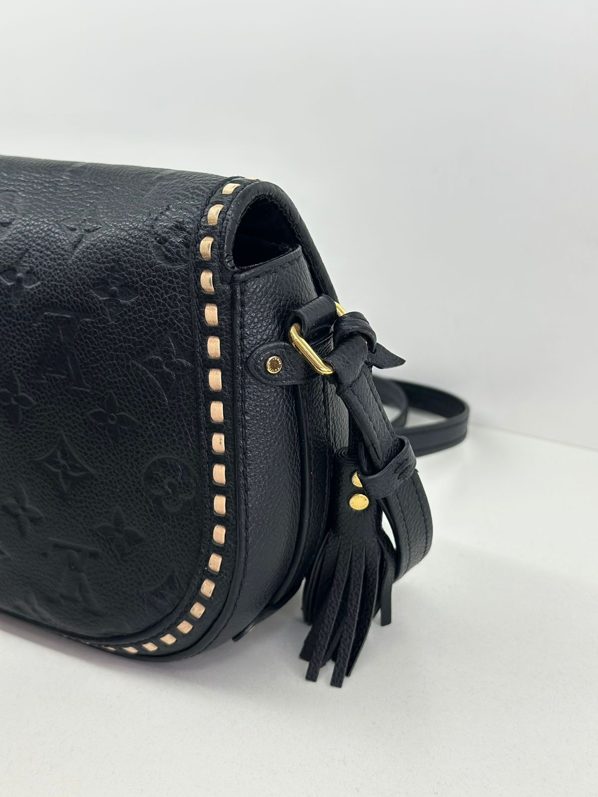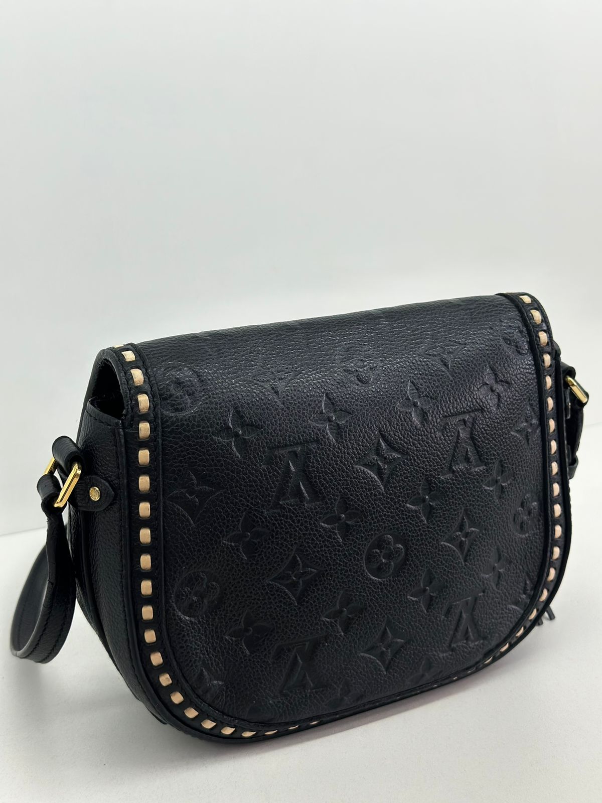 Bolsa Louis Vuitton Junot Empreinte Crossbody, confeccionada no clássico canvas monogram na cor preta em relevo, ferragens no dourado, fecho encaixe e aba flap, alça única em couro ajustável, podendo ser usada transversal ou de ombro, compartimento interno único, com um bolso plano. Uma bolsa que une elegância e modernidade em um design compacto e funcional. Ideal para o dia a dia ou ocasiões casuais.