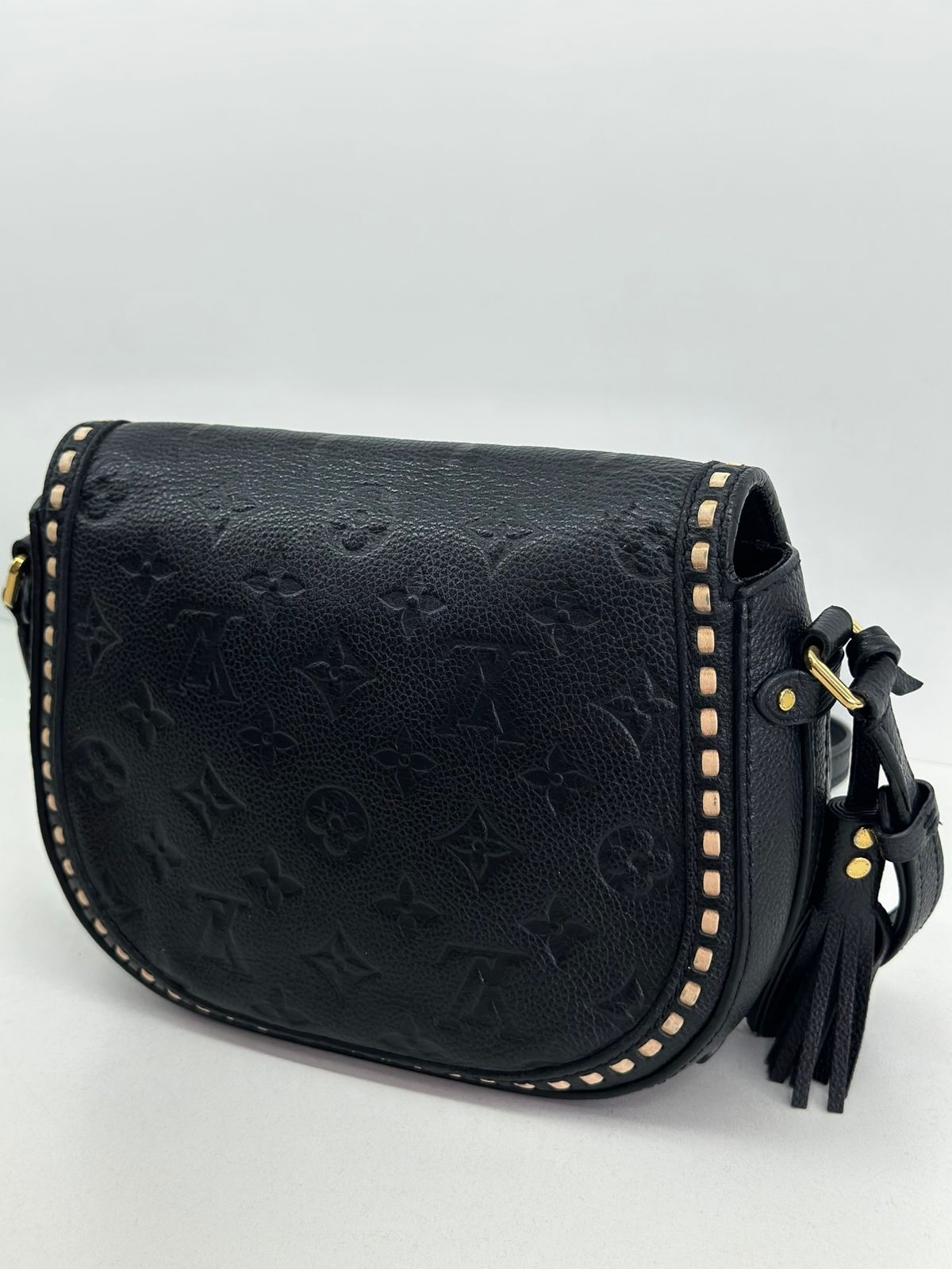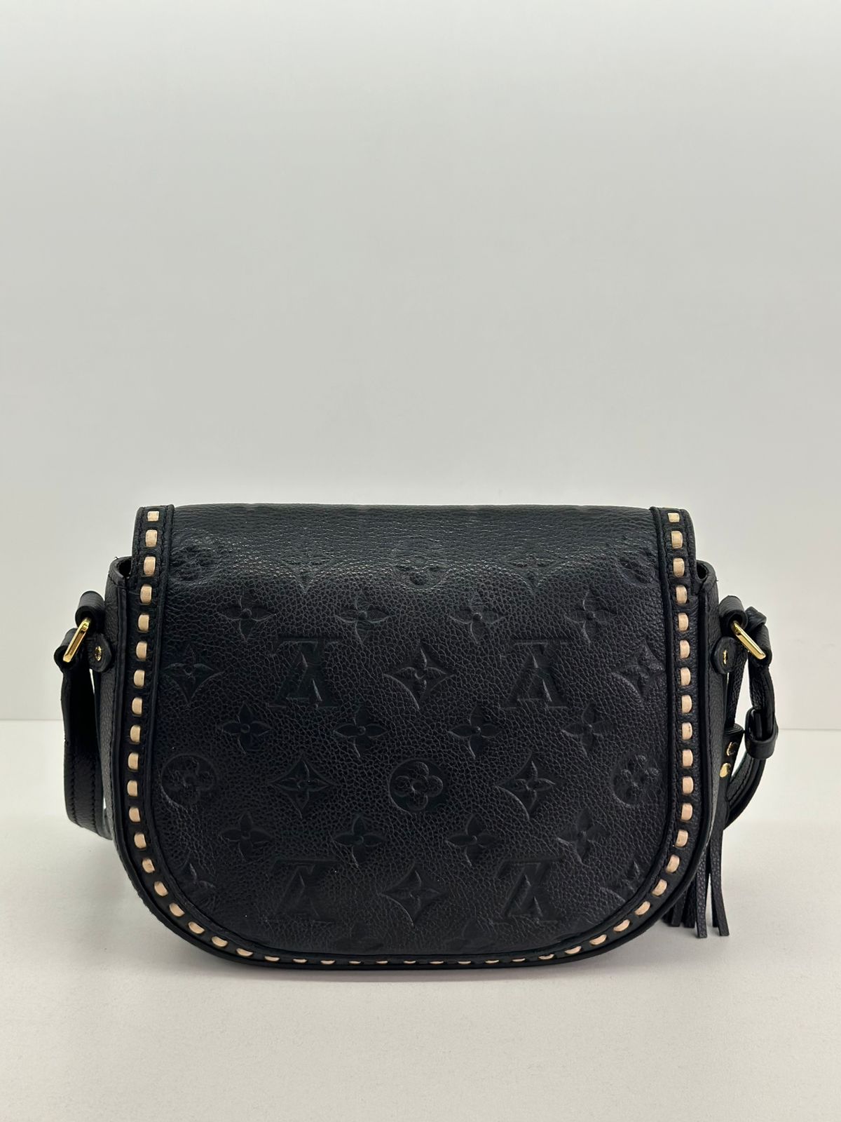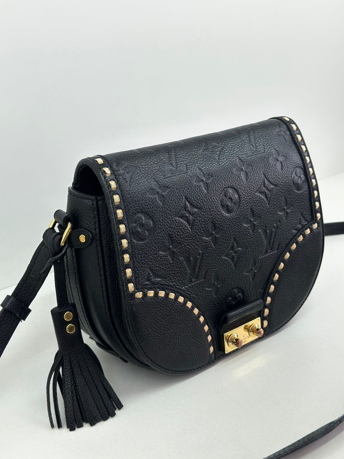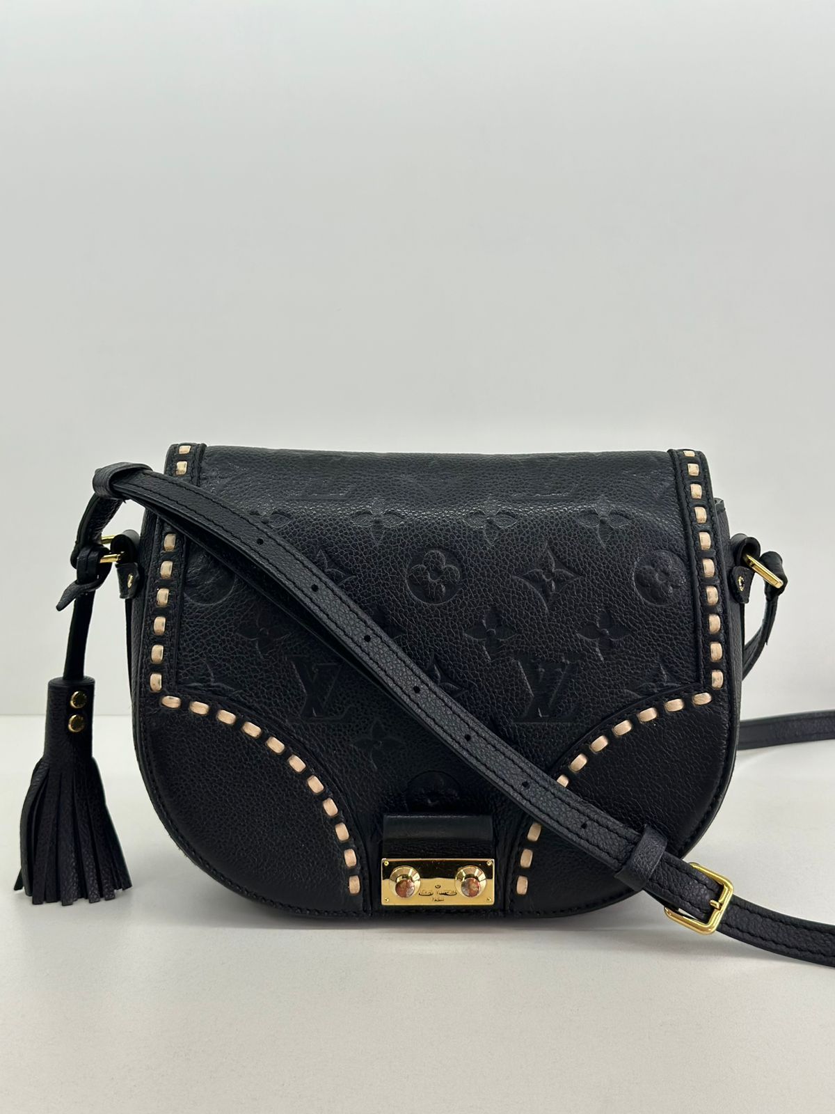 Bolsa Louis Vuitton Junot Empreinte Crossbody, confeccionada no clássico canvas monogram na cor preta em relevo, ferragens no dourado, fecho encaixe e aba flap, alça única em couro ajustável, podendo ser usada transversal ou de ombro, compartimento interno único, com um bolso plano. Uma bolsa que une elegância e modernidade em um design compacto e funcional. Ideal para o dia a dia ou ocasiões casuais.