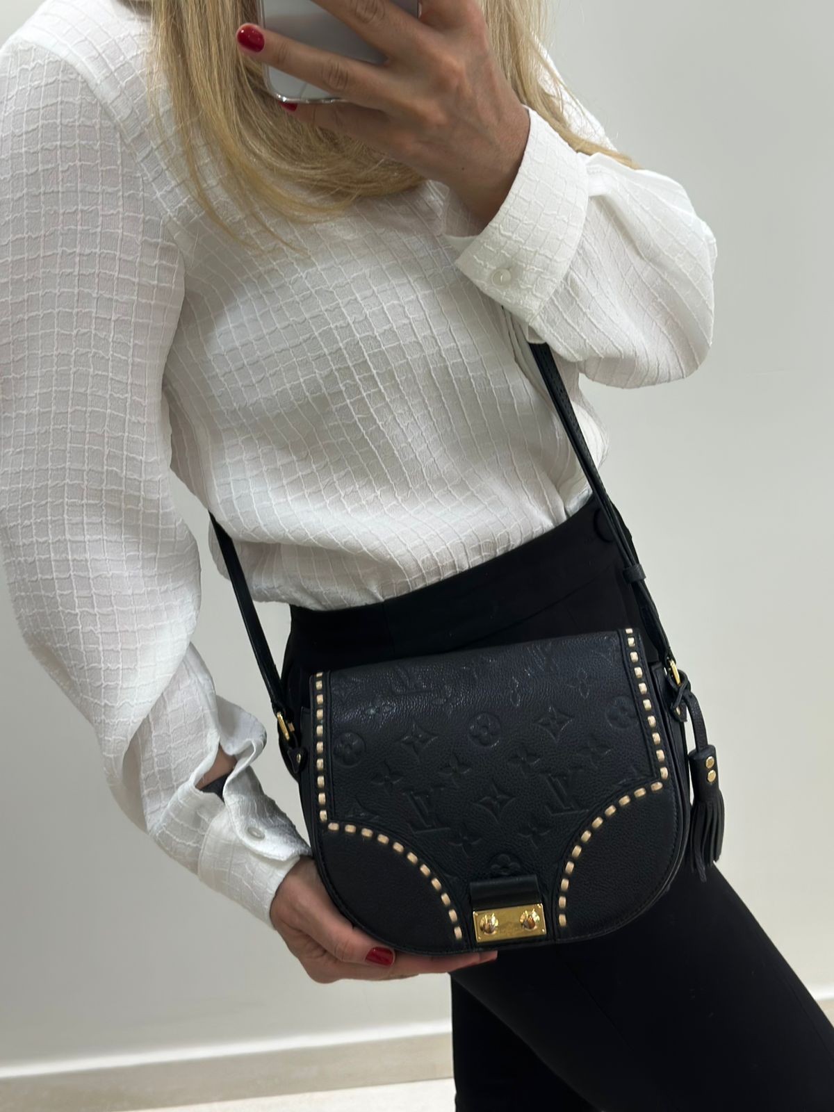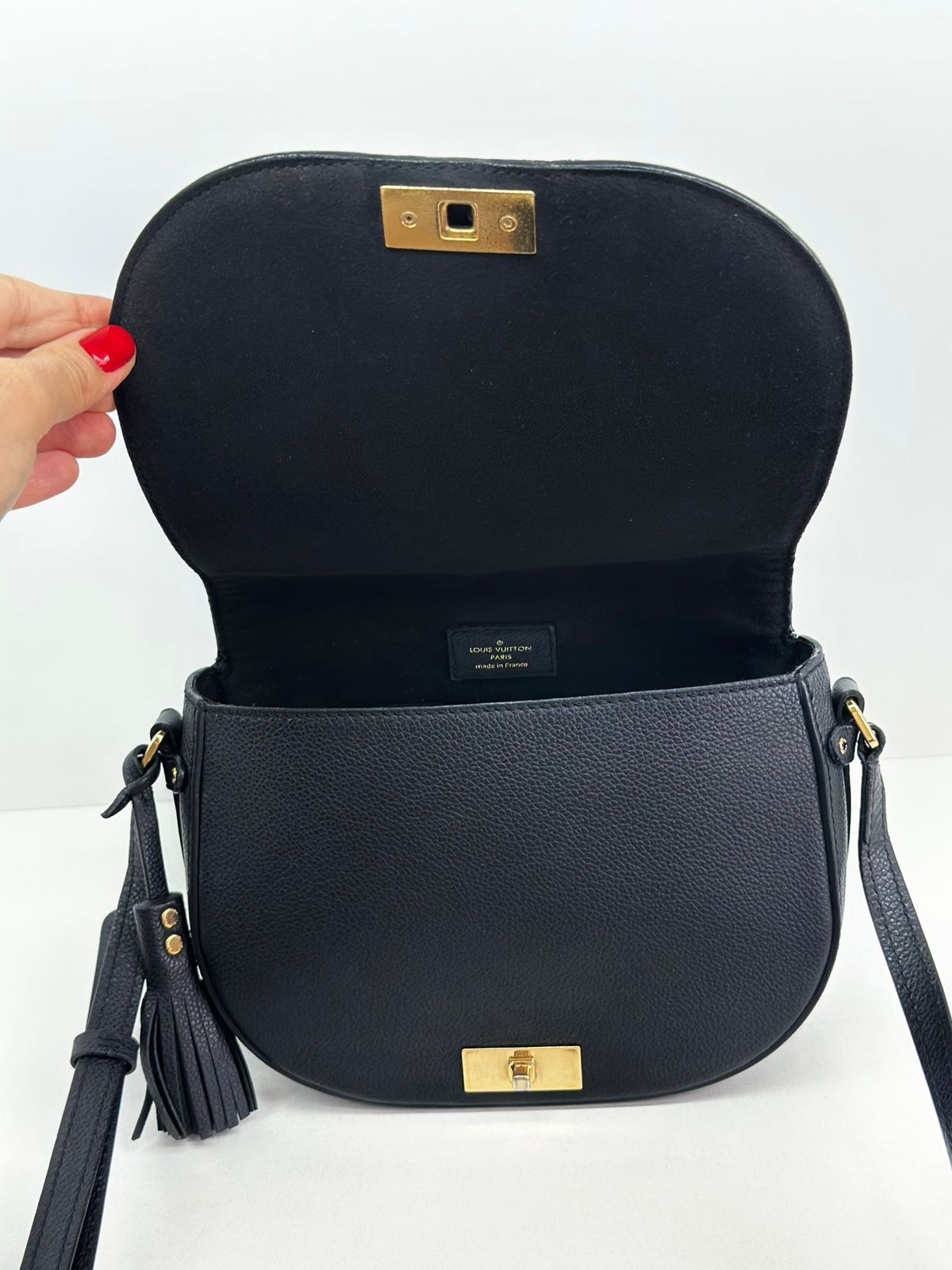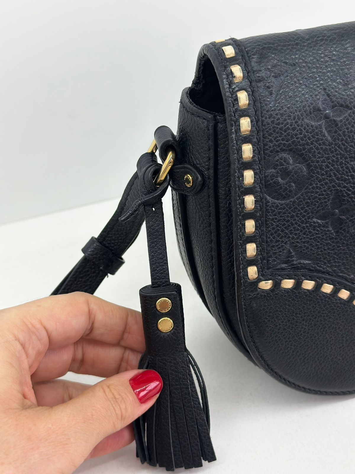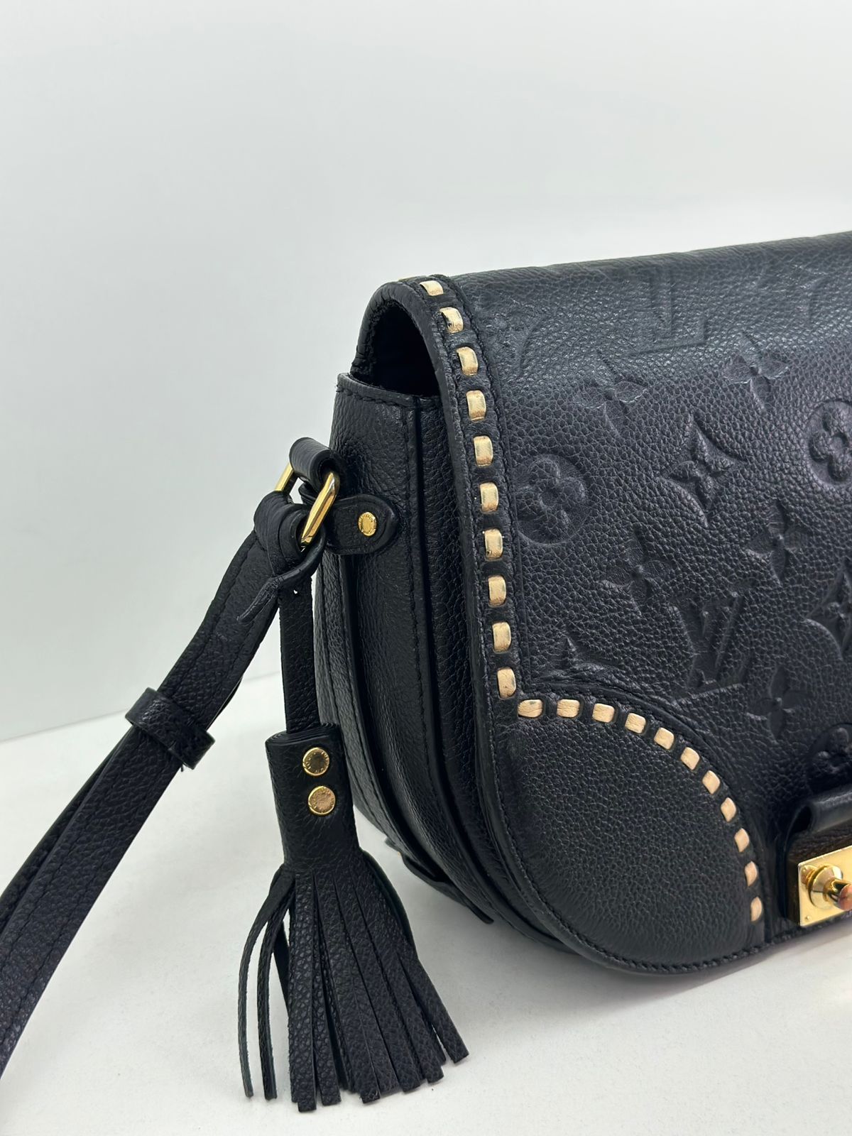 Bolsa Louis Vuitton Junot Empreinte Crossbody, confeccionada no clássico canvas monogram na cor preta em relevo, ferragens no dourado, fecho encaixe e aba flap, alça única em couro ajustável, podendo ser usada transversal ou de ombro, compartimento interno único, com um bolso plano. Uma bolsa que une elegância e modernidade em um design compacto e funcional. Ideal para o dia a dia ou ocasiões casuais.