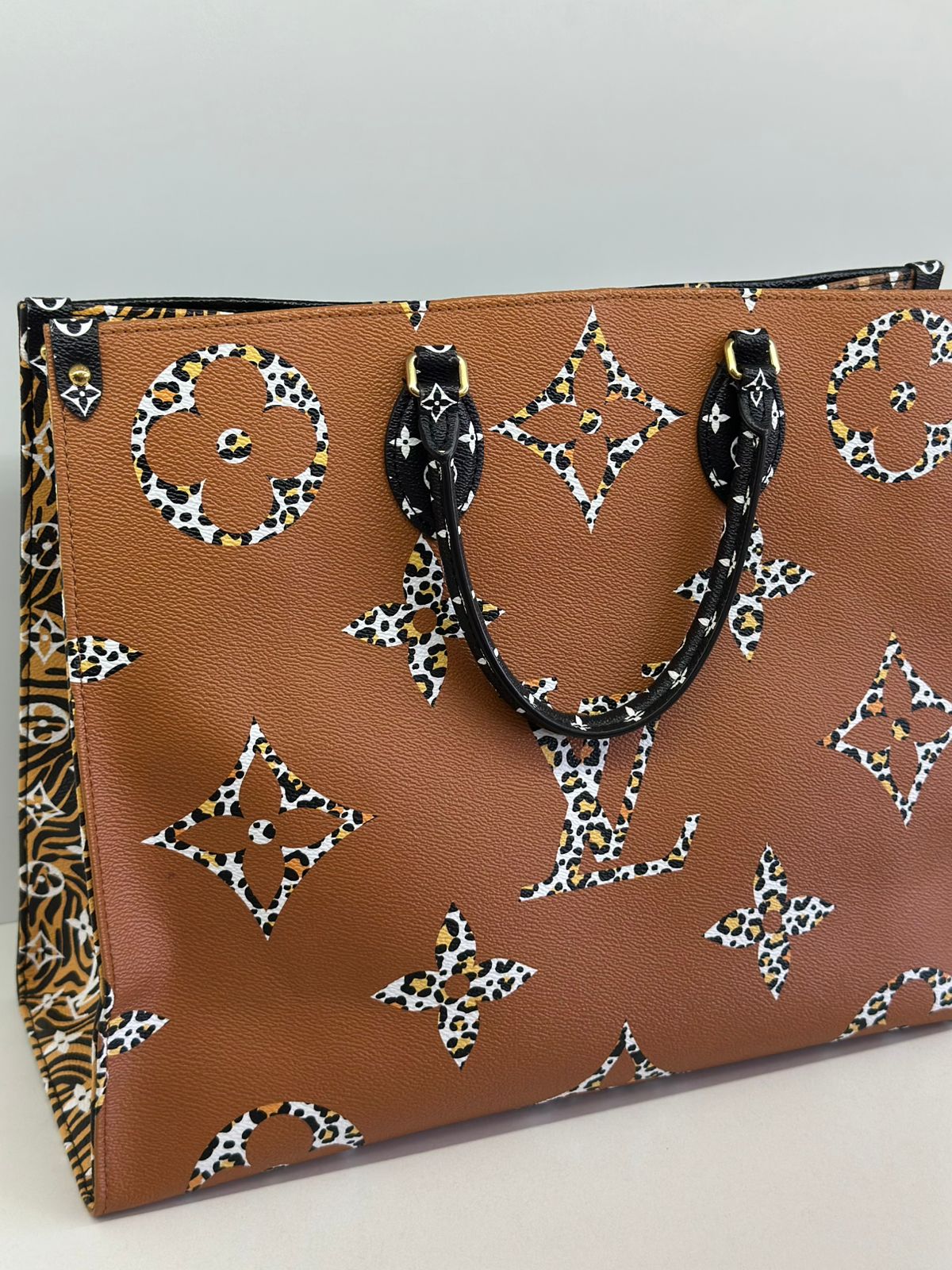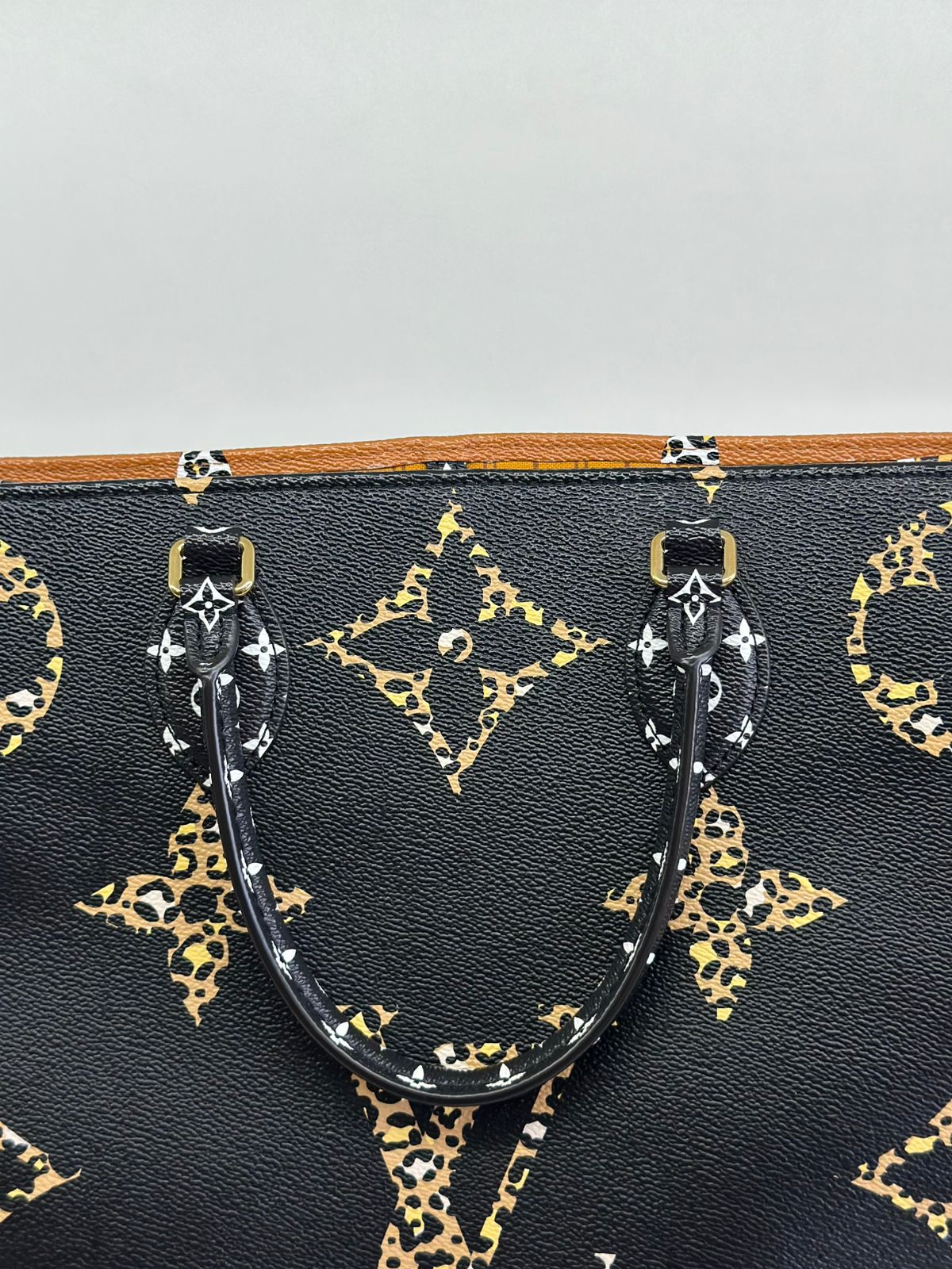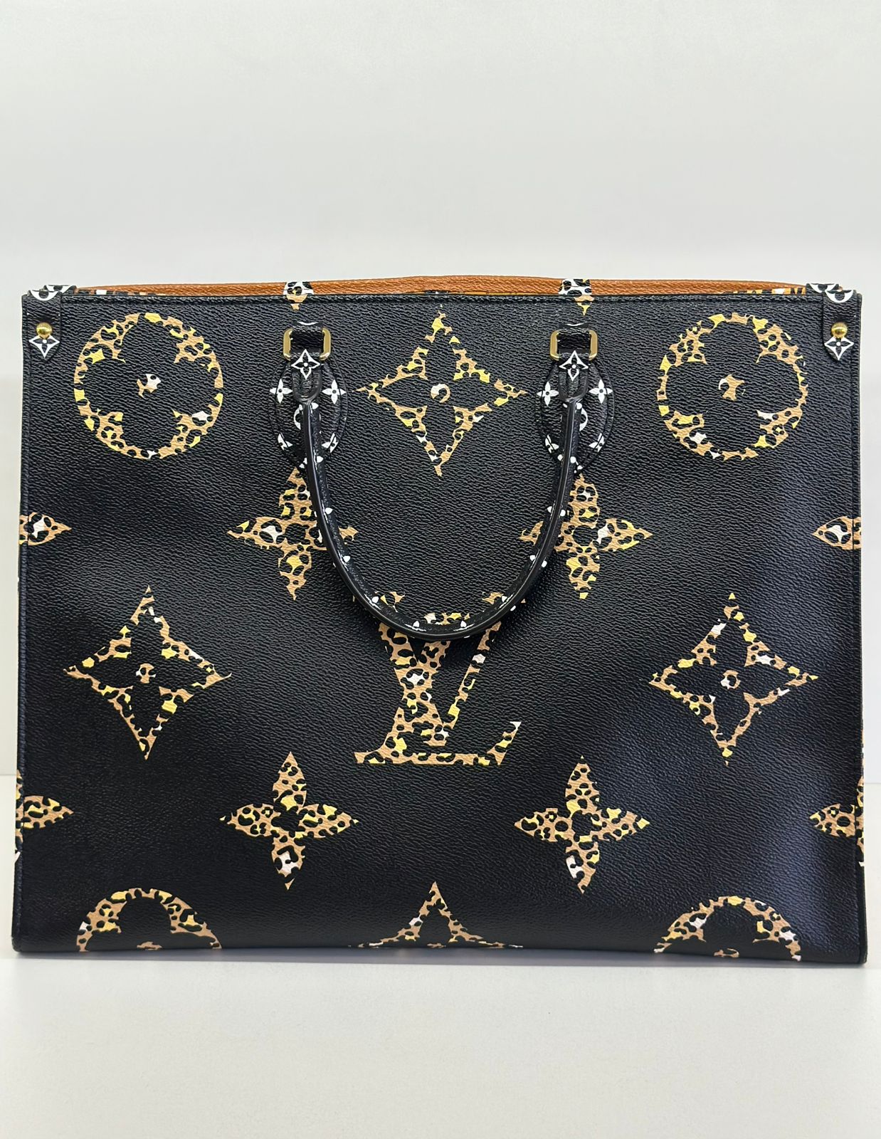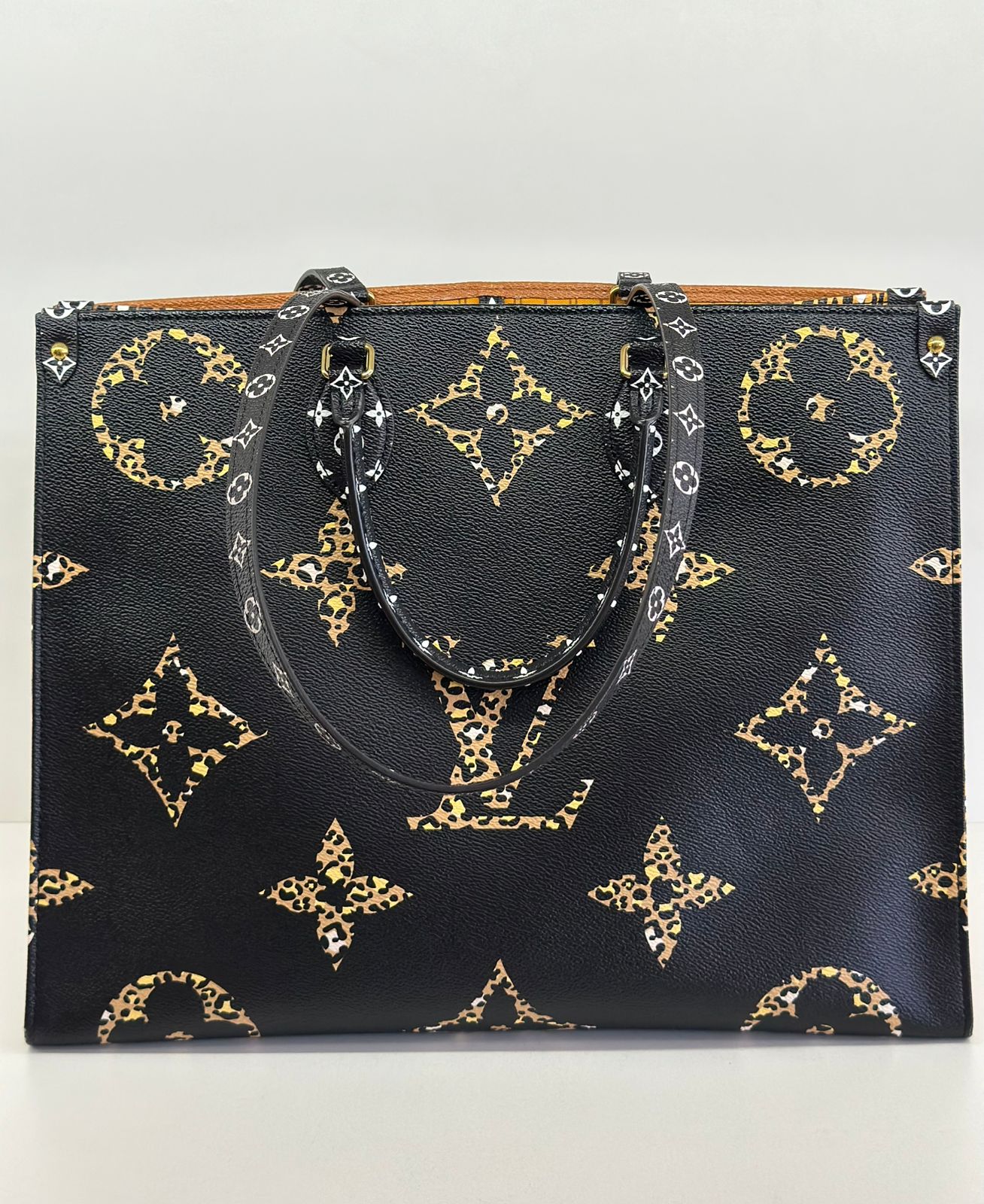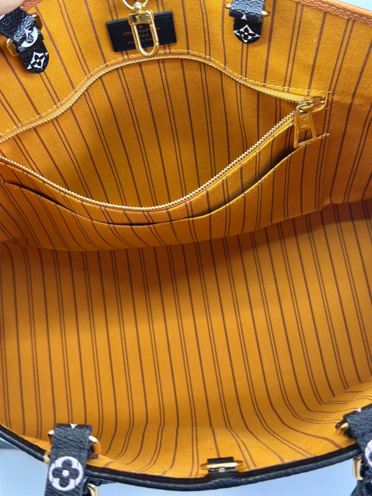 Bolsa Louis Vuitton Onthego, confeccionada em canvas monogram Giant Jungle nas cores preto e caramelo, com ferragens douradas, detalhes em couro, alça dupla, modelo tote, acabamento em couro, fecho principal por gancho, compartimento interno único com um bolso com fechamento em zíper e um bolso plano, forro interno amarelo com listras. Essa é uma Louis Vuitton de muito estilo, trazendo duas cores preto e caramelo e seu monogram estampado de animal print, saindo fora do seu monogram liso tradicional, trazendo mais charme, estilo e versatilidade, uma peça prática para o seu dia a dia.