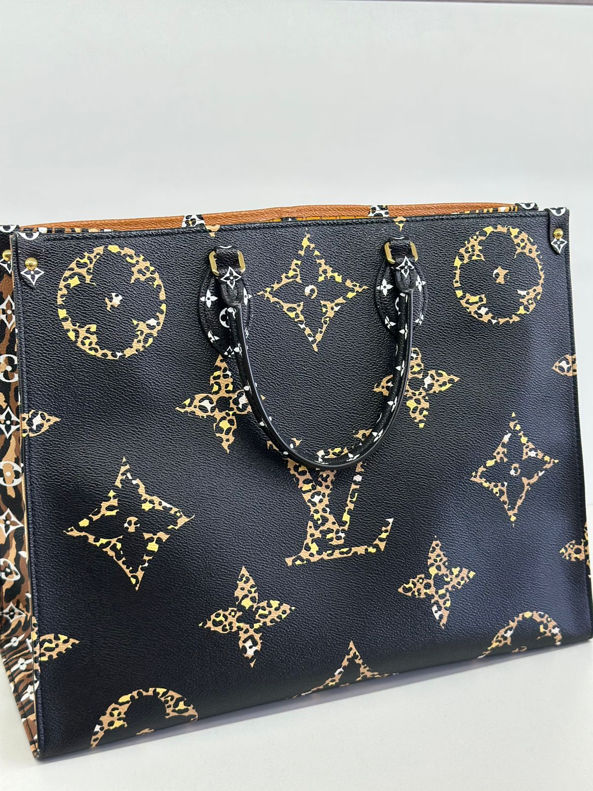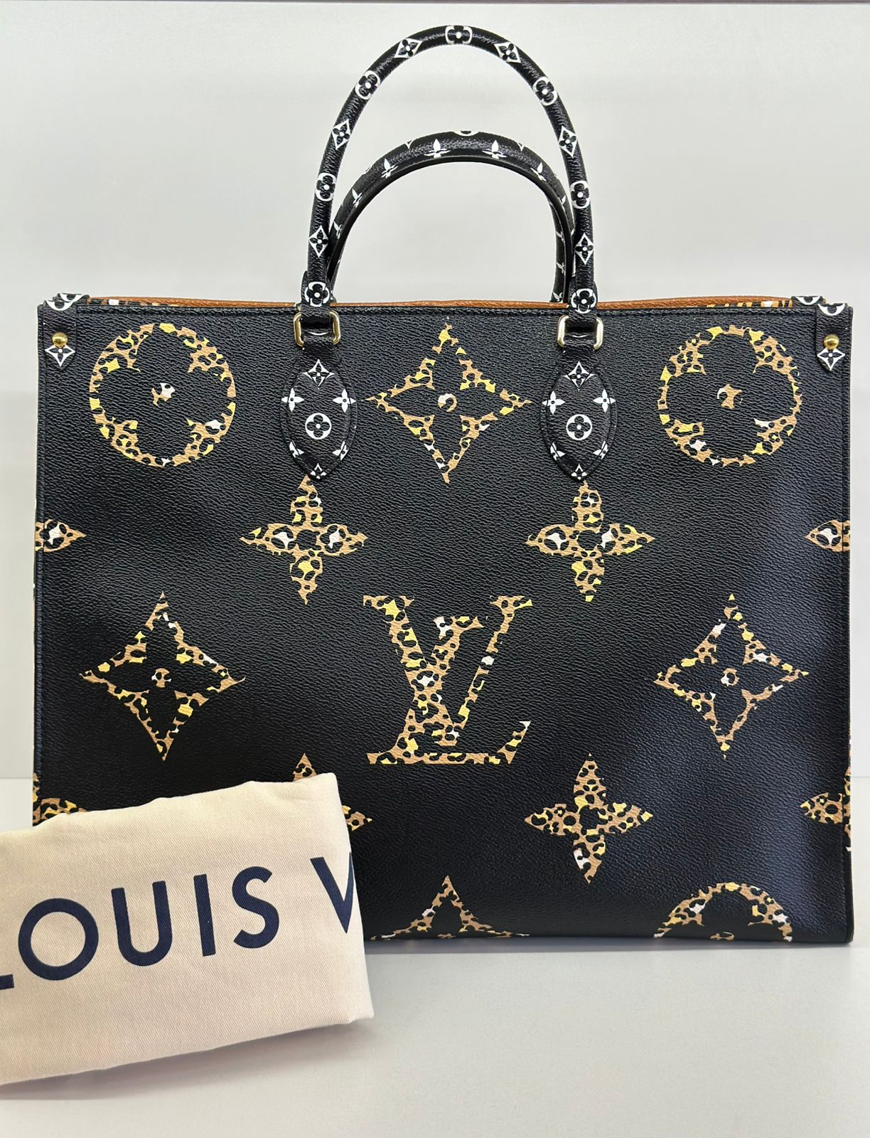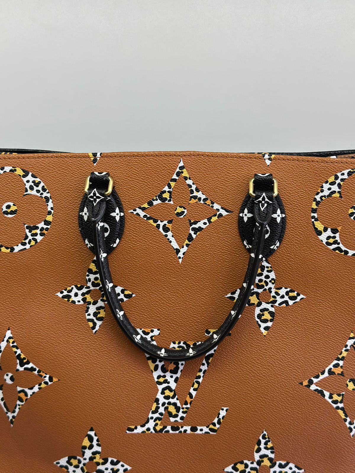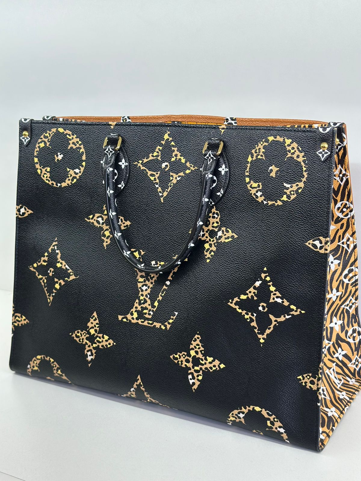 Bolsa Louis Vuitton Onthego, confeccionada em canvas monogram Giant Jungle nas cores preto e caramelo, com ferragens douradas, detalhes em couro, alça dupla, modelo tote, acabamento em couro, fecho principal por gancho, compartimento interno único com um bolso com fechamento em zíper e um bolso plano, forro interno amarelo com listras. Essa é uma Louis Vuitton de muito estilo, trazendo duas cores preto e caramelo e seu monogram estampado de animal print, saindo fora do seu monogram liso tradicional, trazendo mais charme, estilo e versatilidade, uma peça prática para o seu dia a dia.