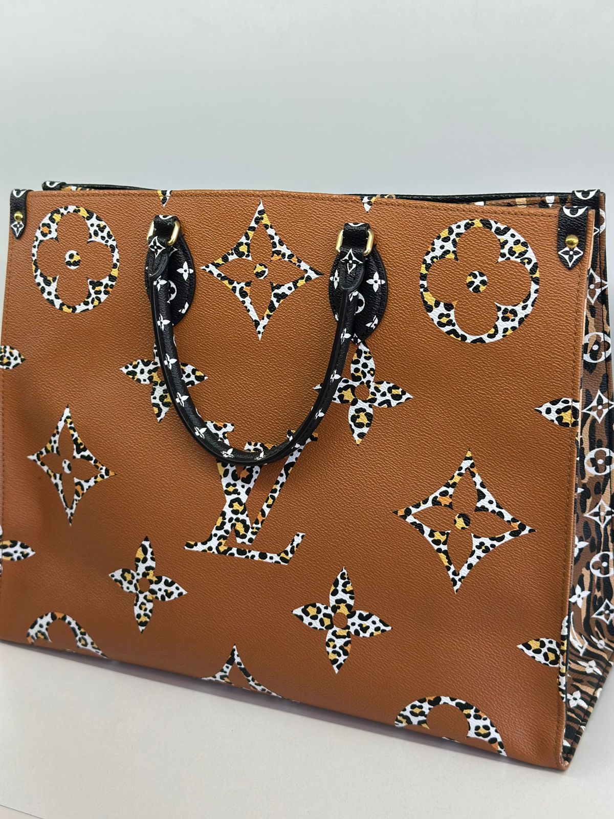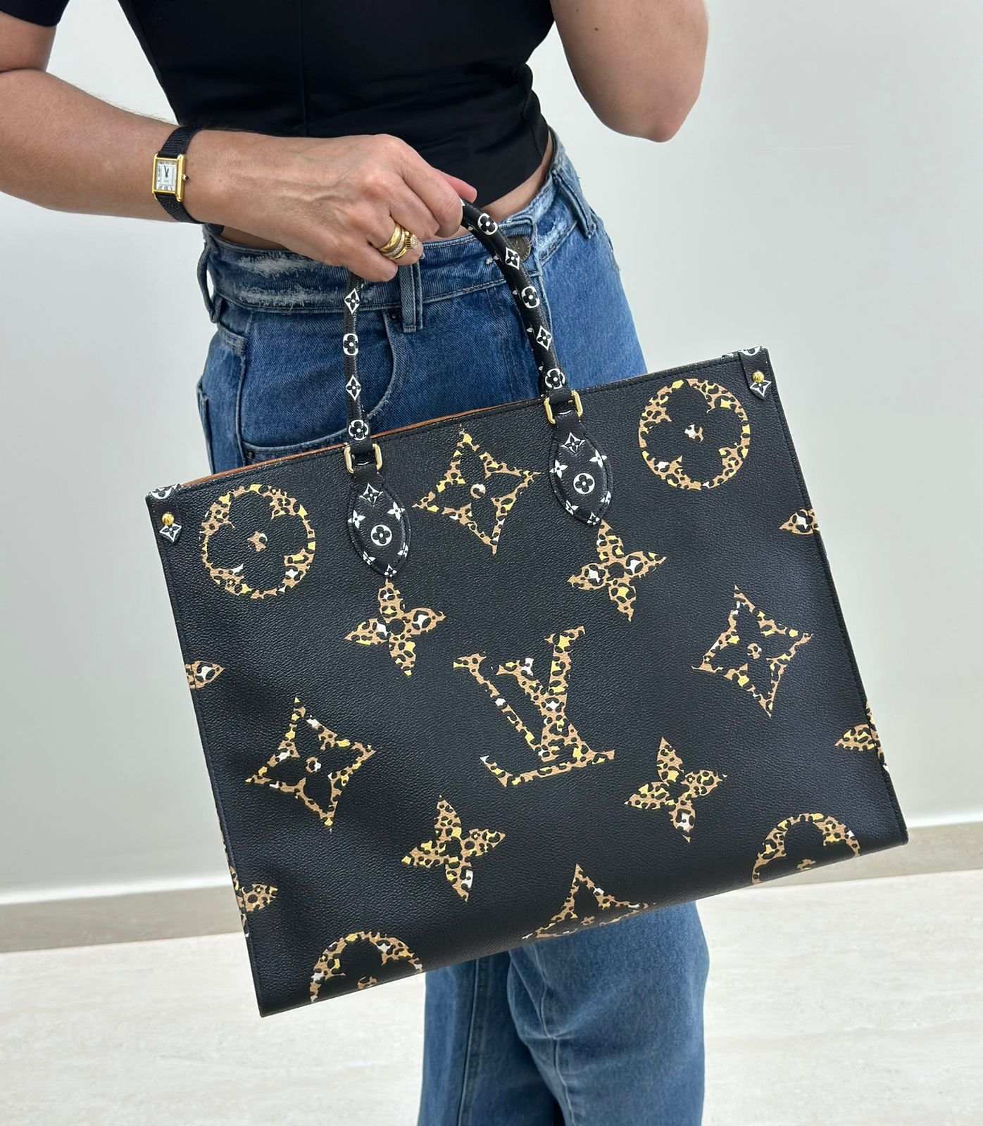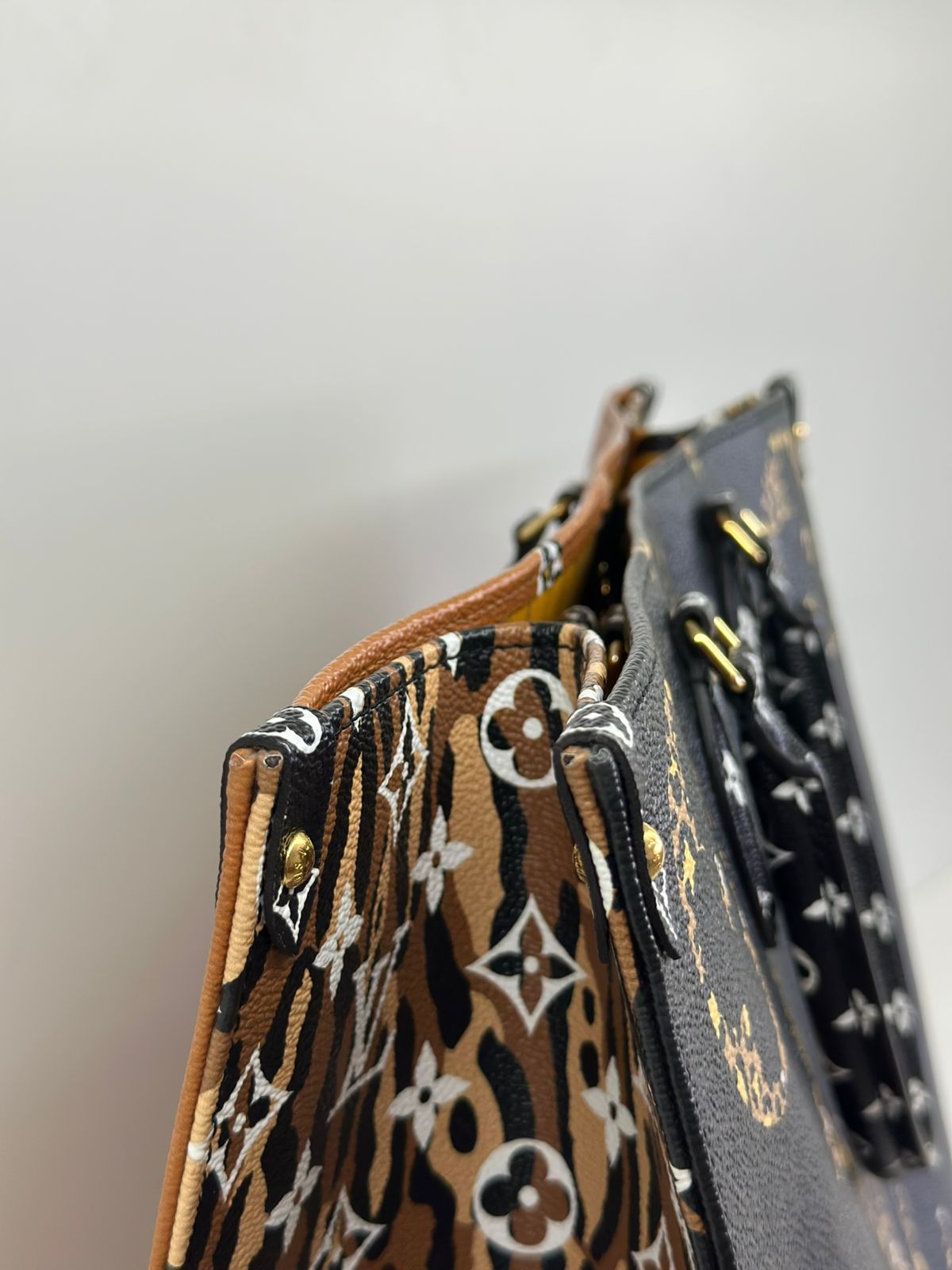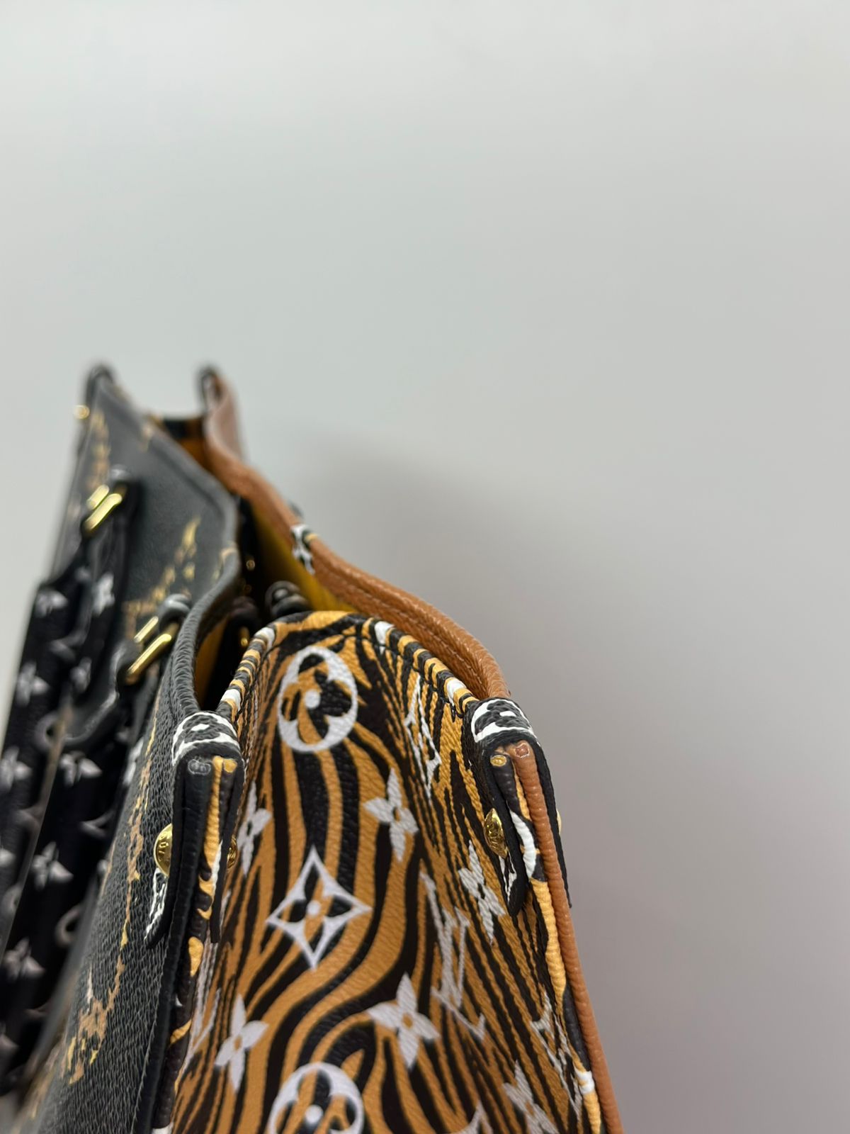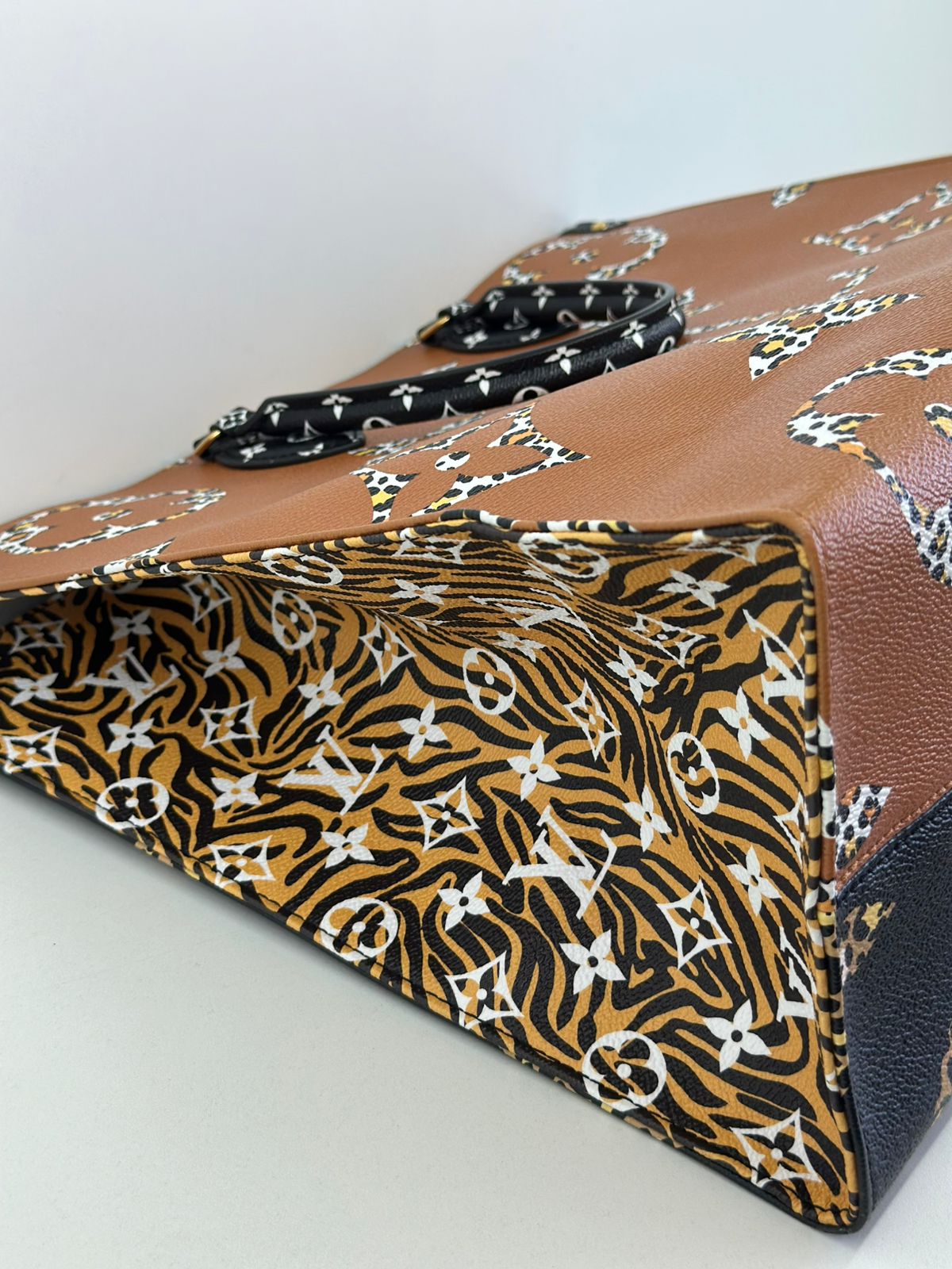 Bolsa Louis Vuitton Onthego, confeccionada em canvas monogram Giant Jungle nas cores preto e caramelo, com ferragens douradas, detalhes em couro, alça dupla, modelo tote, acabamento em couro, fecho principal por gancho, compartimento interno único com um bolso com fechamento em zíper e um bolso plano, forro interno amarelo com listras. Essa é uma Louis Vuitton de muito estilo, trazendo duas cores preto e caramelo e seu monogram estampado de animal print, saindo fora do seu monogram liso tradicional, trazendo mais charme, estilo e versatilidade, uma peça prática para o seu dia a dia.