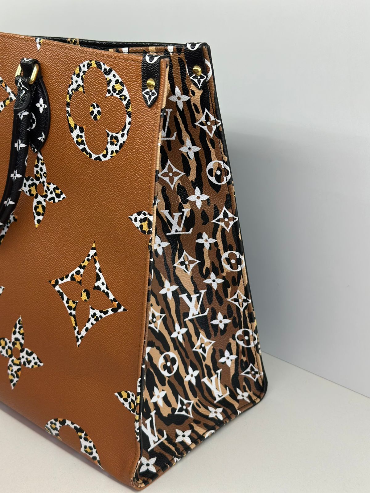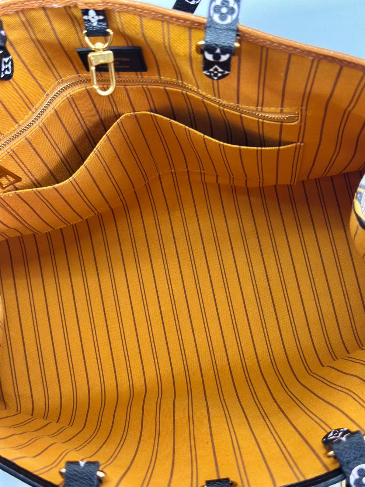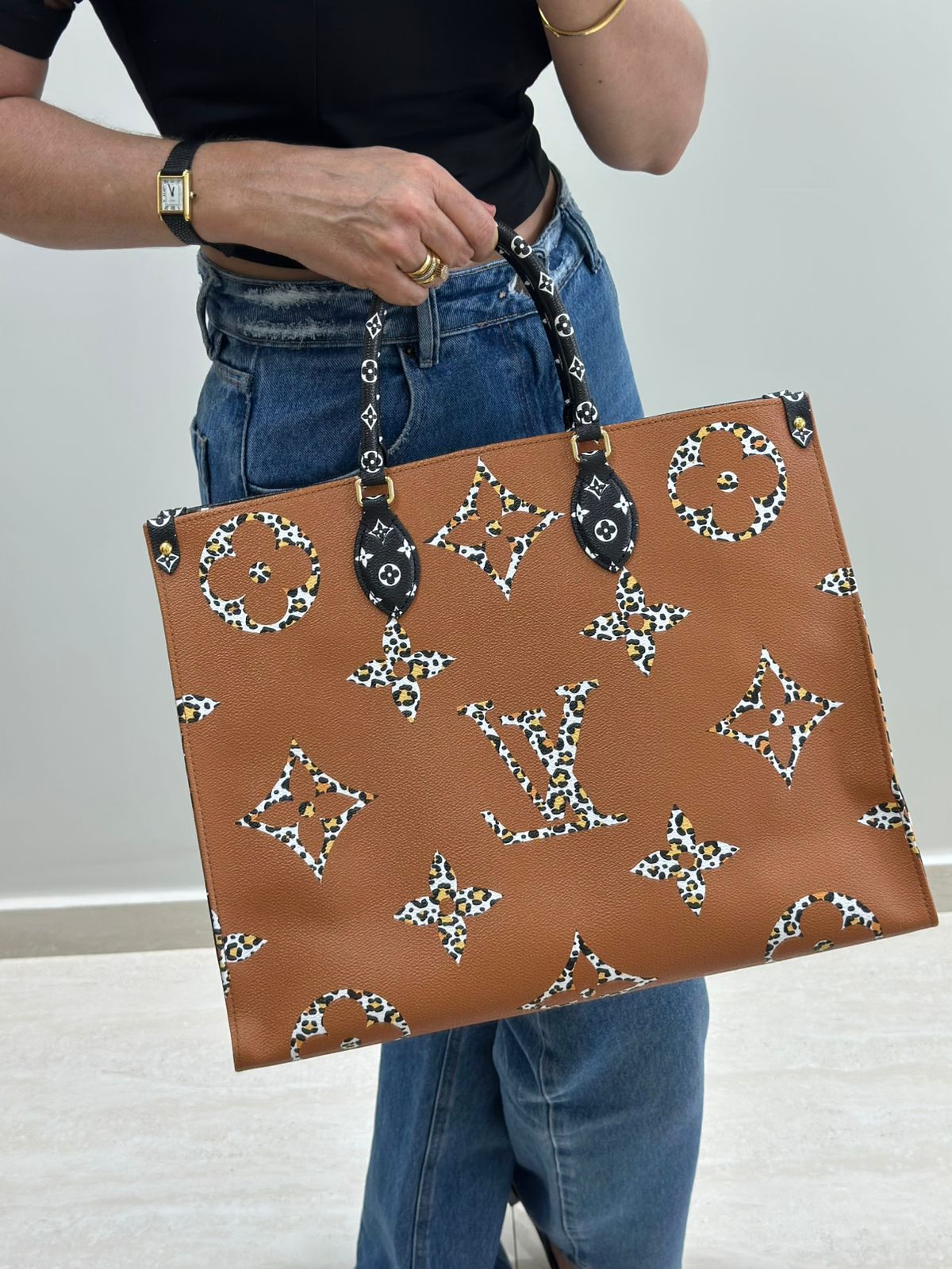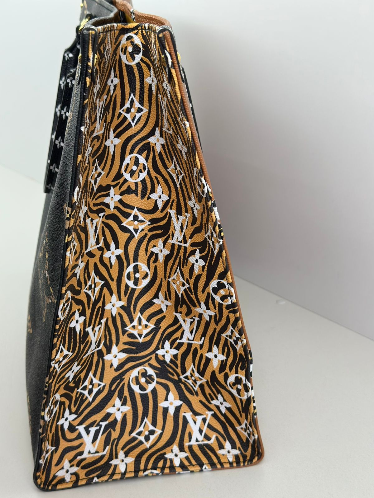 Bolsa Louis Vuitton Onthego, confeccionada em canvas monogram Giant Jungle nas cores preto e caramelo, com ferragens douradas, detalhes em couro, alça dupla, modelo tote, acabamento em couro, fecho principal por gancho, compartimento interno único com um bolso com fechamento em zíper e um bolso plano, forro interno amarelo com listras. Essa é uma Louis Vuitton de muito estilo, trazendo duas cores preto e caramelo e seu monogram estampado de animal print, saindo fora do seu monogram liso tradicional, trazendo mais charme, estilo e versatilidade, uma peça prática para o seu dia a dia.
