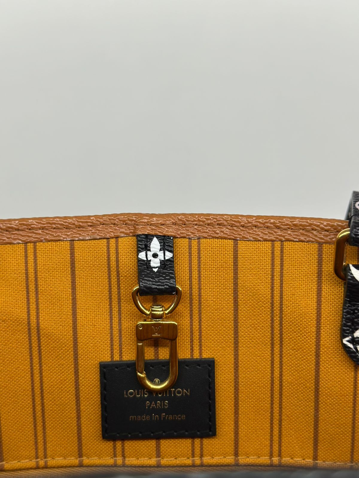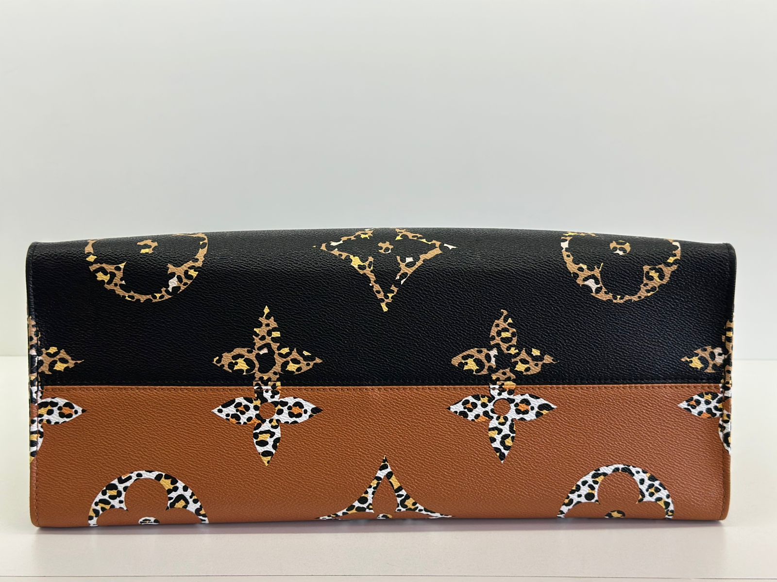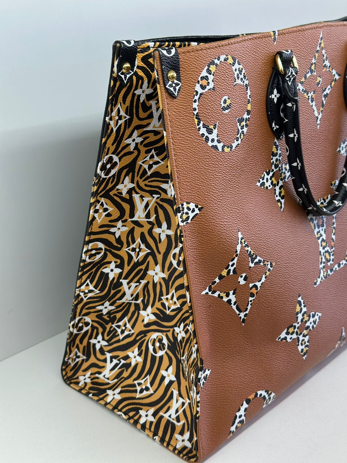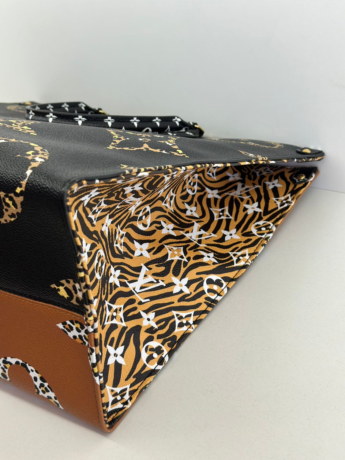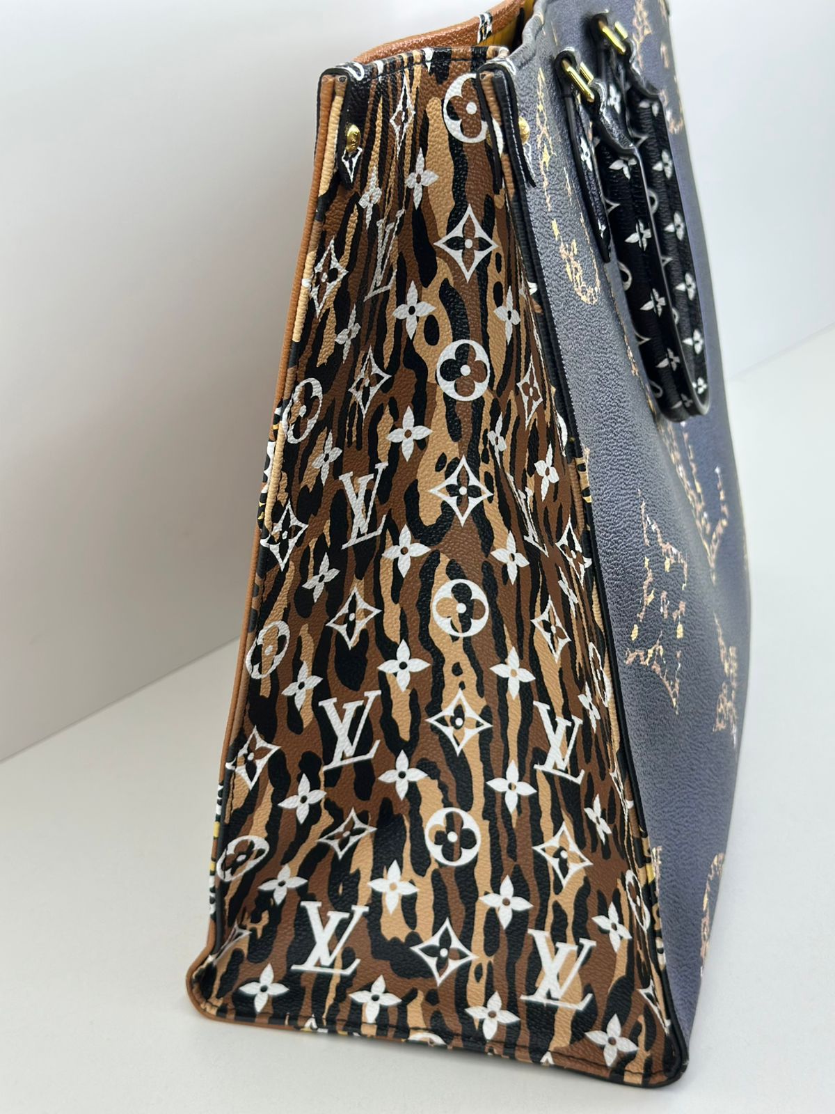 Bolsa Louis Vuitton Onthego, confeccionada em canvas monogram Giant Jungle nas cores preto e caramelo, com ferragens douradas, detalhes em couro, alça dupla, modelo tote, acabamento em couro, fecho principal por gancho, compartimento interno único com um bolso com fechamento em zíper e um bolso plano, forro interno amarelo com listras. Essa é uma Louis Vuitton de muito estilo, trazendo duas cores preto e caramelo e seu monogram estampado de animal print, saindo fora do seu monogram liso tradicional, trazendo mais charme, estilo e versatilidade, uma peça prática para o seu dia a dia.