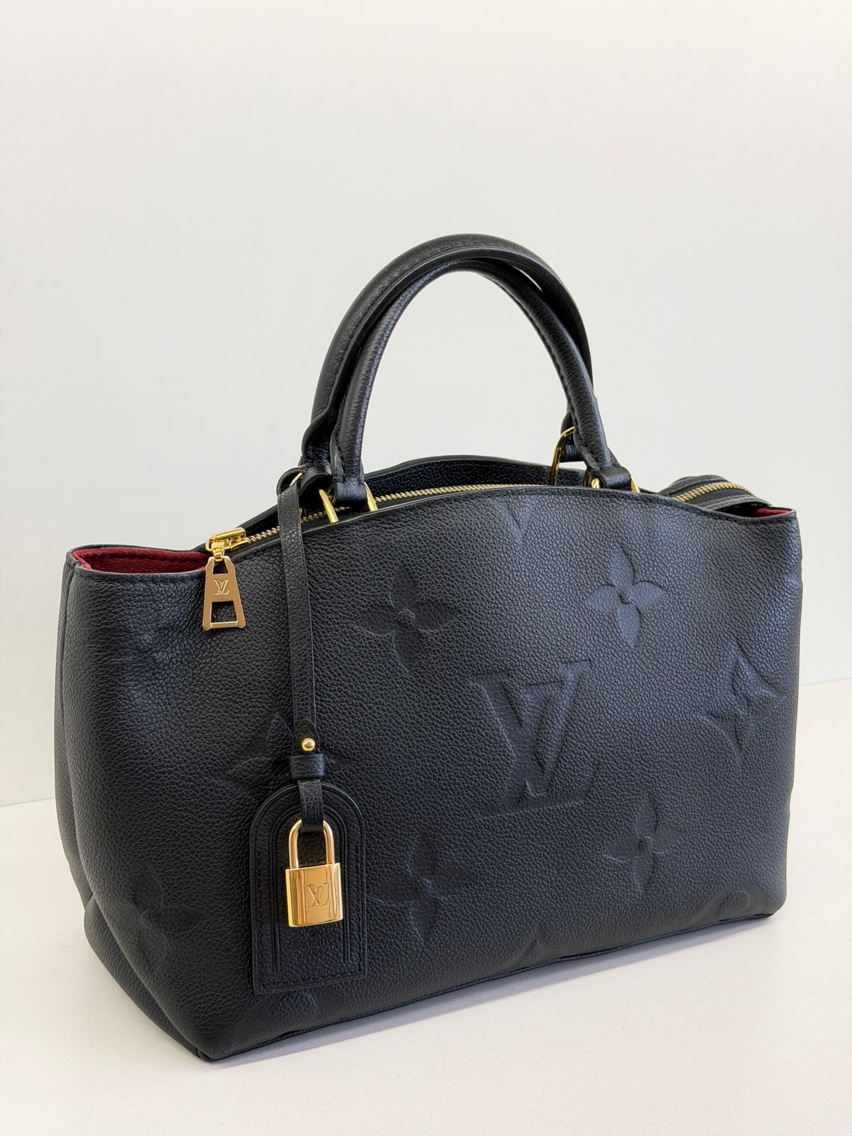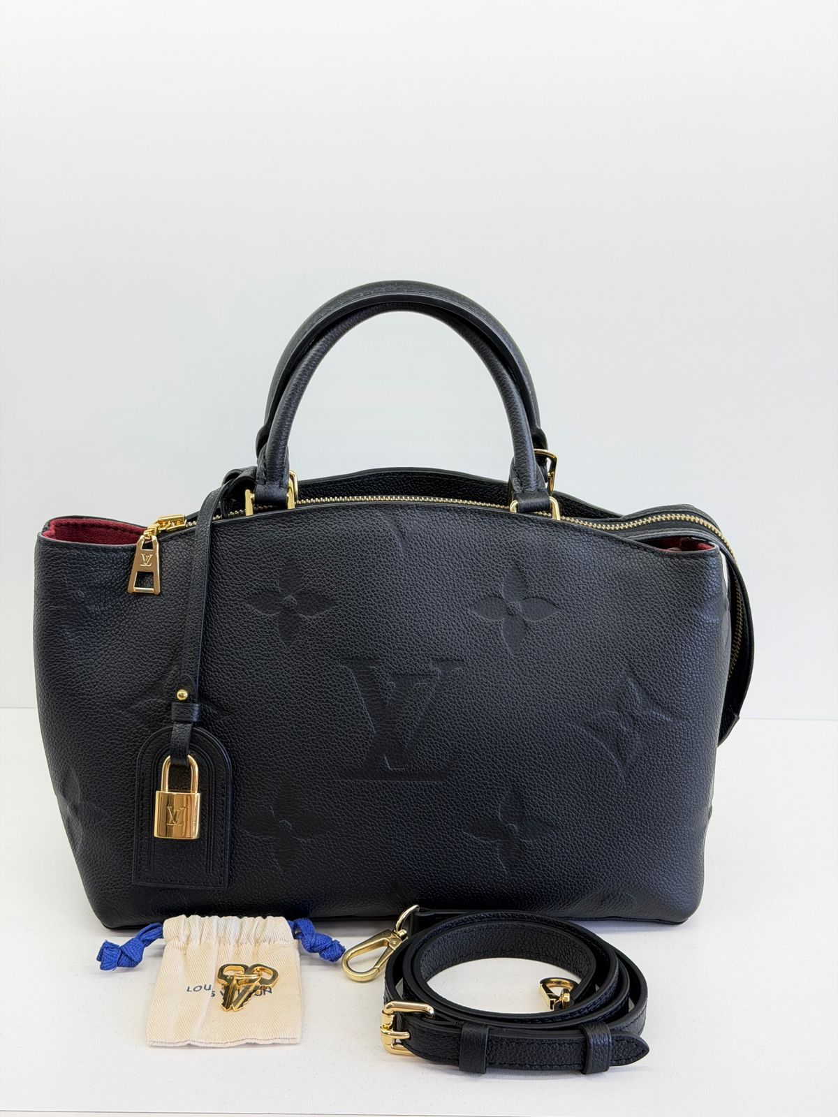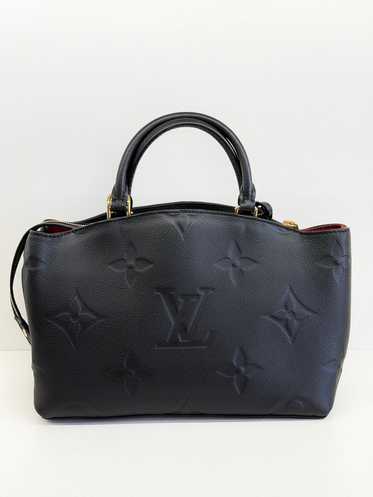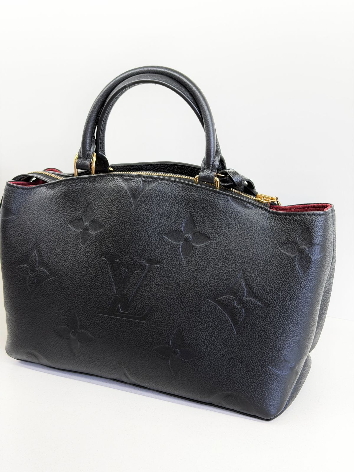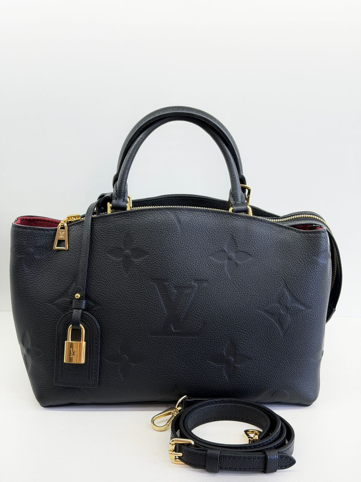 Bolsa Louis Vuitton Petit Empreint PM, confeccionada em canvas Monogram na cor preta, forro em tecido na cor marsala, ferragens no dourado, no seu interior o compartimento único, possui dois bolsos planos, alça dupla de mão e uma alça longa ajustável e removível. Um modelo sofisticado, estruturada com formato com leves ondulações na partes superior, atemporal e indispensável para compor produções elegantes com personalidade.