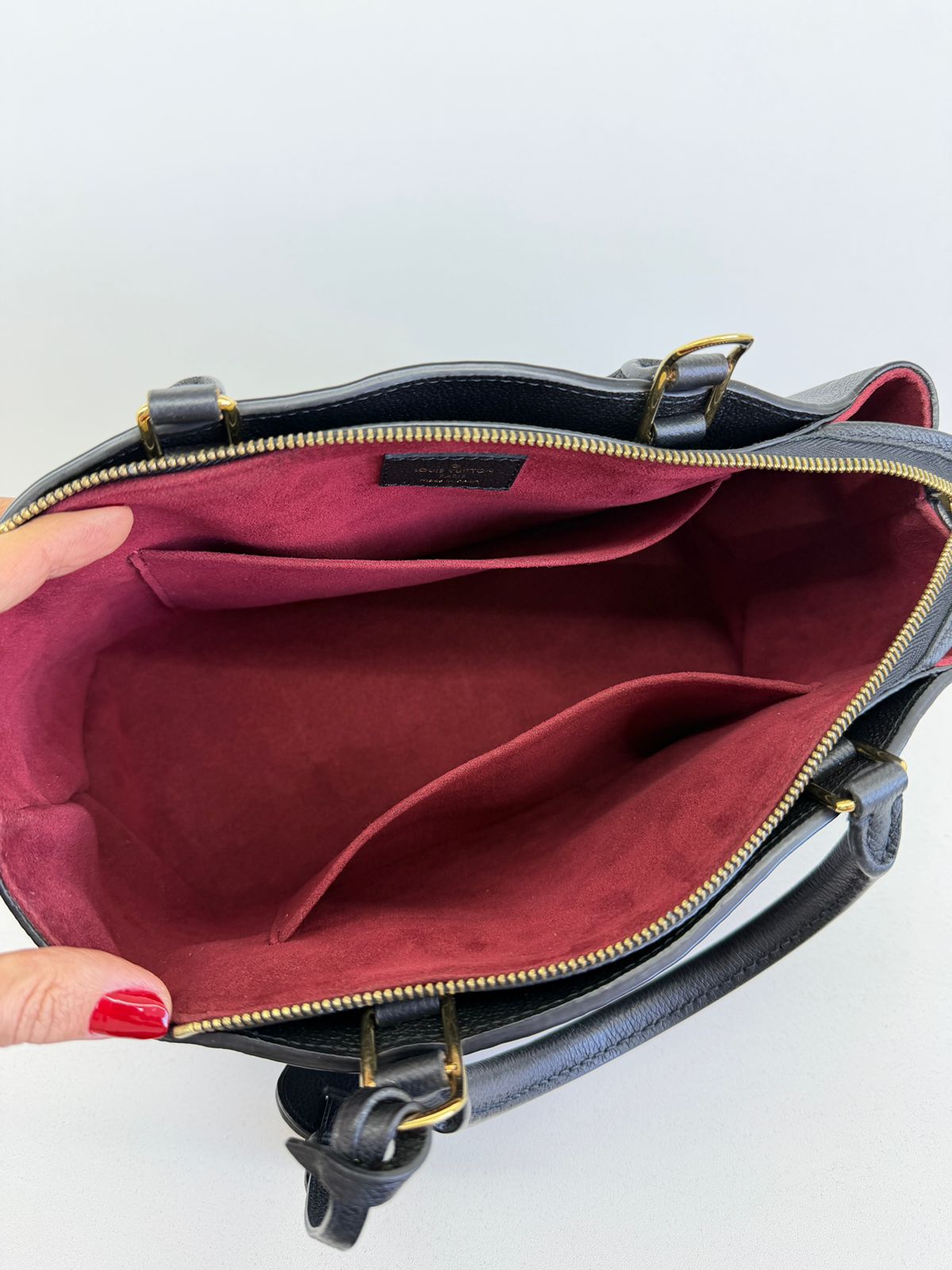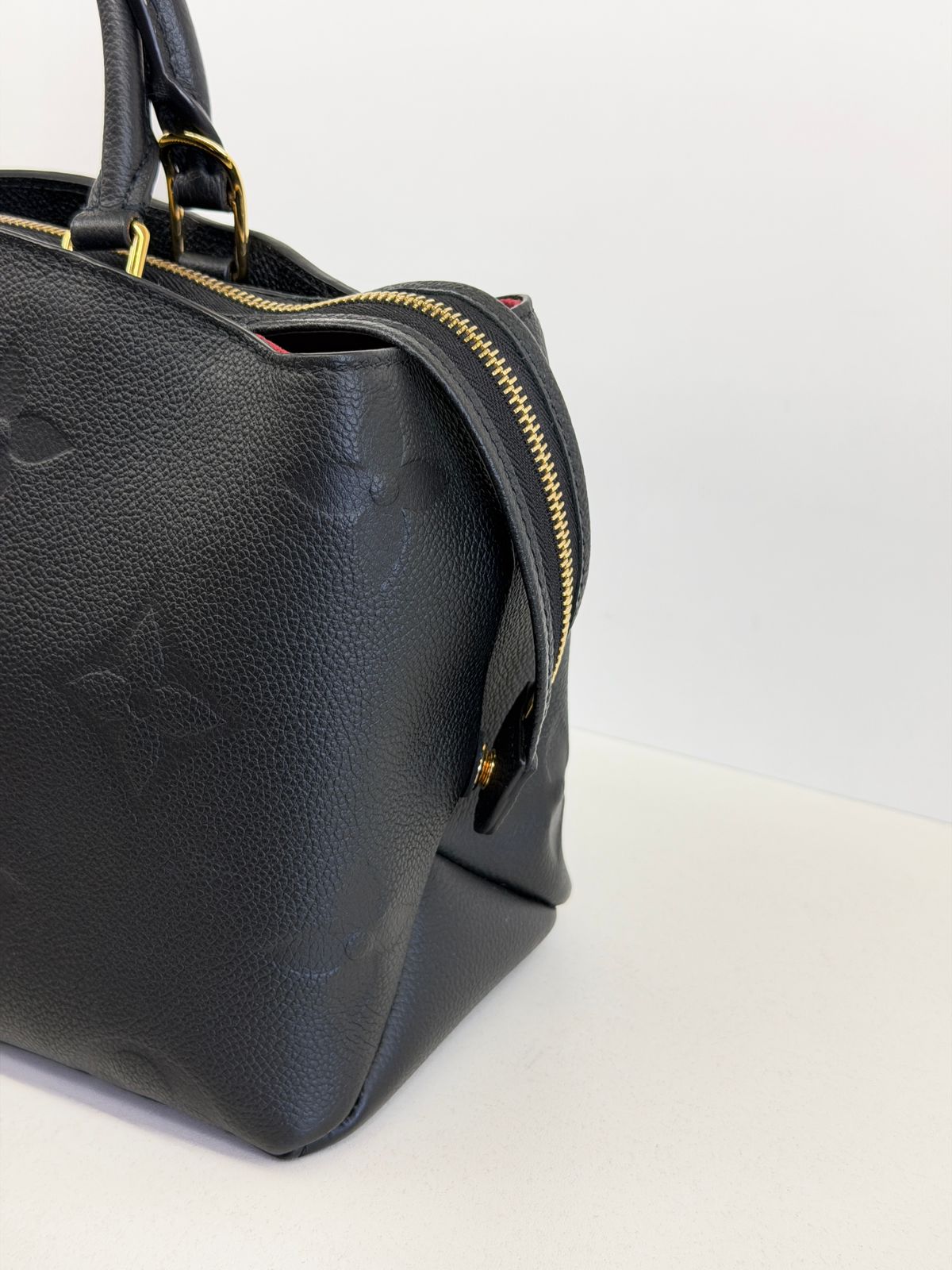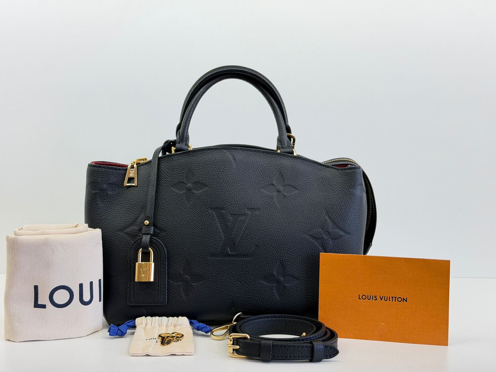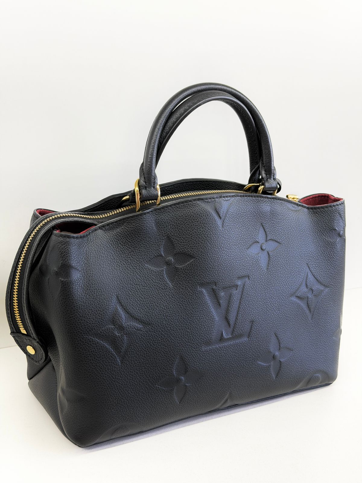 Bolsa Louis Vuitton Petit Empreint PM, confeccionada em canvas Monogram na cor preta, forro em tecido na cor marsala, ferragens no dourado, no seu interior o compartimento único, possui dois bolsos planos, alça dupla de mão e uma alça longa ajustável e removível. Um modelo sofisticado, estruturada com formato com leves ondulações na partes superior, atemporal e indispensável para compor produções elegantes com personalidade.