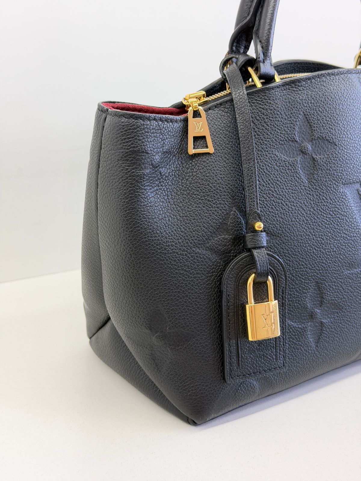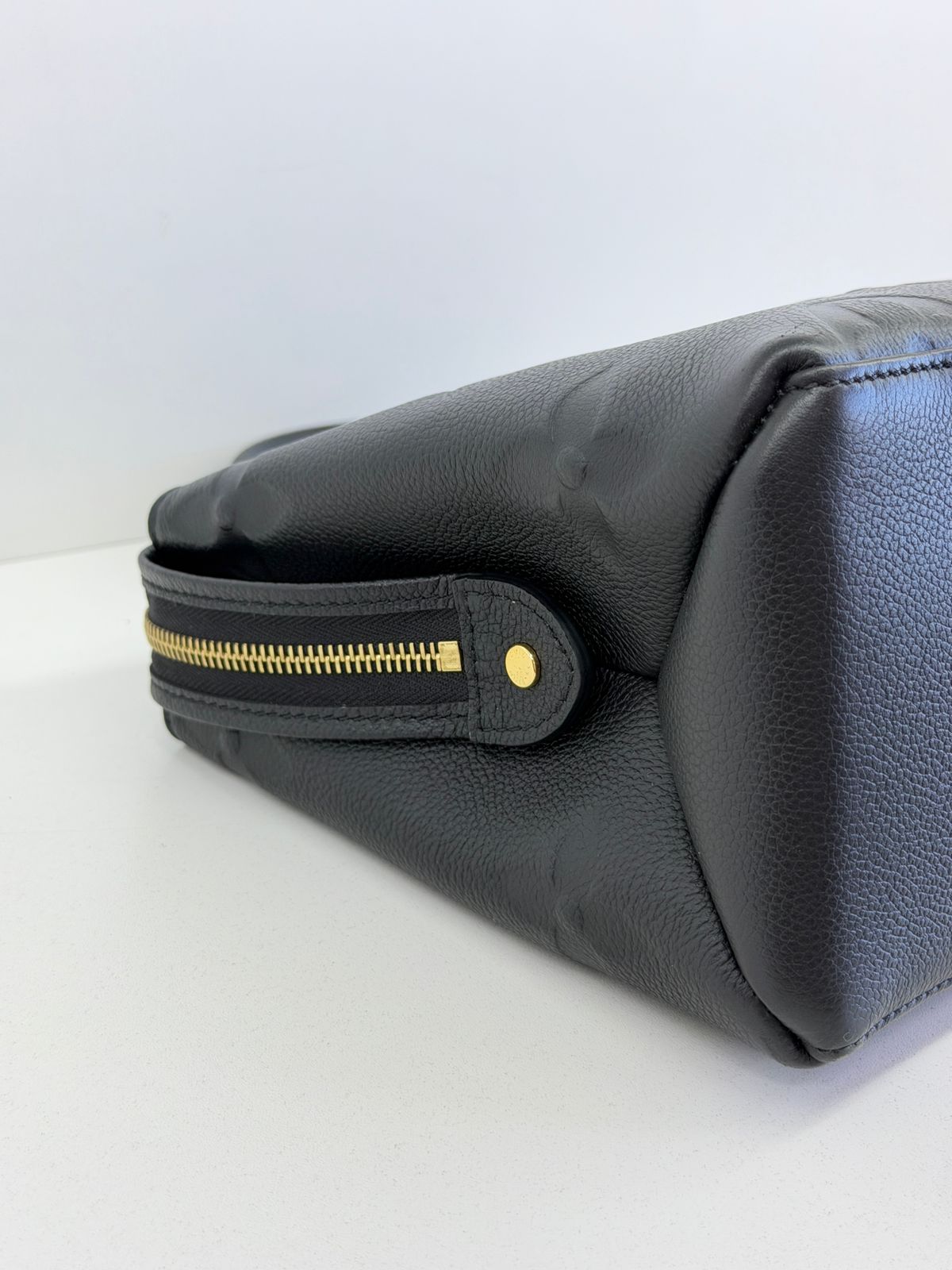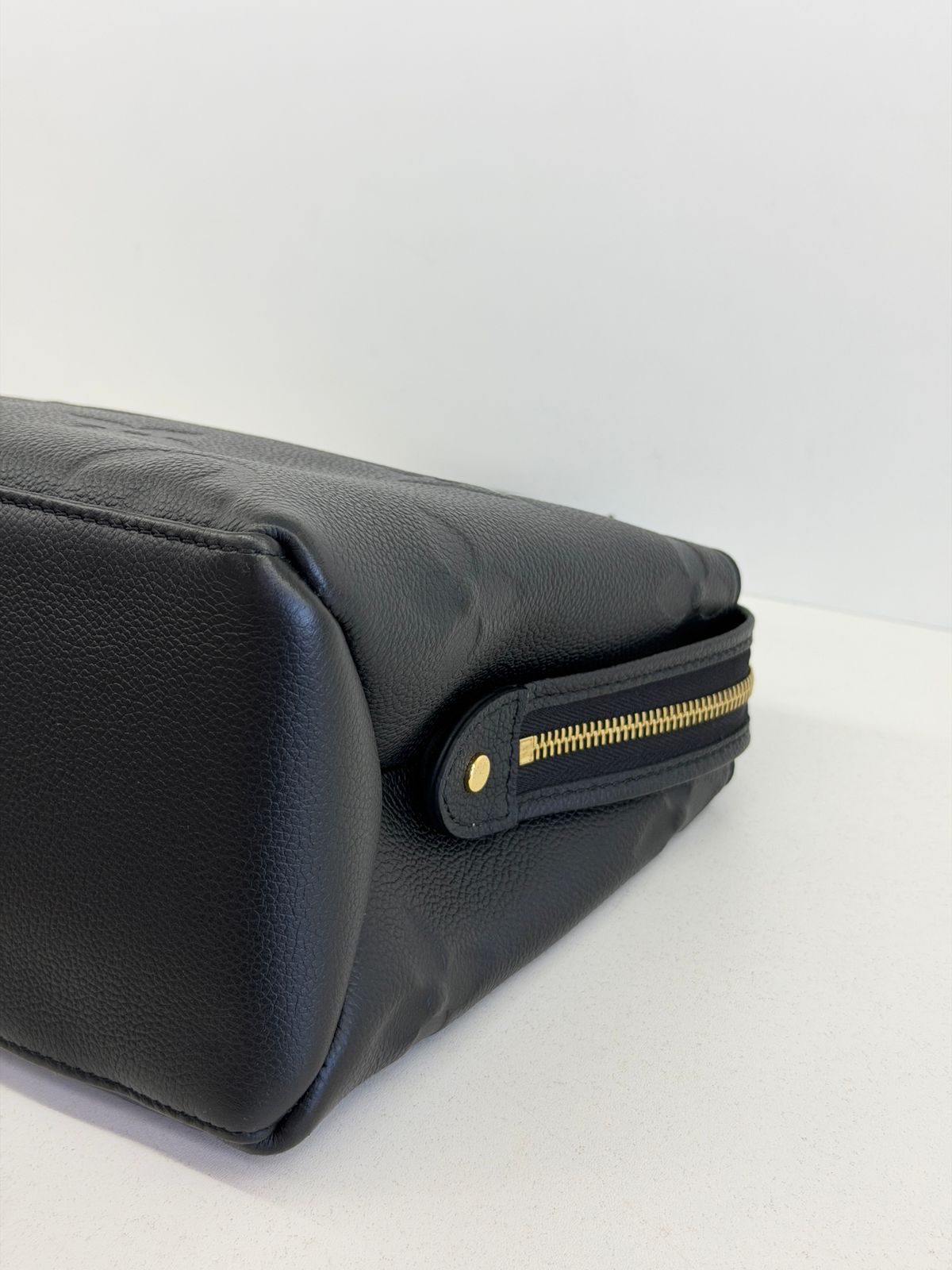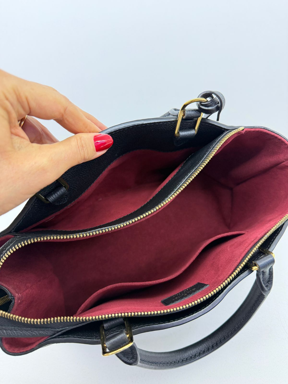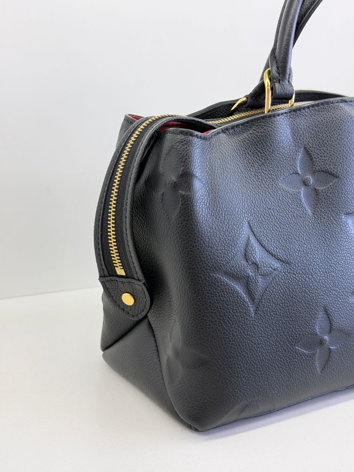 Bolsa Louis Vuitton Petit Empreint PM, confeccionada em canvas Monogram na cor preta, forro em tecido na cor marsala, ferragens no dourado, no seu interior o compartimento único, possui dois bolsos planos, alça dupla de mão e uma alça longa ajustável e removível. Um modelo sofisticado, estruturada com formato com leves ondulações na partes superior, atemporal e indispensável para compor produções elegantes com personalidade.