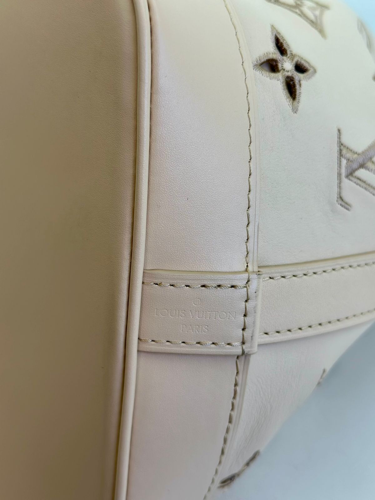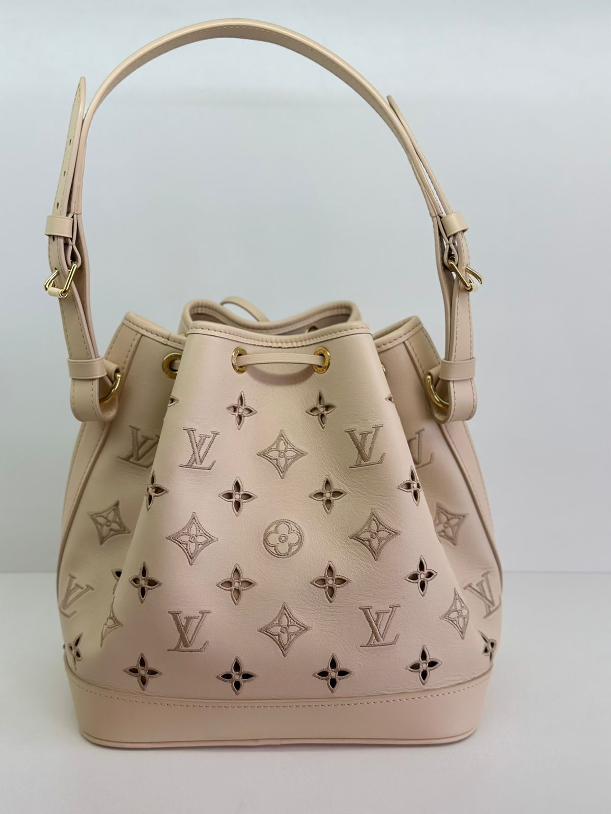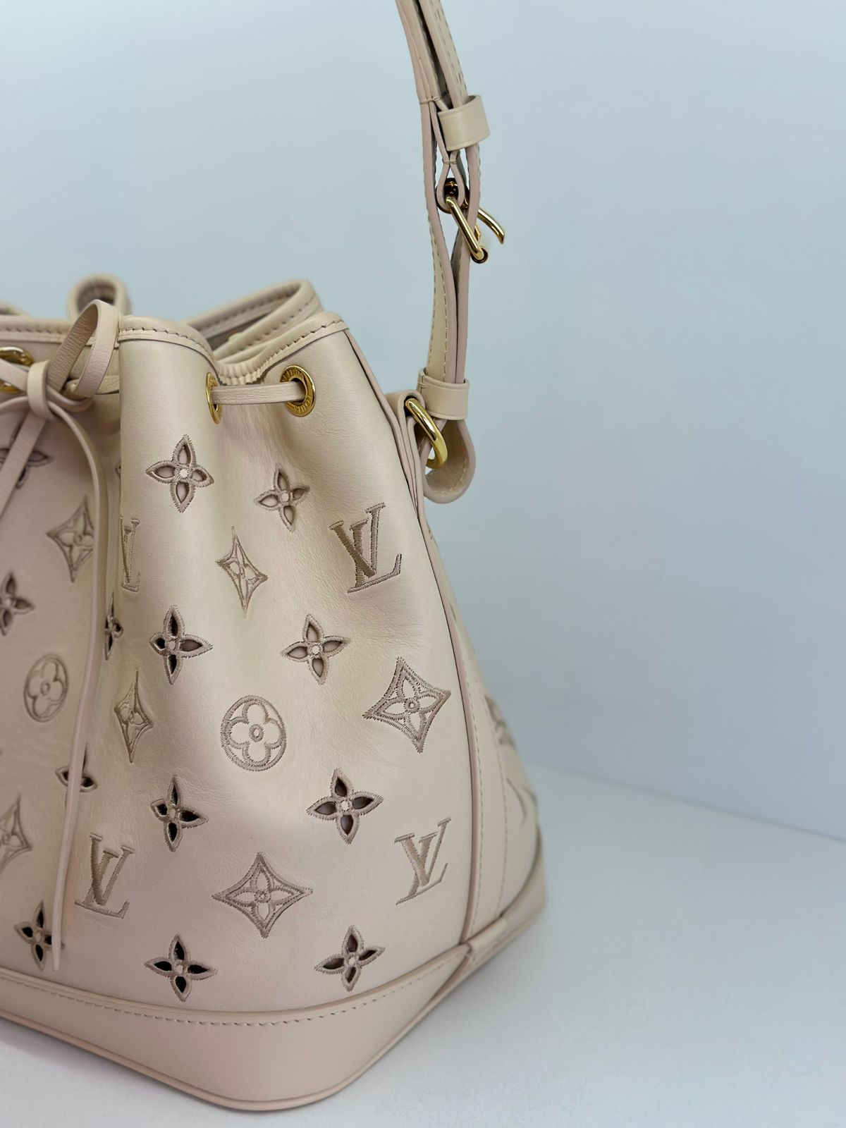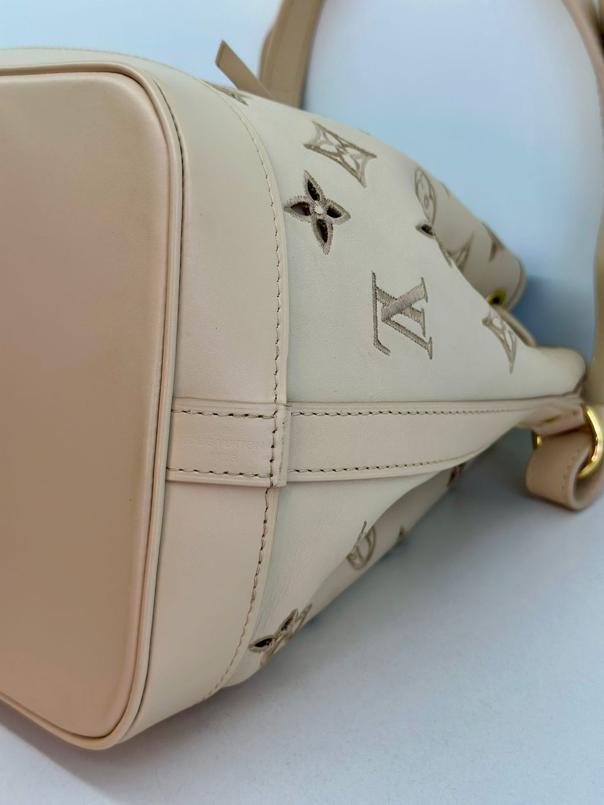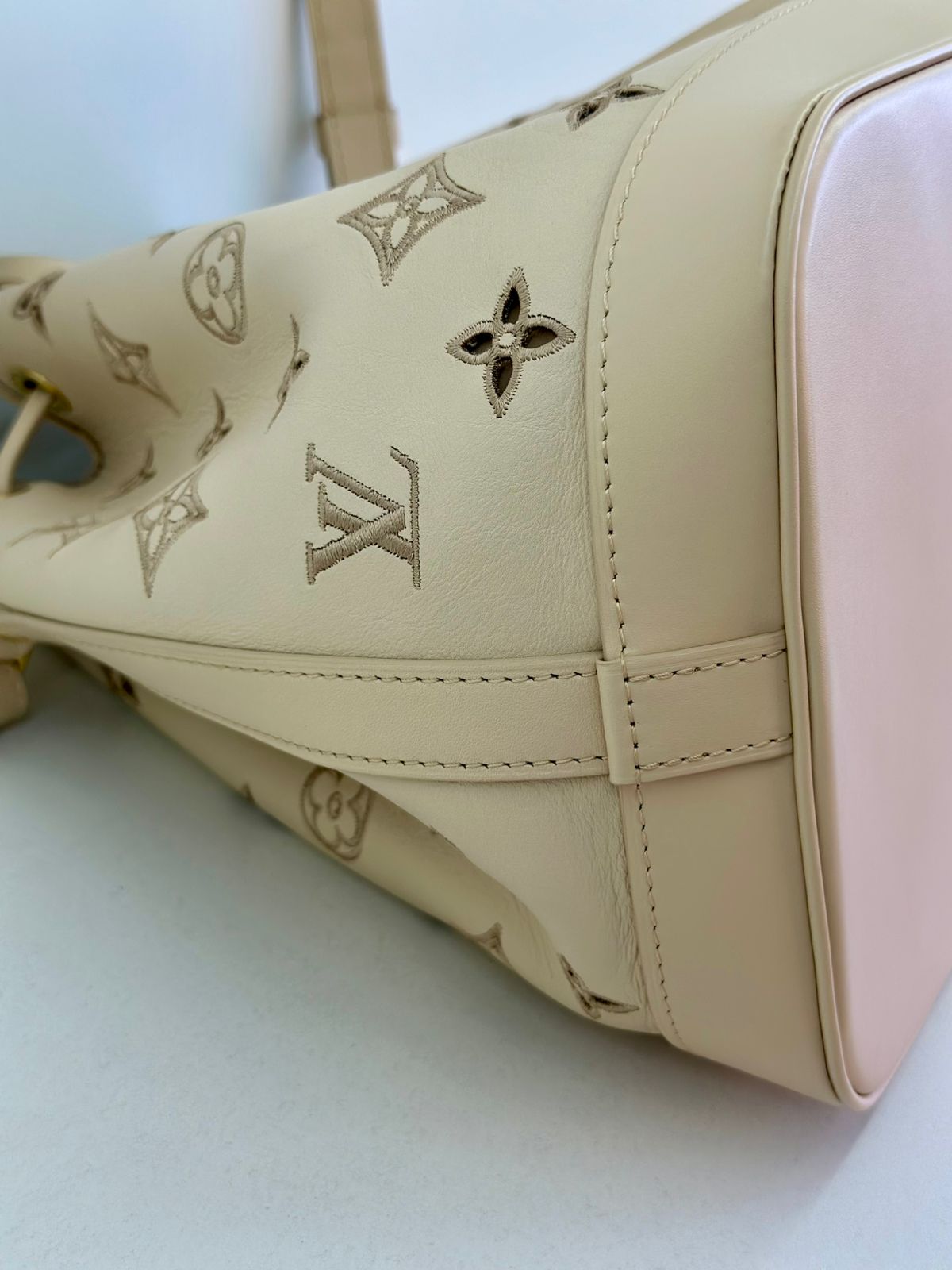 Bolsa Louis Vuitton Petit Noé, confeccionada em couro off White, no canvas monogram , com ferragens no dourado, fecho por amarração, alça única de ombro ajustável, forro em tecido, compartimento interno único.