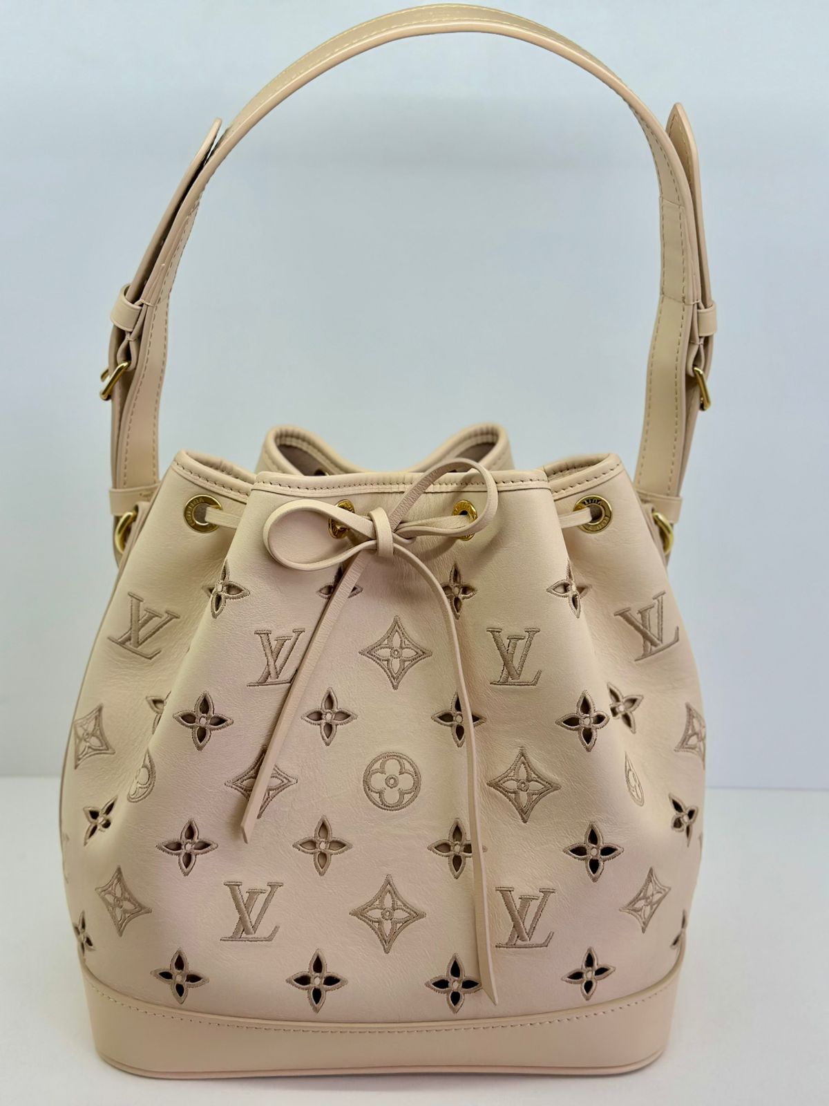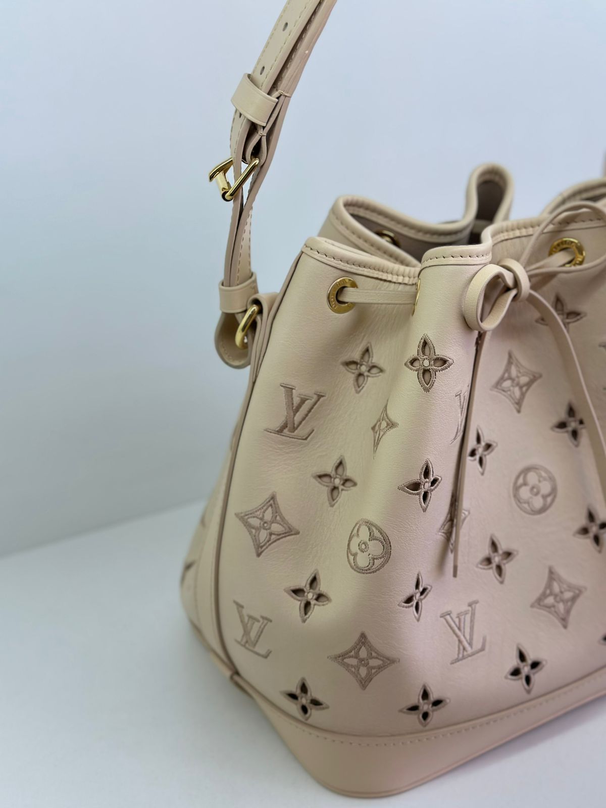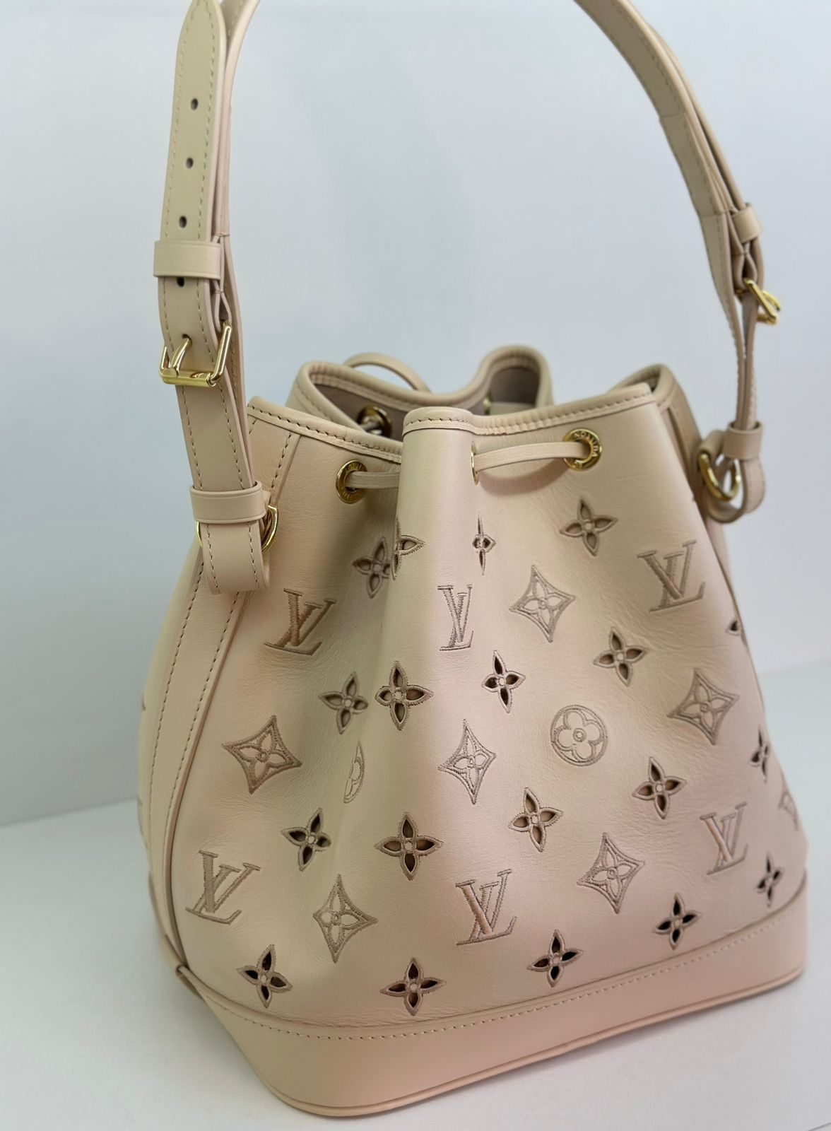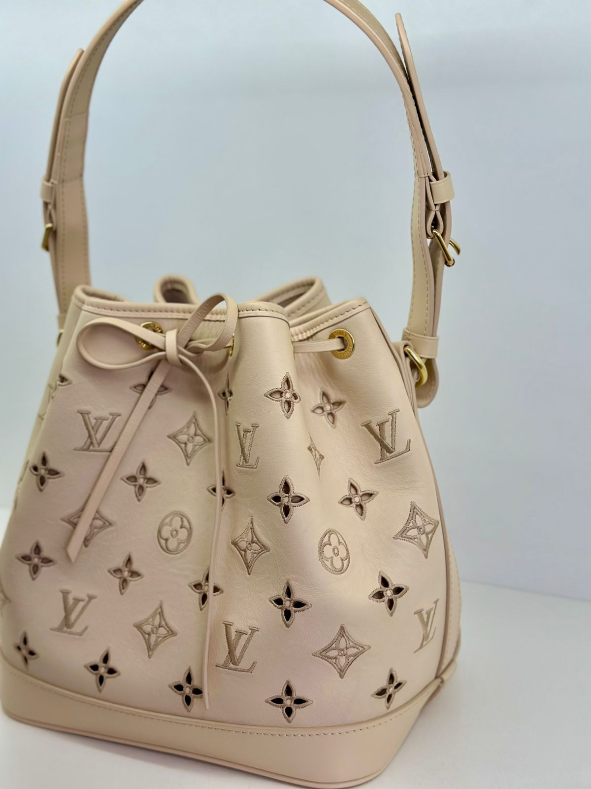 Bolsa Louis Vuitton Petit Noé, confeccionada em couro off White, no canvas monogram , com ferragens no dourado, fecho por amarração, alça única de ombro ajustável, forro em tecido, compartimento interno único.