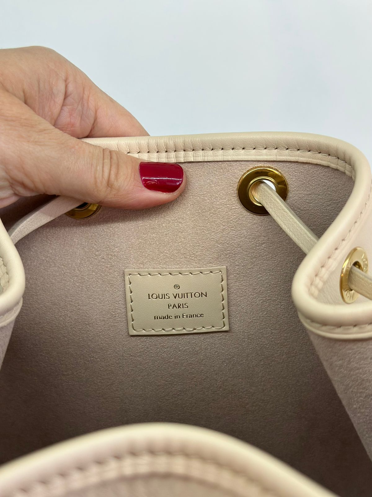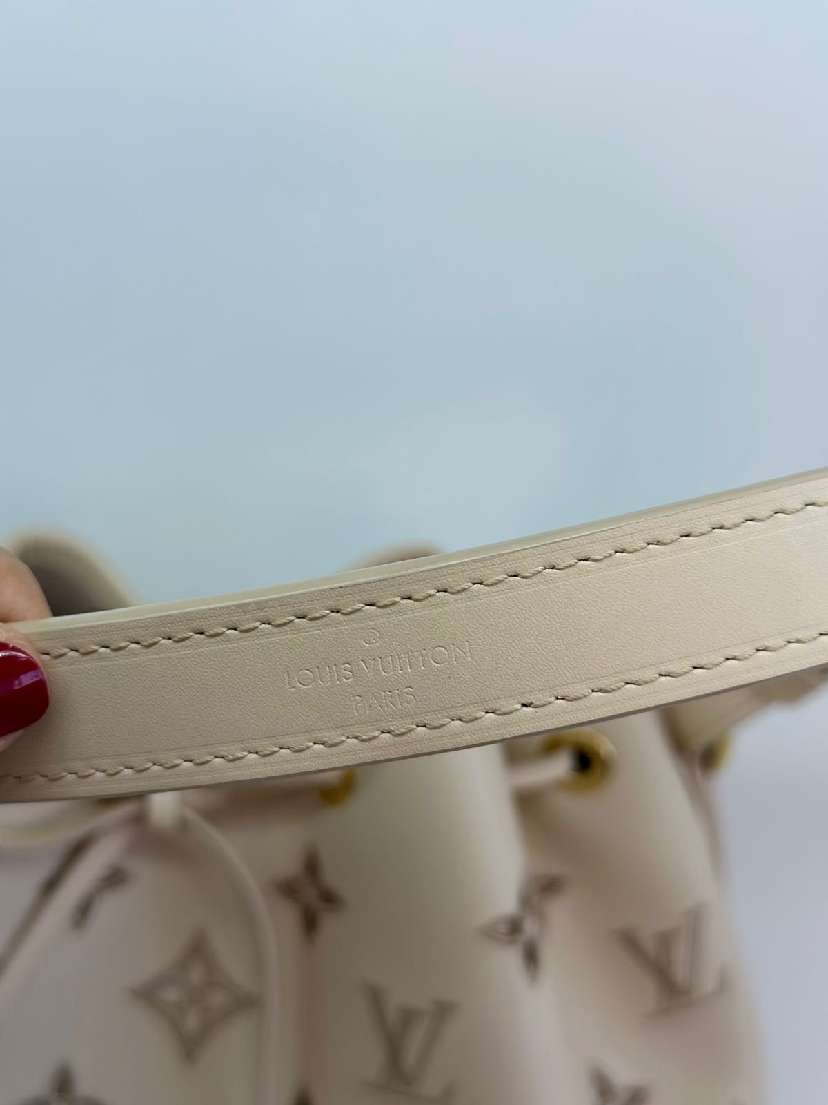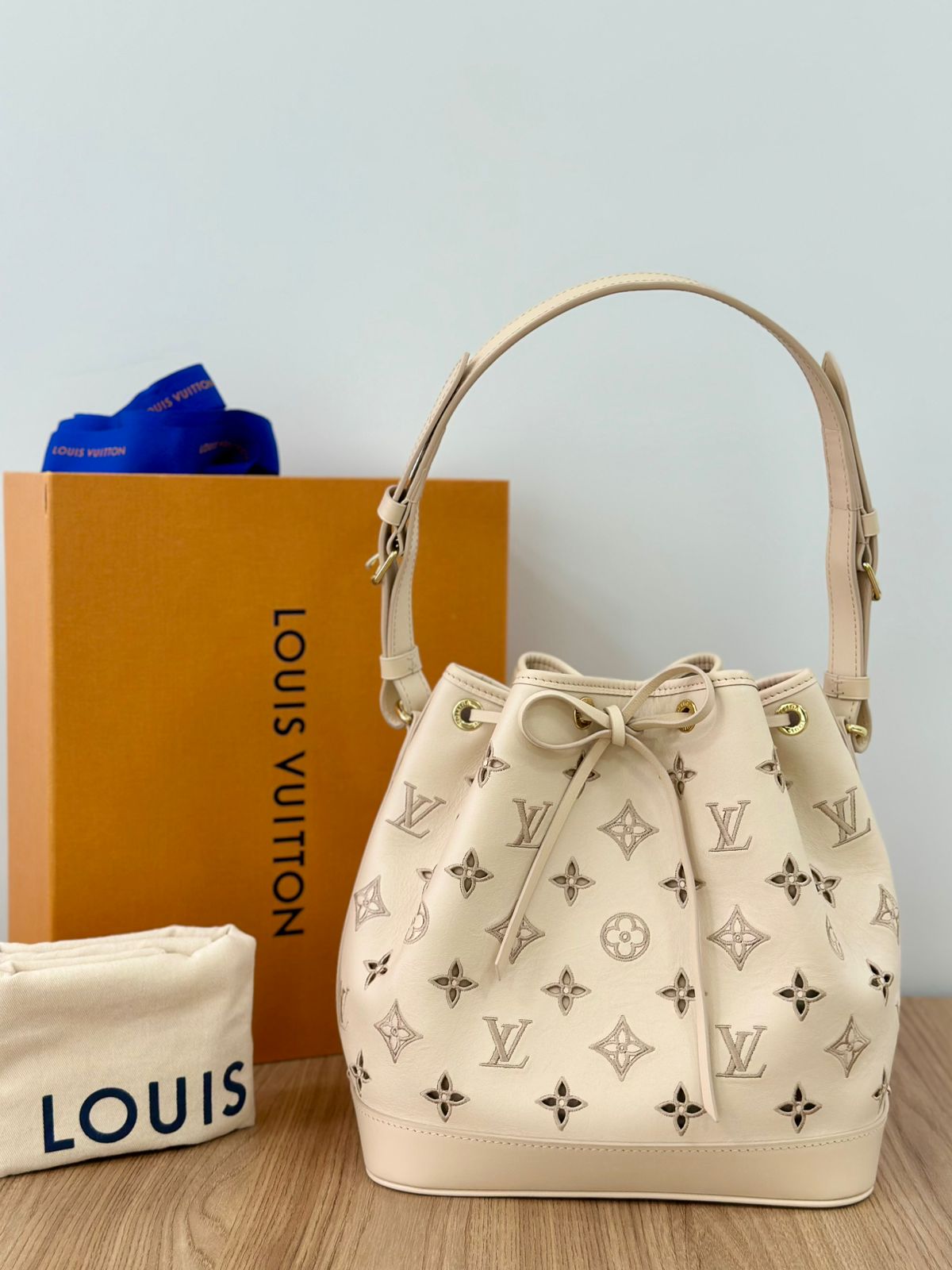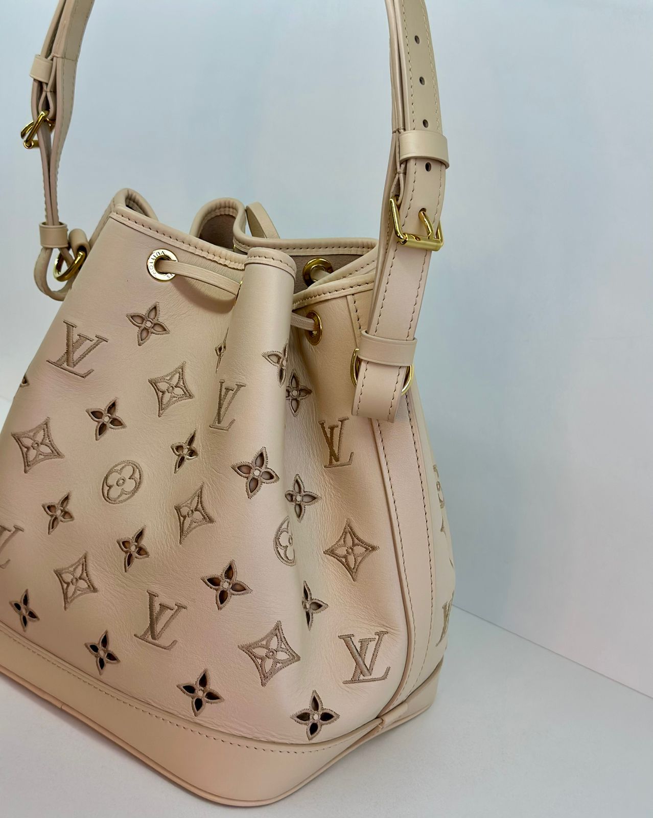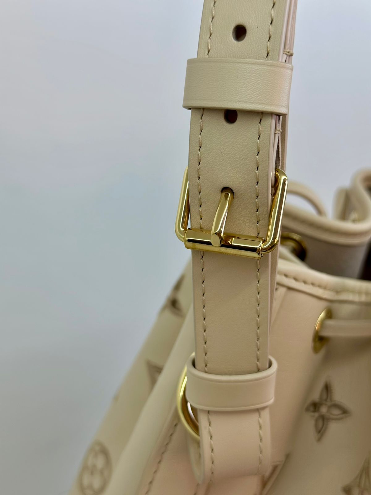 Bolsa Louis Vuitton Petit Noé, confeccionada em couro off White, no canvas monogram , com ferragens no dourado, fecho por amarração, alça única de ombro ajustável, forro em tecido, compartimento interno único.