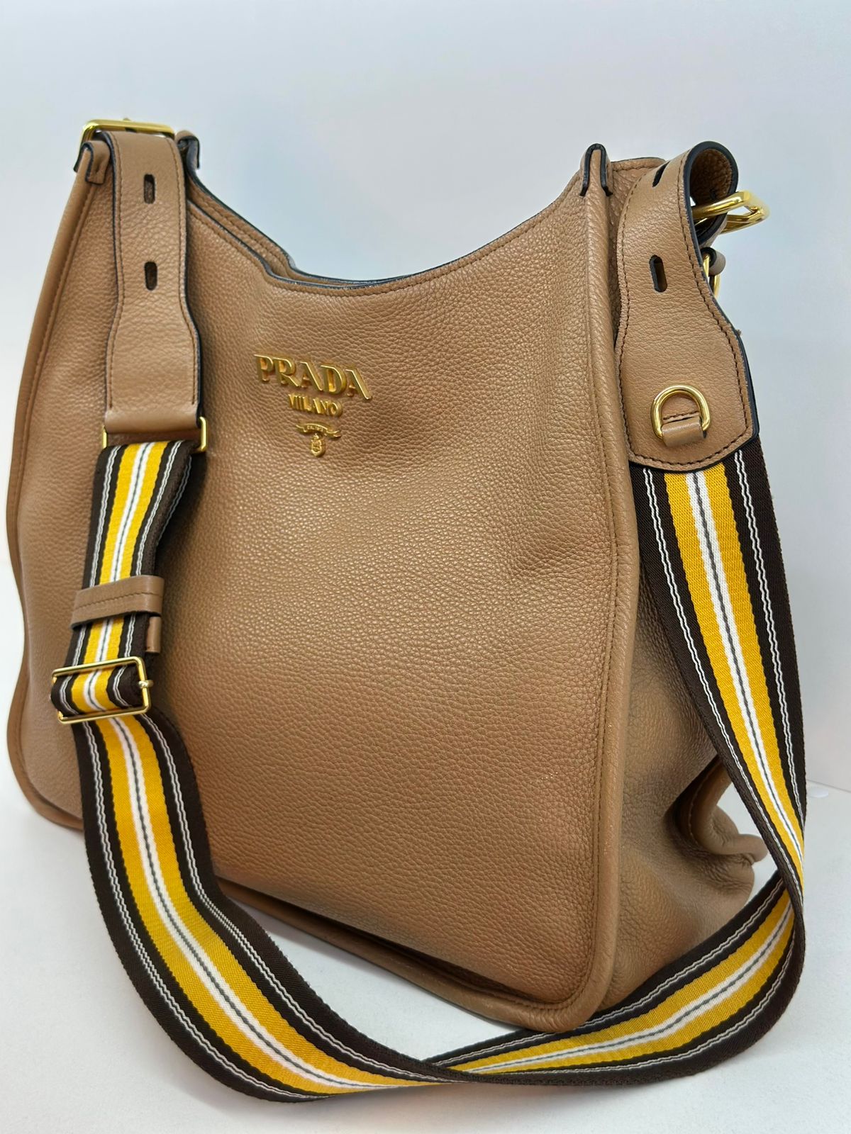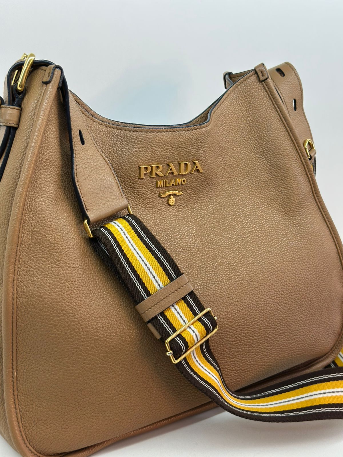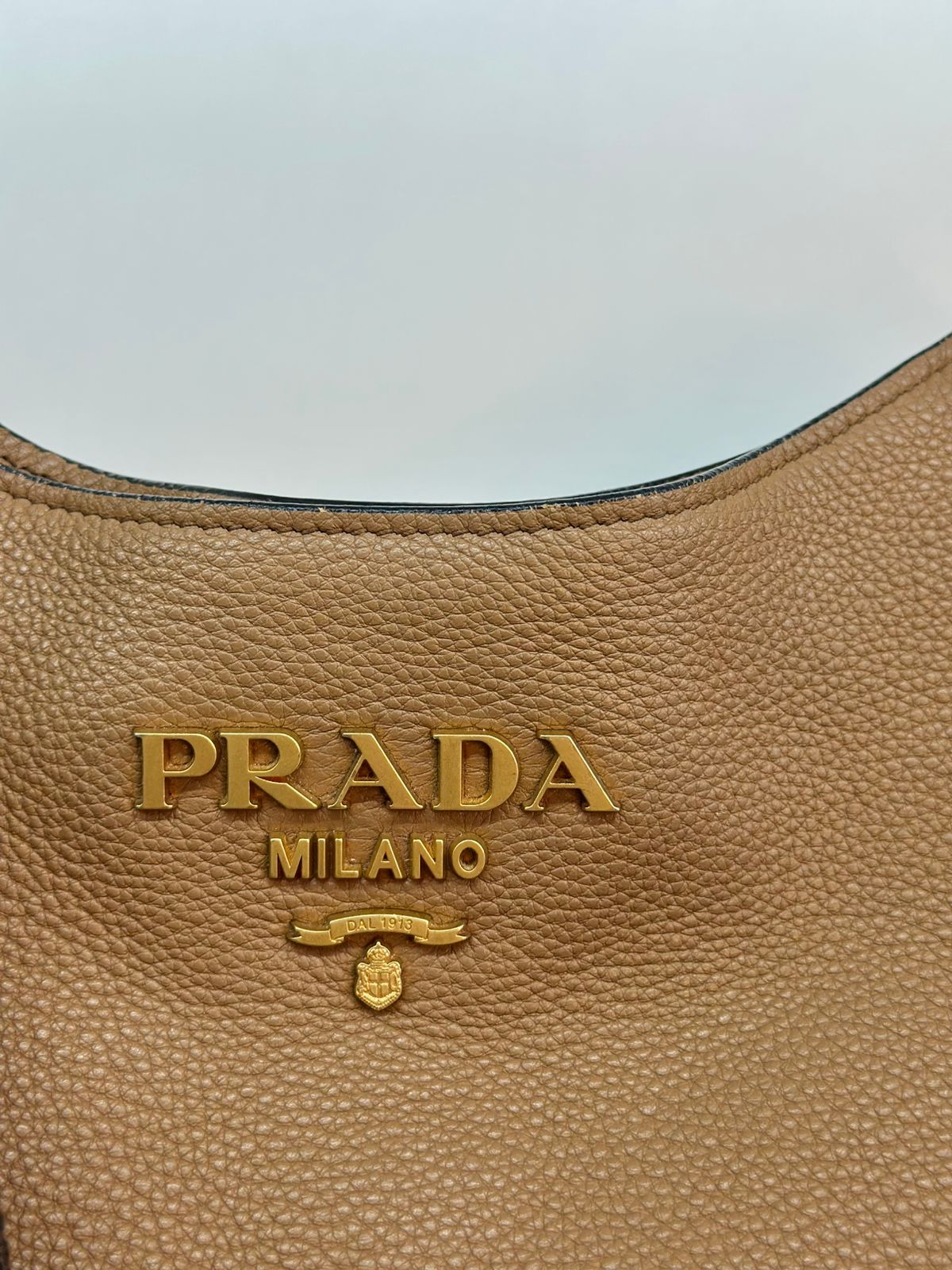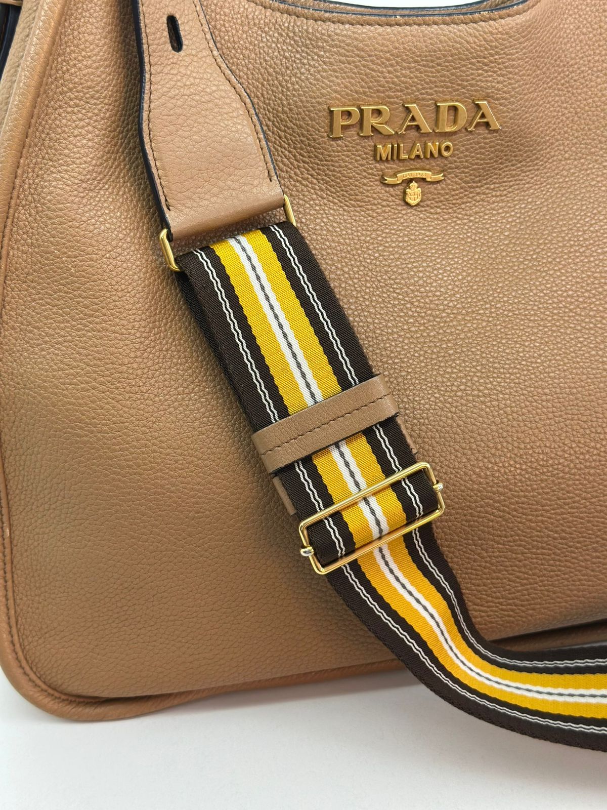 Bolsa Prada Hobo , confeccionada em couro Daino Vitello cor caramelo, acabamento em couro, ferragens no dourado, possui duas alças longas  longa ajustável e removível,  sendo uma em couro e a outra em couro e tecido fechamento principal por botão de pressão, forro em tecido jacquard, compartimento interno único, possui um bolso com fecho em zíper, um bolso plano que possui um botão de magnético. Um bolsa linda e pratica para o dia a dia.