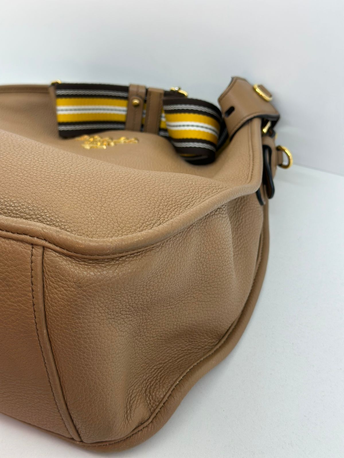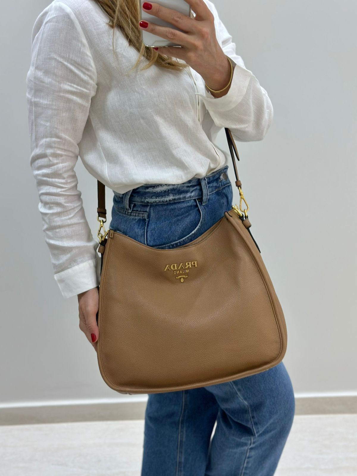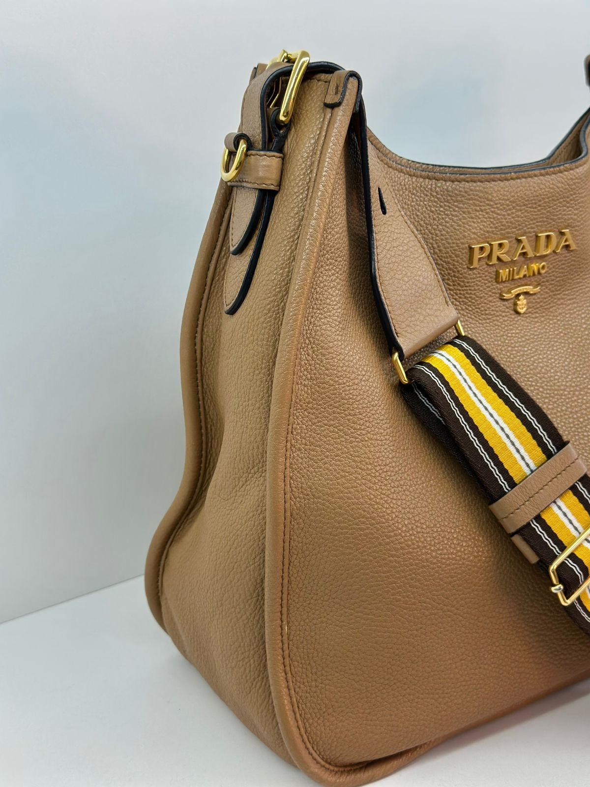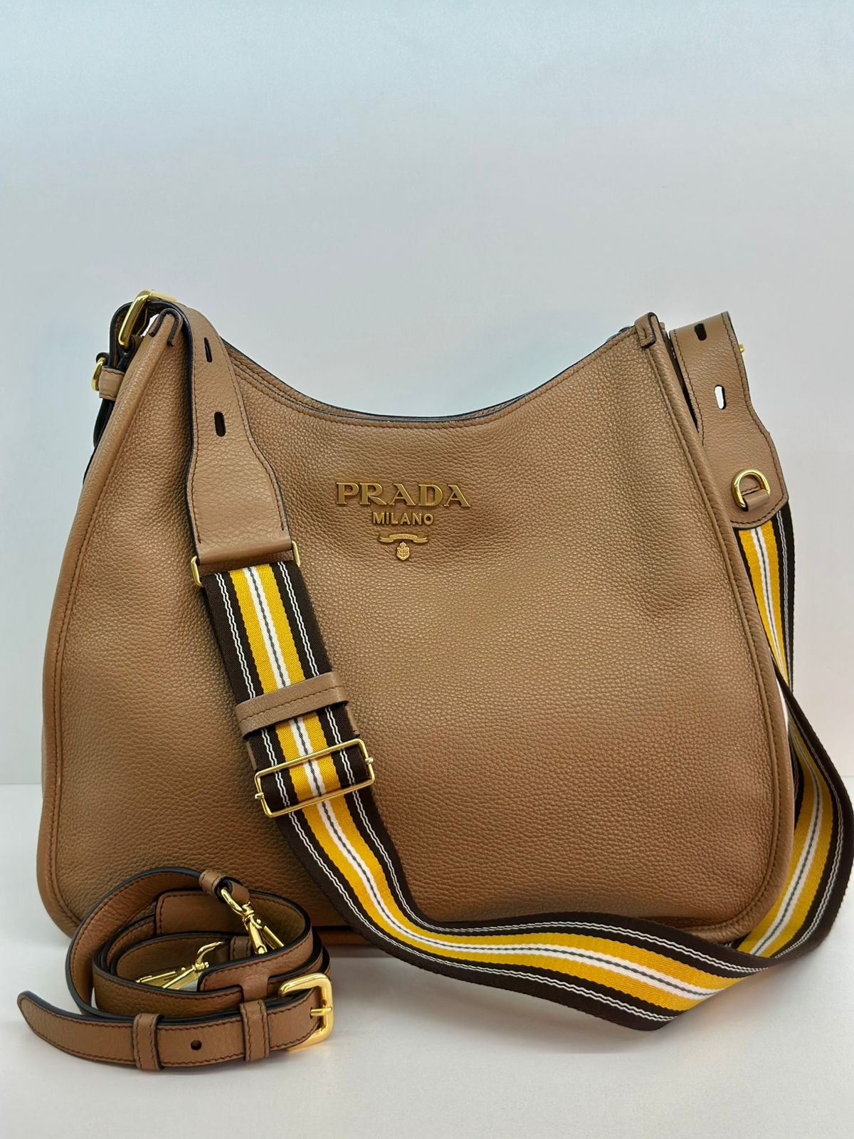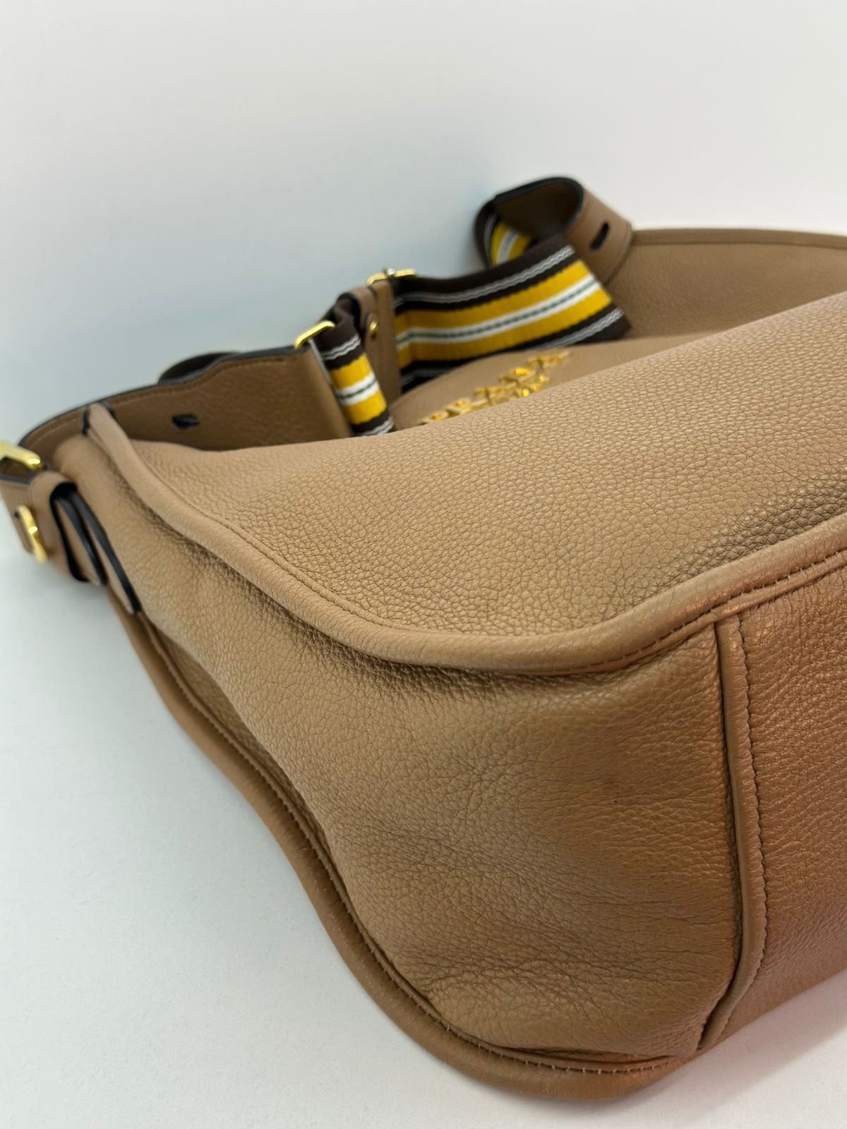 Bolsa Prada Hobo , confeccionada em couro Daino Vitello cor caramelo, acabamento em couro, ferragens no dourado, possui duas alças longas  longa ajustável e removível,  sendo uma em couro e a outra em couro e tecido fechamento principal por botão de pressão, forro em tecido jacquard, compartimento interno único, possui um bolso com fecho em zíper, um bolso plano que possui um botão de magnético. Um bolsa linda e pratica para o dia a dia.