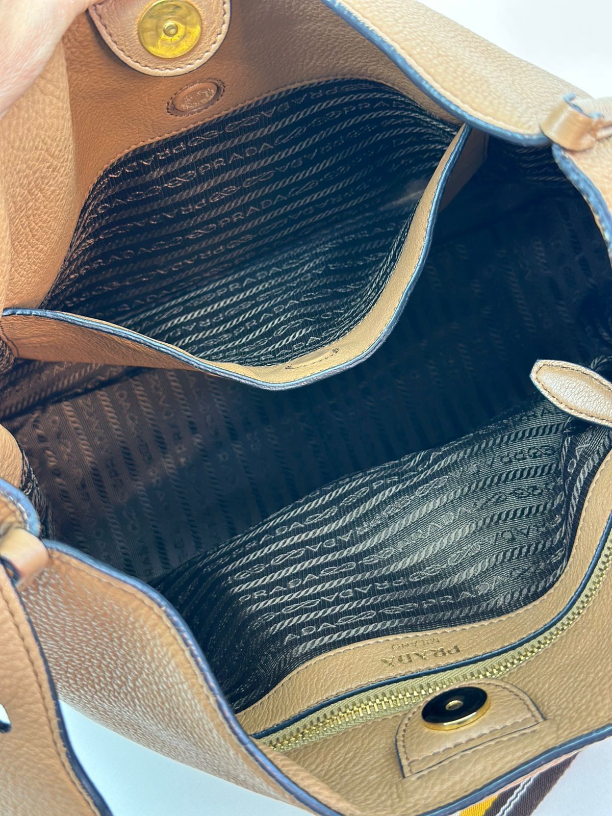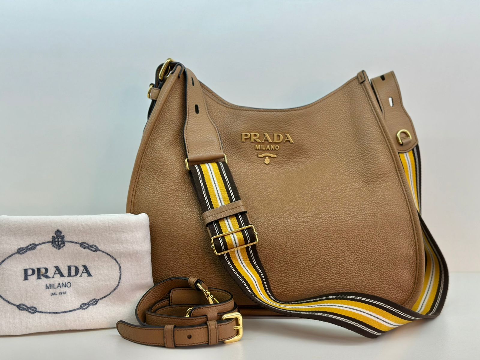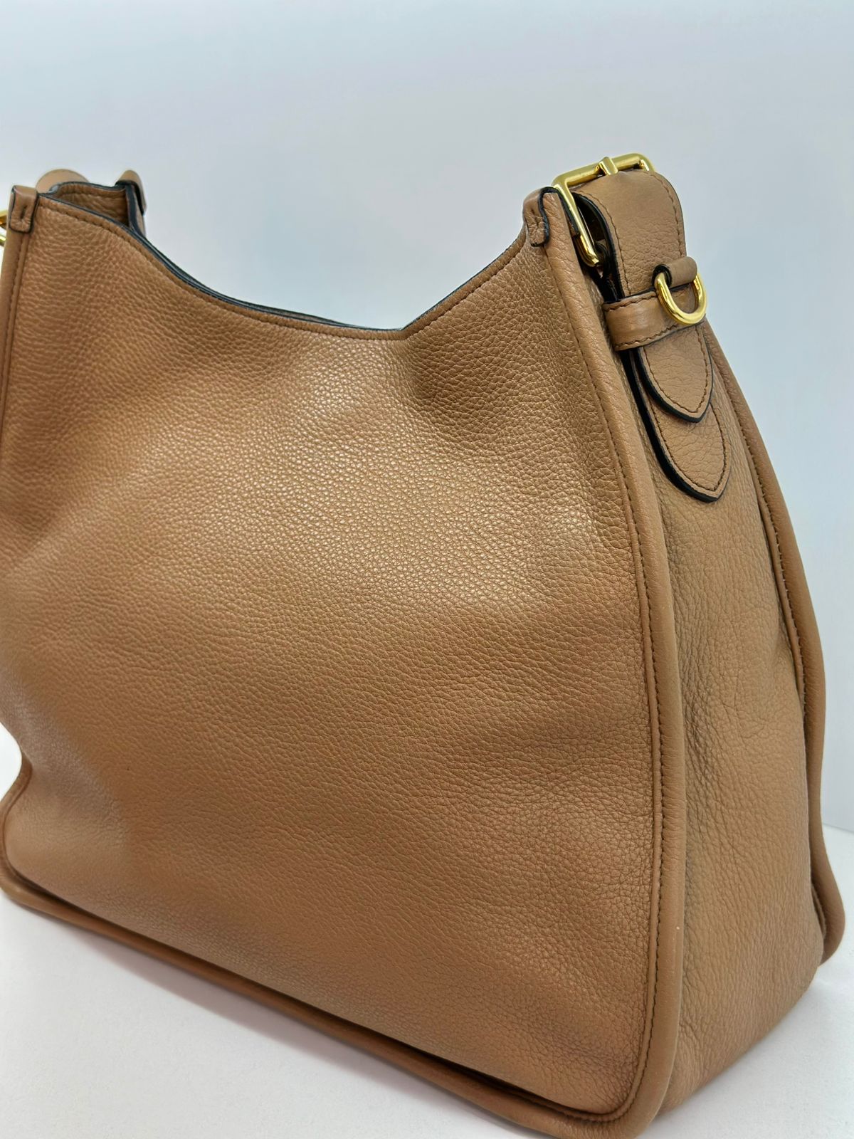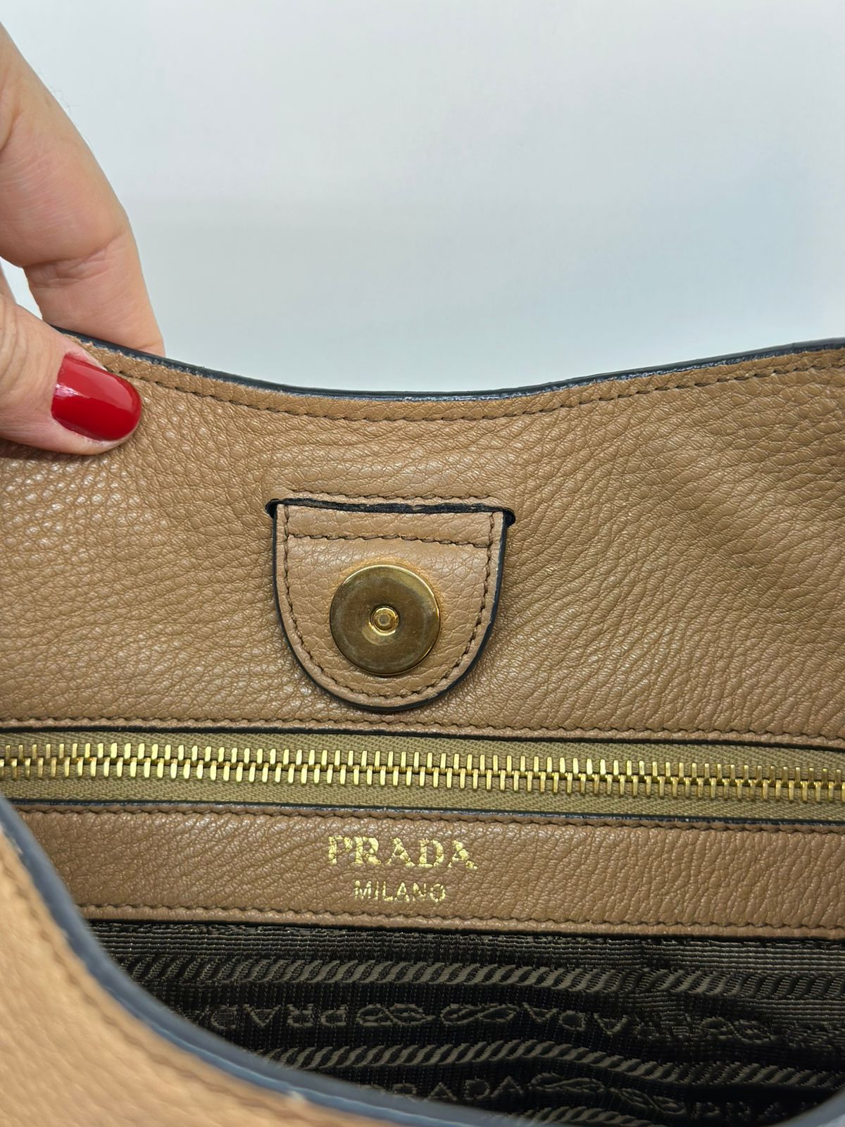 Bolsa Prada Hobo , confeccionada em couro Daino Vitello cor caramelo, acabamento em couro, ferragens no dourado, possui duas alças longas  longa ajustável e removível,  sendo uma em couro e a outra em couro e tecido fechamento principal por botão de pressão, forro em tecido jacquard, compartimento interno único, possui um bolso com fecho em zíper, um bolso plano que possui um botão de magnético. Um bolsa linda e pratica para o dia a dia.