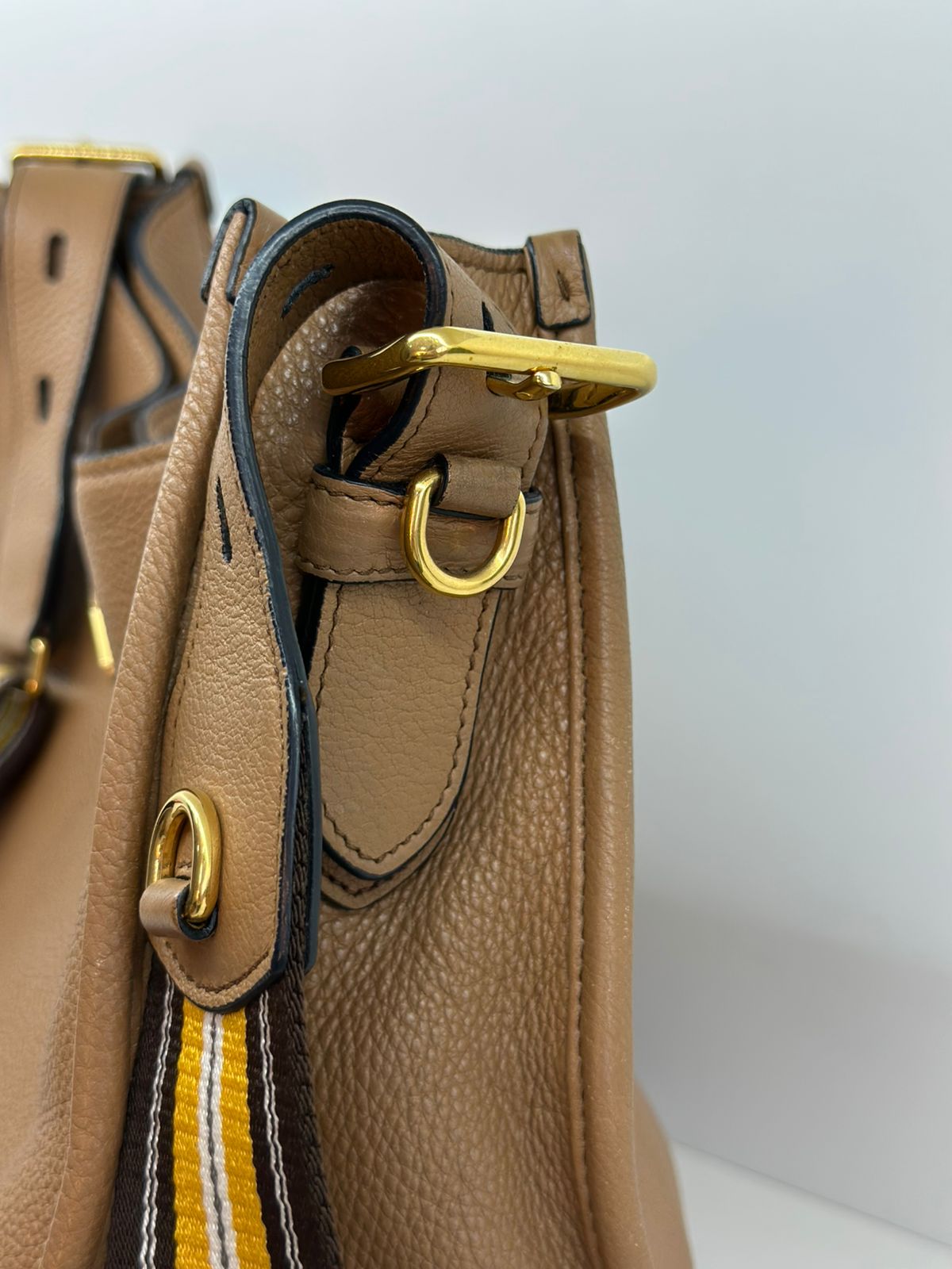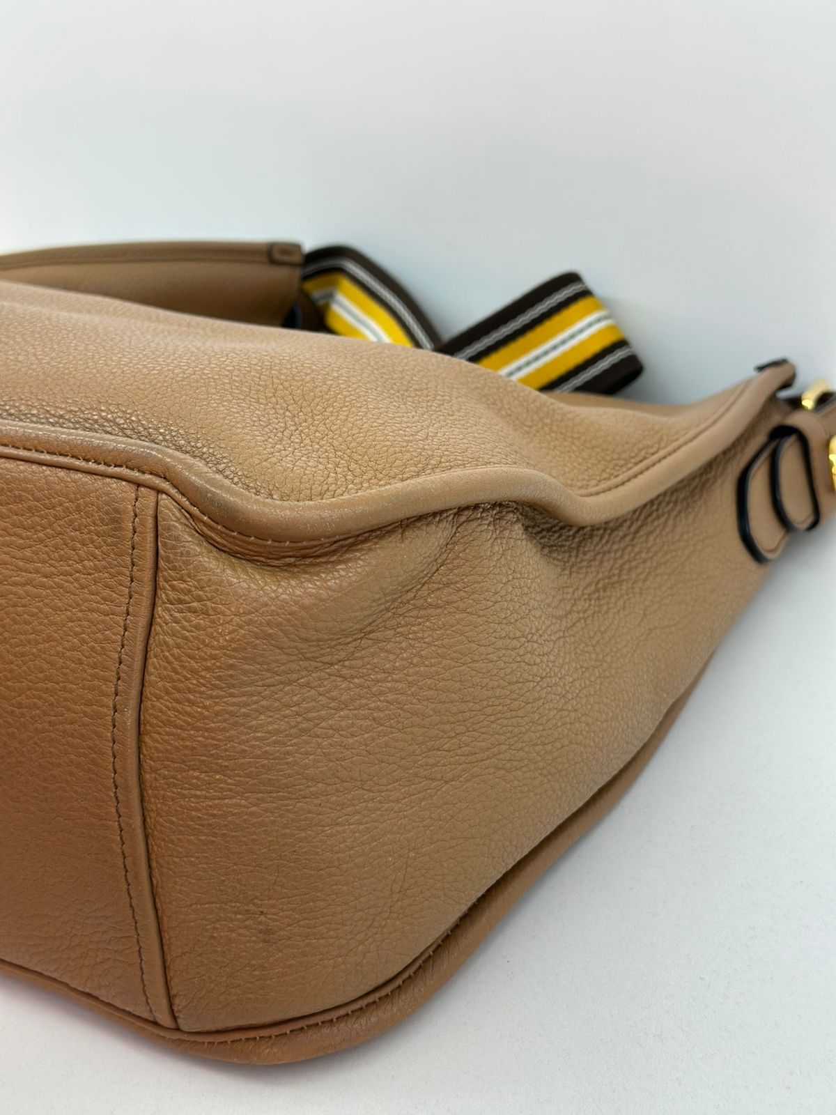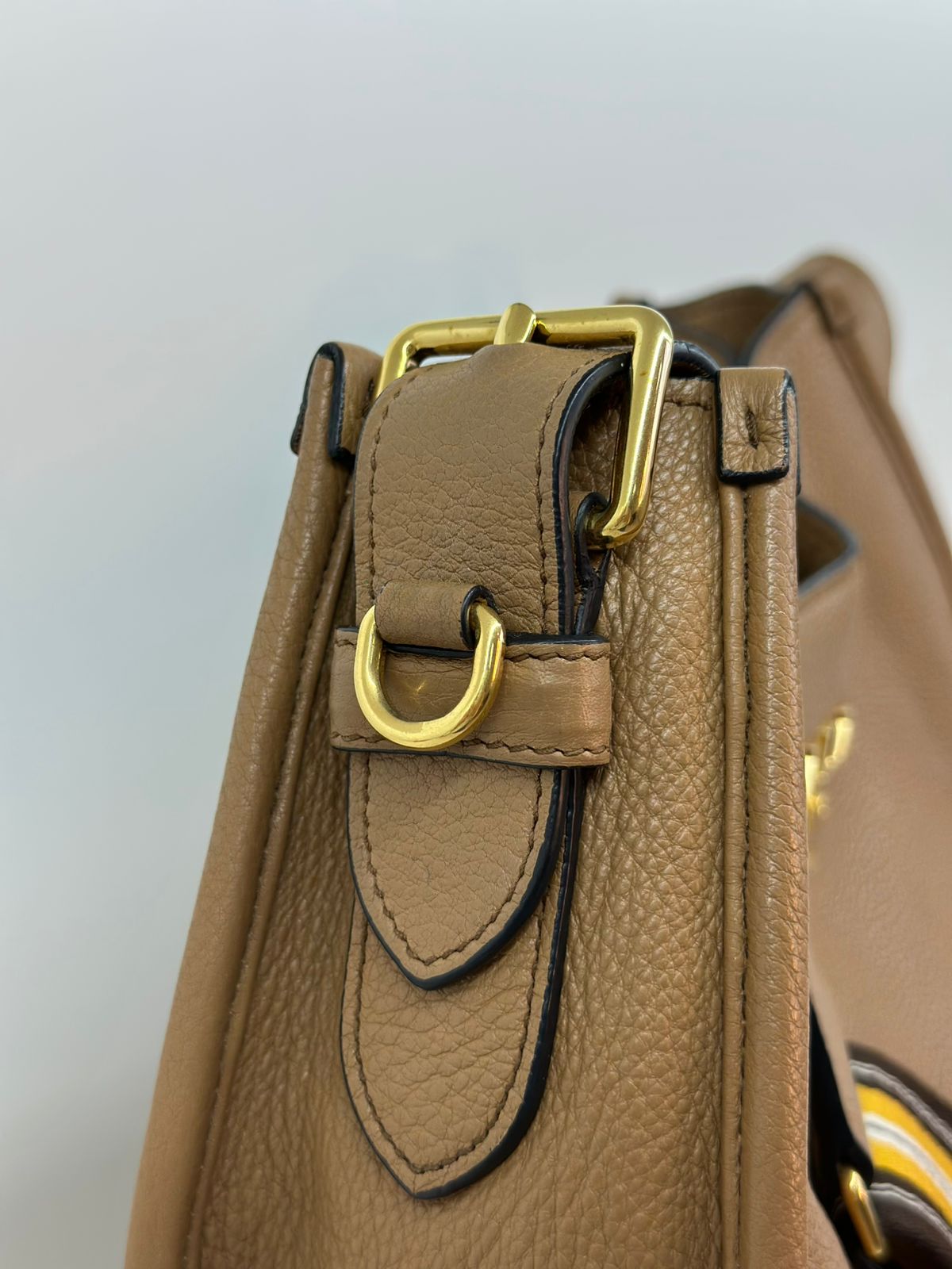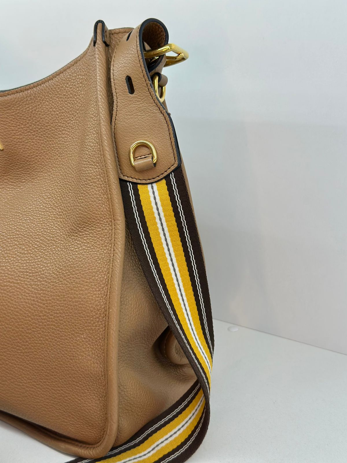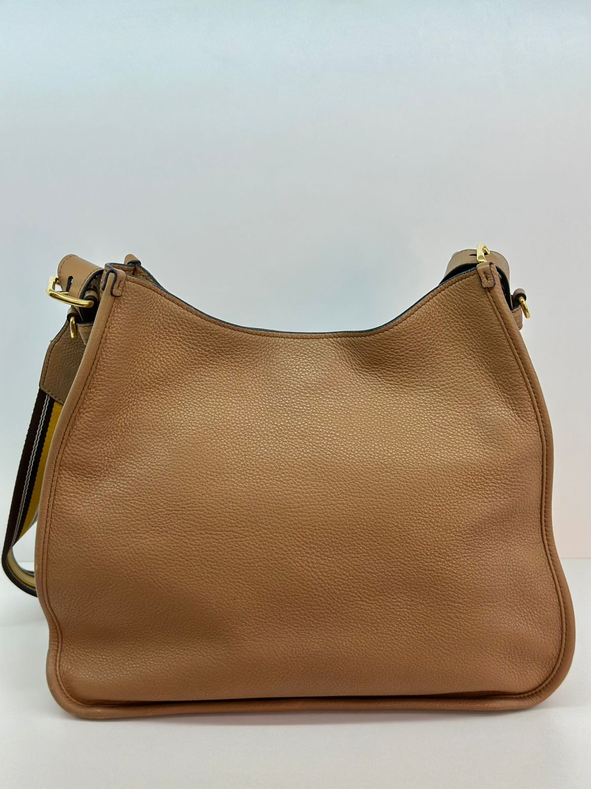 Bolsa Prada Hobo , confeccionada em couro Daino Vitello cor caramelo, acabamento em couro, ferragens no dourado, possui duas alças longas  longa ajustável e removível,  sendo uma em couro e a outra em couro e tecido fechamento principal por botão de pressão, forro em tecido jacquard, compartimento interno único, possui um bolso com fecho em zíper, um bolso plano que possui um botão de magnético. Um bolsa linda e pratica para o dia a dia.
