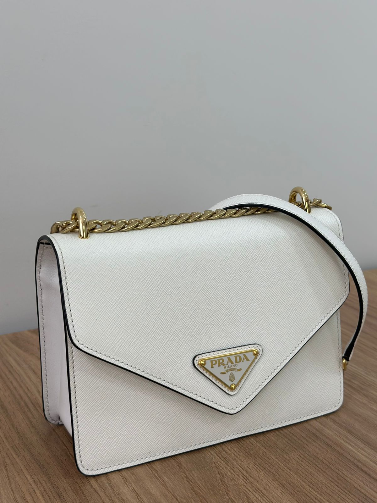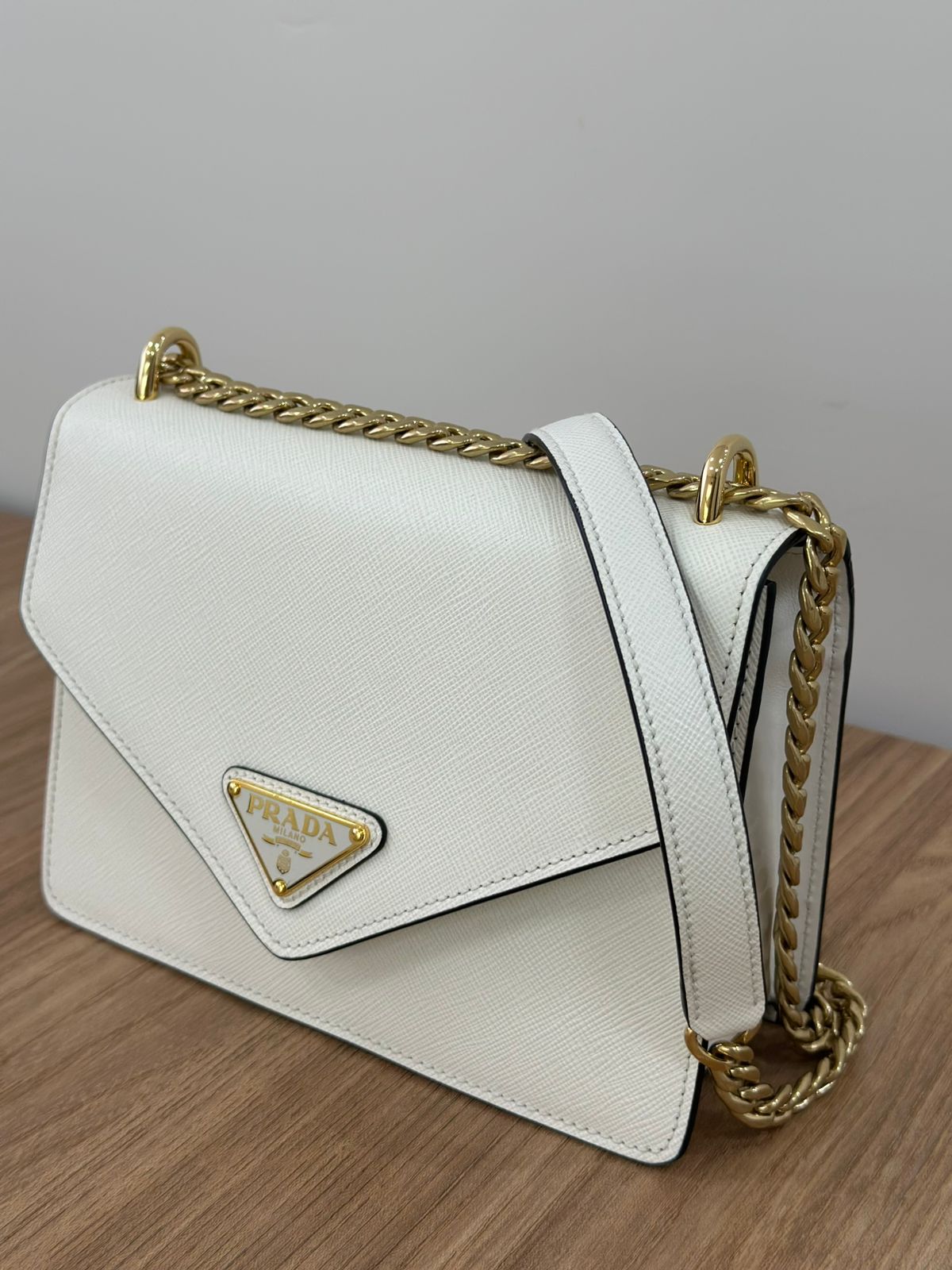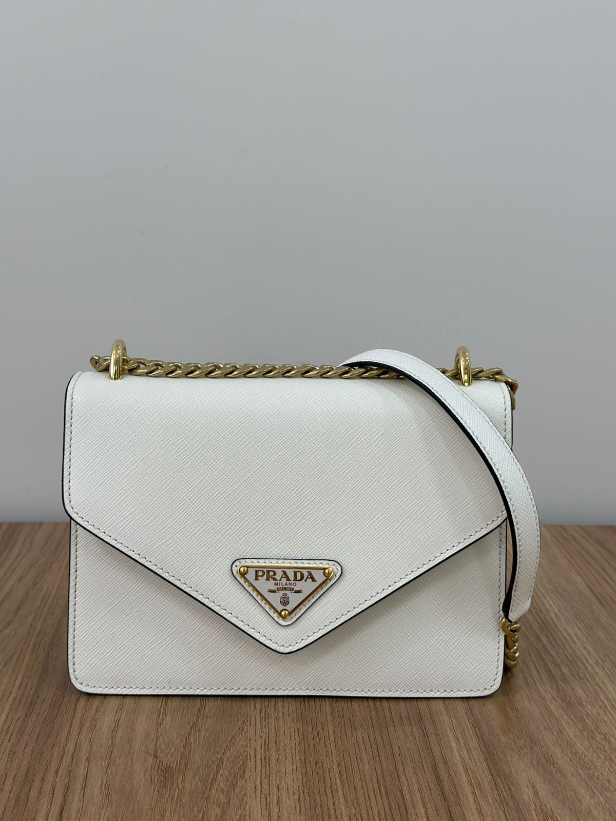 Bolsa Prada Saffiano Lux Envelope, uma bolsa estruturada modelo crossbody confeccionada no couro Saffiano na cor branca, com ferragens no dourado, placa triangular em metal com a logo da marca na aba flap, possui alça de ombro longa em corrente e couro, fecho com botões magnéticos, compartimento único, forro em tecido. Uma ótima Prada para momentos únicos e especiais.