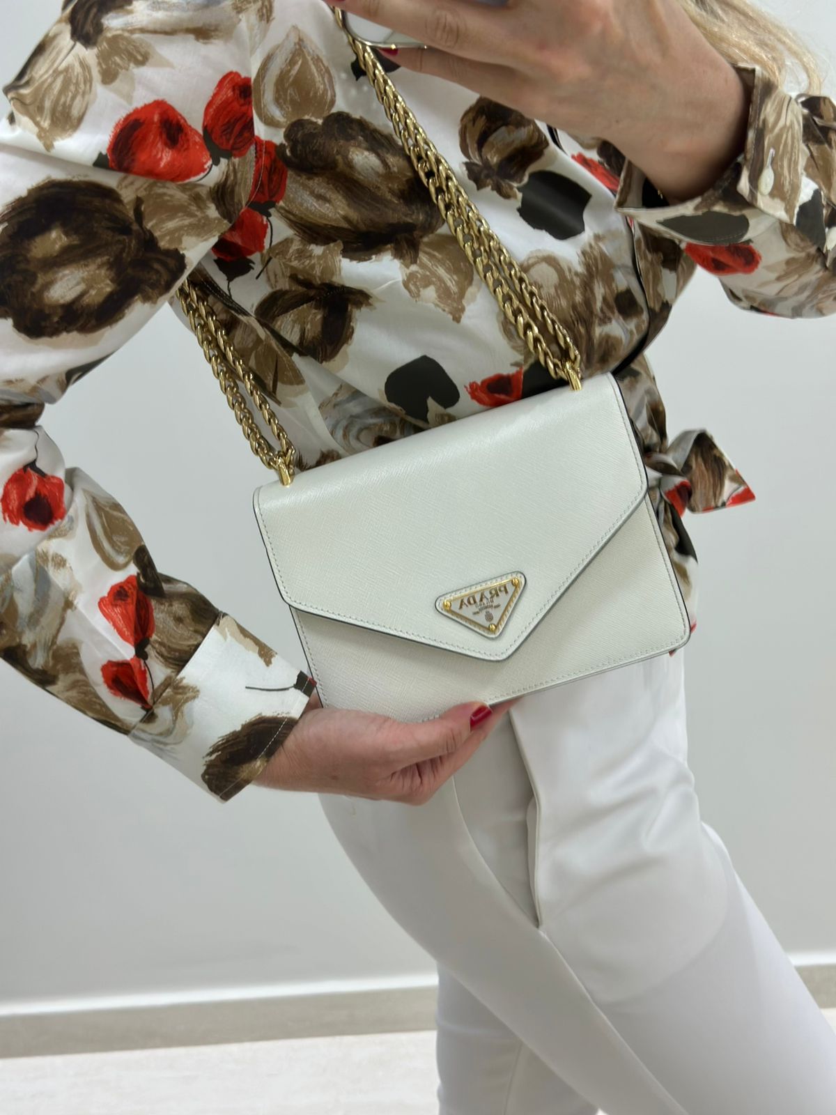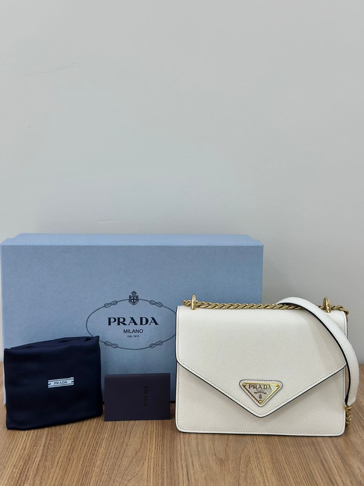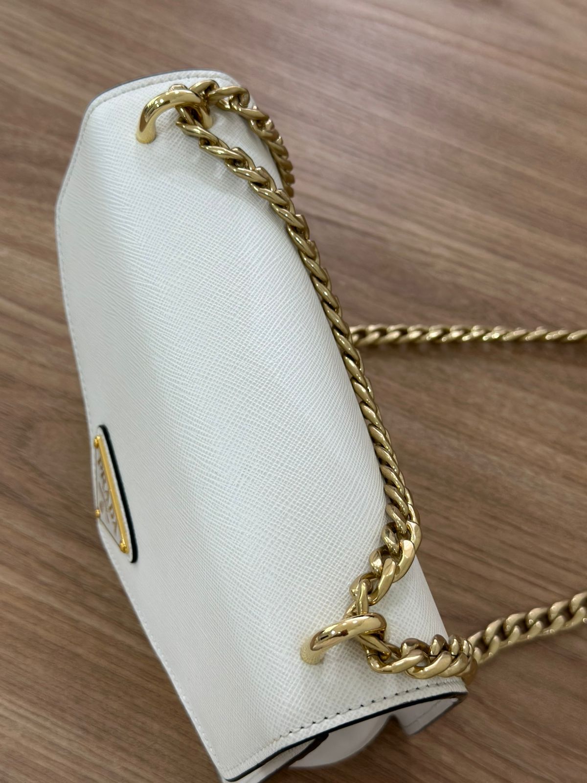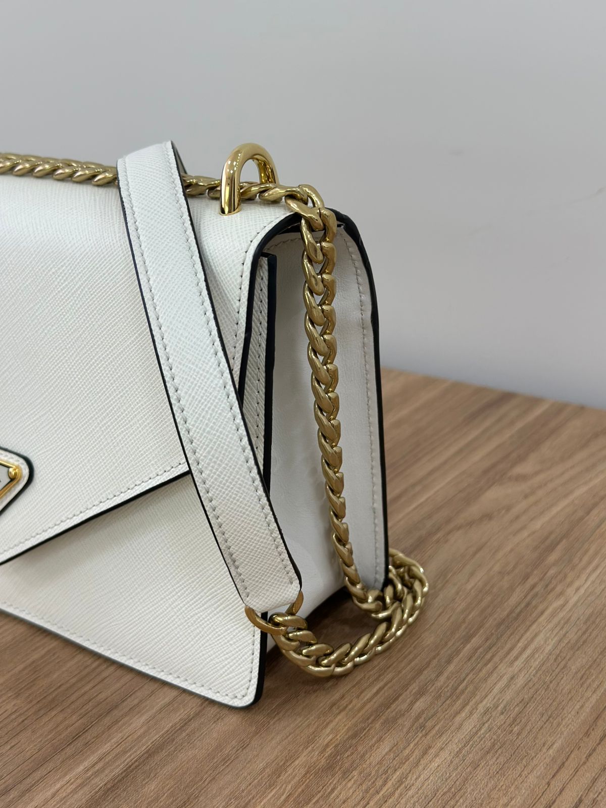 Bolsa Prada Saffiano Lux Envelope, uma bolsa estruturada modelo crossbody confeccionada no couro Saffiano na cor branca, com ferragens no dourado, placa triangular em metal com a logo da marca na aba flap, possui alça de ombro longa em corrente e couro, fecho com botões magnéticos, compartimento único, forro em tecido. Uma ótima Prada para momentos únicos e especiais.