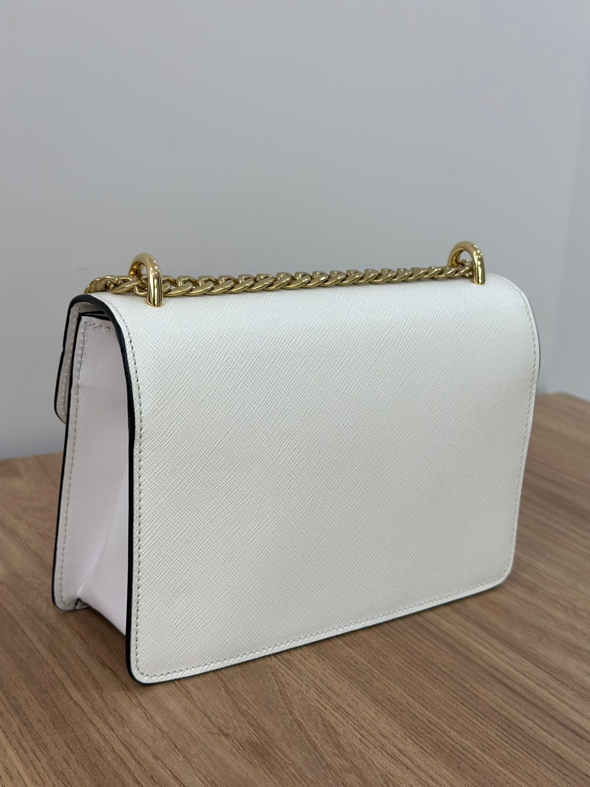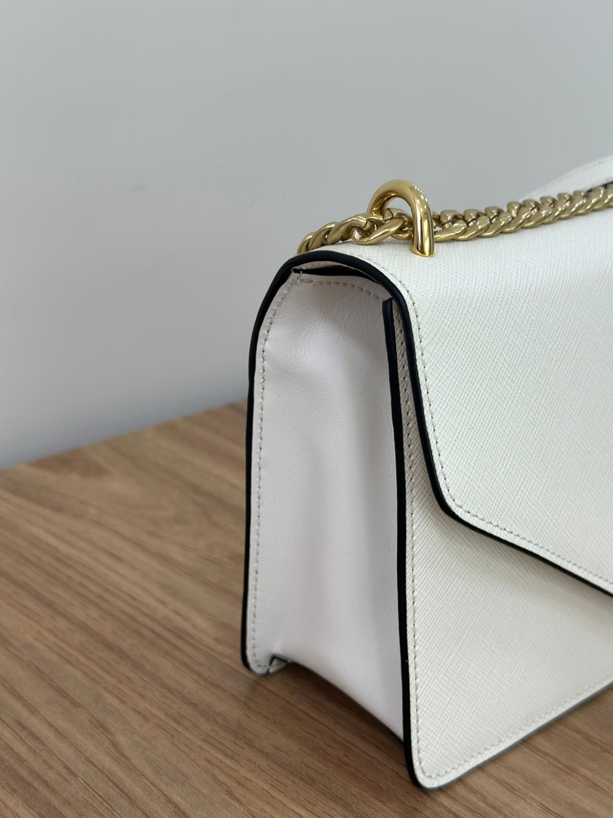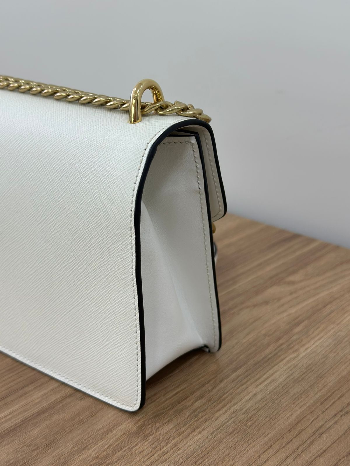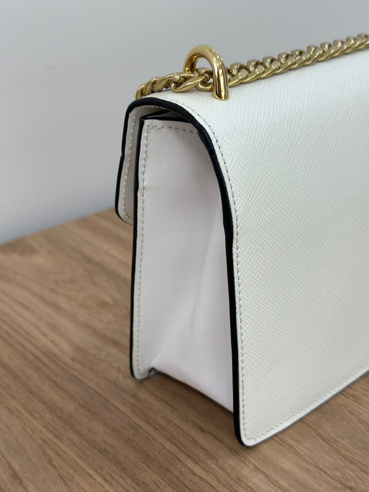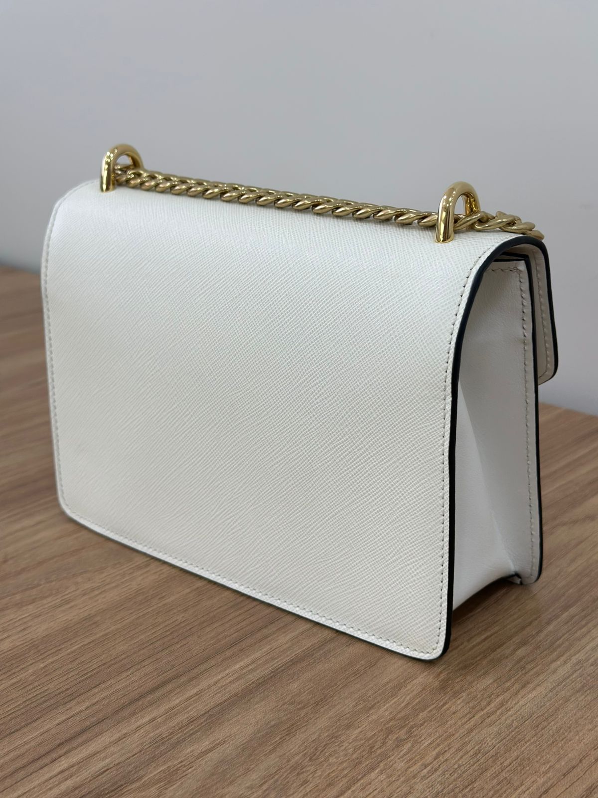 - Couro Saffiano na cor branca;