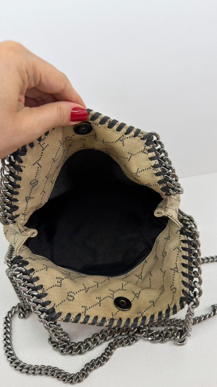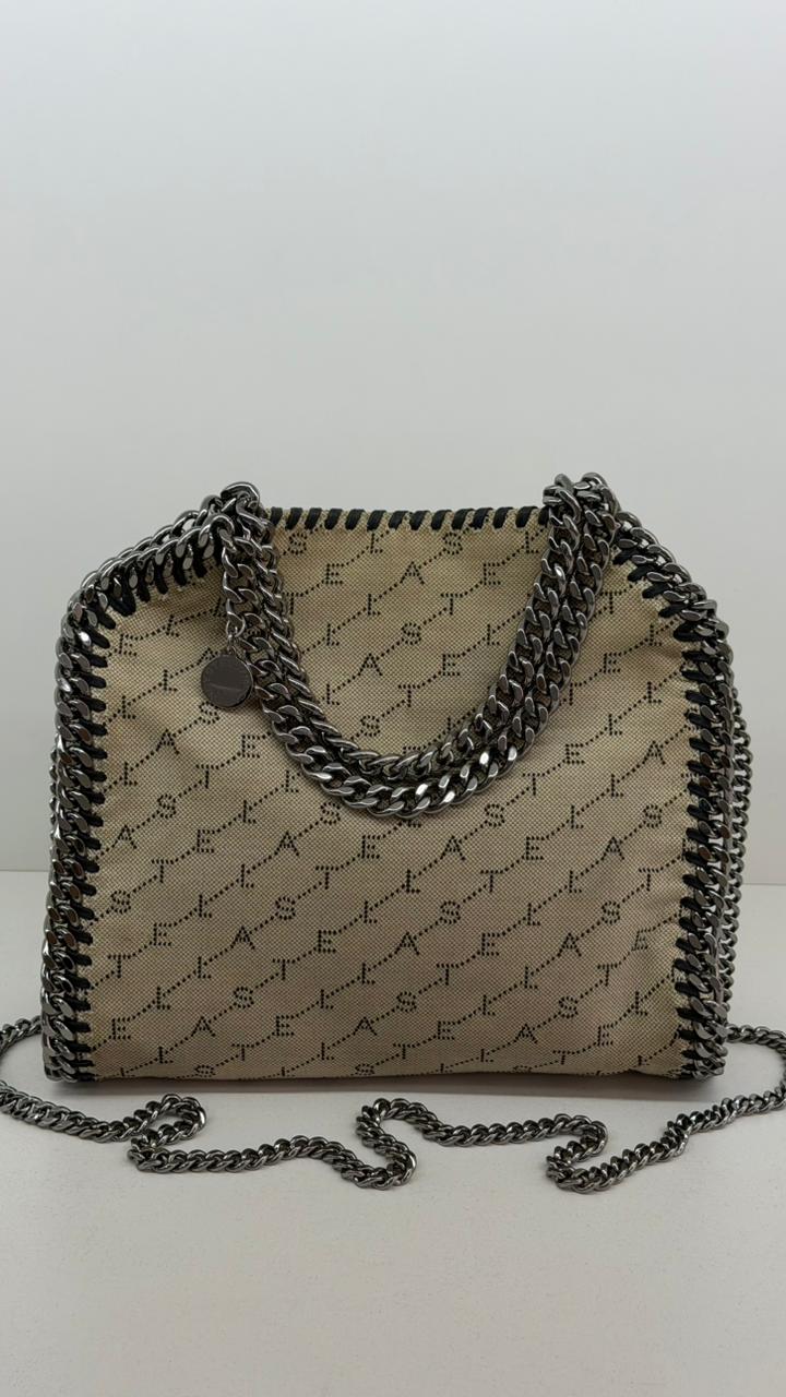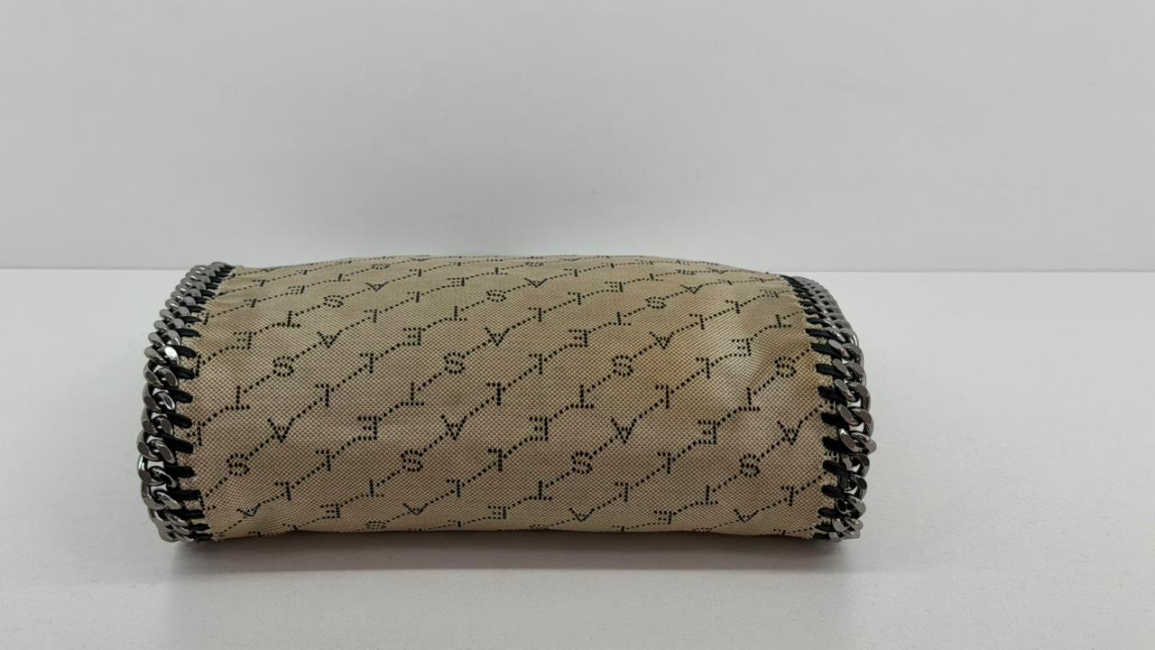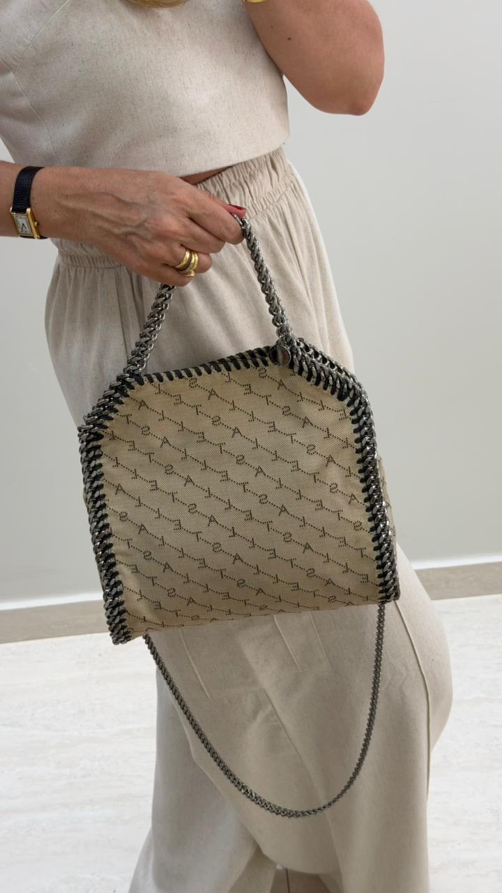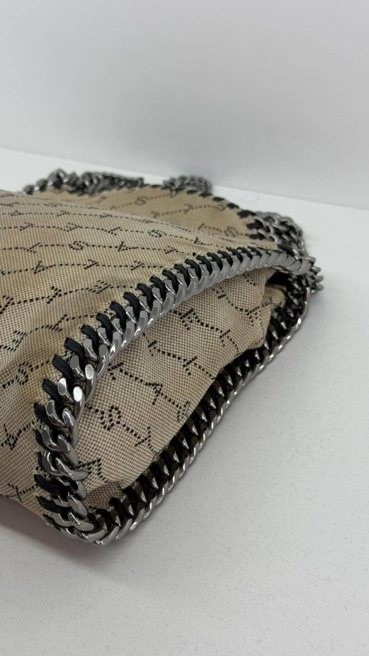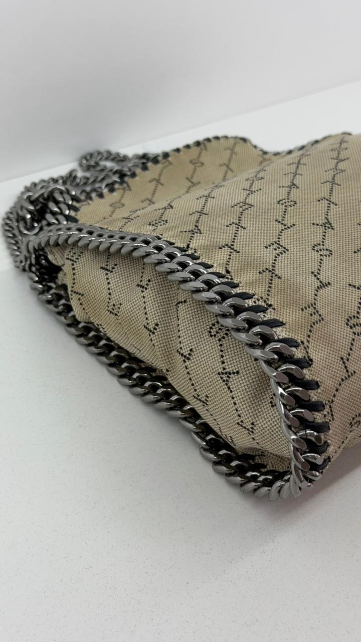Bolsa Stella McCartney Falabella, confeccionada em tecido bege mongramado, com ferragens no prata envelhecido, possui alça dupla de ombro em correntes, acabamento em elos de correntes, possui tag em medalha com o nome da marca, compartimento interno possui compartimento único, apresenta forro em tecido, com um bolso com fecho em zíper, fecho principal por botão magnética. Uma bolsa elegante e moderna, modelo tote, as laterais são finalizada com uma corrente metálica robusta, que contorna toda a peça e se estende para formar as alças, garantindo um charme urbano e contemporâneo. Ideal para o dia a dia ou para compor produções mais elaboradas, a bolsa oferece espaço amplo para acomodar itens essenciais com praticidade , mantendo sempre a elegância.
