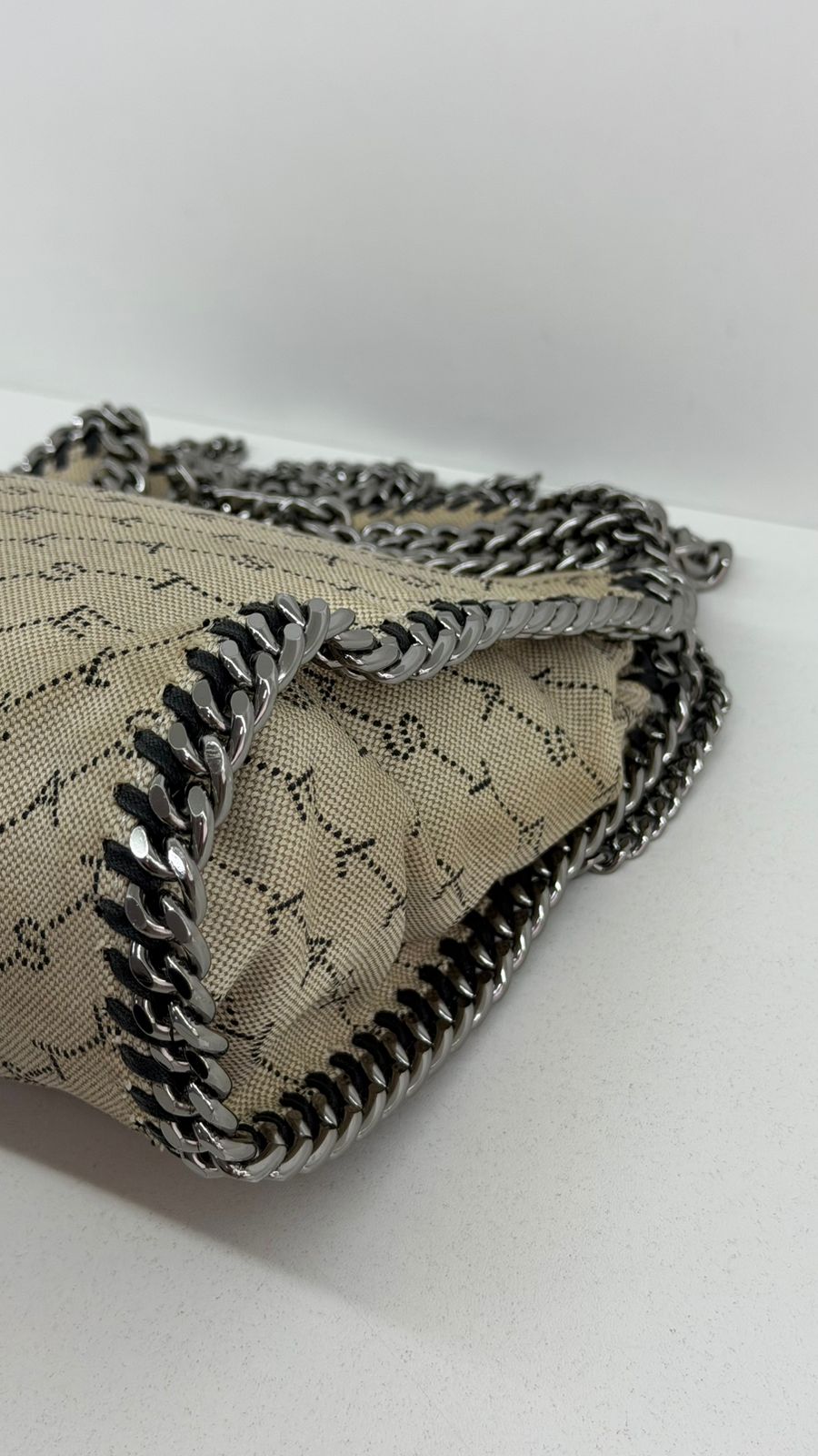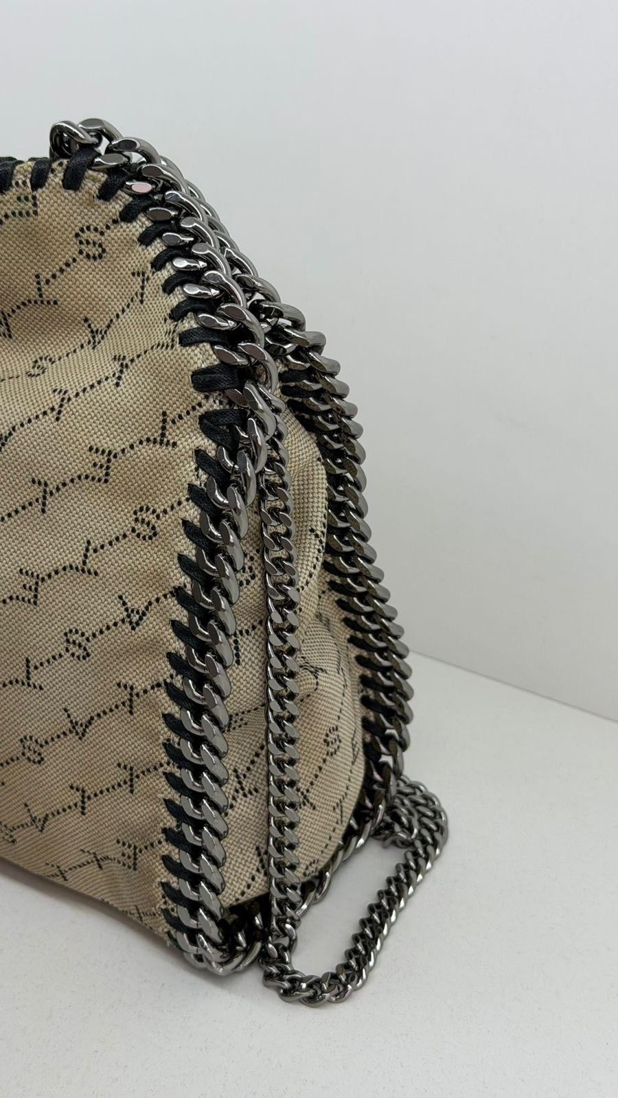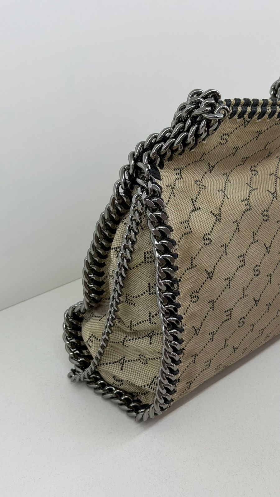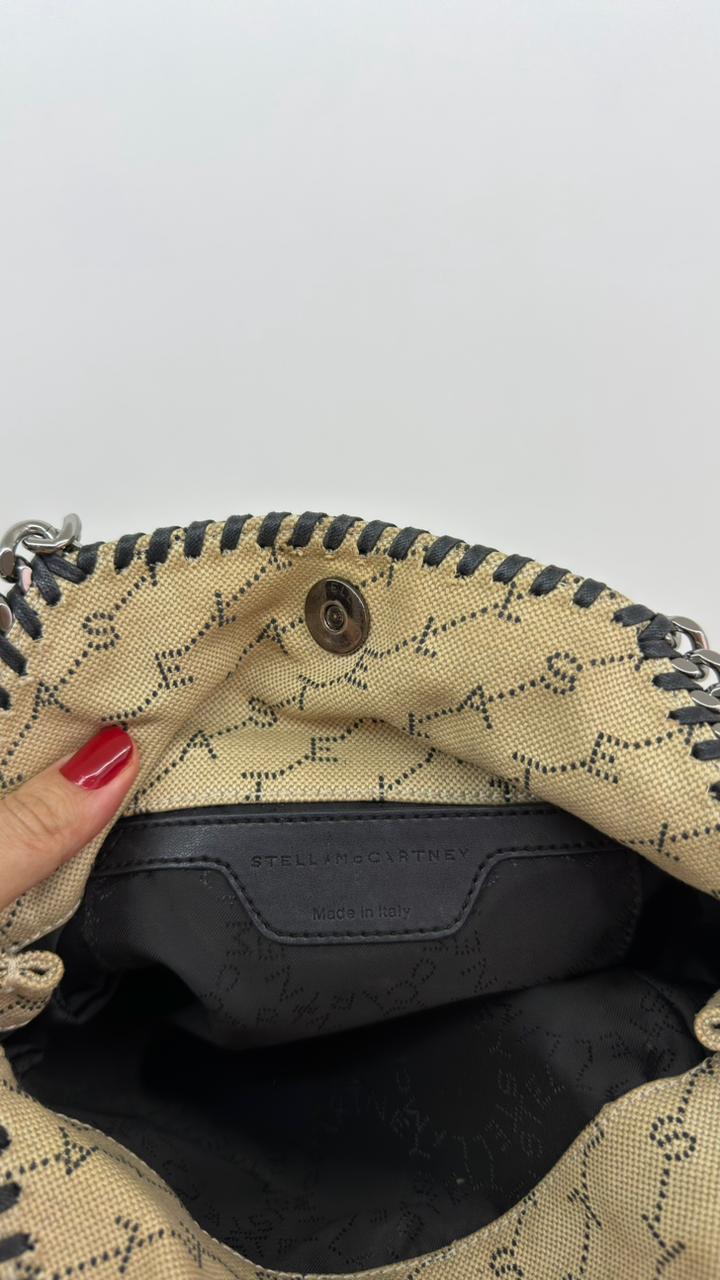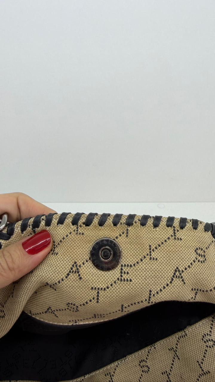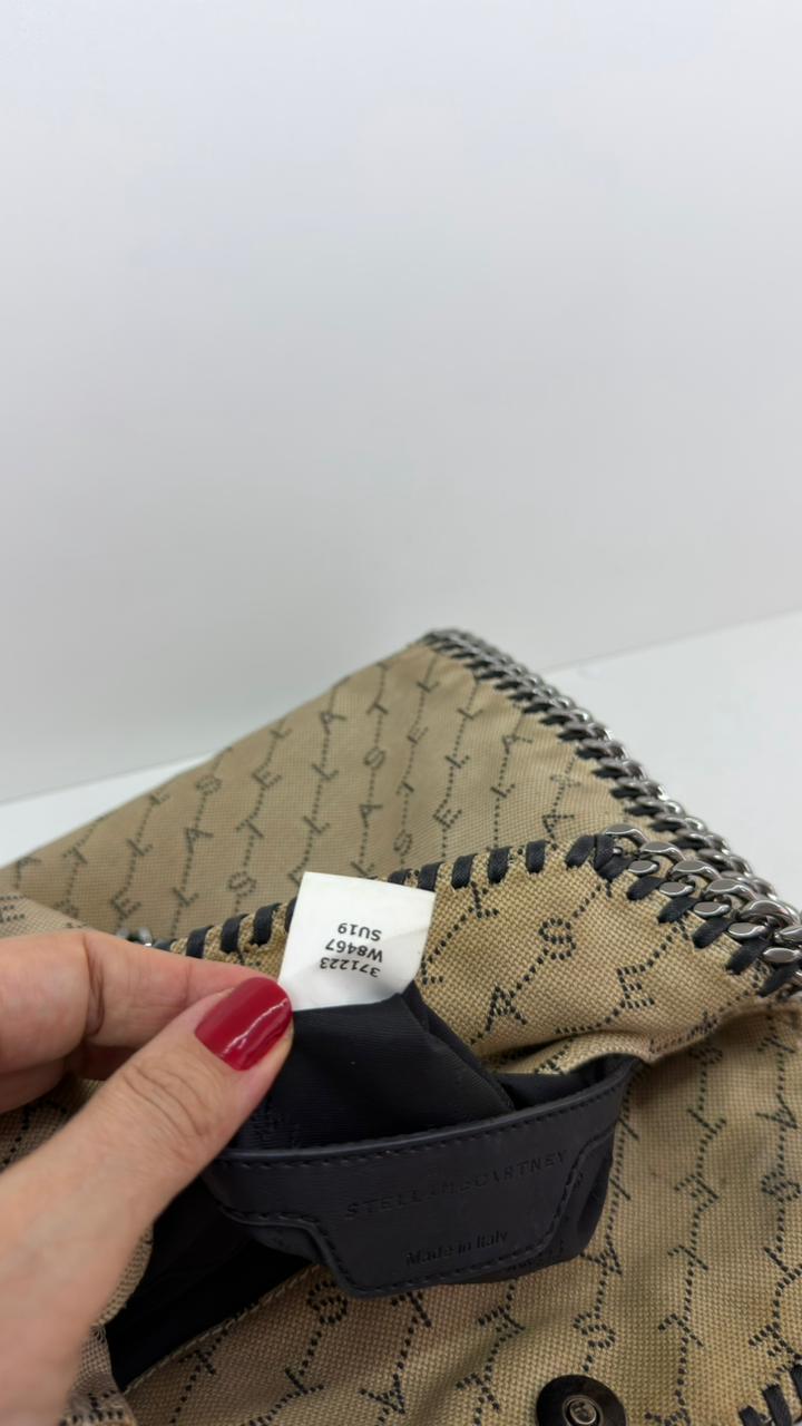 Bolsa Stella McCartney Falabella, confeccionada em tecido bege mongramado, com ferragens no prata envelhecido, possui alça dupla de ombro em correntes, acabamento em elos de correntes, possui tag em medalha com o nome da marca, compartimento interno possui compartimento único, apresenta forro em tecido, com um bolso com fecho em zíper, fecho principal por botão magnética. Uma bolsa elegante e moderna, modelo tote, as laterais são finalizada com uma corrente metálica robusta, que contorna toda a peça e se estende para formar as alças, garantindo um charme urbano e contemporâneo. Ideal para o dia a dia ou para compor produções mais elaboradas, a bolsa oferece espaço amplo para acomodar itens essenciais com praticidade , mantendo sempre a elegância.