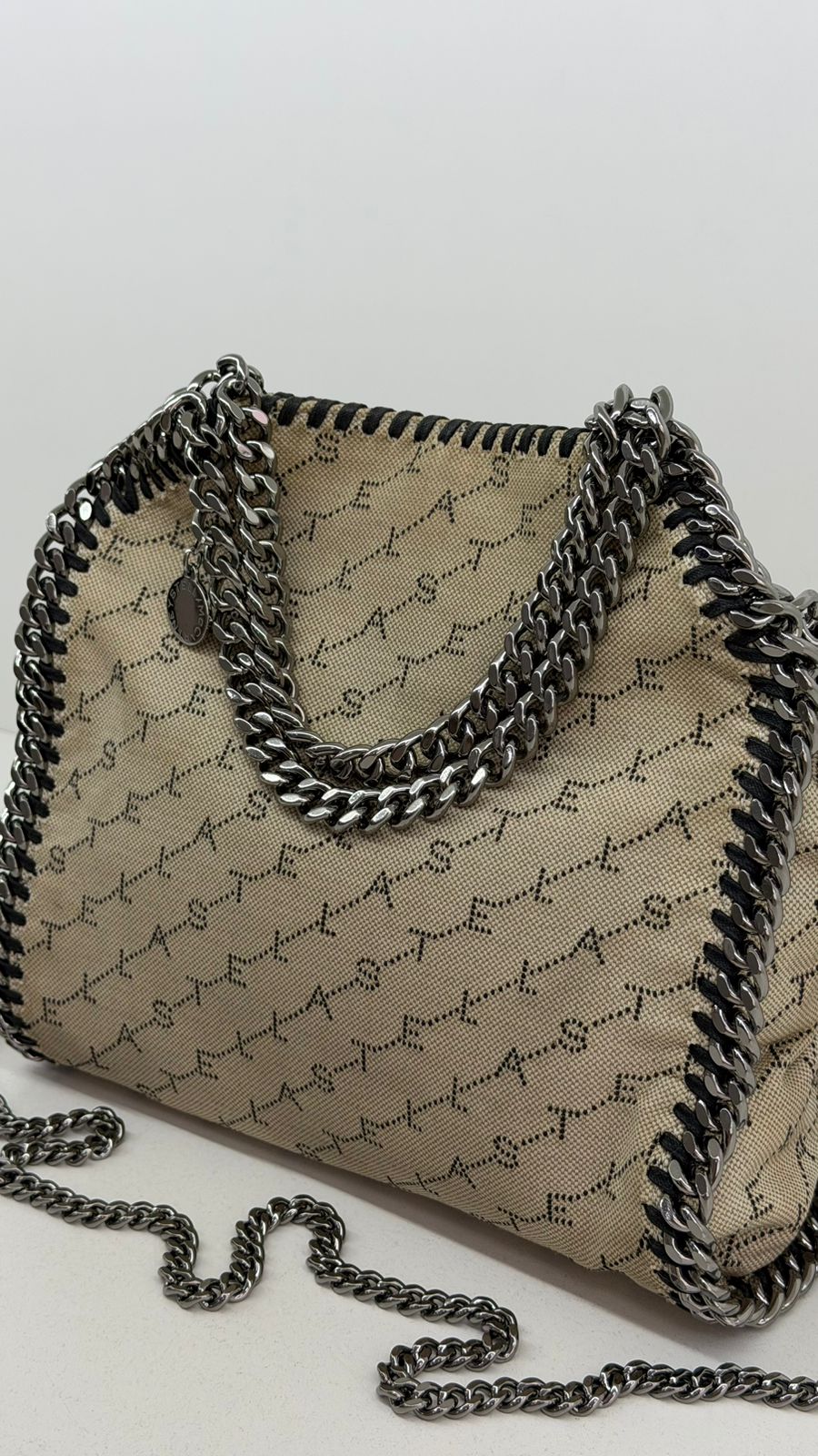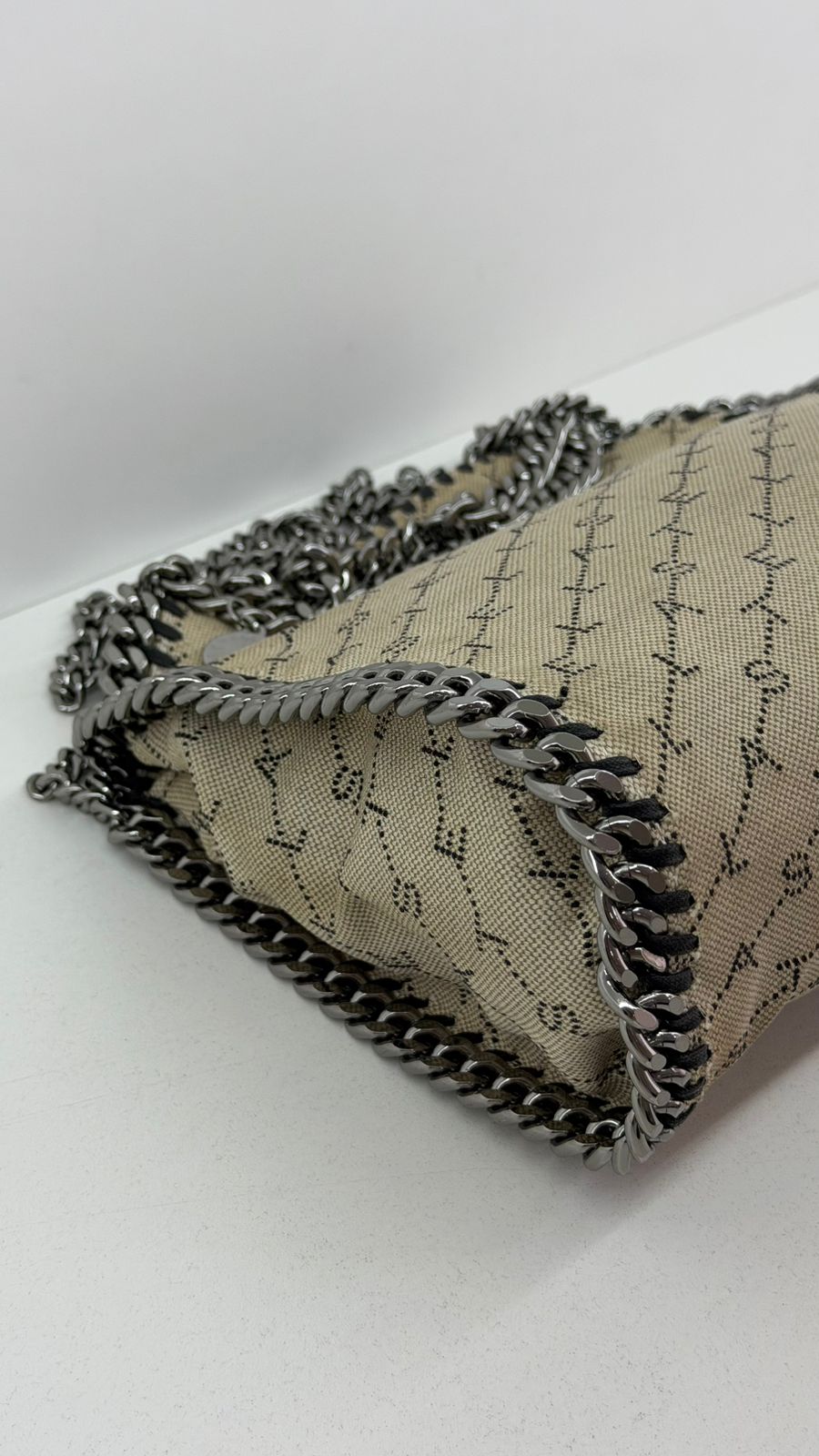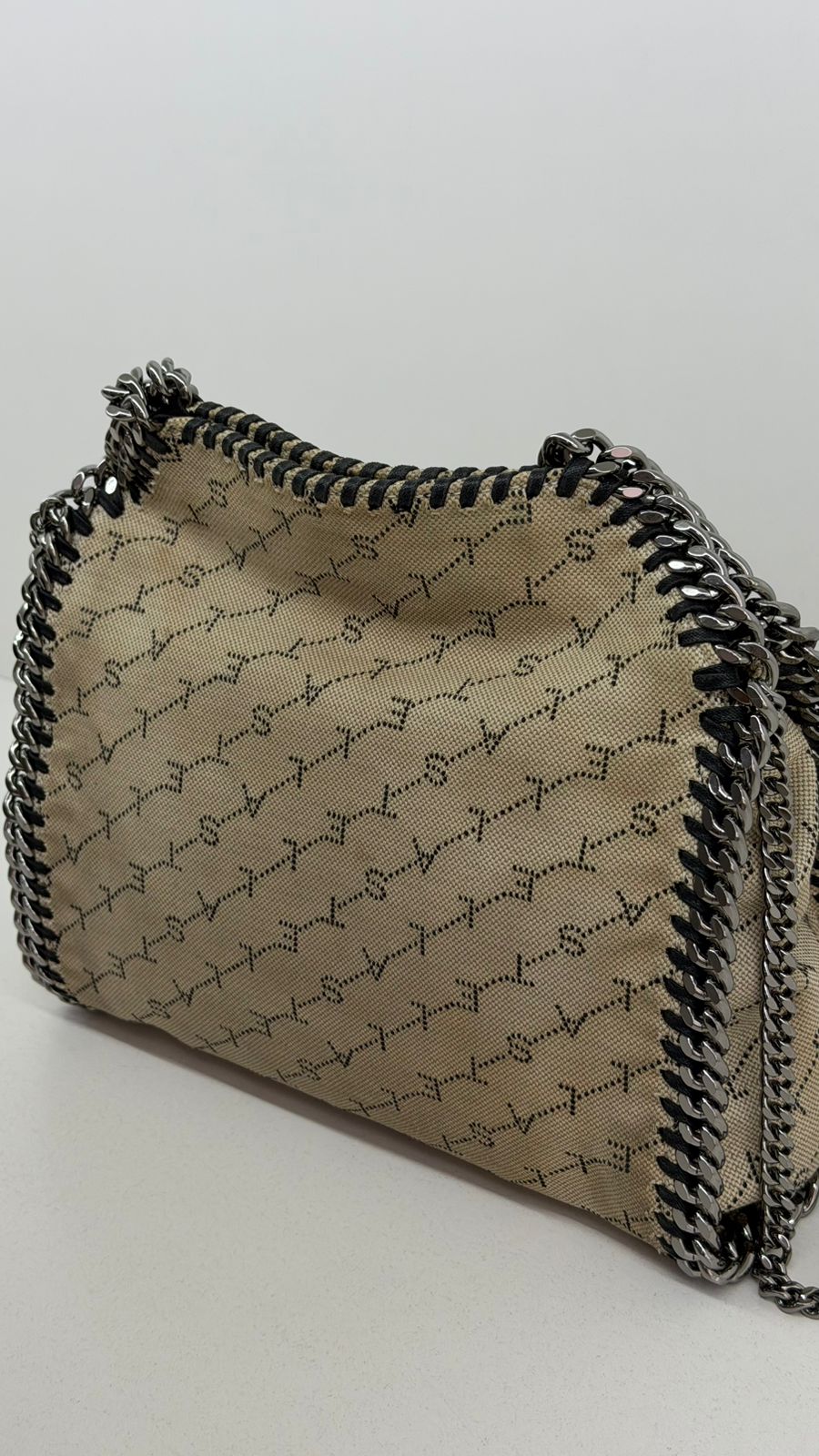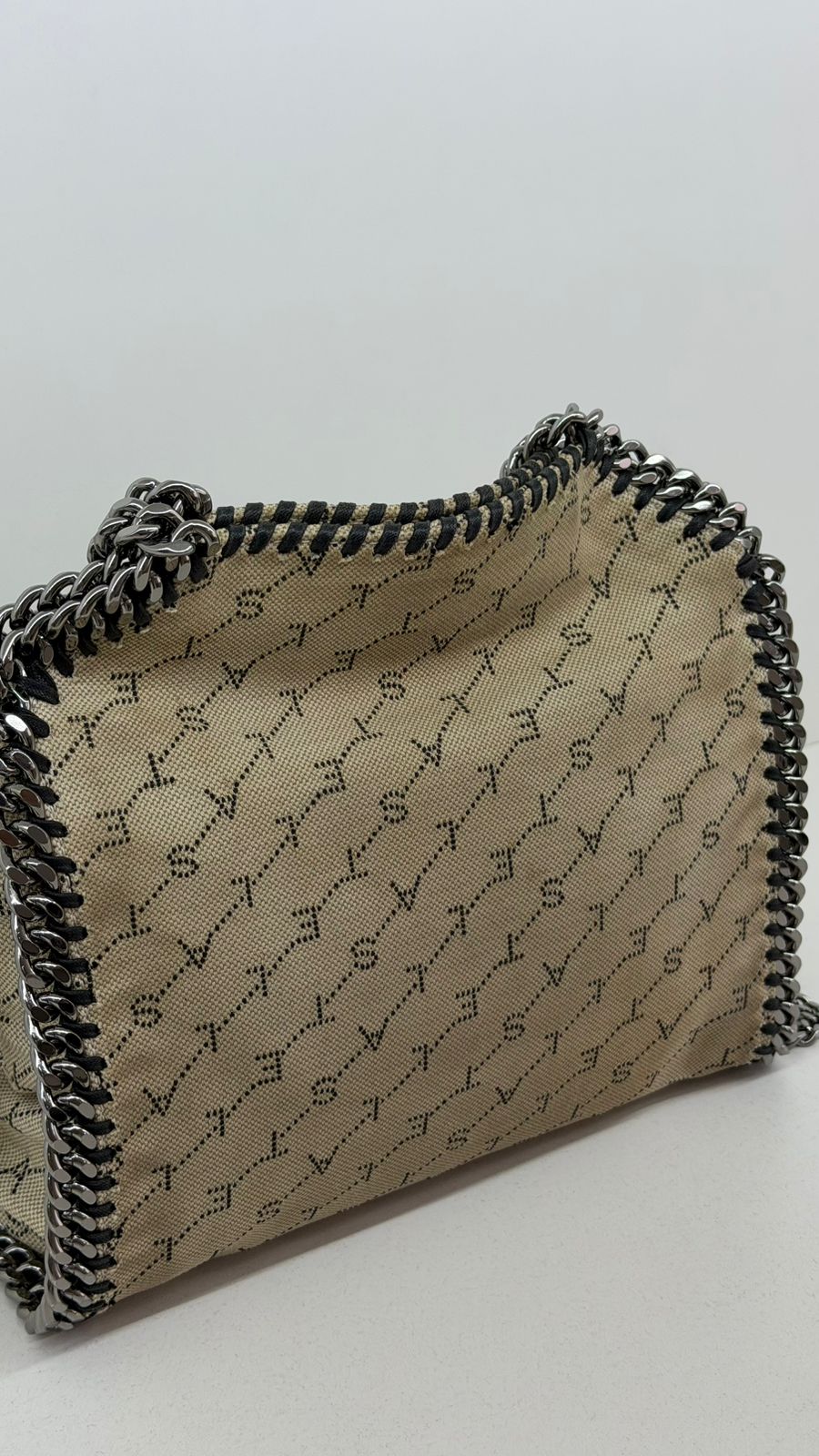 Bolsa Stella McCartney Falabella, confeccionada em tecido bege mongramado, com ferragens no prata envelhecido, possui alça dupla de ombro em correntes, acabamento em elos de correntes, possui tag em medalha com o nome da marca, compartimento interno possui compartimento único, apresenta forro em tecido, com um bolso com fecho em zíper, fecho principal por botão magnética. Uma bolsa elegante e moderna, modelo tote, as laterais são finalizada com uma corrente metálica robusta, que contorna toda a peça e se estende para formar as alças, garantindo um charme urbano e contemporâneo. Ideal para o dia a dia ou para compor produções mais elaboradas, a bolsa oferece espaço amplo para acomodar itens essenciais com praticidade , mantendo sempre a elegância.