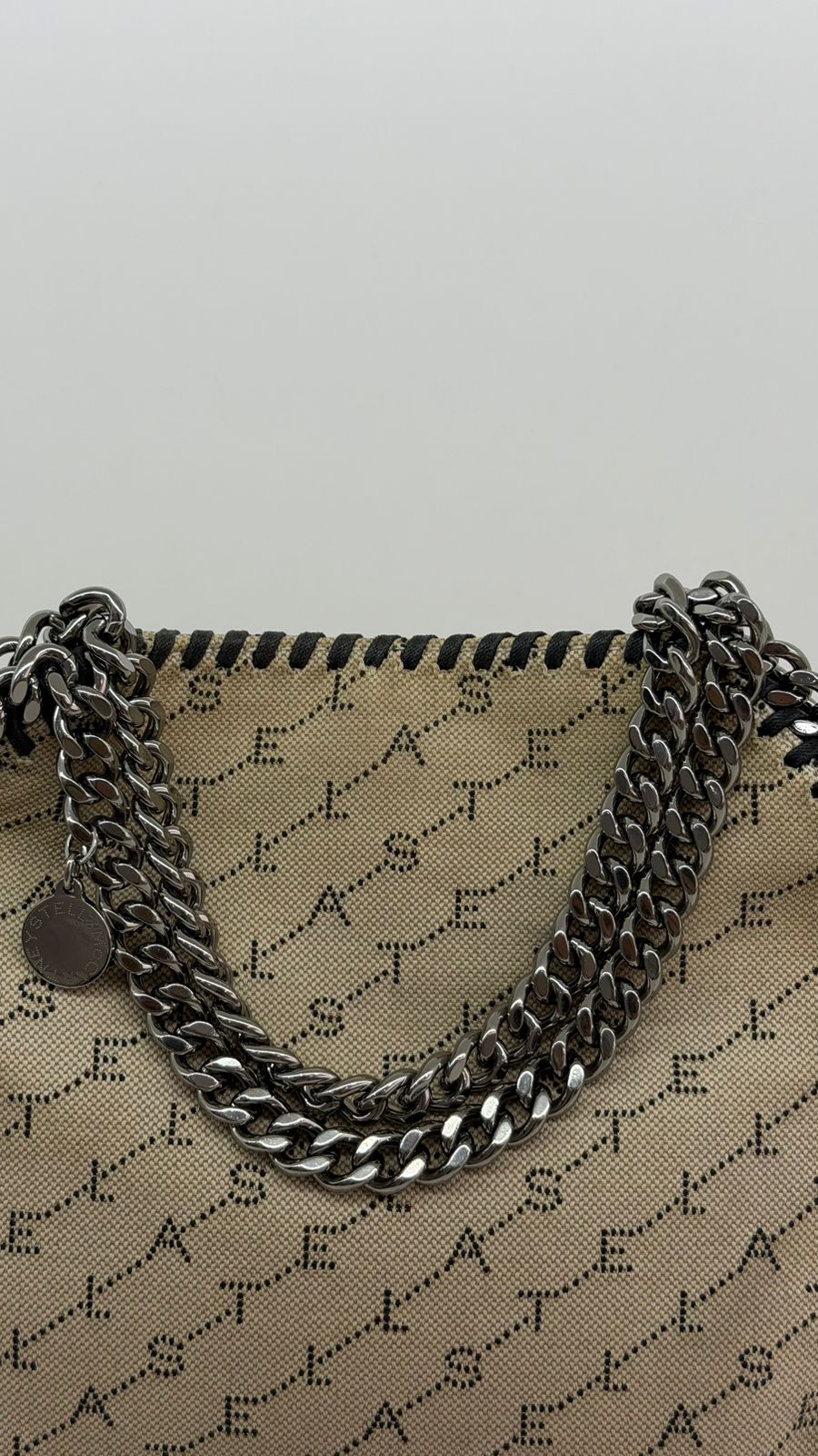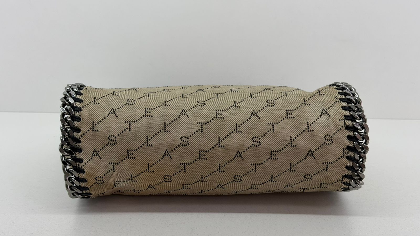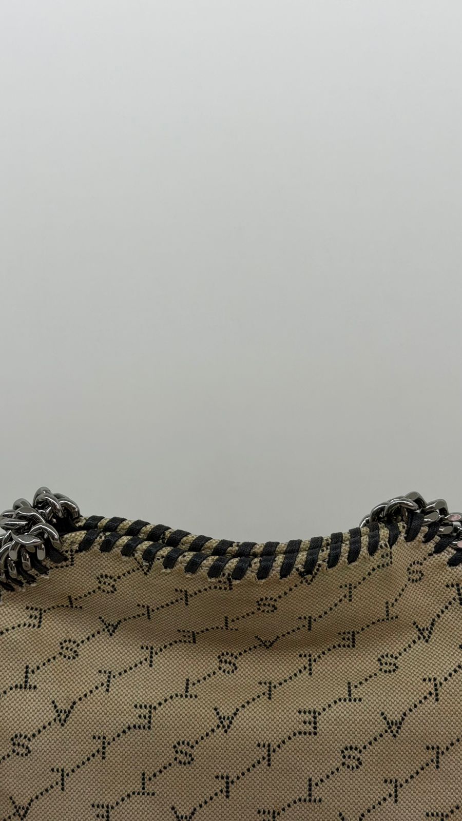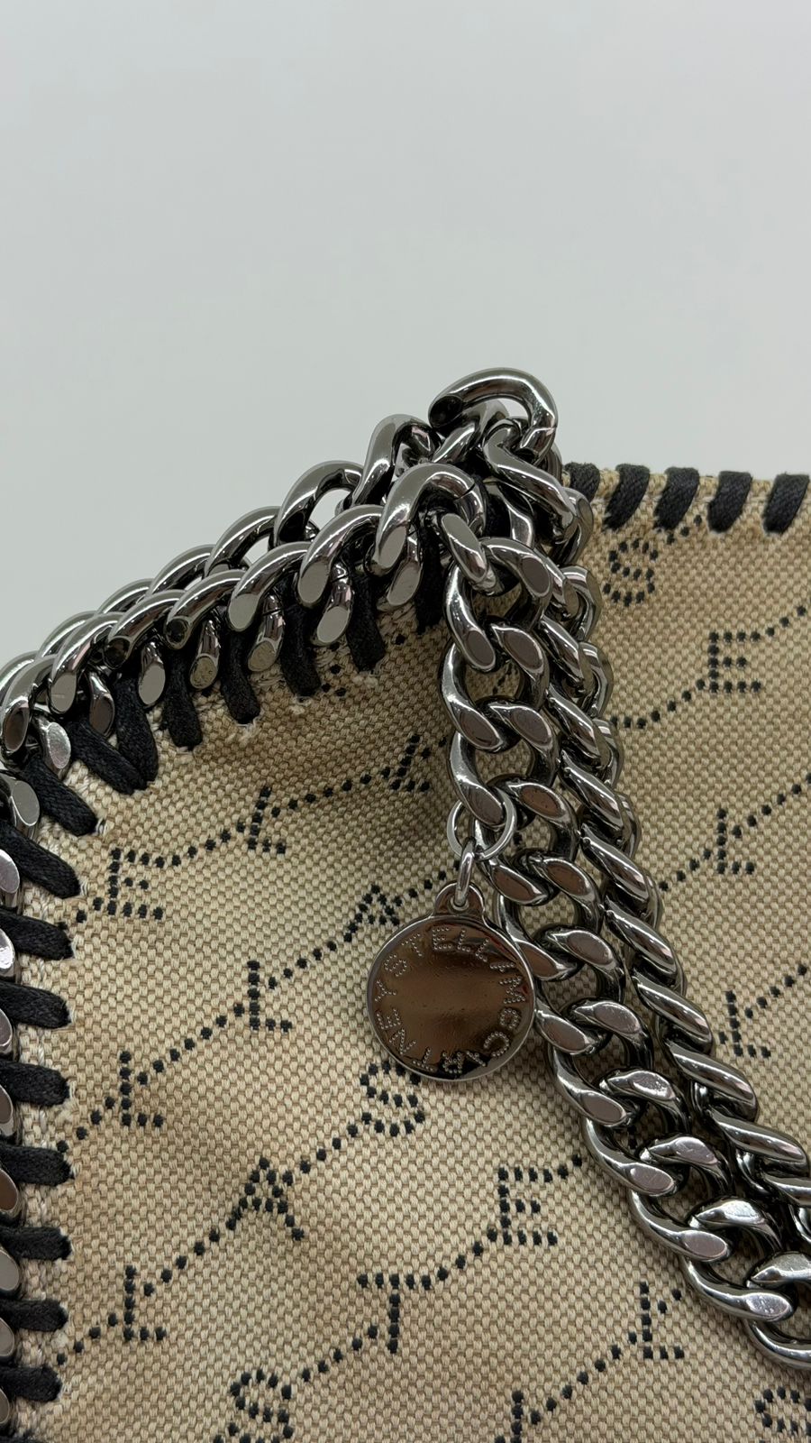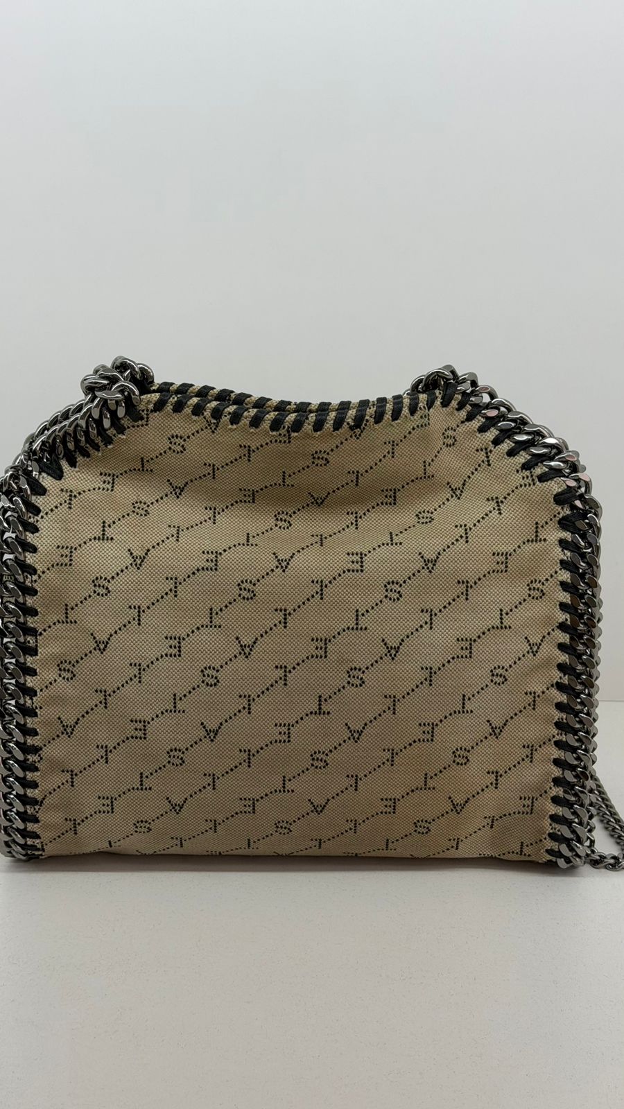 Bolsa Stella McCartney Falabella, confeccionada em tecido bege mongramado, com ferragens no prata envelhecido, possui alça dupla de ombro em correntes, acabamento em elos de correntes, possui tag em medalha com o nome da marca, compartimento interno possui compartimento único, apresenta forro em tecido, com um bolso com fecho em zíper, fecho principal por botão magnética. Uma bolsa elegante e moderna, modelo tote, as laterais são finalizada com uma corrente metálica robusta, que contorna toda a peça e se estende para formar as alças, garantindo um charme urbano e contemporâneo. Ideal para o dia a dia ou para compor produções mais elaboradas, a bolsa oferece espaço amplo para acomodar itens essenciais com praticidade , mantendo sempre a elegância.