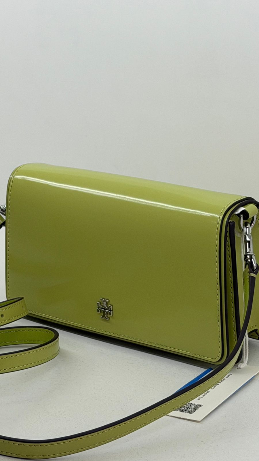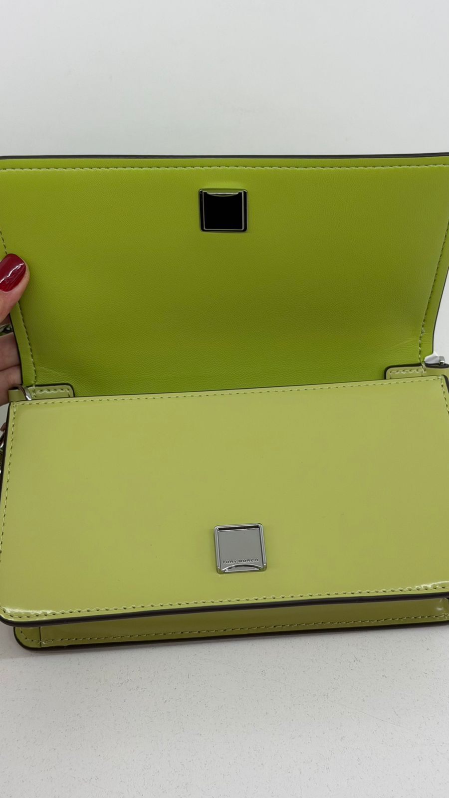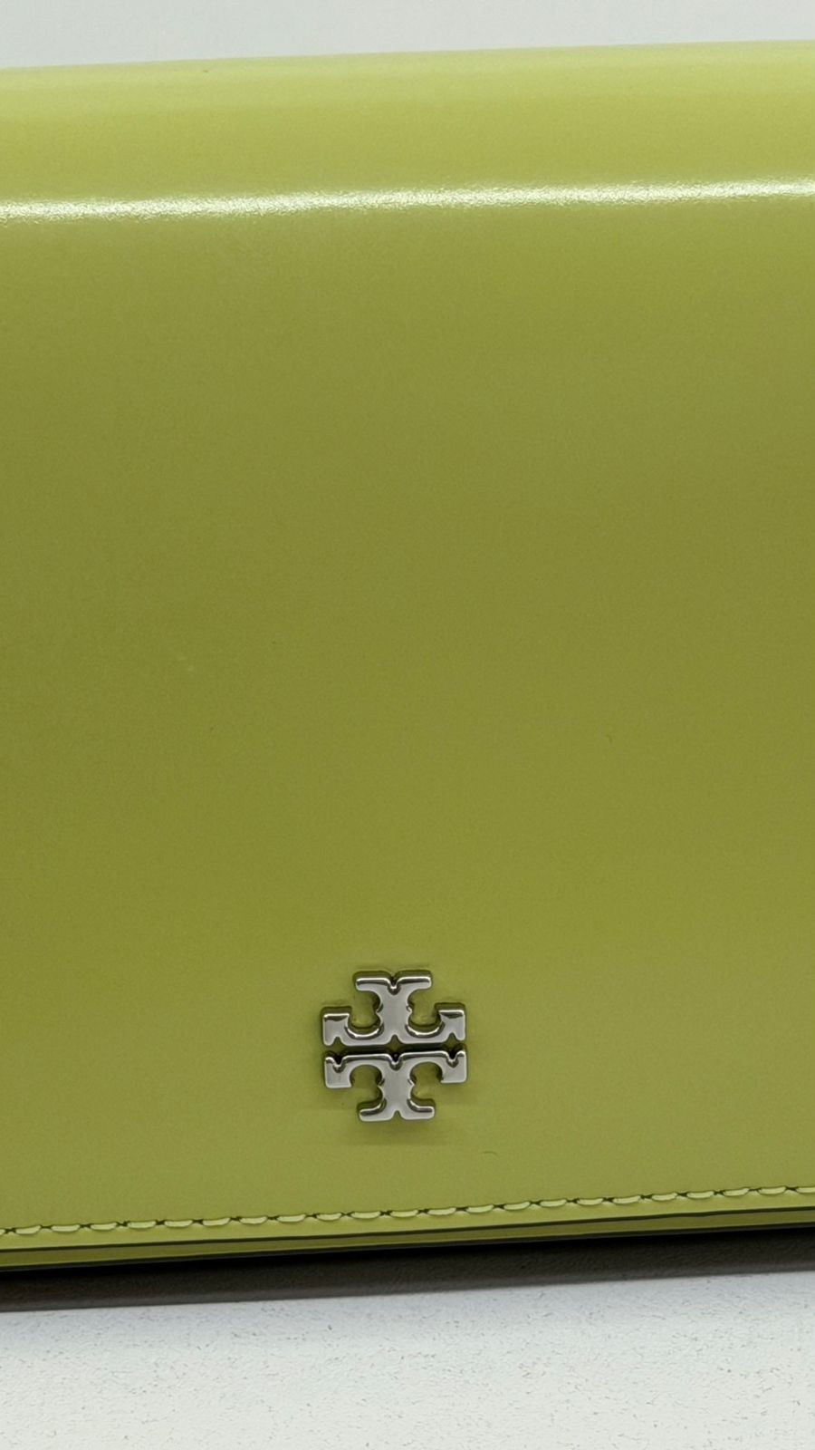 Bolsa Tory Burch Emerson Chain Wallet, confeccionada em couro verde, ferragens no prateado, fecho por aba flap com botão magnético, possui na aba flap símbolos de amuletos da sorte em metal, possui alça removível em couro que pode ser usada no ombro, transversal ou de mão, com compartimento interno único, com um bolso plano, forro em tecido. Uma bolsa casual para dar mais vida seu look.