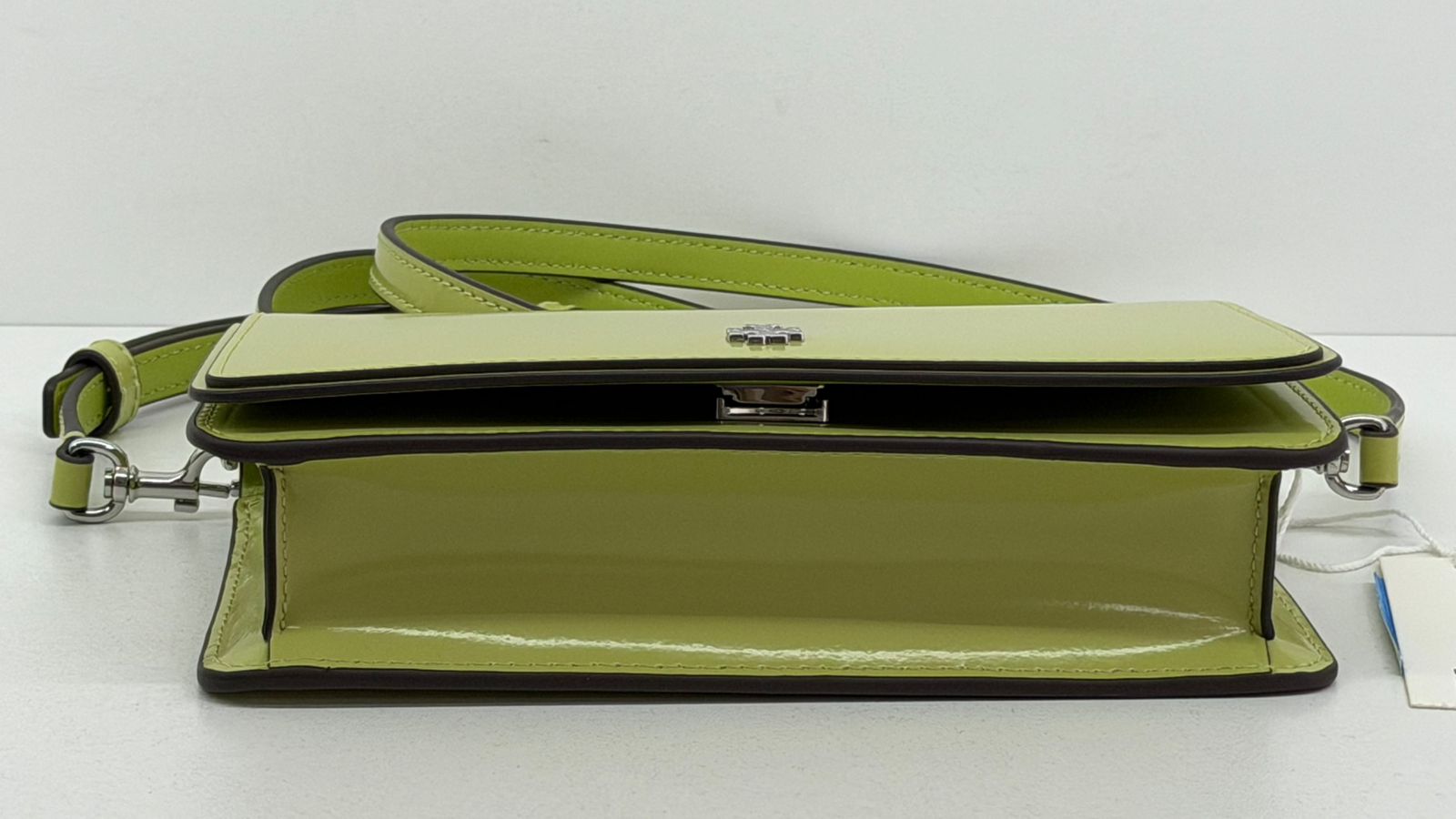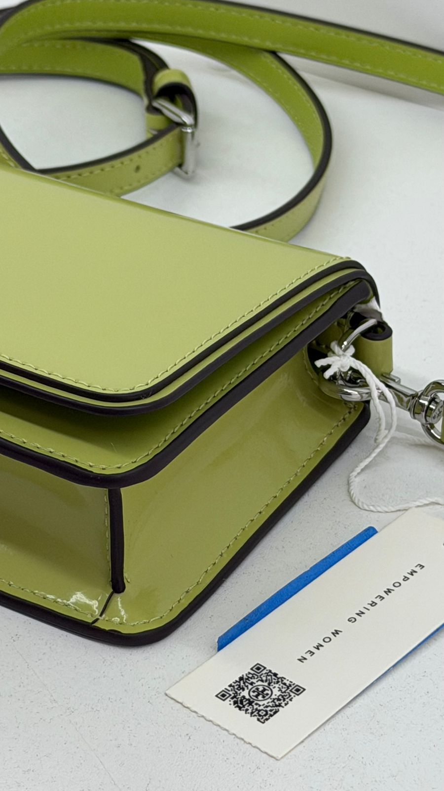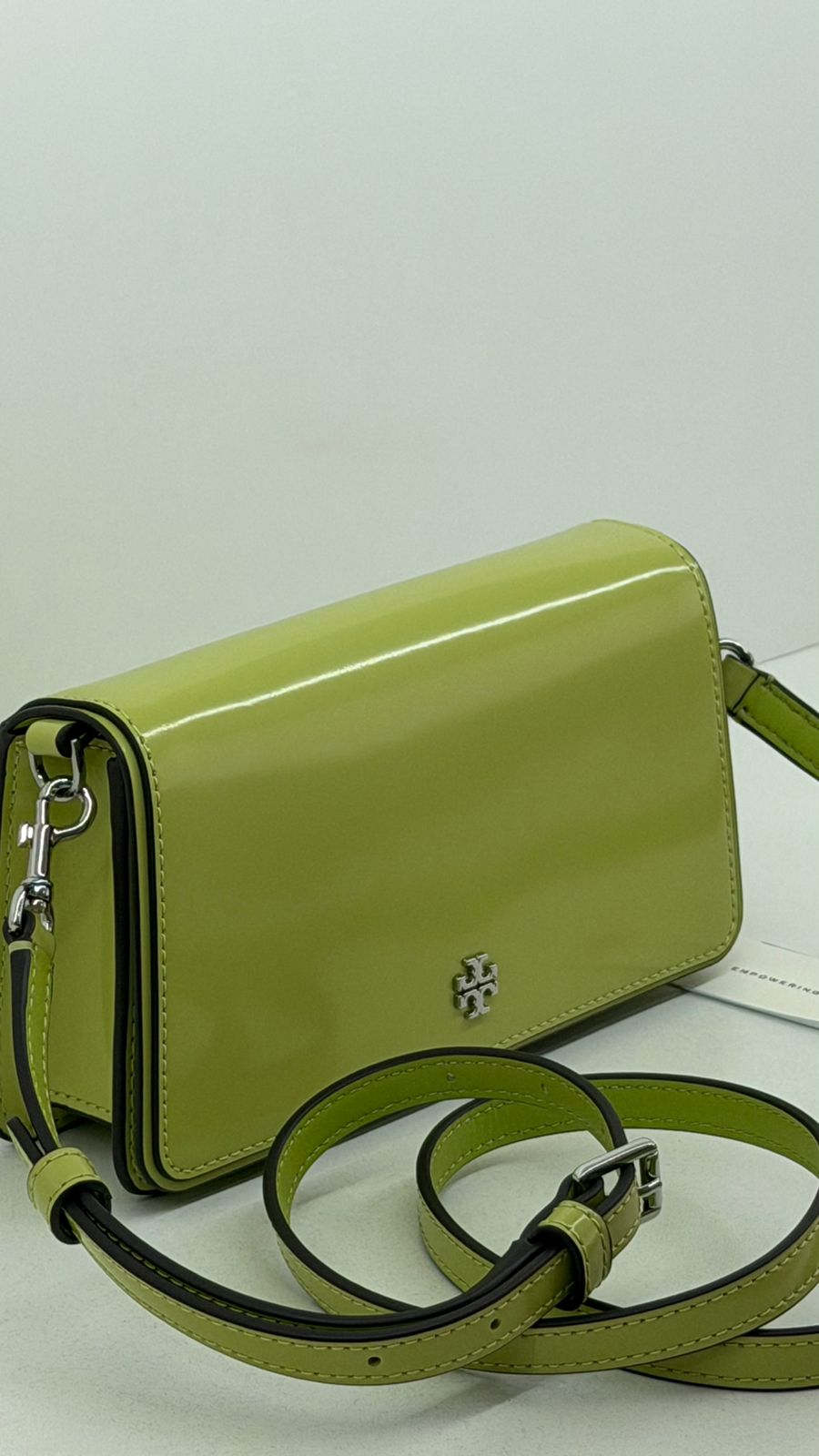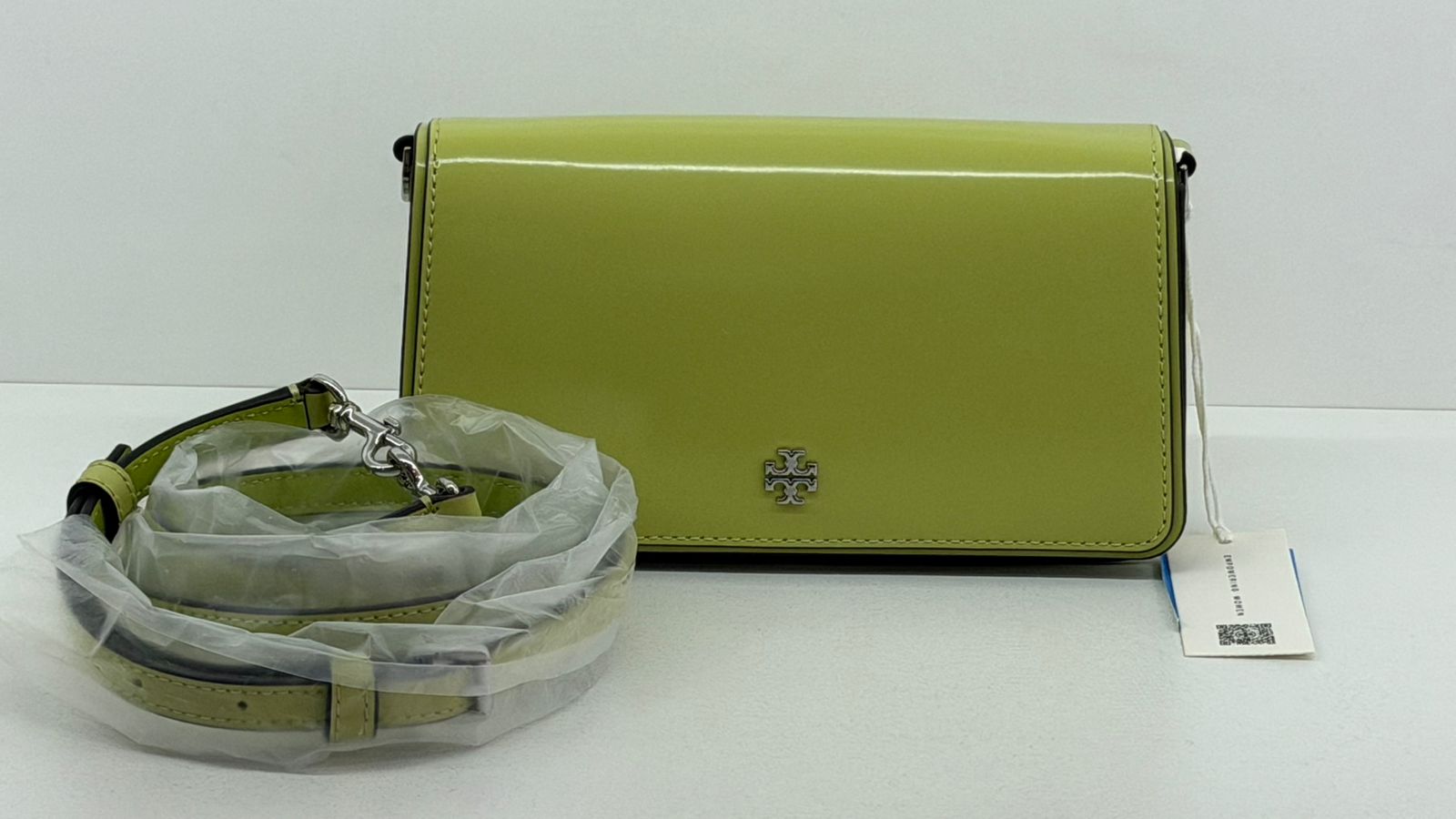 Bolsa Tory Burch Emerson Chain Wallet, confeccionada em couro verde, ferragens no prateado, fecho por aba flap com botão magnético, possui na aba flap símbolos de amuletos da sorte em metal, possui alça removível em couro que pode ser usada no ombro, transversal ou de mão, com compartimento interno único, com um bolso plano, forro em tecido. Uma bolsa casual para dar mais vida seu look.