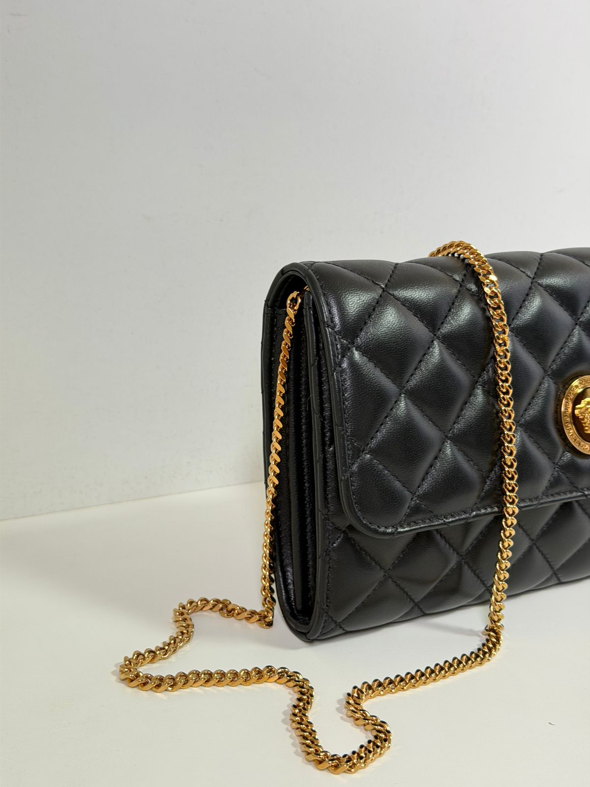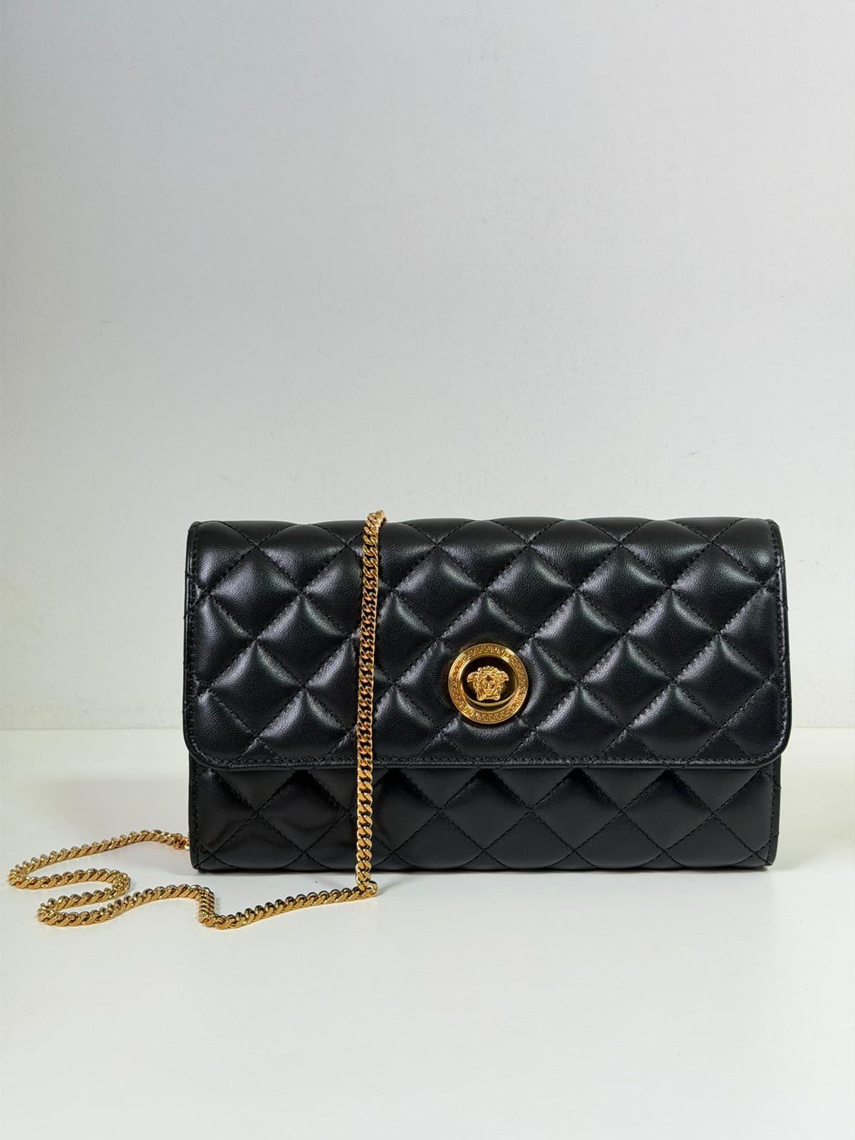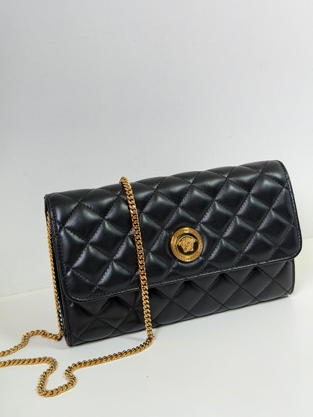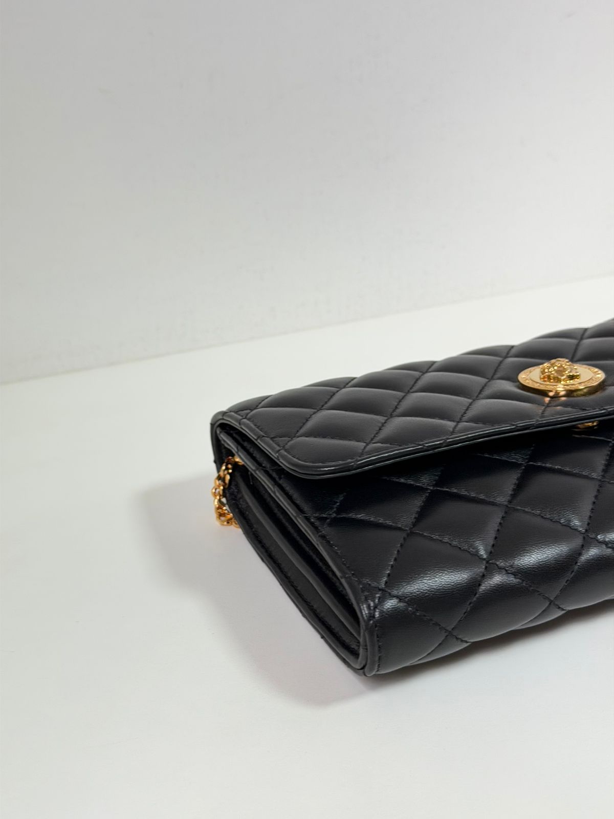 Bolsa Versace Medusa Chain, confeccionado no couro preto no matelassê em padrão geométrico, ferragens no dourado, o modelo traz em destaque o medalhão dourado com a cabeça de Meduza, símbolo inconfundível da marca, alça longa em corrente, possui compartimento interno duplo, separado por um bolso com fecho em zíper, possui espaço para cartões. Uma peça clássica que traduz sofisticação atemporal, uma escolha perfeita para quem busca elegância com personalidade.