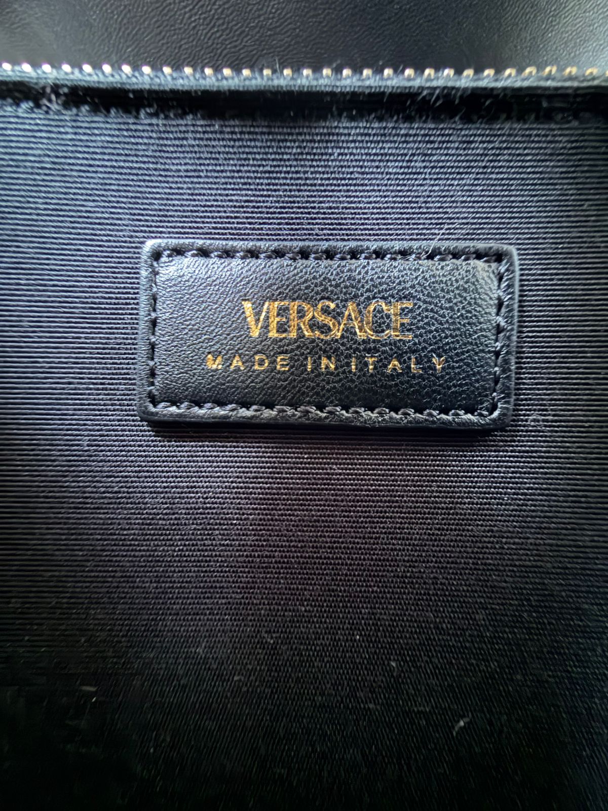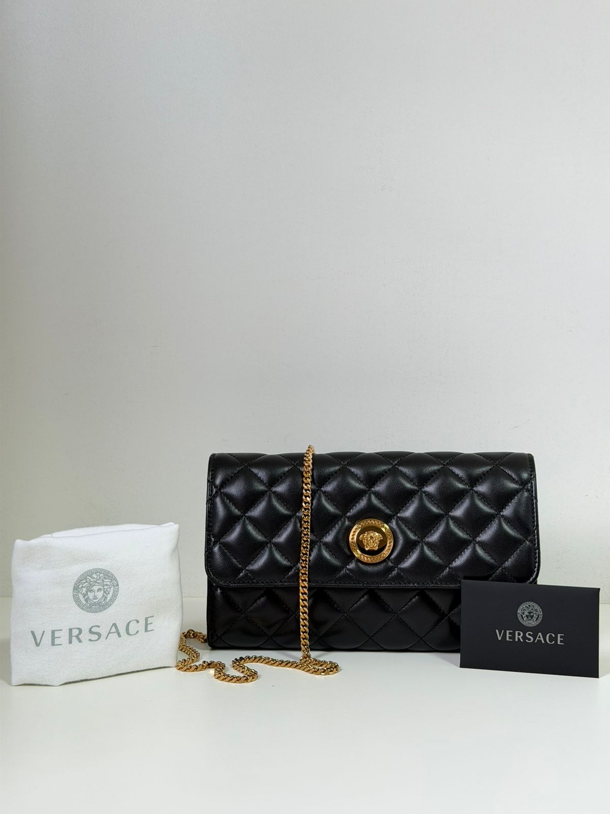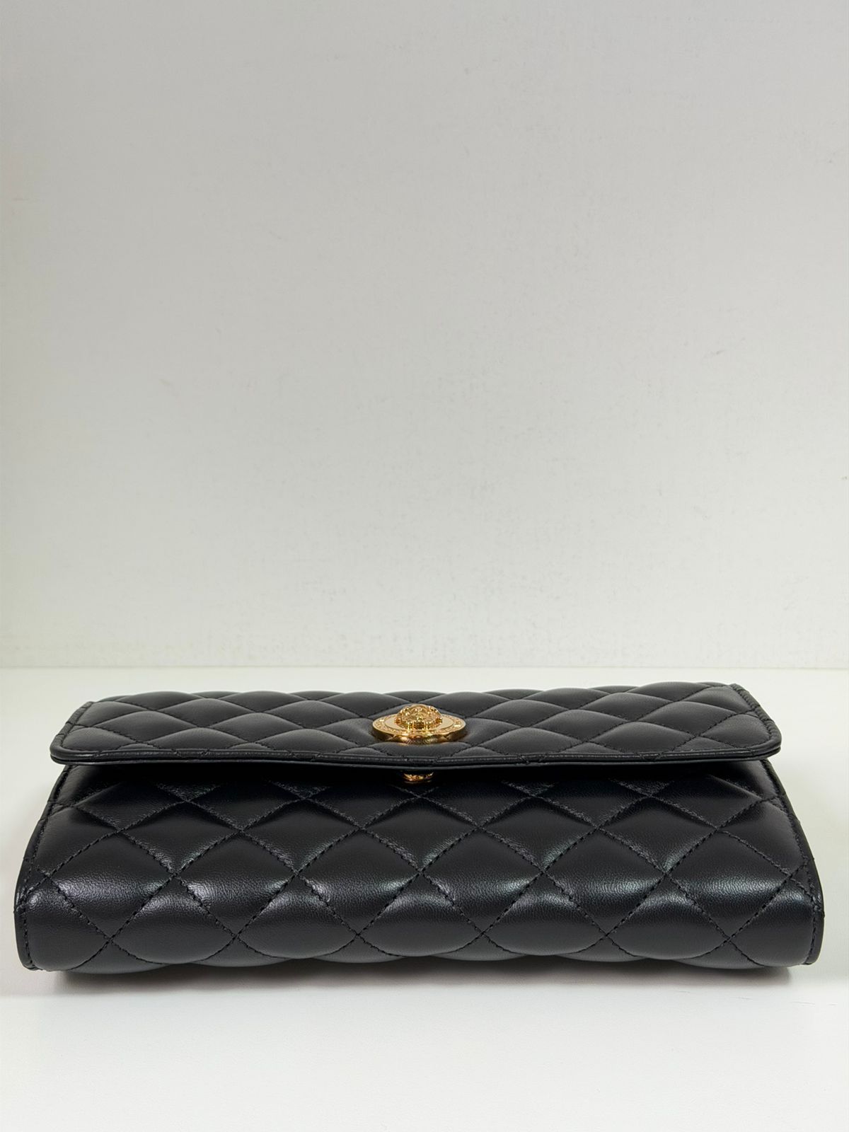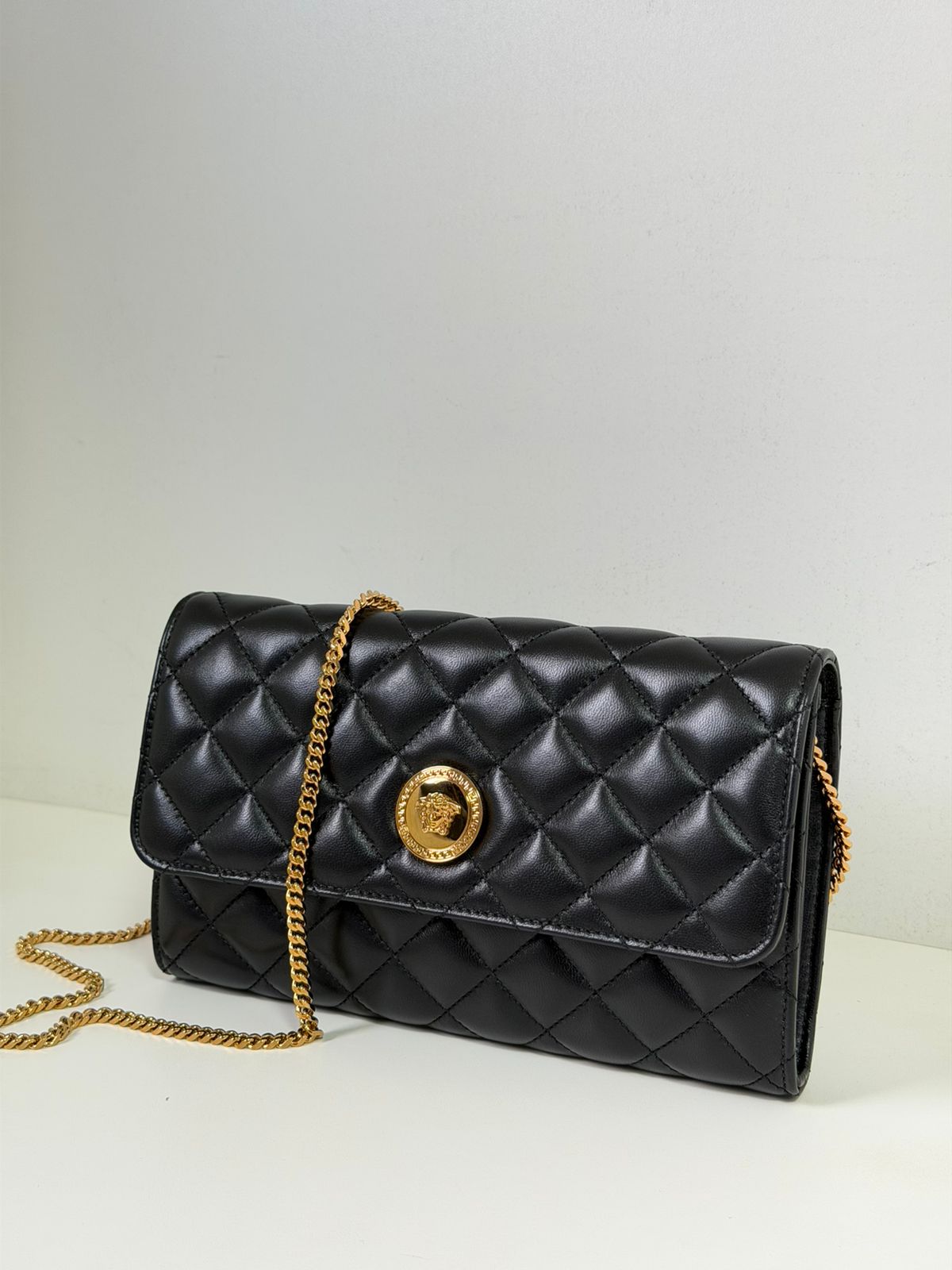 Bolsa Versace Medusa Chain, confeccionado no couro preto no matelassê em padrão geométrico, ferragens no dourado, o modelo traz em destaque o medalhão dourado com a cabeça de Meduza, símbolo inconfundível da marca, alça longa em corrente, possui compartimento interno duplo, separado por um bolso com fecho em zíper, possui espaço para cartões. Uma peça clássica que traduz sofisticação atemporal, uma escolha perfeita para quem busca elegância com personalidade.