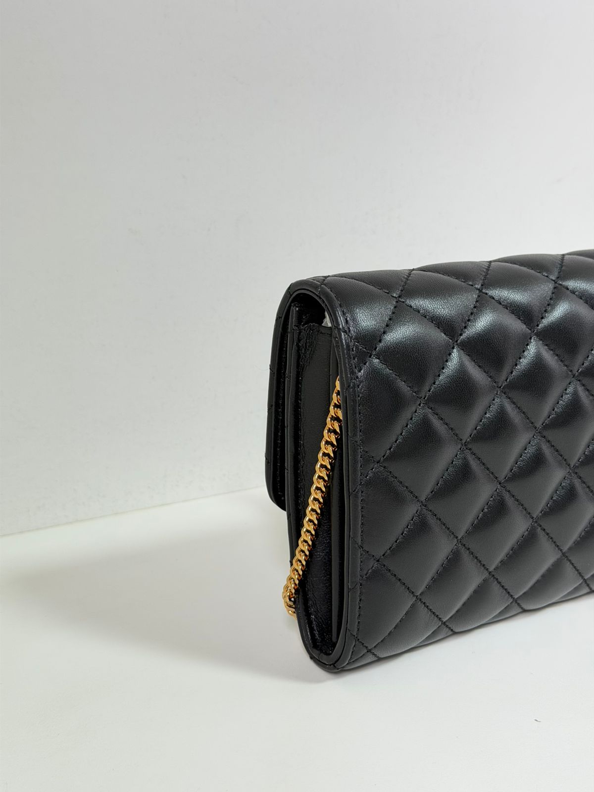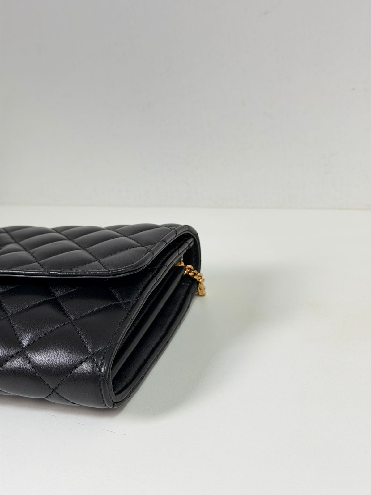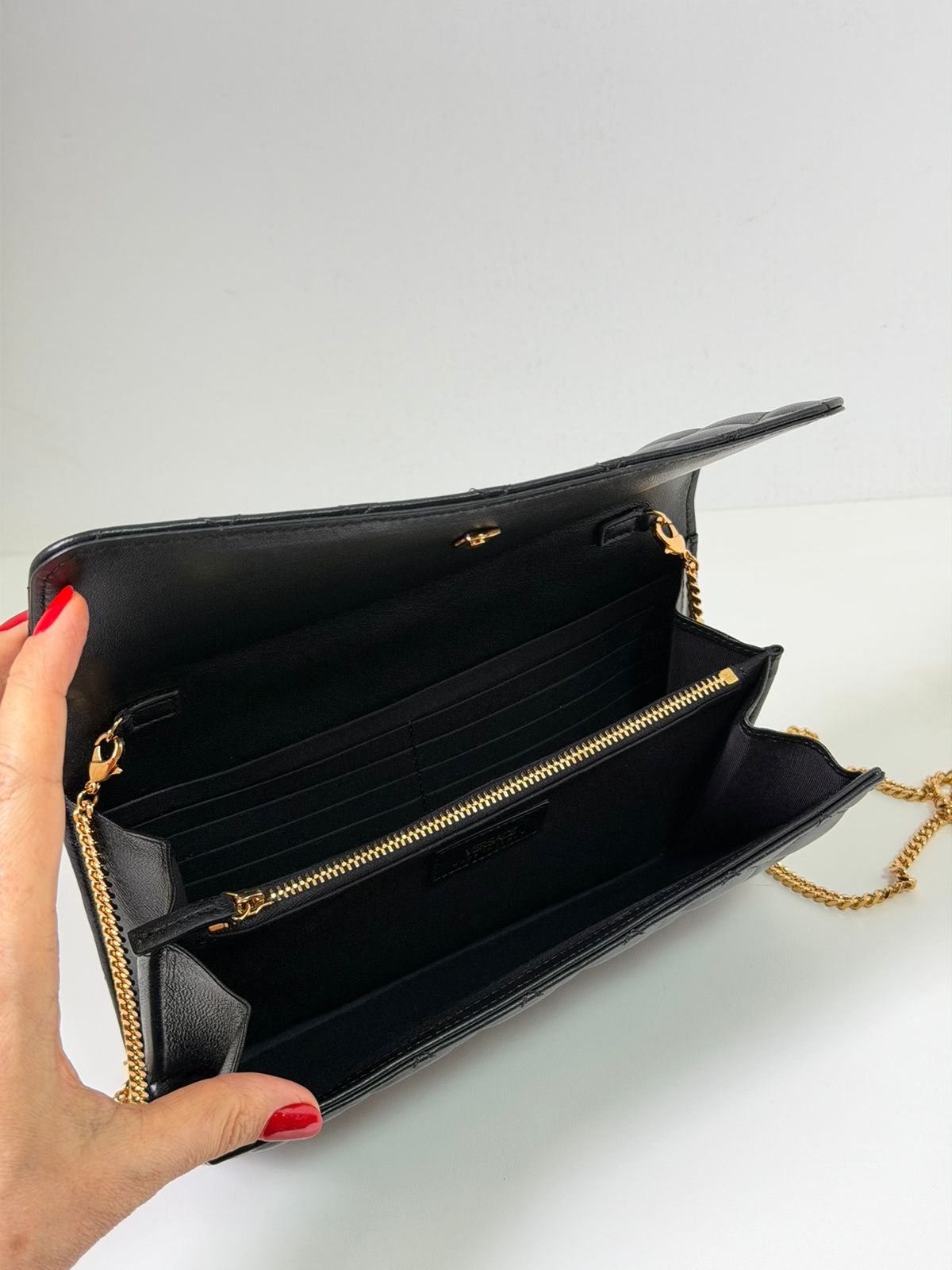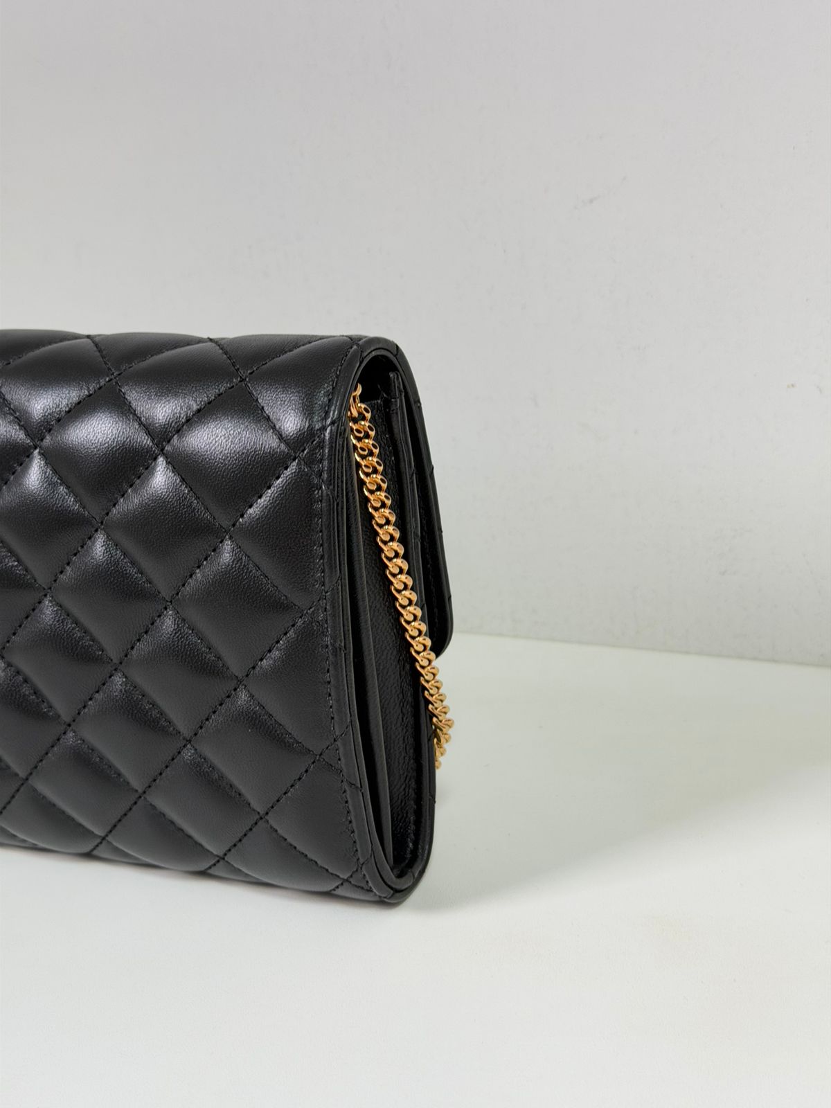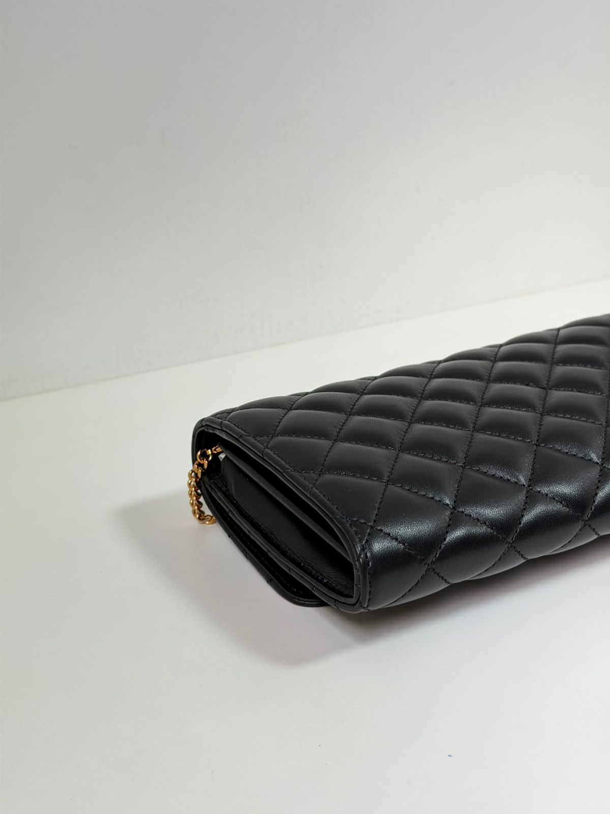 Bolsa Versace Medusa Chain, confeccionado no couro preto no matelassê em padrão geométrico, ferragens no dourado, o modelo traz em destaque o medalhão dourado com a cabeça de Meduza, símbolo inconfundível da marca, alça longa em corrente, possui compartimento interno duplo, separado por um bolso com fecho em zíper, possui espaço para cartões. Uma peça clássica que traduz sofisticação atemporal, uma escolha perfeita para quem busca elegância com personalidade.