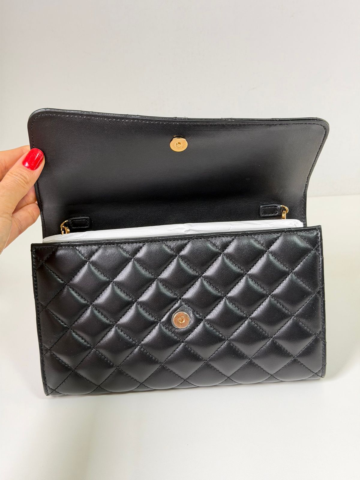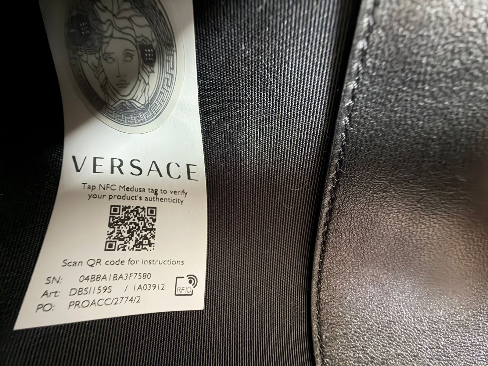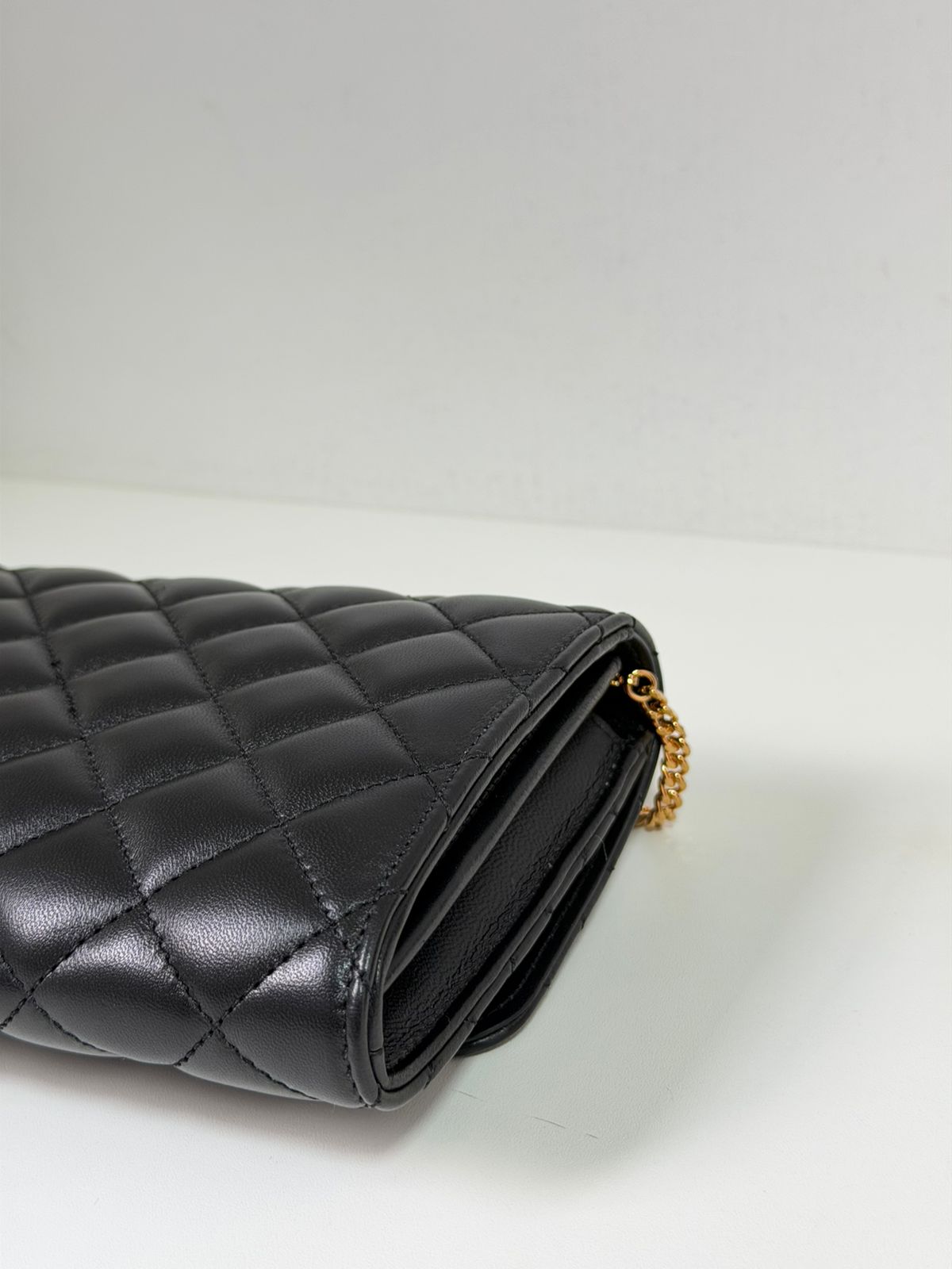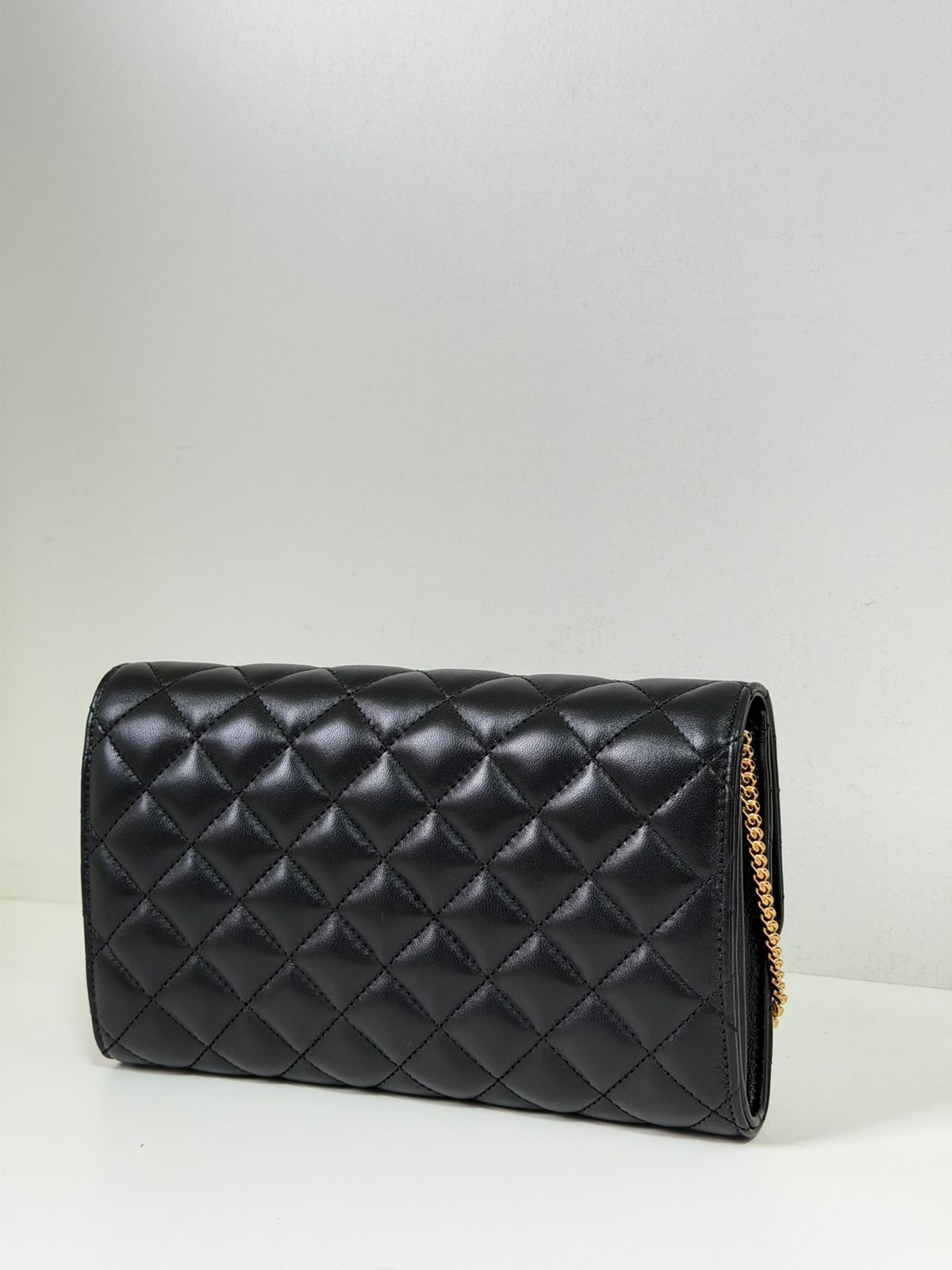 Bolsa Versace Medusa Chain, confeccionado no couro preto no matelassê em padrão geométrico, ferragens no dourado, o modelo traz em destaque o medalhão dourado com a cabeça de Meduza, símbolo inconfundível da marca, alça longa em corrente, possui compartimento interno duplo, separado por um bolso com fecho em zíper, possui espaço para cartões. Uma peça clássica que traduz sofisticação atemporal, uma escolha perfeita para quem busca elegância com personalidade.