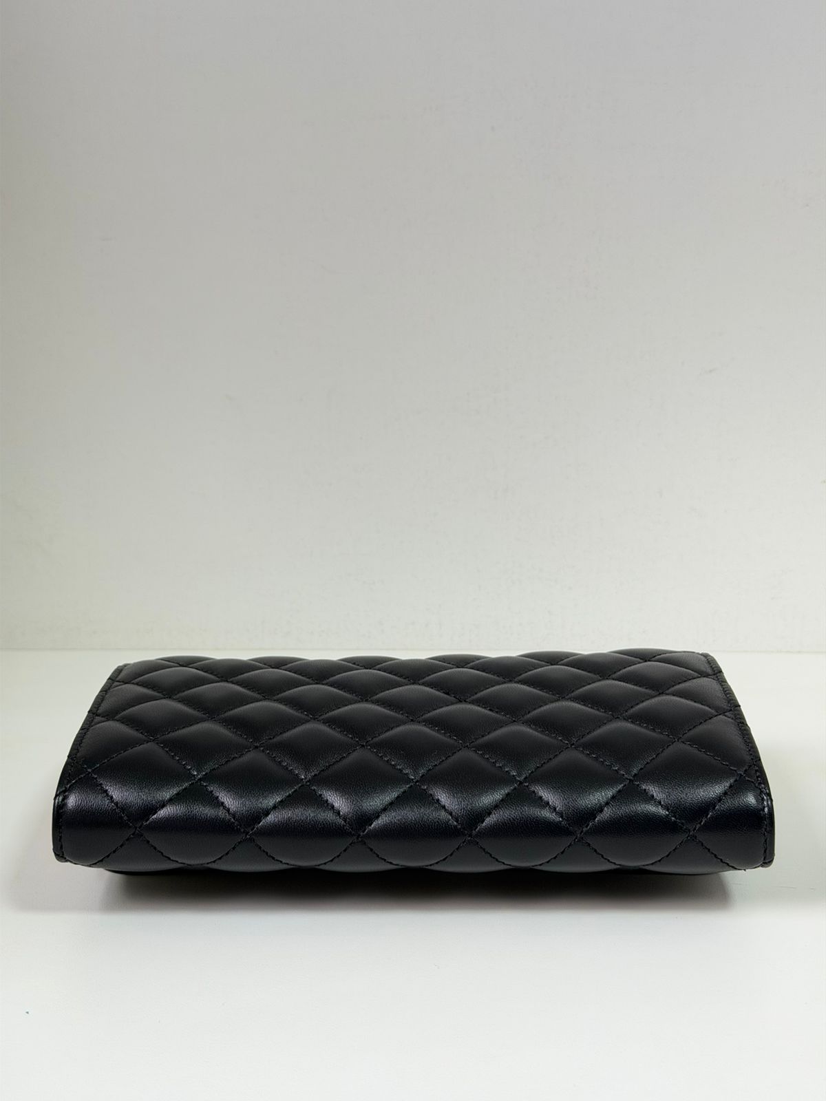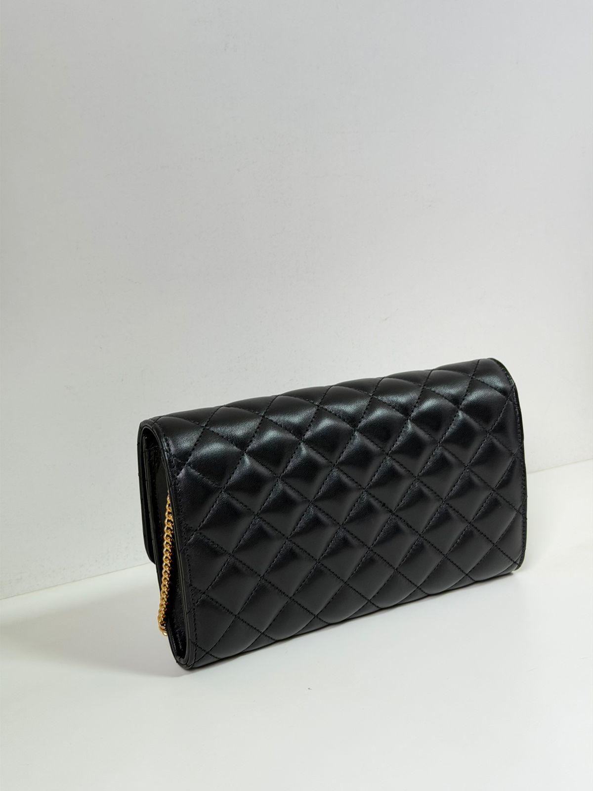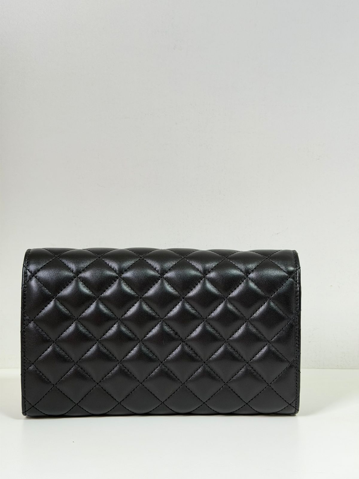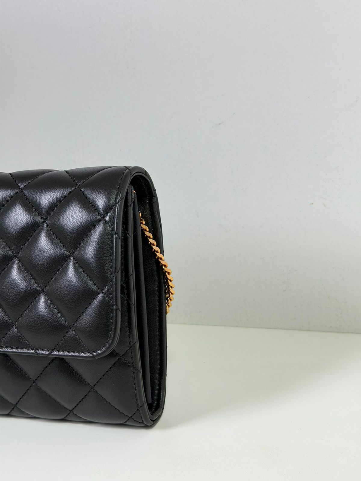 Bolsa Versace Medusa Chain, confeccionado no couro preto no matelassê em padrão geométrico, ferragens no dourado, o modelo traz em destaque o medalhão dourado com a cabeça de Meduza, símbolo inconfundível da marca, alça longa em corrente, possui compartimento interno duplo, separado por um bolso com fecho em zíper, possui espaço para cartões. Uma peça clássica que traduz sofisticação atemporal, uma escolha perfeita para quem busca elegância com personalidade.