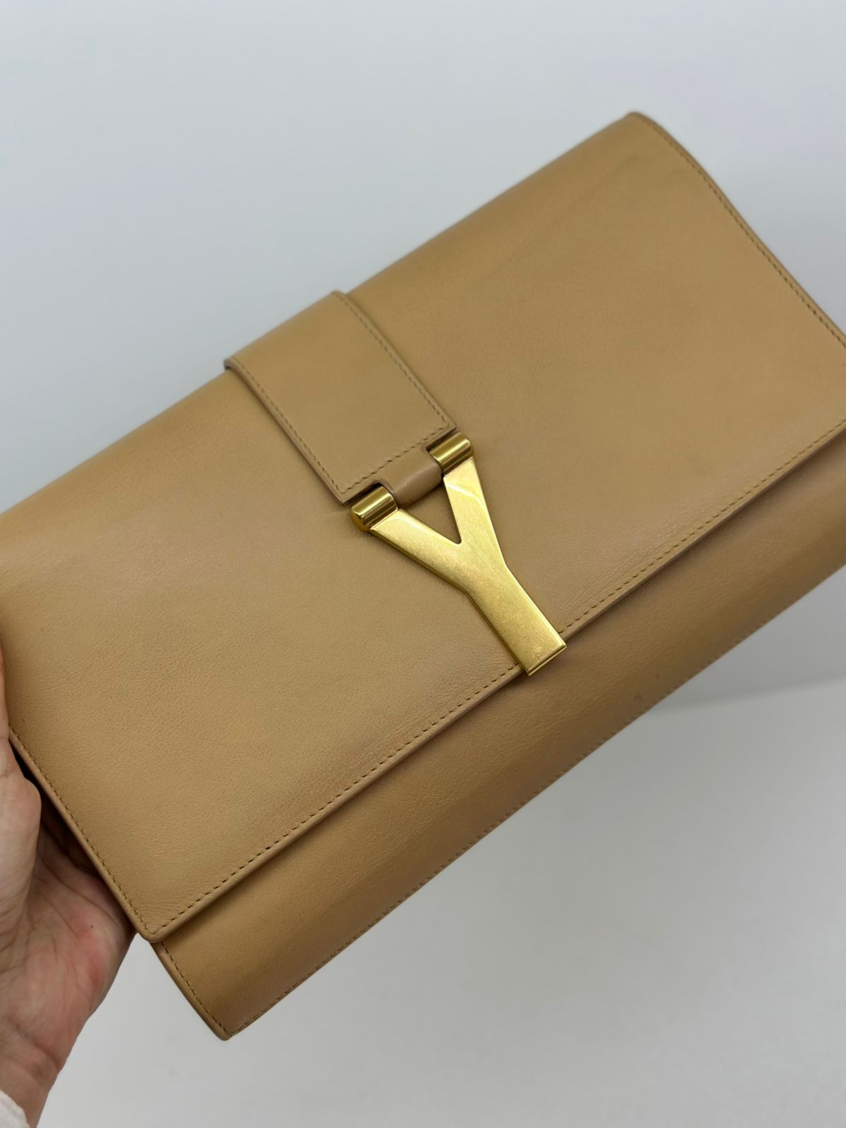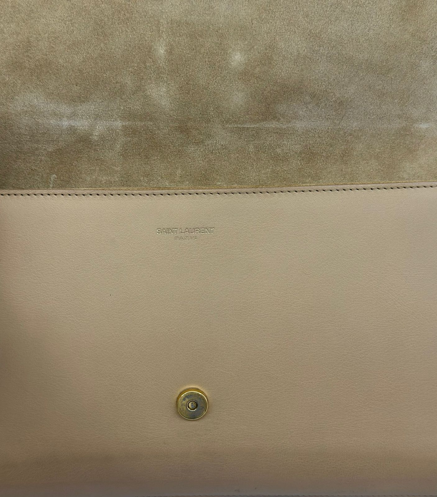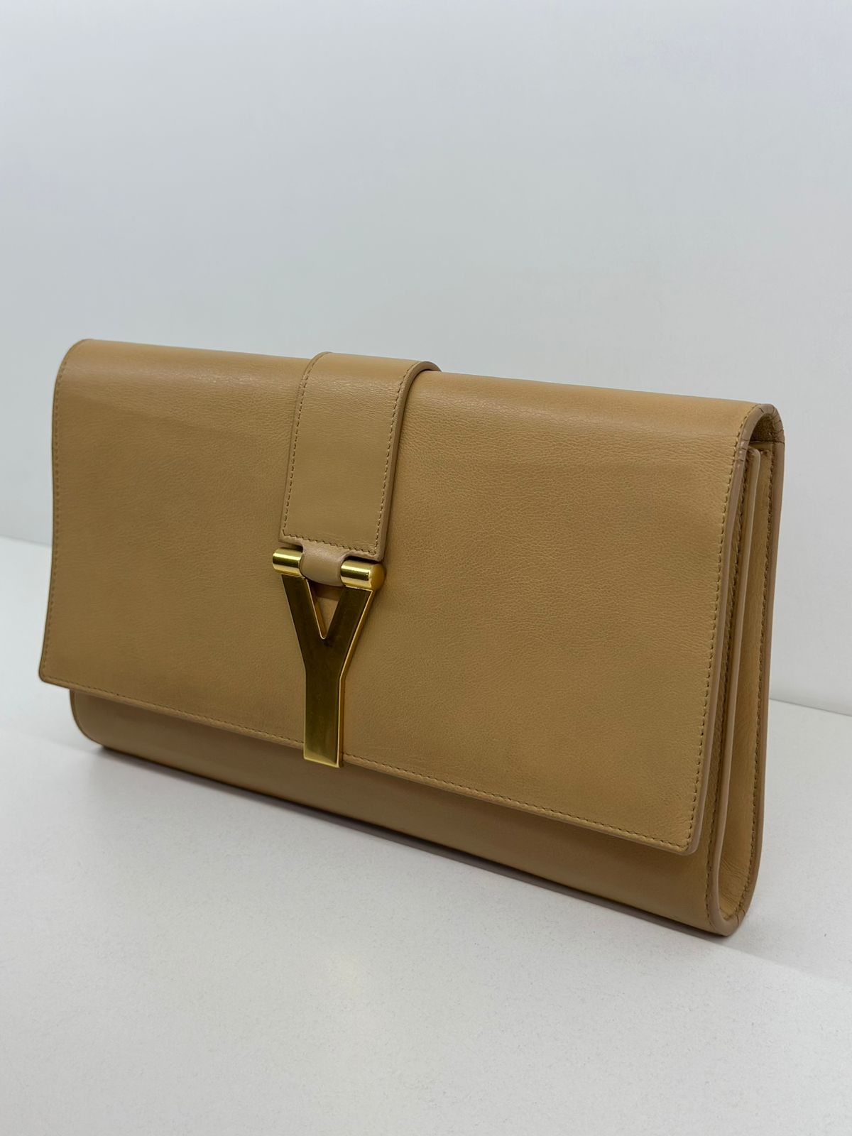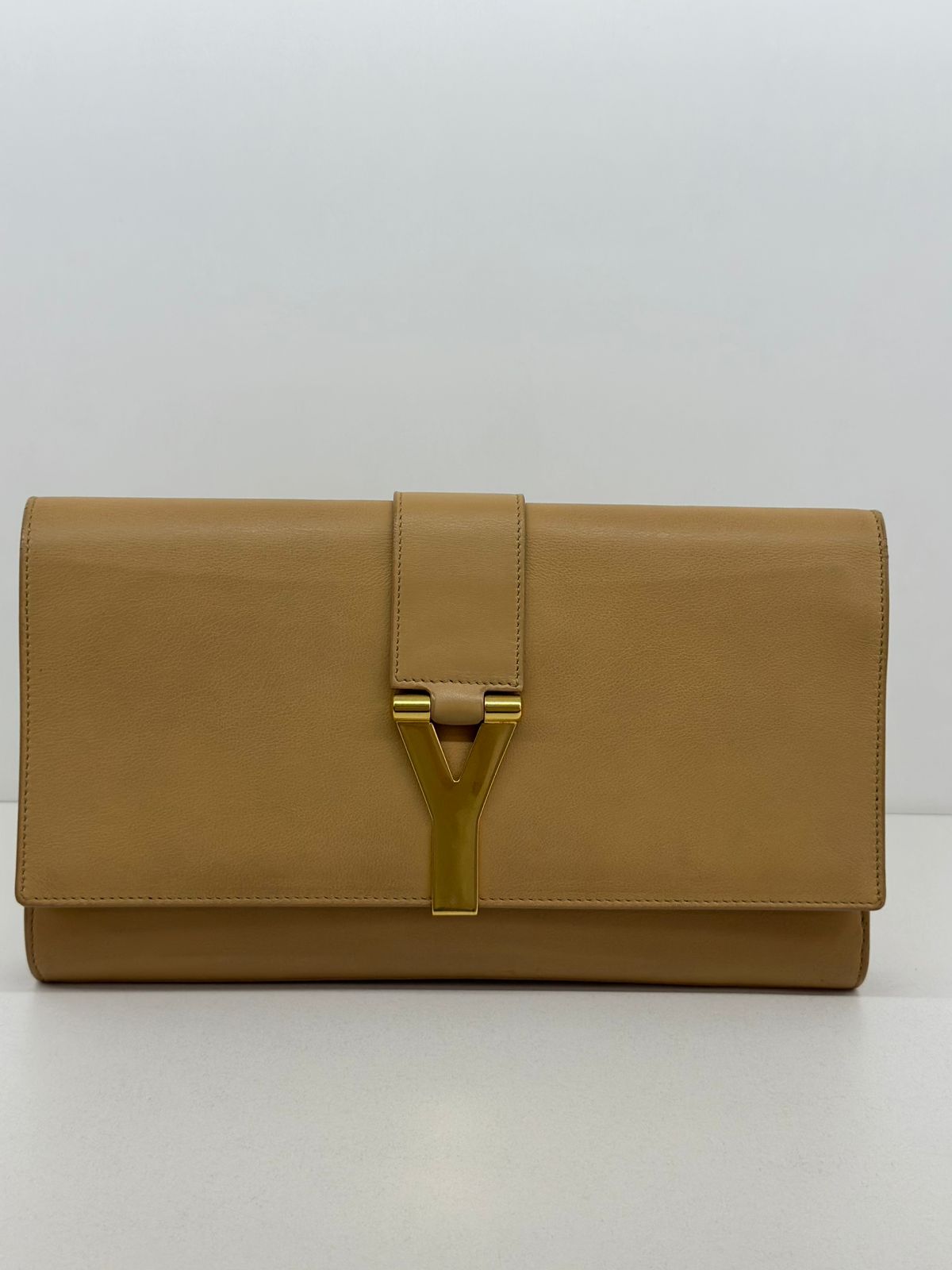 Clutch Yves Saint Laurent, confeccionada em couro bege, forro na camurça bege, ferragens douradas, símbolo da grife na parte frontal, interior possui compartimento único, com um bolso interno, fechamento no botão magnético.