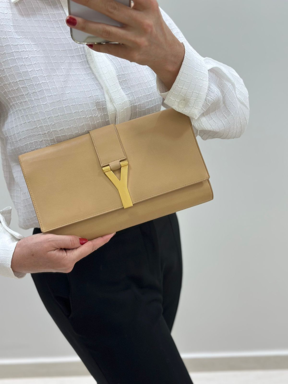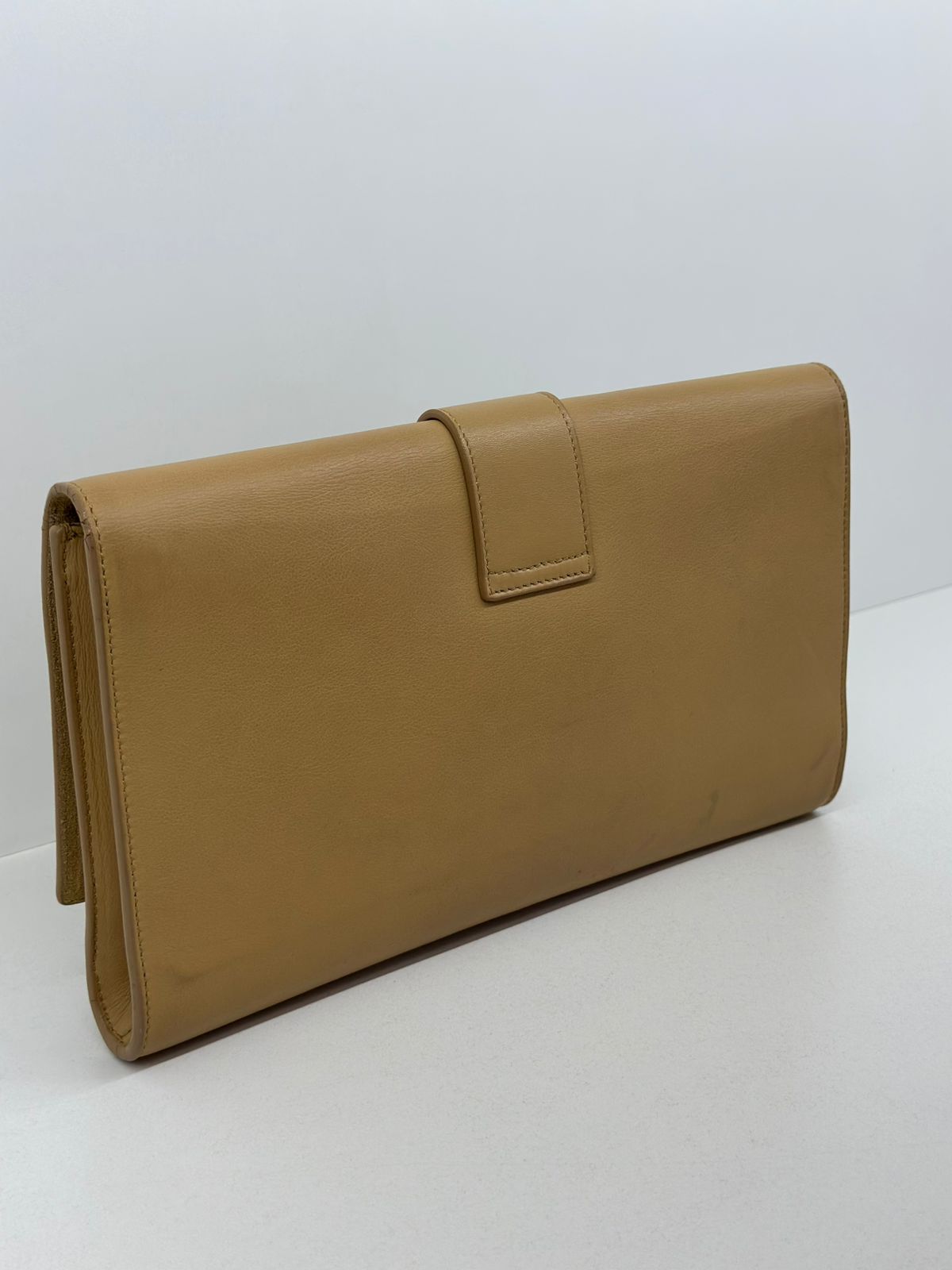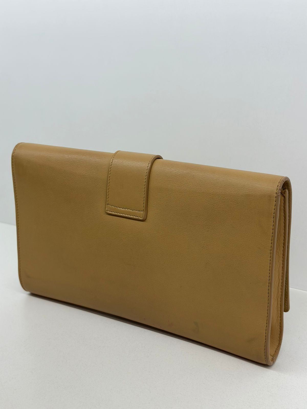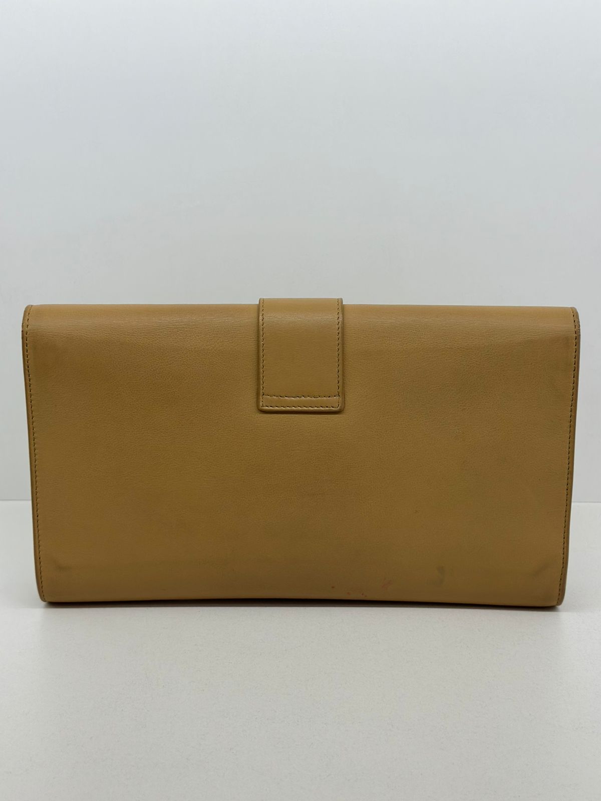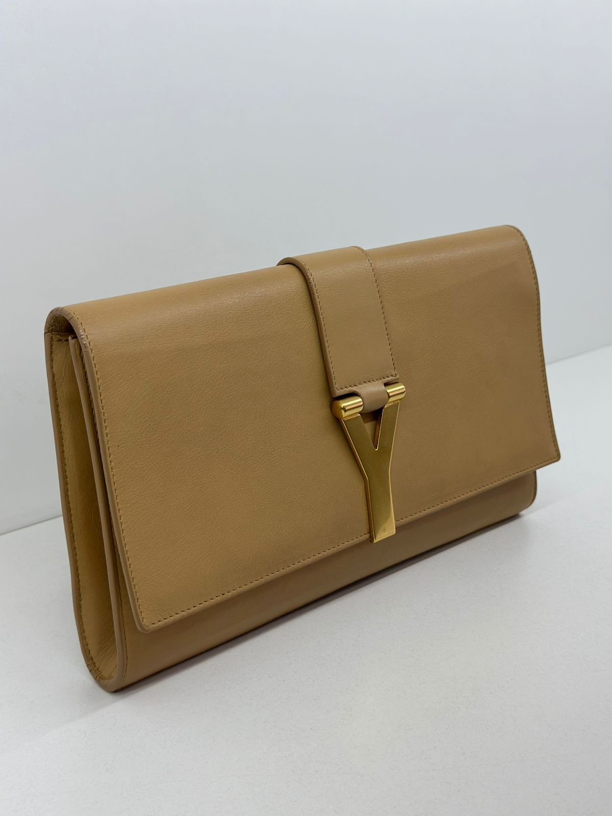 Clutch Yves Saint Laurent, confeccionada em couro bege, forro na camurça bege, ferragens douradas, símbolo da grife na parte frontal, interior possui compartimento único, com um bolso interno, fechamento no botão magnético.