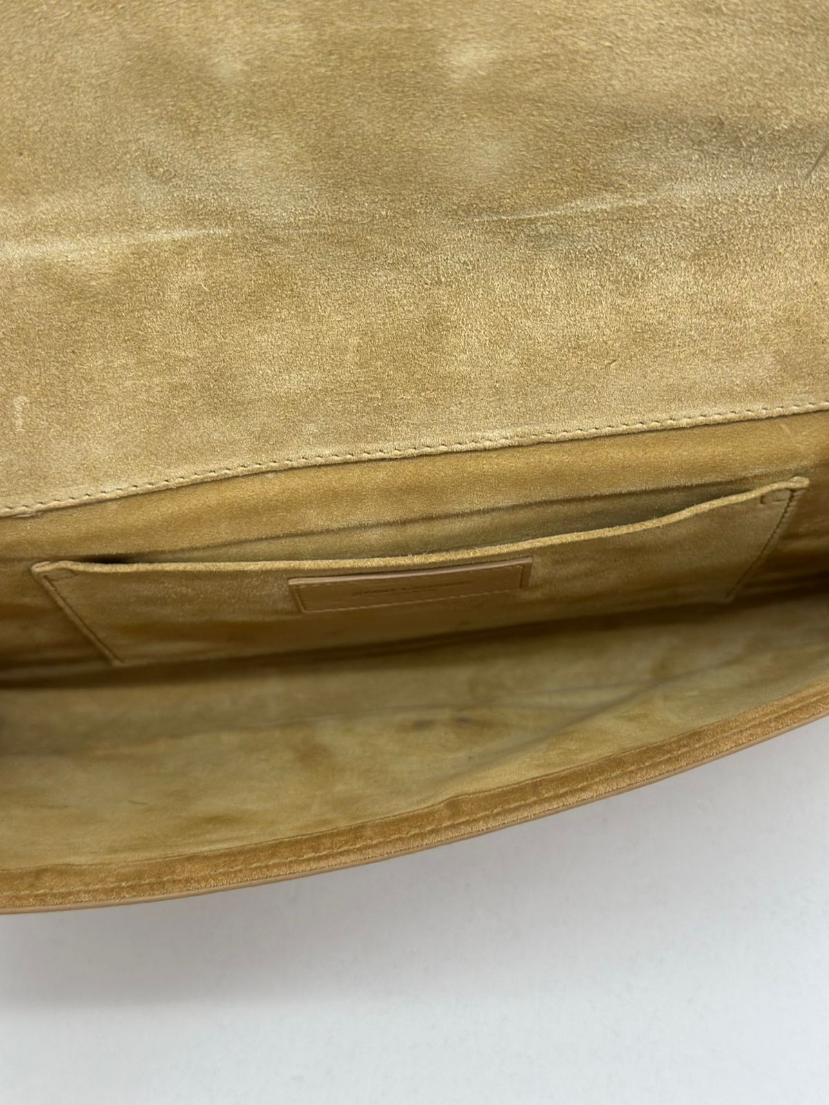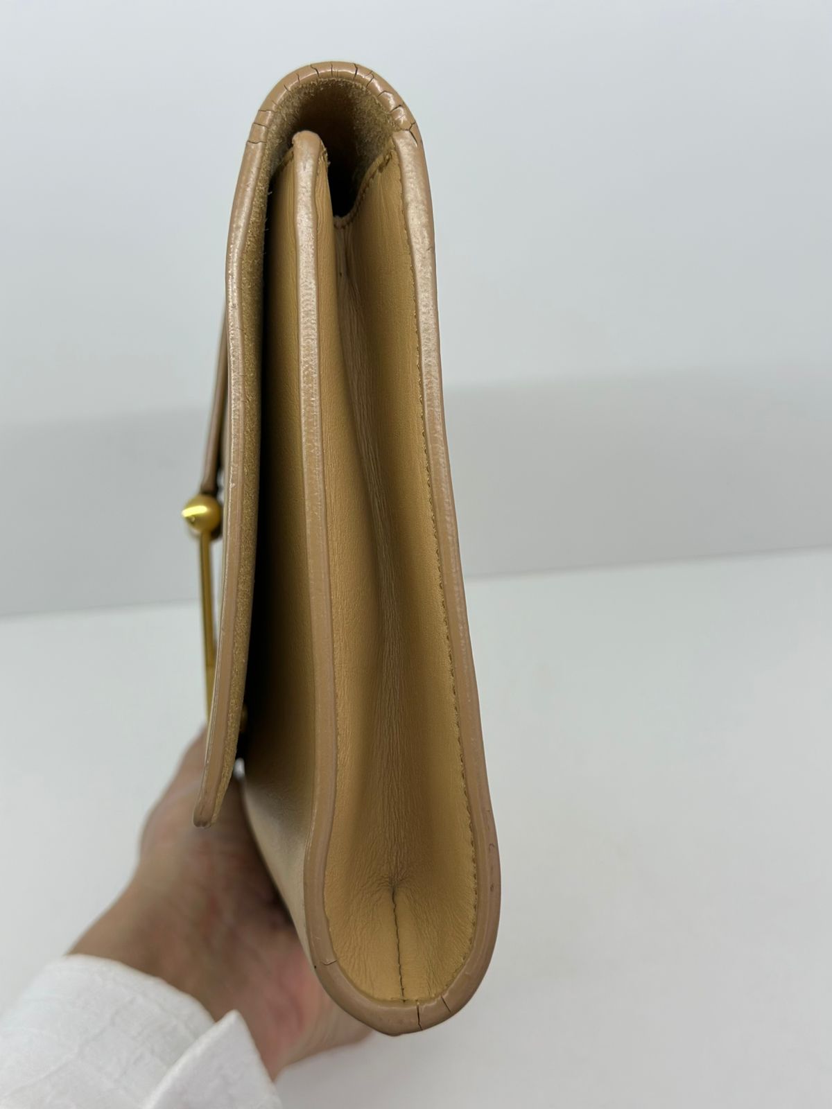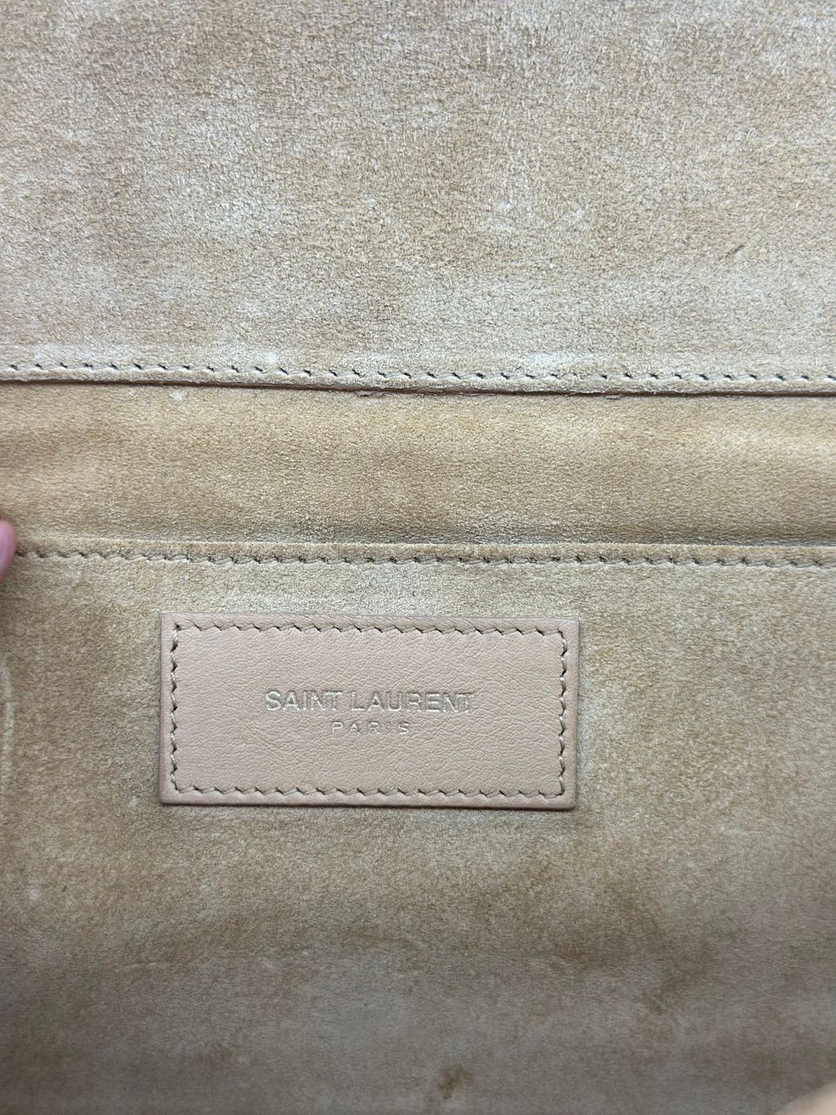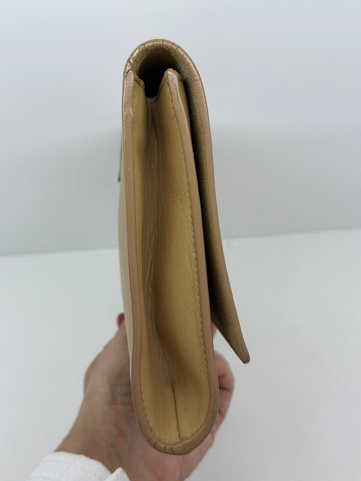 Clutch Yves Saint Laurent, confeccionada em couro bege, forro na camurça bege, ferragens douradas, símbolo da grife na parte frontal, interior possui compartimento único, com um bolso interno, fechamento no botão magnético.