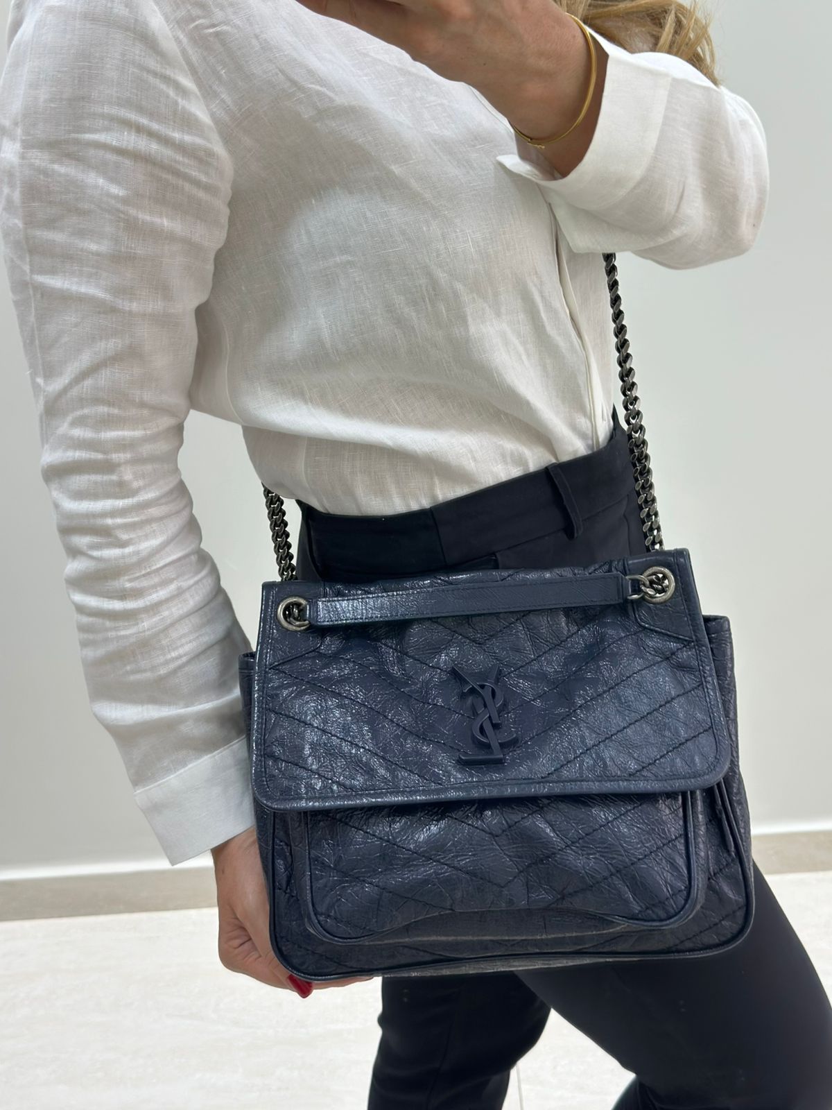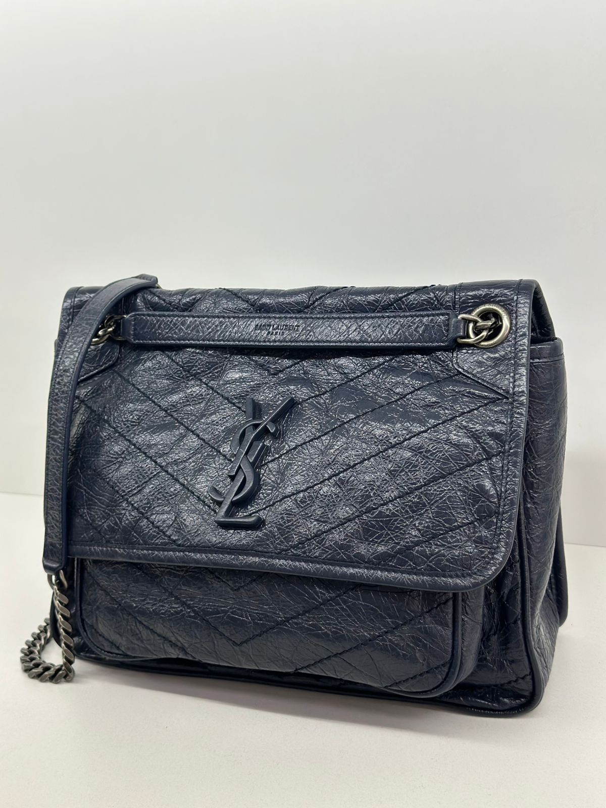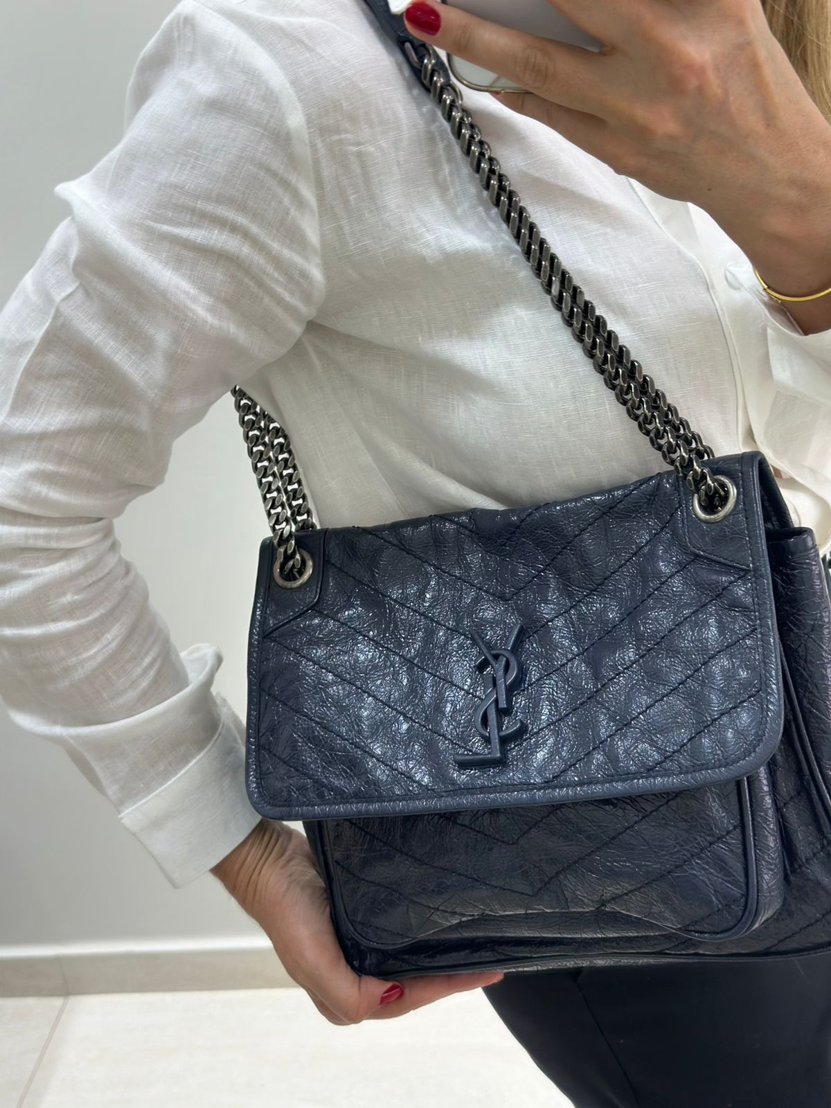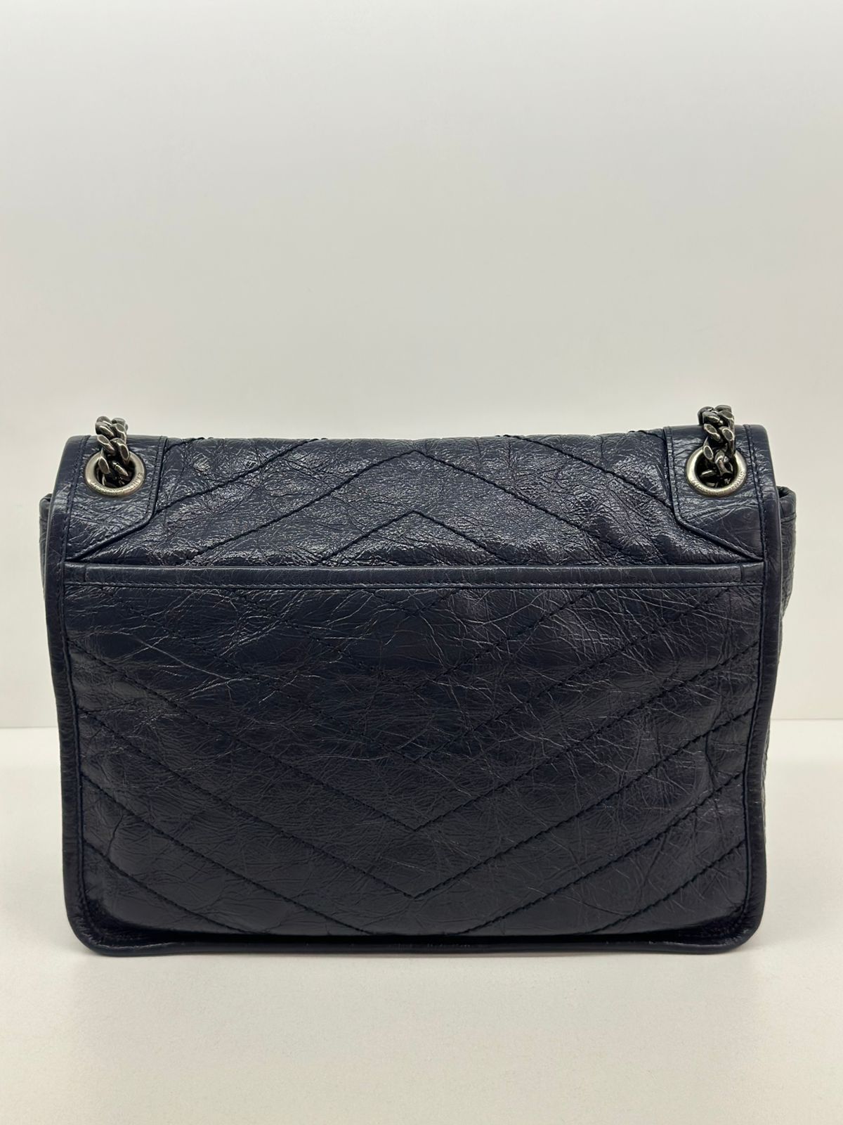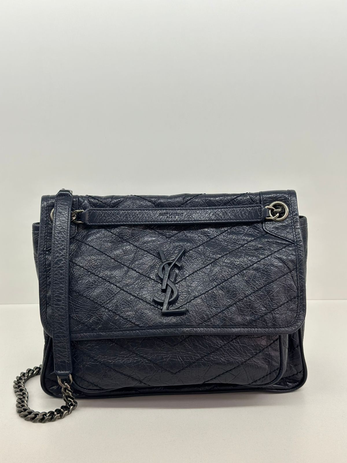 Bolsa Yves Saint Laurent Niki Média, confeccionada em couro de bezerro no matelassê preto, com ferragens no paládio escovado, possui alça em couro e corrente que pode ser usada de ombro ou transpassada, iniciais da marca na aba, fecho por aba com botão magnético, bolso na parte posterior plano, na parte frontal possui um bolso que seu fecho e pela aba flap e botão magnético, compartimento interno único com um bolso plano e um bolso com fechamento em zíper.